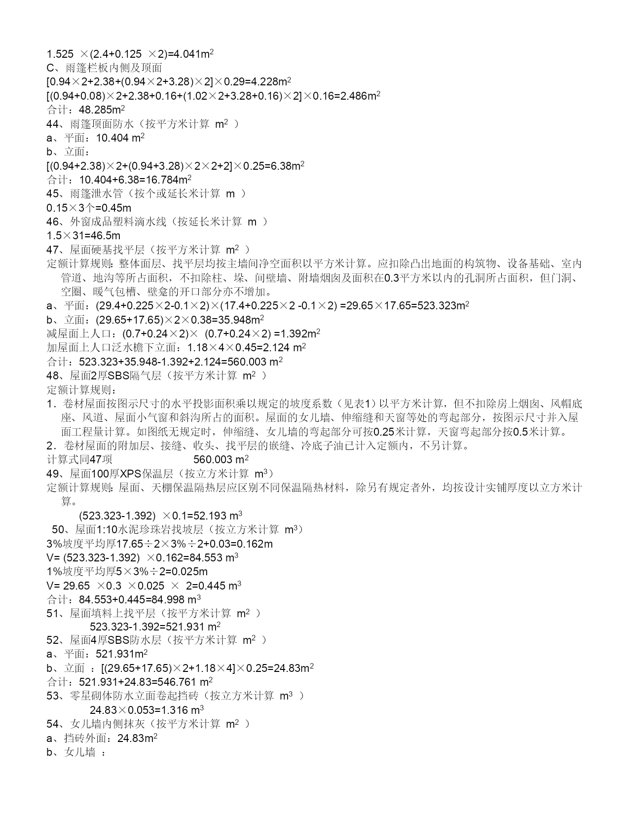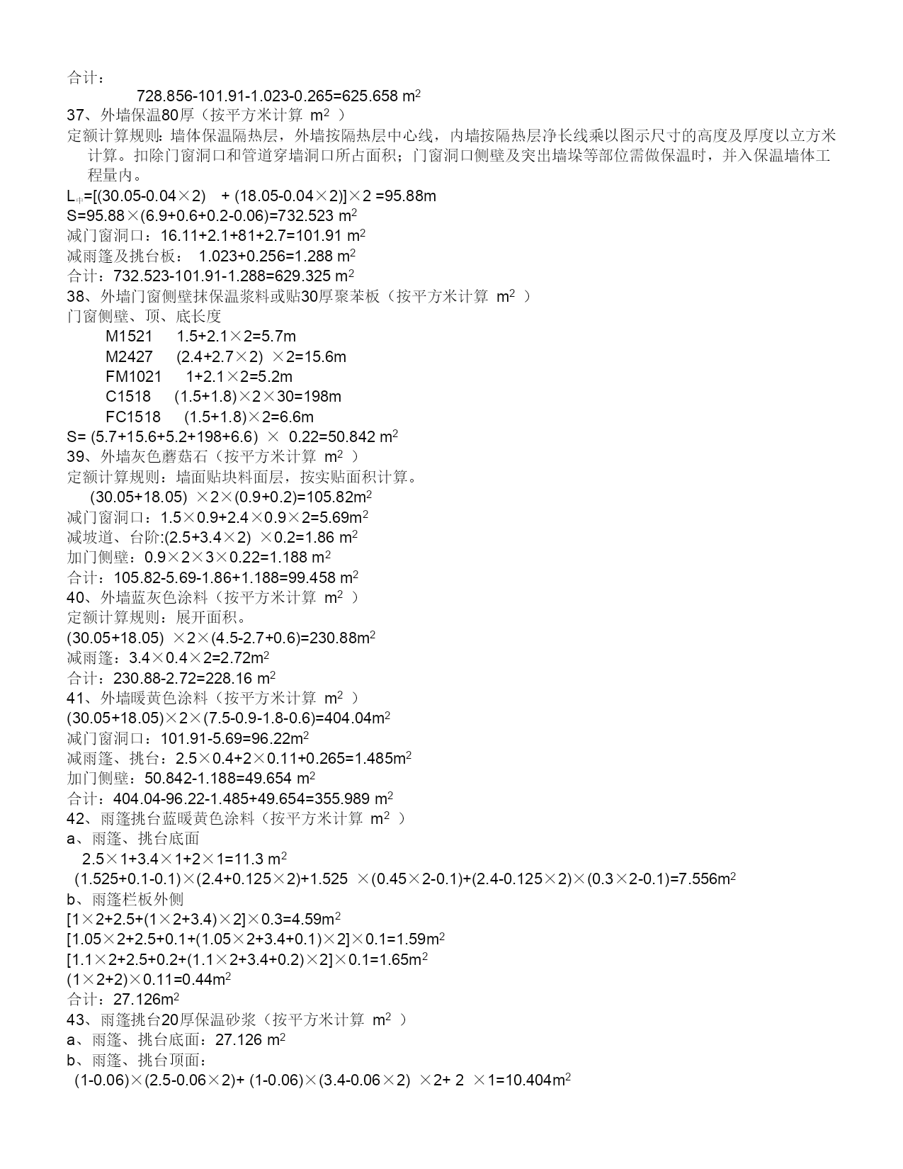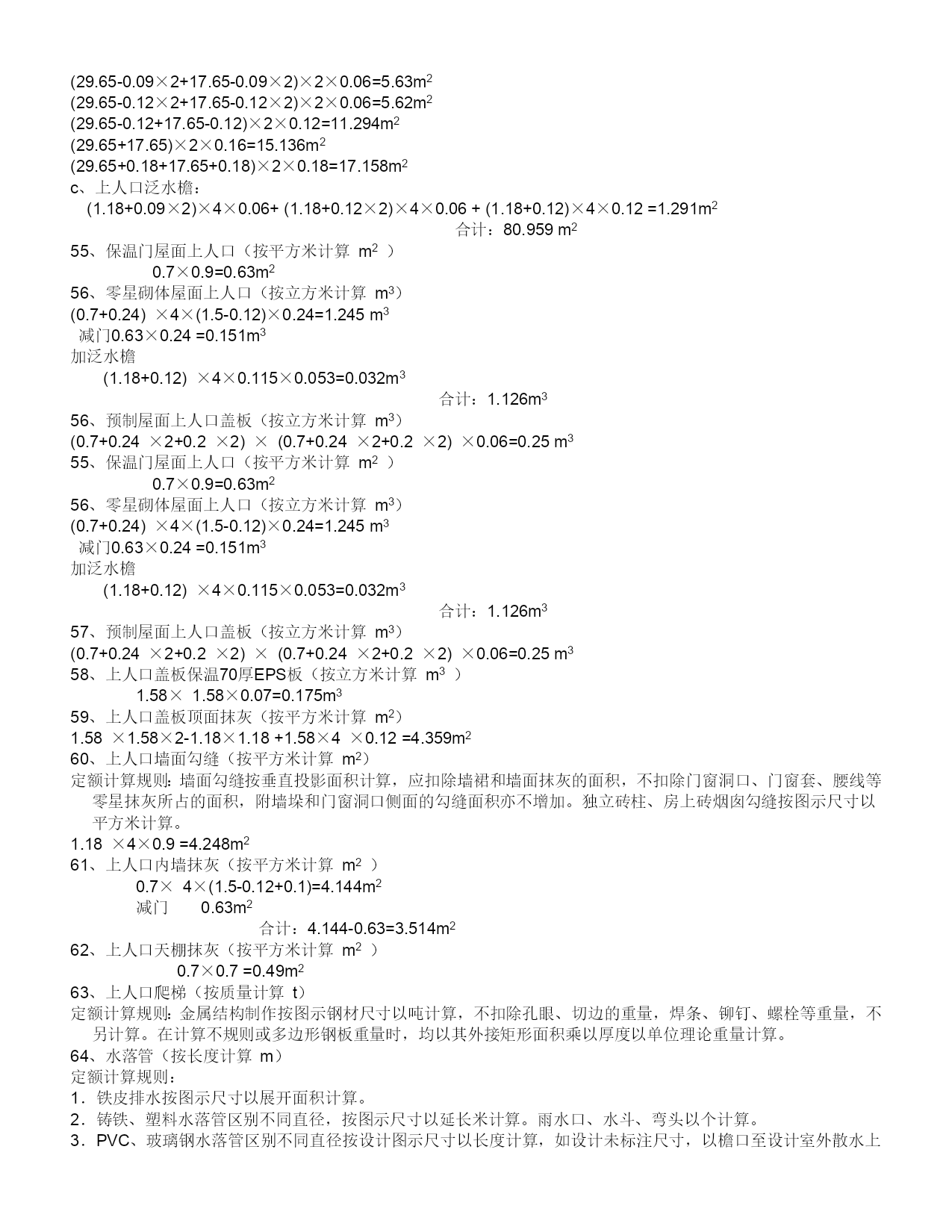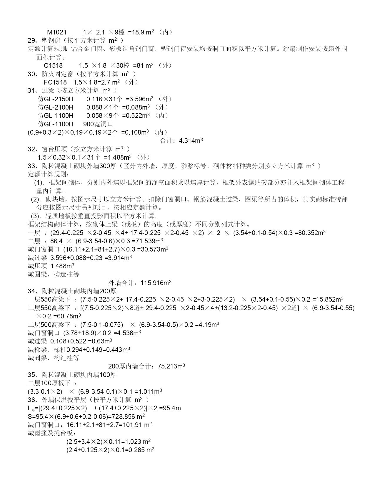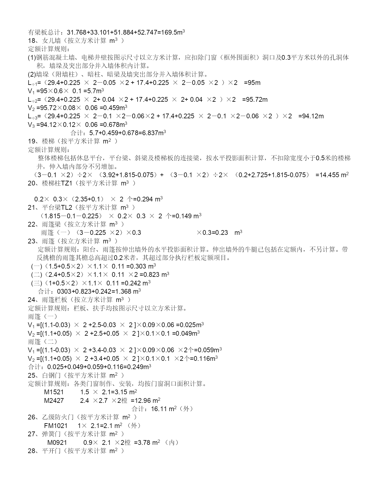 一工程造价的基础理论1、含义广义:是按照确定的建设内容、建设规模、建设标准、功能要求和使用要求等将工程项目全部建成并验收合格交付使用所需的全部费用。狭义:工程建造的价格(建筑安装工程费)2、构成:工程造价的主要构成部分是建设投资,建设投资包括工程费用、工程建设其他费和预备费三部分。工程费是指直接构成固定资产实体的各种费用,可分为建筑安装工程费和设备及工器具购置费;工程建设其他费是指根据国家有关规定应在投资中支付,并列入建设项目总造价或单项工程造价的费用。预备费是为了保证工程项目的顺利实施,避免在难以预料的情况下造成投资不足而预先安排的一笔费用。3、工程造价的划分根据建设项目或工程的不同阶段工程造价可以划分为投资估算、初步设计概算、施工图预算、结算、竣工决算。建设项目决策阶段编制投资估算;设计阶段初步设计编制初步设计概算,施工图设计编制施工图预算;施工阶段编制结算;竣工验收后编制竣工决算。4、工程造价的工作内容工程造价包括两部分工作内容计量和计价。a、计量:就是计算工程量,工程量是计算工程造价的原始数据,是计算工程造价的基础。b、计价:就是在工程量计算完成后,按照一定的计价程序计算出工程造价。按照表现形式的不同可以分为定额计价也叫工料单价法,清单计价也叫综合单价法。二、计算工程量1、工程量计算的依据a、施工图和有关资料:施工图纸和说明、地质勘查报告、图纸会审记录等;b、现场情况和施工组织设计资料及有关技术规范:应了解现场地质条件、施工条件、施工方法、技术规范要求、技术组织措施、施工设备、材料供应等;c、现行定额和清单规范:吉林省现行定额为2009版,清单规范为国家标准GB50500-20082、工程量的计算a、原则:是严格按照定额及清单规范上项目和计算规则,依据施工图纸的设计内容结合有关资料、现场情况、施工方案、技术规范等进行计算。定额和清单规范解决算什么、怎么算的问题,施工图纸解决具体的尺寸、数据等问题。b、要求:不重不漏,即不重项不漏项、不重算不漏算,严格按照工程量计算规则的规定计算,特别应注意扣除和不扣除、增加和不增加的规定。c、顺序:工程量计算要按照一定的顺序进行,可以使思路清晰,有条理,省时省力,还可以避免和防止重漏的发生,同时也便于校对和审核。先地下再地上;先主体后装饰;先外后内;同类型构件自下而上;同一张图纸先上后下、先左后右、先主后次,或按构件的编号计算;重复利用的数据先算;相关的数据一起算;先整体、后扣除、再增加。三、工程定额和工程量清单1、工程定额定额就是一种规定的额度,或数量标准。工程建设定额就是用于规定完成某一建筑产品所需消耗的人力、物力、财力的数量标准。2、工程量清单建设工程的分部分项工程项目、措施项目、其他项目、规费项目、税金项目的名称和相应数量的明细清单。长春市精准工程造价实战培训学校综合楼施工图预算工程量计算1、平整场地(按面积计算㎡)厚度在±30厘米以内的土方就地挖、填、找平为平整场地。定额计算规则:建筑物首层建筑面积和构筑物地面投影面积每边各加2米计算。围墙按中心线长度和围墙地面投影厚度每边各加1米计算。首层建筑面积+外墙外边线长度×2+2×2×430.05×18.05+(30.05+18.05)×2×2+2+2×2×4=750.8㎡清单计算规则:按建筑物首层建筑面积计算建筑面积如何计算:应按其外墙勒脚以上结构外围水平面积计算。30.05×18.05=542.4㎡2、打桩(按立方米计算m3)定额计算规则:预制钢筋混凝土制作和打桩工程量,按设计桩长(包括桩尖,不扣除桩尖虚体积)乘以桩截面面积计算,管桩空心体积不扣除。如管桩的空心部分按设计要求灌注混凝土或其他填充材料时,应另行计算。桩型号ZH-30-7.5B0.3×0.3×(7.5+0.35+0.1)×96根=68.688m3清单计算规则:按设计图示尺寸以桩长(包括桩尖)或根数计算。m/根按根计算96根按长度计算(7.5+0.35+0.1)×96根=763.2m3、送桩(按立方米计算m3)定额计算规则:送桩按桩截面面积乘以送桩长度(即打桩架底至桩顶面高度或自桩顶面至自然地面另加0.5米)计算。送桩长度:-0.2+0.5-(-0.8)=1.1米自然地面标高-0.2米桩顶标高-1.35+0.05+0.5=-0.8米0.3×0.3×1.1×96根=9.504m33、凿桩头(按立方米计算m3)定额计算规则:桩头按凿桩头长度在0.5米以内考虑,桩头长度超过0.5米先执行截桩定额。凿桩头,以体积计算。送桩长度:35d,d代表桩主筋直径0.3×0.3×0.5×96根=4.32m34、桩头截断(按个计算)工程数量只有在桩施工完后才可以确定,所以编制预算时