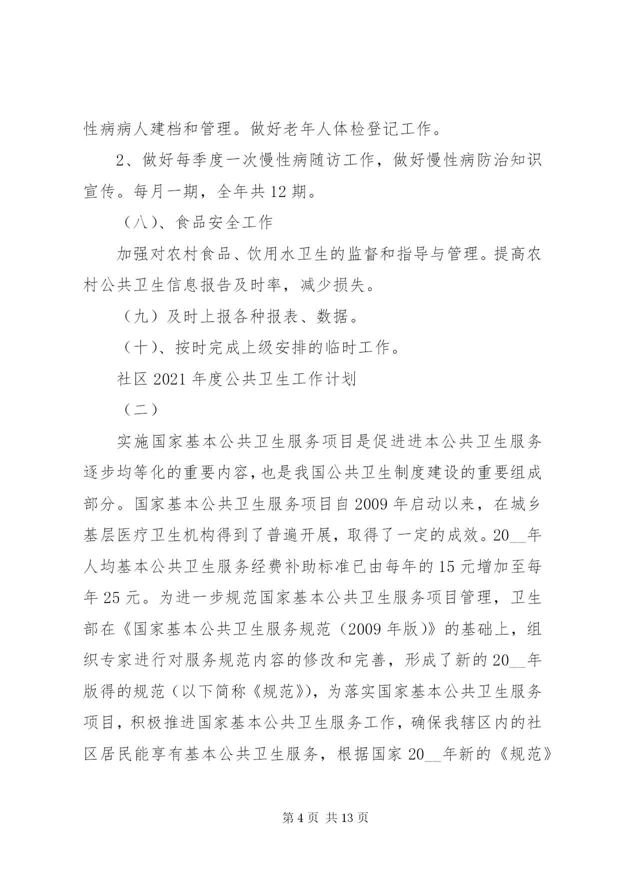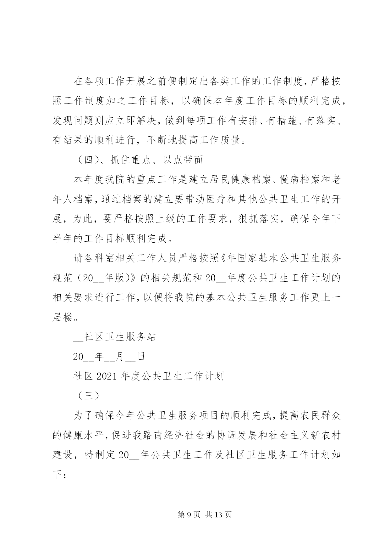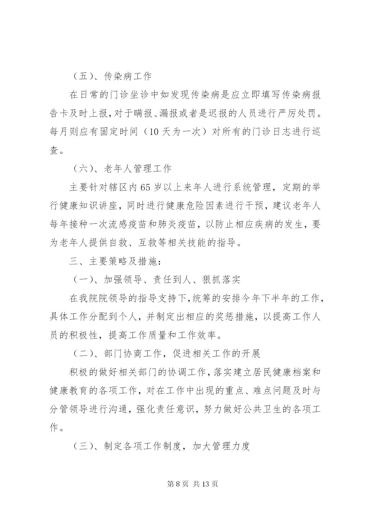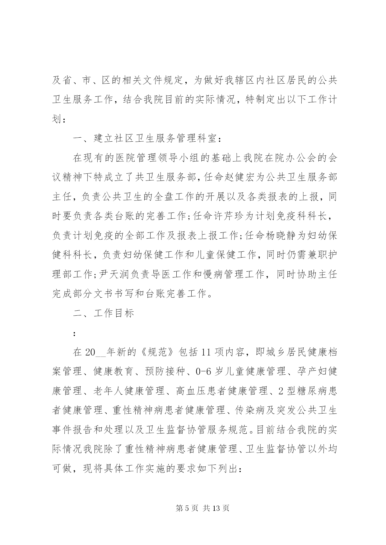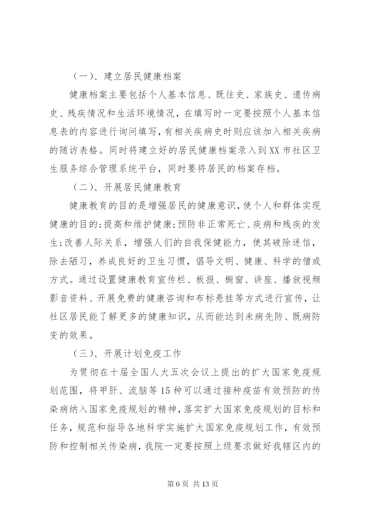 第PAGE\*Arabic\*MERGEFORMAT13页共NUMPAGES\*MERGEFORMAT13页社区XX年度公共卫生工作计划社区2021年度公共卫生工作计划(一)为了进一步加强社区公共卫生服务项目的管理,扎实推进社区公共卫生服务,有效保障农民健康水平,特制定__年公共卫生工作计划:一、指导思想和目标要求全面贯彻党的、__全会精神,高举中国特色社会主义伟大旗帜,以建设社会主义新农村的要求,加强直接面向农民的公共卫生服务,充实服务内涵,提高服务质量,减轻农民负担,全面落实农村公共卫生责任,保证农民享有基本卫生服务,保证农村重点人群享有重点服务,保证农民享有基本卫生安全保障。二、建立健全村级公共卫生工作领导小组和服务管理组织1、社区把公共卫生工作列入议事日程,社区公共卫生工作领导小组在本年度镇公共卫生工作明确后,根据实际需要,调整和充实人员,设立办公室,负责落实上级政府下达的目标任务,制定具体工作方案,并组织实施。2、社区公共卫生工作领导小组和卫生所人员要确保我社区共卫生工作顺利进行。三、落实社区公共卫生工作的目标和任务,保证农民享有基本卫生服务:包括健康教育、健康管理、基本医疗惠民服务、合作医疗便民服务、防疫、保健等。(一)、健康教育健康教育课每季度开课一次,内容要有季节性、针对性,每次参加人员必须达到50人或以上,宣传栏内容要实用,每季要有照片存档。(二)、健康管理1.家庭健康档案建档率要求90%,健康档案册中内容必须完整准确、无缺项。2.按时做好健康体检、儿童预防接种、儿童体检、孕产妇系统管理、常见妇女病检查、重点管理慢病、上门访视内容以及因病住院、门急诊等诊疗情况记入健康档案中,要求完整准确,建立动态、连续的家庭健康档案。3.每季度开展一次免费上门访视服务,访视率必须达到95%或以上,随访和干预情况及时记入健康档案中,重点疾病的访视内容要求详细,完整清楚,真实可信,并及时进行汇总准确上报。(三)、基本医疗惠民服务建立健全各项规章制度,严格按照医疗技术操作规范,合理收费,按规定执行医疗优惠政策。(四)、合作医疗便民服务1.卫生所医生必须熟悉合作医疗政策,并进行大力宣传,使各种人群对合作医疗政策的知晓率达85%。2.每季度公示本村参合人员报销情况,负责并保管好本村参合人员名册,登记项目要齐全、准确。(五)、妇幼保健1、认真做好妇幼保健工作。特别是孕产妇系统管理及6岁以下儿童系统管理。2、每月按时管理上报孕产妇及出生儿童,并及时纳入系统管理。3、每月进行4次下乡入户工作,根据情况按时进行孕产妇、儿童访视。4、做好妇幼保健宣传,每两月一期,全年6期。(六)、防疫工作1、做好各项卫生法律法规的学习宣传,做好疾病预防控制和突发事件的预防工作,提高全民防范意识。2、尽职尽责开展工作,按时完成儿童预防接种、结核病筛查、疫情调查上报、疫苗冷链管理、卫生所消毒管理、安全注射工作。每月29日做好预防接种,平时根据实际情况按时接种。3、开展适宜的疾病防治宣传,特别是艾滋病防治知识宣传。防疫宣传每两月一期,全年共6期。(七)、慢性病管理1、做好高血压、糖尿病、肿瘤、心脑血管病、精神病等慢性病病人建档和管理。做好老年人体检登记工作。2、做好每季度一次慢性病随访工作,做好慢性病防治知识宣传。每月一期,全年共12期。(八)、食品安全工作加强对农村食品、饮用水卫生的监督和指导与管理。提高农村公共卫生信息报告及时率,减少损失。(九)及时上报各种报表、数据。(十)、按时完成上级安排的临时工作。社区2021年度公共卫生工作计划(二)实施国家基本公共卫生服务项目是促进进本公共卫生服务逐步均等化的重要内容,也是我国公共卫生制度建设的重要组成部分。国家基本公共卫生服务项目自2009年启动以来,在城乡基层医疗卫生机构得到了普遍开展,取得了一定的成效。20__年人均基本公共卫生服务经费补助标准已由每年的15元增加至每年25元。为进一步规范国家基本公共卫生服务项目管理,卫生部在《国家基本公共卫生服务规范(2009年版)》的基础上,组织专家进行对服务规范内容的修改和完善,形成了新的20__年版得的规范(以下简称《规范》),为落实国家基本公共卫生服务项目,积极推进国家基本公共卫生服务工作,确保我辖区内的社区居民能享有基本公共卫生服务,根据国家20__年新的《规范》及省、市、区的相关文件规定,为做好我辖区内社区居民的公共卫生服务工作,结合我院目前的实际情况,特制定出以下工作计划:一、建立社区卫生服务管理科室:在现有的医院管理领导小组的基础上我院在院办公会的会议精神下特成立了共卫生服务部,任命赵健宏为公共卫生服务部主任,负责公共卫生的全盘工作的开展以及各类报表的上报,同时要负责各类台账的完善工作;任命许芹珍为计划免疫科科长,负责计划免疫的全部工作
