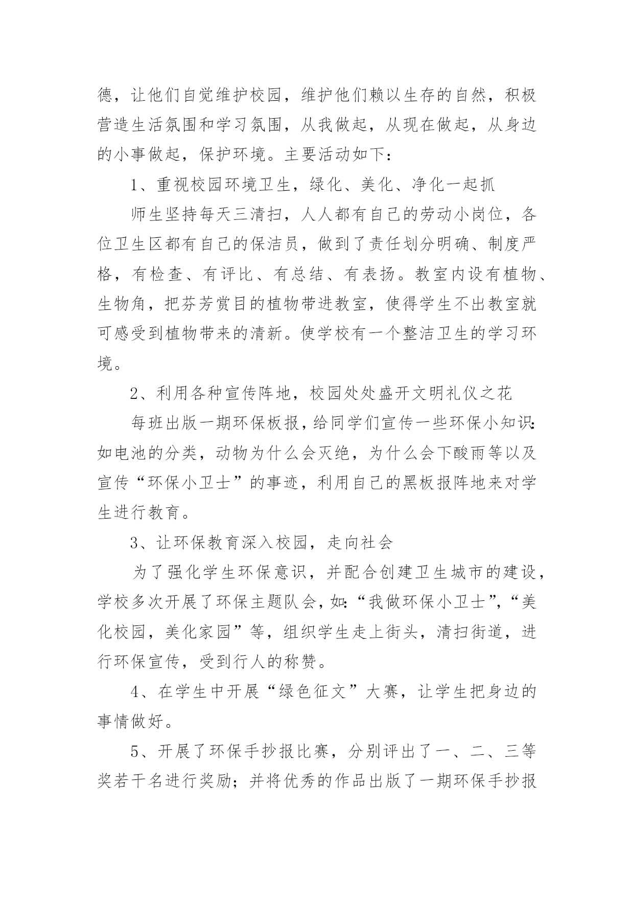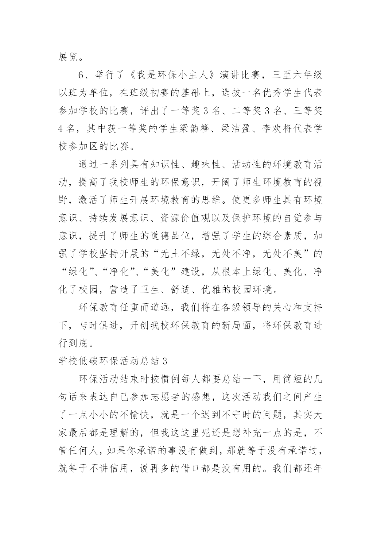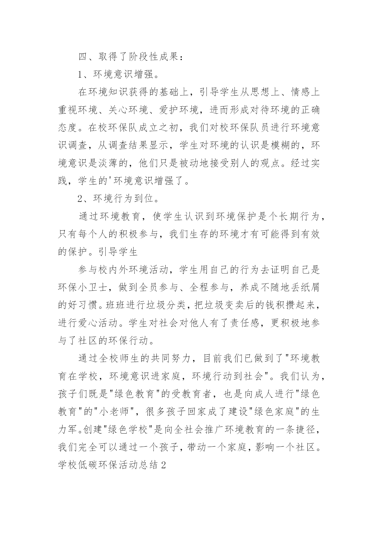 学校低碳环保活动总结学校低碳环保活动总结总结就是把一个时间段取得的成绩、存在的问题及得到的经验和教训进行一次全面系统的总结的书面材料,它能使我们及时找出错误并改正,不妨让我们认真地完成总结吧。那么你真的懂得怎么写总结吗?下面是小编精心整理的学校低碳环保活动总结,仅供参考,大家一起来看看吧。学校低碳环保活动总结1保护环境,是我们国家的一项基本国策,是实施可持续发展战略的重要内容。创建绿色学校,开展绿色教育,是环境教育的最佳途径,是学校开展素质教育的有效抓手。为此,我校专门成立了环境教育领导小组,以《全国环境宣传教育行动纲要》精神为指针,以环保教育课为主渠道,明确分工,强化责任,优化措施,把环境教育与绿色学校创建活动紧密结合,取得了阶段性成果:学生在创建绿色学校活动中能力得到了锻炼,知识得到了拓展,环保意识得到了增强,素质得到了全面提高。现把我校环保教育活动汇报如下:一、营造浓厚的宣传氛围。加强宣传教育是我们开展环保教育的主要途径,我校利用广播站、黑板报、手抄报、主题班会等形式开展系列宣传教育活动:如利用校园广播宣读环保知识,尤其结合乌什县当地环境状况宣传保护环境的重要性,使学生知道了我们的生存环境日趋恶劣;利用每周的第二课堂活动,开展以环保为主题的废旧物品改造活动,给学生以美的熏陶。把学生亲手制作的艺术板块与美术、书法、手抄报在学校大厅展出,既美化了校园环境,又展示了学生成果。从而形成浓厚的环保宣传氛围,也使环保意识扎根在学生的脑海和心田。二、建造优美的校园环境。良好的校园环境是对学生进行环境教育的主要阵地,因此,我校注重加强校园文化建设,明确提出“校园无处不育人,校园无时不育人”的口号。为了保持校园优美的环境,我校开展了“弯弯腰”活动,要求每位学生每天捡一张废纸、一个塑料袋;开展护绿活动,让每位护绿小队队员认养一棵树、一盆花,每学期进行一次总评,评出若干名优秀护绿队员;与此同时开展垃圾分类回收工作,在校内设立垃圾分类回收箱,把垃圾分为废纸、废电池、废塑料、不可回收垃圾等,并把回收的垃圾进行合理处理。良好的校园环境成为强有力的德育阵地,学生置身其中,耳濡目染,潜移默化。三、形成立体的环保教育网络1、课堂教学渗透教育。学校的任何一种教育活动只有与课堂教学相结合才有生命力,在环保教育中我们注重了课堂教学渗透教育。目前,我校的各科教学都能结合学科特点自觉地将环保教育根植于课堂教学中,从不同侧面和角度丰富学生的环保知识,了解人类及人类活动与环境的密切关系,引导学生树立新的资源观、环境观、人口观和价值观,初步懂得协调人类的发展与资源环境的关系,从而做到珍惜爱护每一滴水、每一片绿叶、每一寸土地。2、团队活动集中教育。少先队的集中教育活动是环保教育的重要环节。少先队定期开展以环保为主题的班队会,保证教育的一致性,并结合植树节、地球日、环境日等特殊环保节日集中开展大型的宣传教育活动。如在本学期开展了“保护环境从身边做起”的主题大队活动,开展“争当环保小卫士”活动,由政教处发出倡议,全校师生积极响应,每个学生都写出一份“争当环保小卫士”决心书,用实际行动美化环境,净化心灵,结合活动的开展,团委评选出40名校园环保小卫士带领其他学生在学校进行“弯弯腰、捡垃圾”的主题环保活动,利用校园广播、板报等大力宣传,从而增强了全体师生的环境意识。3、家长学校延伸教育。为了进一步提高全民的环境意识,增强社会的共同责任感,我们把环保教育工作延伸到家长学校中,在家长学校工作会议上,学校有计划地就如何提高市民素质,增强环保意识做了专题讲座。并让每位学生把环保知识讲述给家长,共同参与学校和社会环保活动,共同开展家庭绿色行动和绿色消费活动,从而使学校教育与家庭教育有机地结合起来,促进了环境教育工作的开展,使环保活动成为全社会的共同目标。四、取得了阶段性成果:1、环境意识增强。在环境知识获得的基础上,引导学生从思想上、情感上重视环境、关心环境、爱护环境,进而形成对待环境的正确态度。在校环保队成立之初,我们对校环保队员进行环境意识调查,从调查结果显示,学生对环境的认识是模糊的,环境意识是淡薄的,他们只是被动地接受别人的观点。经过实践,学生的'环境意识增强了。2、环境行为到位。通过环境教育,使学生认识到环境保护是个长期行为,只有每个人的积极参与,我们生存的环境才有可能得到有效的保护。引导学生参与校内外环境活动,学生用自己的行为去证明自己是环保小卫士,做到全员参与、全程参与,养成不随地丢纸屑的好习惯。班班进行垃圾分类,把垃圾变卖后的钱积攒起来,进行爱心活动。学生对社会对他人有了责任感,更积极地参与了社区的环保行动。通过全校师生的共同努力,目前我们已做到了"环境教育在学校,环境意识进家庭,环境行动到社会"。我们认为,孩子们既是"绿色教育"的受教育者,也是向成人进行"绿色教育"的