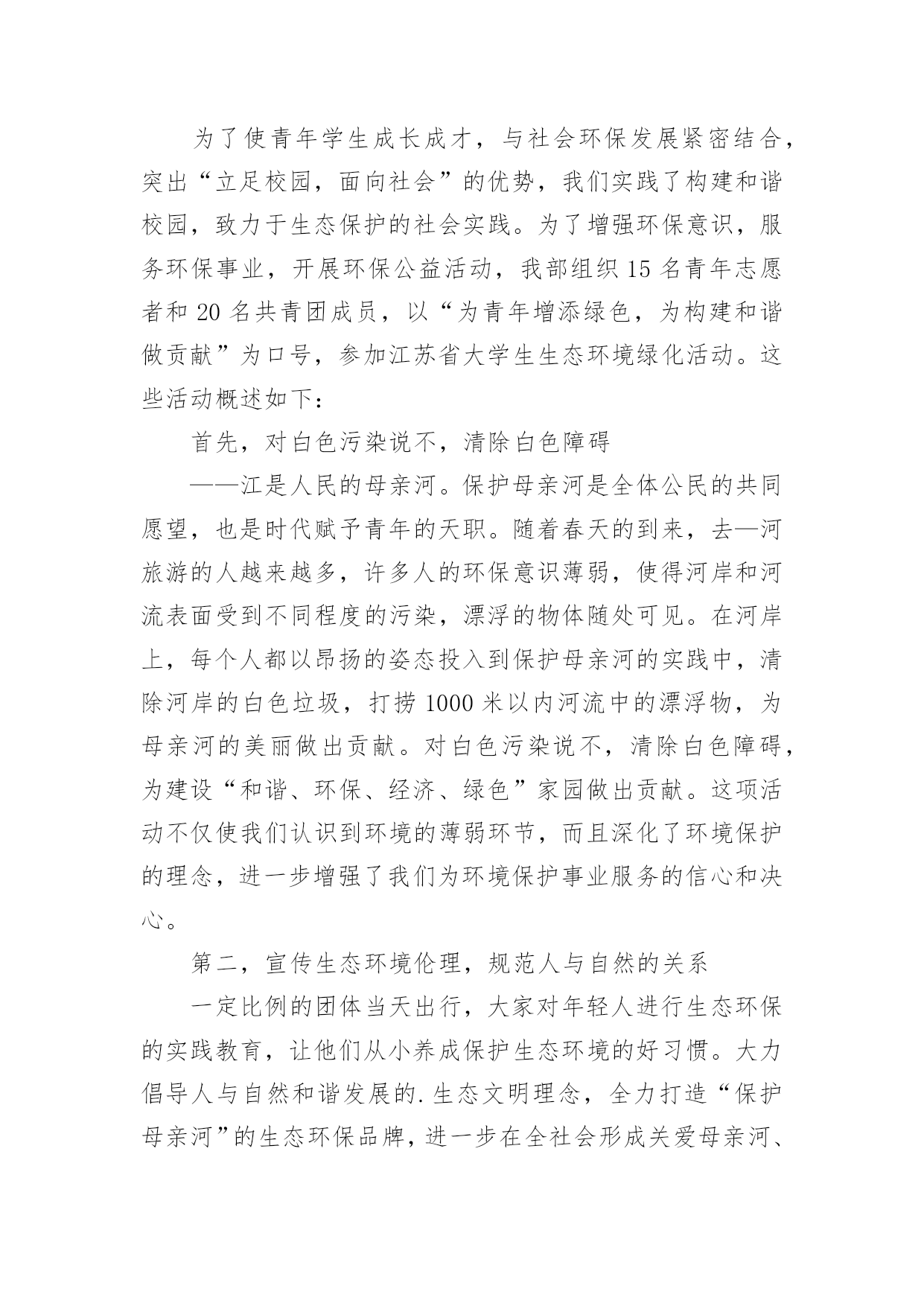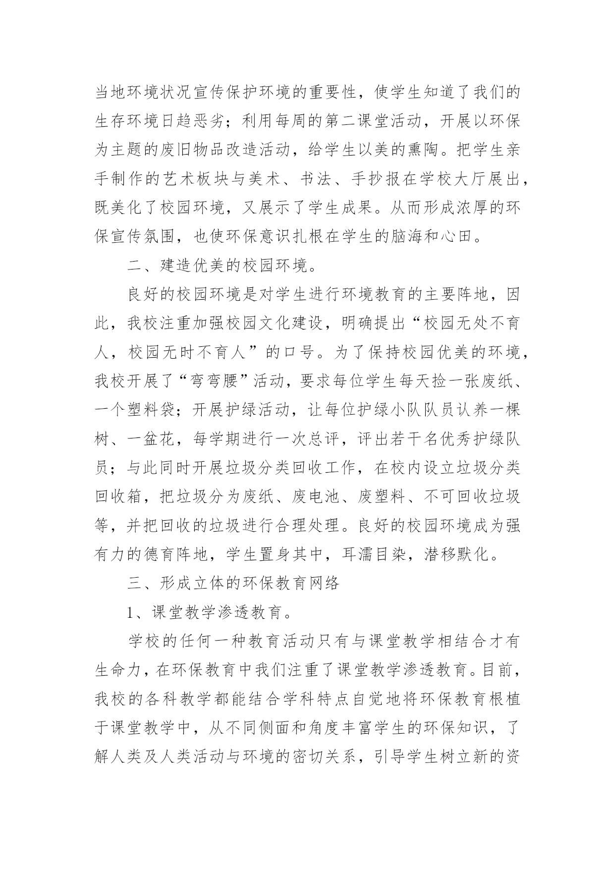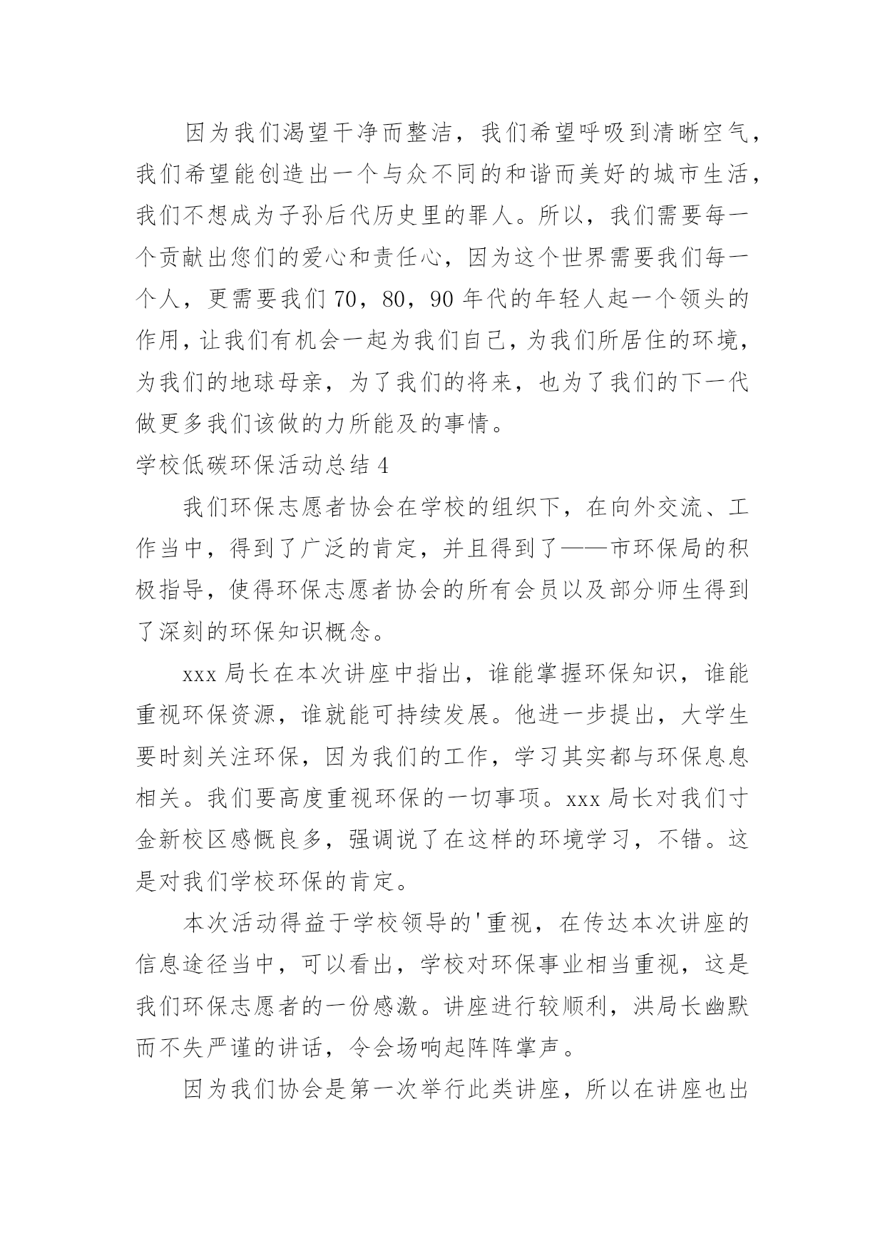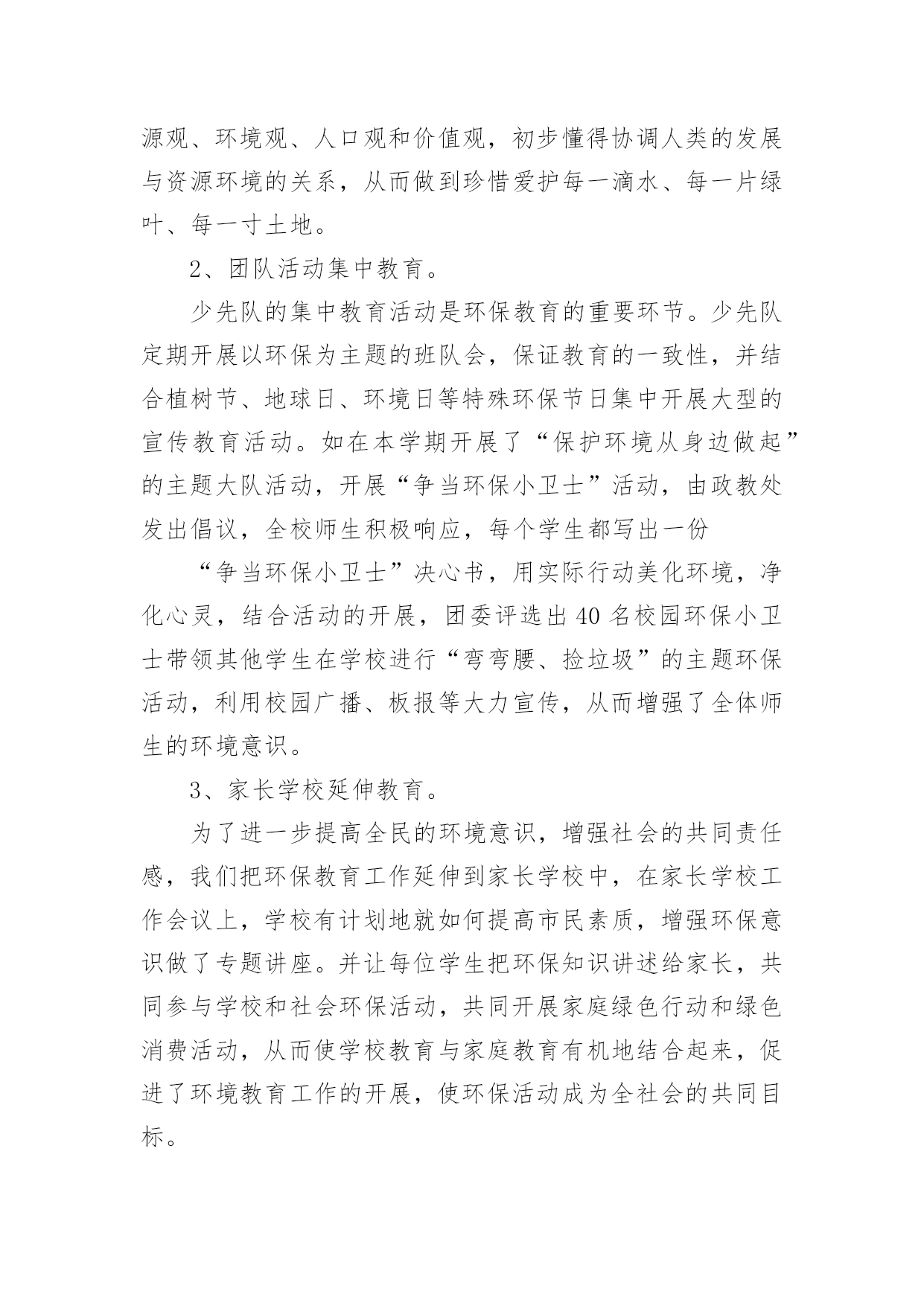 学校低碳环保活动总结学校低碳环保活动总结总结就是把一个时间段取得的成绩、存在的问题及得到的经验和教训进行一次全面系统的总结的书面材料,它能使我们及时找出错误并改正,不妨让我们认真地完成总结吧。那么你真的懂得怎么写总结吗?下面是小编精心整理的学校低碳环保活动总结,仅供参考,大家一起来看看吧。学校低碳环保活动总结1保护环境,是我们国家的一项基本国策,是实施可持续发展战略的重要内容。创建绿色学校,开展绿色教育,是环境教育的最佳途径,是学校开展素质教育的有效抓手。为此,我校专门成立了环境教育领导小组,以《全国环境宣传教育行动纲要》精神为指针,以环保教育课为主渠道,明确分工,强化责任,优化措施,把环境教育与绿色学校创建活动紧密结合,取得了阶段性成果:学生在创建绿色学校活动中能力得到了锻炼,知识得到了拓展,环保意识得到了增强,素质得到了全面提高。现把我校环保教育活动汇报如下:一、营造浓厚的宣传氛围。加强宣传教育是我们开展环保教育的主要途径,我校利用广播站、黑板报、手抄报、主题班会等形式开展系列宣传教育活动:如利用校园广播宣读环保知识,尤其结合乌什县当地环境状况宣传保护环境的重要性,使学生知道了我们的生存环境日趋恶劣;利用每周的第二课堂活动,开展以环保为主题的废旧物品改造活动,给学生以美的熏陶。把学生亲手制作的艺术板块与美术、书法、手抄报在学校大厅展出,既美化了校园环境,又展示了学生成果。从而形成浓厚的环保宣传氛围,也使环保意识扎根在学生的脑海和心田。二、建造优美的校园环境。良好的校园环境是对学生进行环境教育的主要阵地,因此,我校注重加强校园文化建设,明确提出“校园无处不育人,校园无时不育人”的口号。为了保持校园优美的环境,我校开展了“弯弯腰”活动,要求每位学生每天捡一张废纸、一个塑料袋;开展护绿活动,让每位护绿小队队员认养一棵树、一盆花,每学期进行一次总评,评出若干名优秀护绿队员;与此同时开展垃圾分类回收工作,在校内设立垃圾分类回收箱,把垃圾分为废纸、废电池、废塑料、不可回收垃圾等,并把回收的垃圾进行合理处理。良好的校园环境成为强有力的德育阵地,学生置身其中,耳濡目染,潜移默化。三、形成立体的环保教育网络1、课堂教学渗透教育。学校的任何一种教育活动只有与课堂教学相结合才有生命力,在环保教育中我们注重了课堂教学渗透教育。目前,我校的各科教学都能结合学科特点自觉地将环保教育根植于课堂教学中,从不同侧面和角度丰富学生的环保知识,了解人类及人类活动与环境的密切关系,引导学生树立新的资源观、环境观、人口观和价值观,初步懂得协调人类的发展与资源环境的关系,从而做到珍惜爱护每一滴水、每一片绿叶、每一寸土地。2、团队活动集中教育。少先队的集中教育活动是环保教育的重要环节。少先队定期开展以环保为主题的班队会,保证教育的一致性,并结合植树节、地球日、环境日等特殊环保节日集中开展大型的宣传教育活动。如在本学期开展了“保护环境从身边做起”的主题大队活动,开展“争当环保小卫士”活动,由政教处发出倡议,全校师生积极响应,每个学生都写出一份“争当环保小卫士”决心书,用实际行动美化环境,净化心灵,结合活动的开展,团委评选出40名校园环保小卫士带领其他学生在学校进行“弯弯腰、捡垃圾”的主题环保活动,利用校园广播、板报等大力宣传,从而增强了全体师生的环境意识。3、家长学校延伸教育。为了进一步提高全民的环境意识,增强社会的共同责任感,我们把环保教育工作延伸到家长学校中,在家长学校工作会议上,学校有计划地就如何提高市民素质,增强环保意识做了专题讲座。并让每位学生把环保知识讲述给家长,共同参与学校和社会环保活动,共同开展家庭绿色行动和绿色消费活动,从而使学校教育与家庭教育有机地结合起来,促进了环境教育工作的开展,使环保活动成为全社会的共同目标。四、取得了阶段性成果:1、环境意识增强。在环境知识获得的基础上,引导学生从思想上、情感上重视环境、关心环境、爱护环境,进而形成对待环境的正确态度。在校环保队成立之初,我们对校环保队员进行环境意识调查,从调查结果显示,学生对环境的认识是模糊的,环境意识是淡薄的,他们只是被动地接受别人的观点。经过实践,学生的'环境意识增强了。2、环境行为到位。通过环境教育,使学生认识到环境保护是个长期行为,只有每个人的积极参与,我们生存的环境才有可能得到有效的保护。引导学生参与校内外环境活动,学生用自己的行为去证明自己是环保小卫士,做到全员参与、全程参与,养成不随地丢纸屑的好习惯。班班进行垃圾分类,把垃圾变卖后的钱积攒起来,进行爱心活动。学生对社会对他人有了责任感,更积极地参与了社区的环保行动。通过全校师生的共同努力,目前我们已做到了"环境教育在学校,环境意识进家庭,环境行动到社会"。我们认为,孩子们既是"绿色教育"的受教育者,也是向成人进行"绿色教育"的