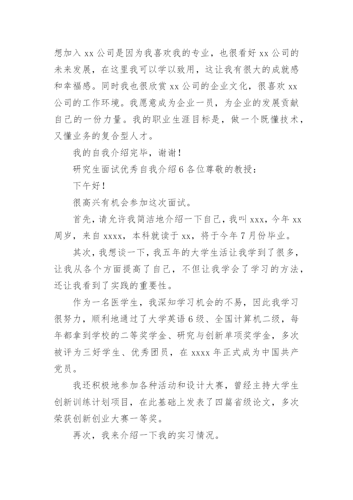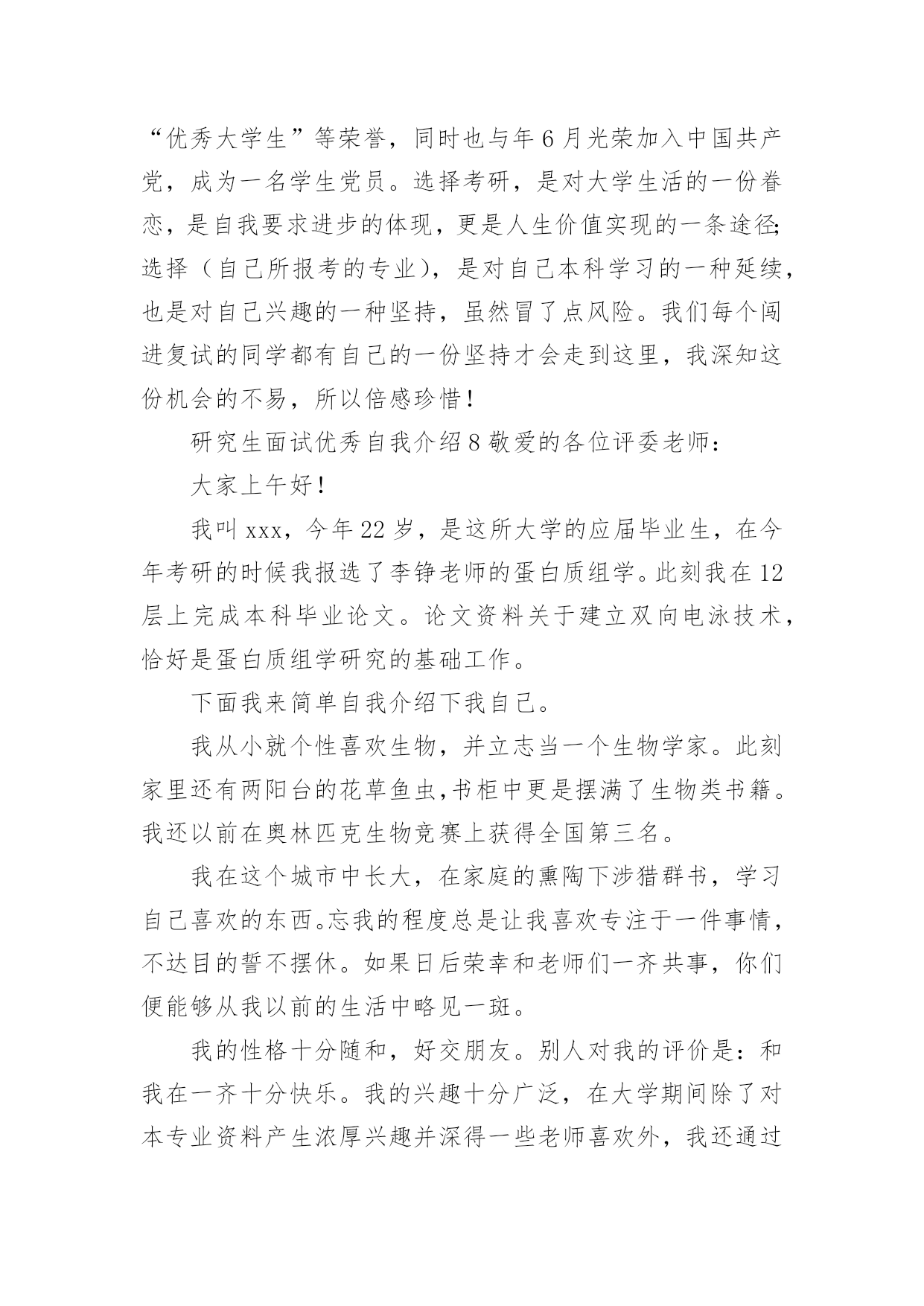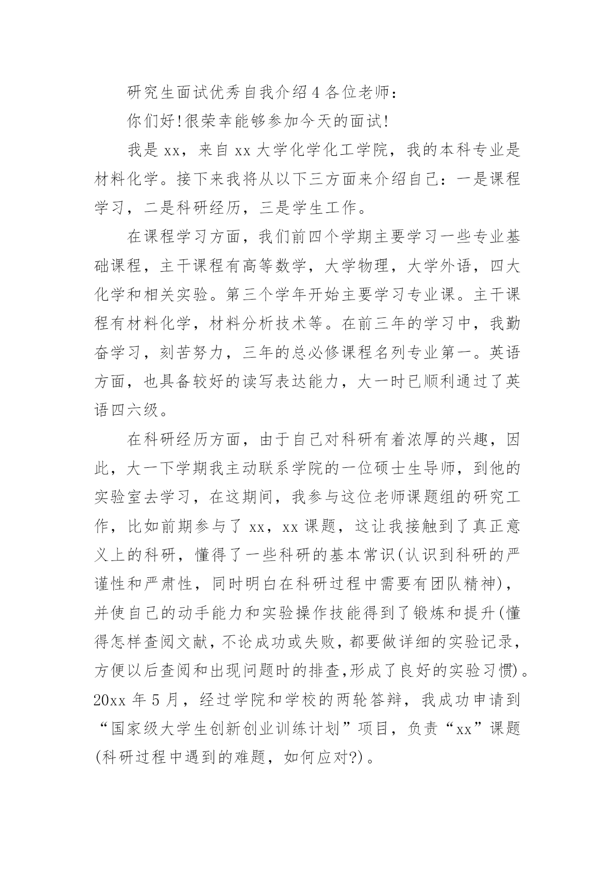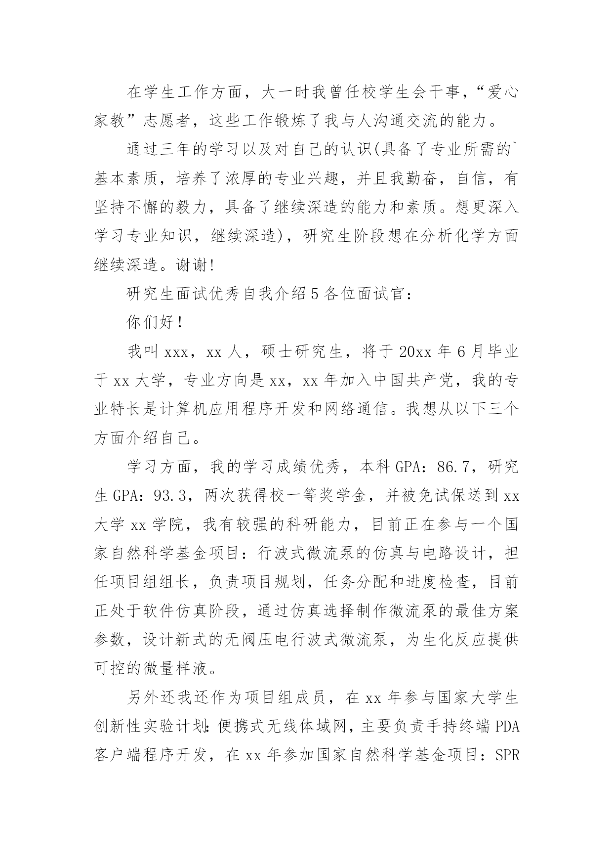 研究生面试优秀自我介绍研究生面试优秀自我介绍(精选8篇)来到一个完全陌生的环境,时常需要我们进行一个自我介绍,自我介绍是人与人进行沟通的出发点。写起自我介绍来就毫无头绪?下面是小编为大家收集的研究生面试优秀自我介绍(精选8篇),欢迎阅读,希望大家能够喜欢。研究生面试优秀自我介绍1尊敬的各位教授老师们:上午好!我很高兴能参加这次面试。首先我介绍一下自己,我叫李幼军,二十五岁,来自湖北孝感,我就读于中国地质大学江城学院,所学专业是通信工程。在四年的大学生活里,我觉得生活很充实。首先,我努力学习了本专业方面的理论知识,通过了英语四六级考试和计算机等级考试;其次,我很注重课后的学习实践,20xx年暑假我参加了武汉肯纳有限职责公司的实习,去年暑假,我有幸参加了全国大学生电子竞赛,在这些过程中,我逐渐认识到就应勤于将所学理论知识应用于实践,这样不仅仅能够开拓视野,锻炼动手潜力,还能够极大地提高对本专业学习的兴趣和增强了对本专业学习的自信心;再次,课余时间我努力培养自己的兴趣,用心参加了学校社团组织如自行车协会,在那里,我经常与来自不同的地方,不同的年级,不同的专业的同学相互交流学习,取长补短共同进步。我的性格偏于内向,不善言谈。我总是喜欢用实际行动来证明我自己,来完成设定的计划和目标。读研究生一向是我最大的梦想,虽然追寻的过程很漫长,很艰辛,有时很烦恼,有时很丧气。我想为梦想而奋斗的人是幸福的,幸运的,快乐的,所以我一向坚持着内心的信念!经过四年的大学生活,我发现自己对本专业产生了很大的兴趣,自身各方面也得到了很大的提升和进步。我认识到所学的专业理论知识还有很多不足,实践潜力还有待提高。我很期望进入研究生阶段继续深造,为将来的成长打下良好的基矗我的介绍完毕,谢谢!研究生面试优秀自我介绍2尊敬的各位考官、各位评委老师:你好!通过考试,今天,我以本岗位笔试第一的成绩进入了。对我来说,这次机会显得尤为珍贵。我叫xxx,今年27岁。1997年7月我从xxxx师范学校艺师美术专业计划内自费毕业。由于从97年起国家不再对自费生包分配,使我与“太阳底下最光辉的职业”失之交臂。幸好,当时河西马厂完小师资不足,经人介绍,我在该完小担任了一年的临时代课教师。回想起那段时光真是既甜蜜又美好,虽然代课工资很低,但听着同学们围在身旁“老师”、“老师”的叫个不停,看着那一双双充满信任的眼睛,那一张张稚气的小脸,生活中的所有不快都顿时烟消云散了。我原想,即使不能转正,只要学校需要,就是当一辈子代课教师我也心甘情愿。不料,1998年起国家开始清退临时工和代课教师,接到了学校的口头通知后,我怀着恋恋不舍的心情,悄悄地离开了学校。谢谢大家!研究生面试优秀自我介绍3各位老师:你们好!我很荣幸能参加这次面试,我渴望在各位老师的指导下进一步成长。我叫xx,是xxx大学xxx专业应届本科生,大学四年的本科课程以xxx为核心开展。我认真负责,吃苦耐劳,对生活充满热情,业余爱好:写作、篮球、羽毛球和旅行。为了感受东部的繁荣,20xx年暑假经历了南京、上海、杭州、厦门和深圳的东部之旅。我选择xxx的理由:1.大学是一所历史悠久、学术氛围浓厚的学校,作为我国最著名的大学,她能为学生进一步成长提供广阔的发展空间。学生以求实创新而闻名海内外。xx学系创始于1936年,历经xx等老一代和在座各位老师一代代的传承发扬,已成为我国顶尖的xx系。2.我对xx研究具有浓厚的兴趣。(跨考建议考生这里可以自由扩散一些)3.我渴望进一步深造,深化理论,更多实践,实现自身价值。如果我有幸录取,我将全力以赴学习。首先,我夯实基础,学好英语,大量阅读英文原版教材。其次,我将努力强化实践,将理论与实际结合起来。最后,我注重团队合作精神。我相信,经过两年的学习,我一定会实现我的理想。谢谢各位老师!研究生面试优秀自我介绍4各位老师:你们好!很荣幸能够参加今天的面试!我是xx,来自xx大学化学化工学院,我的本科专业是材料化学。接下来我将从以下三方面来介绍自己:一是课程学习,二是科研经历,三是学生工作。在课程学习方面,我们前四个学期主要学习一些专业基础课程,主干课程有高等数学,大学物理,大学外语,四大化学和相关实验。第三个学年开始主要学习专业课。主干课程有材料化学,材料分析技术等。在前三年的学习中,我勤奋学习,刻苦努力,三年的总必修课程名列专业第一。英语方面,也具备较好的读写表达能力,大一时已顺利通过了英语四六级。在科研经历方面,由于自己对科研有着浓厚的兴趣,因此,大一下学期我主动联系学院的一位硕士生导师,到他的实验室去学习,在这期间,我参与这位老师课题组的研究工作,比如前期参与了xx,xx课题,这让我接触到了真正意义上的科研,懂得了一些科研的基本常识(认识到科研的严谨性和严肃性,同时明白在科研过程中需要有团队精神),并