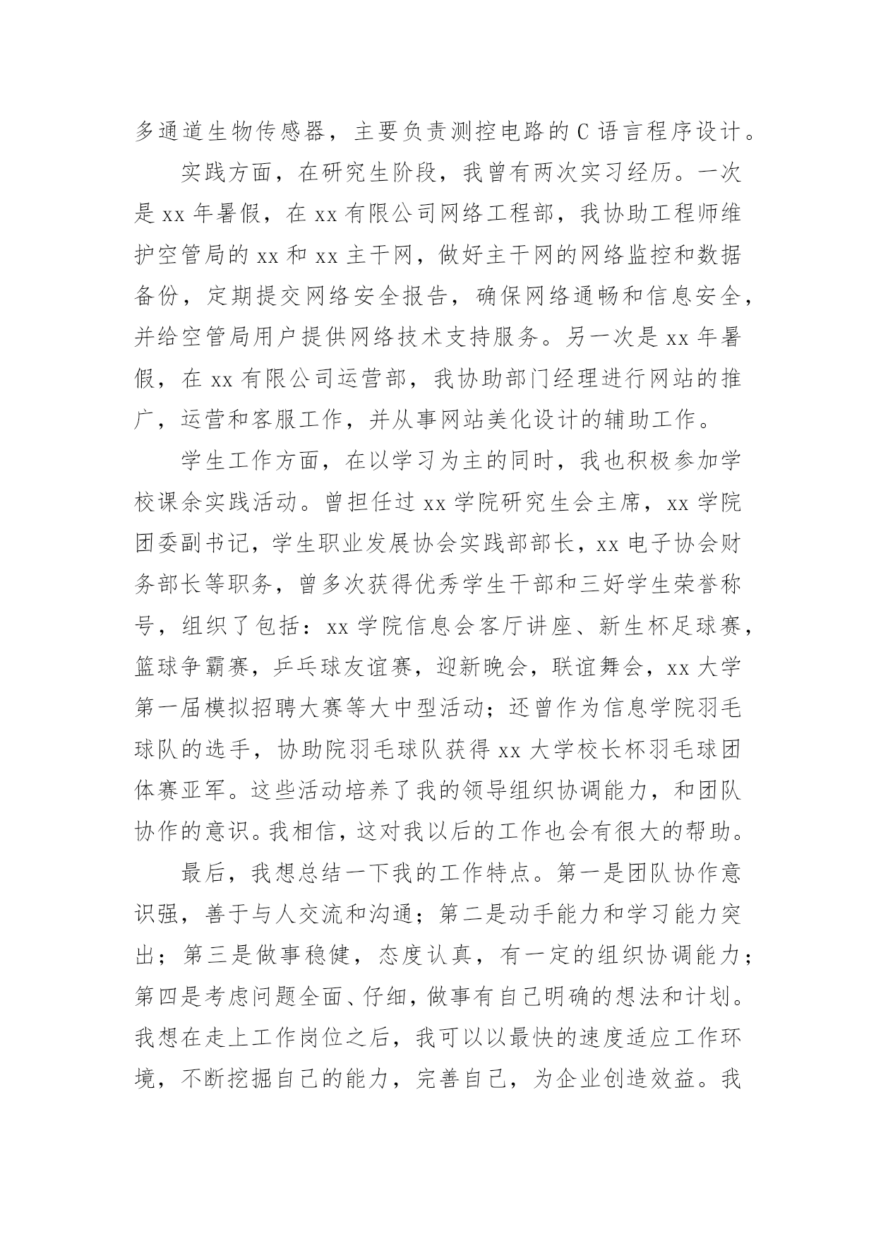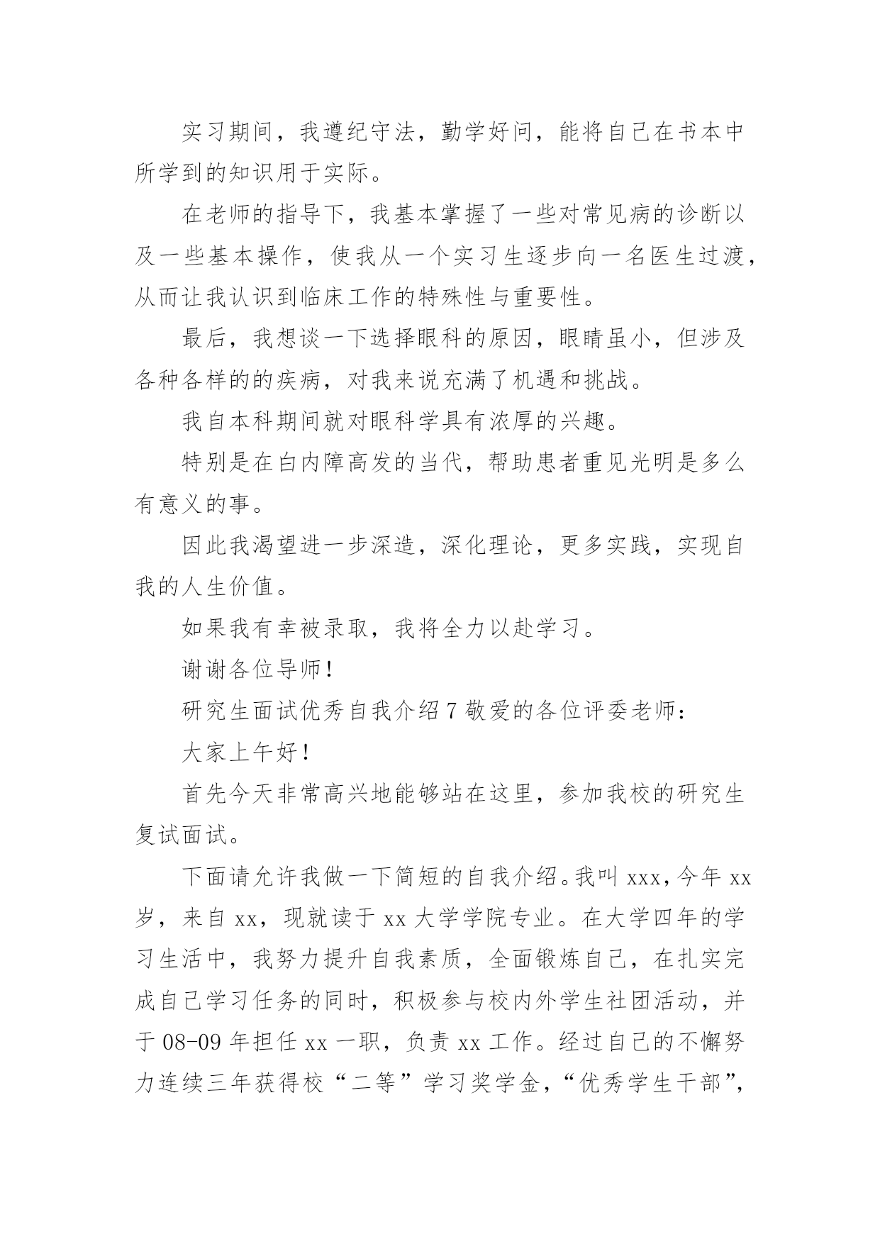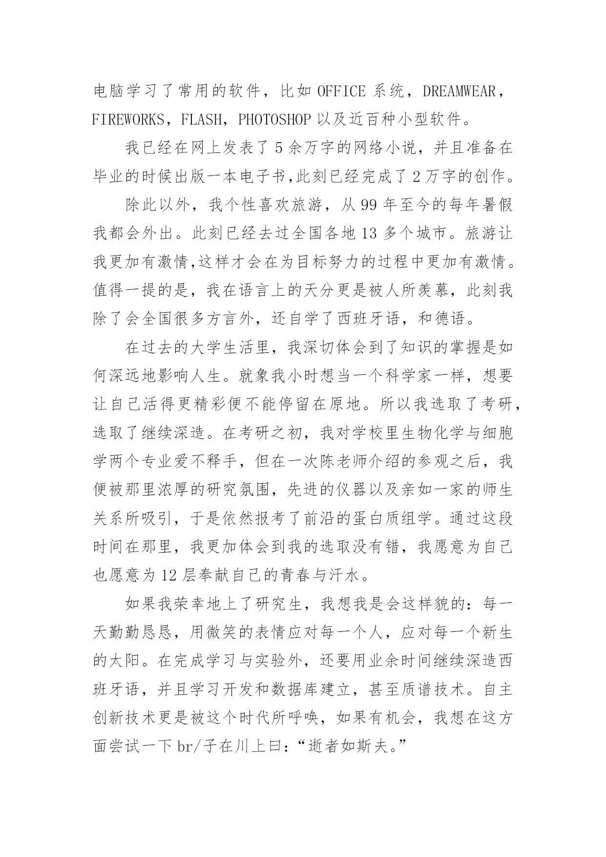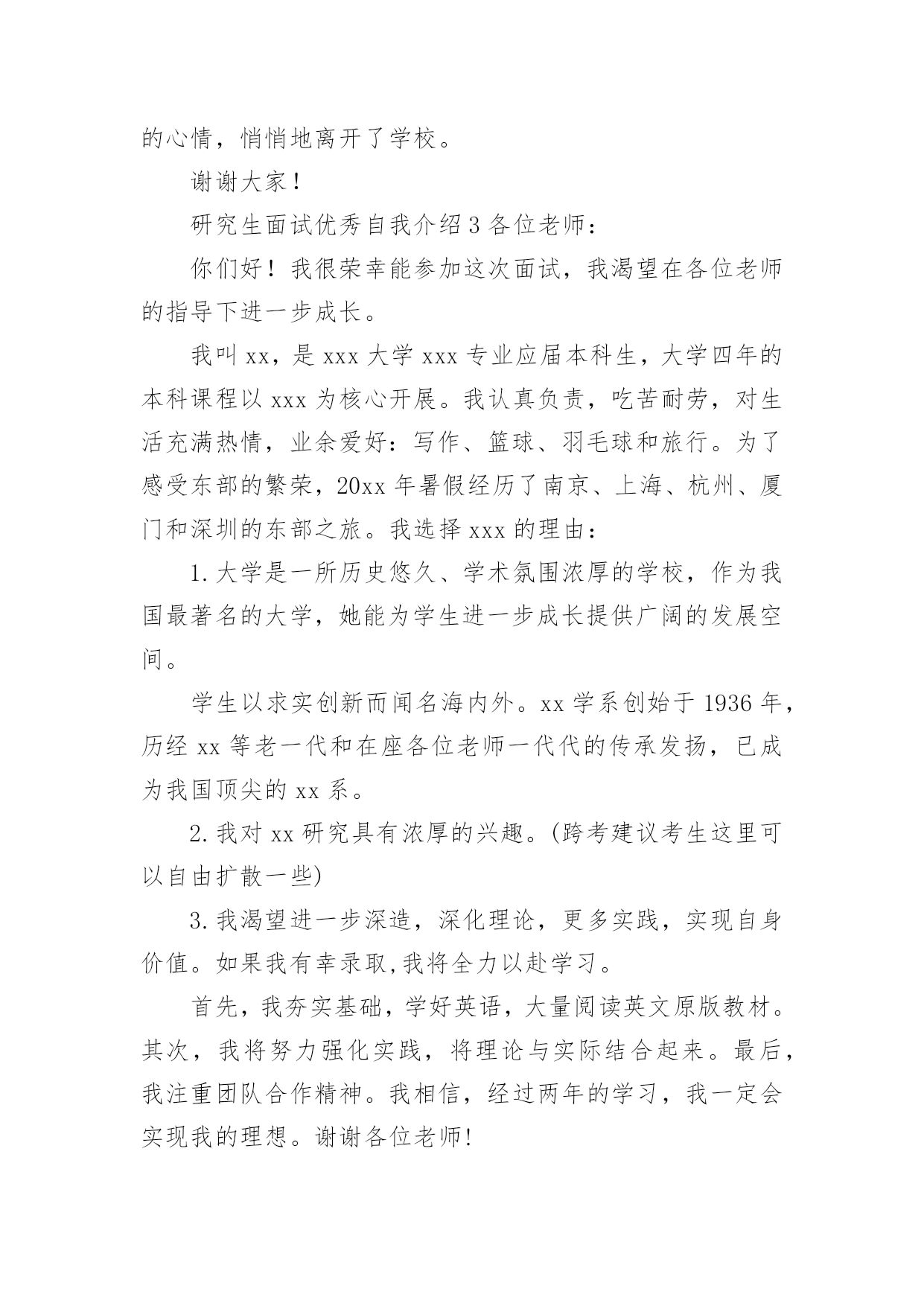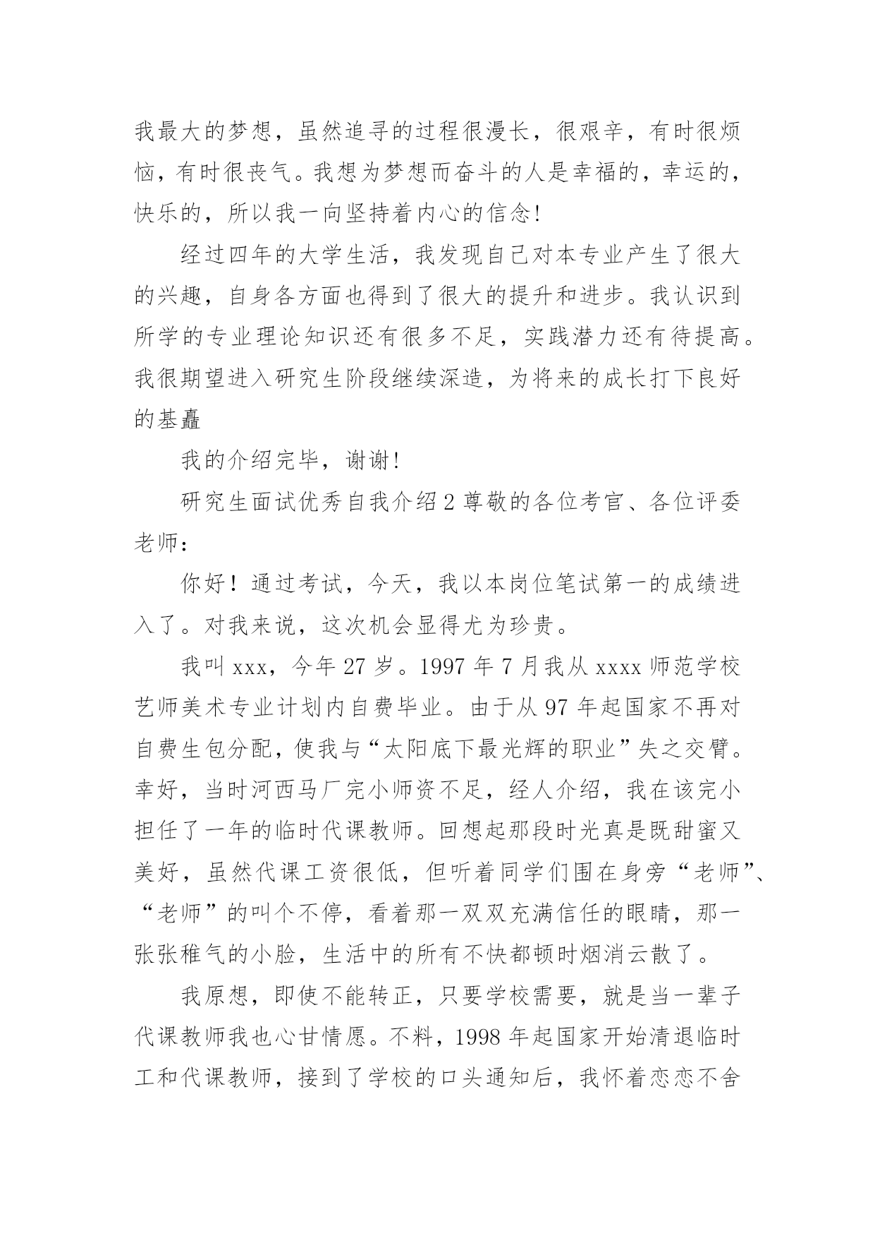 研究生面试优秀自我介绍研究生面试优秀自我介绍(精选8篇)来到一个完全陌生的环境,时常需要我们进行一个自我介绍,自我介绍是人与人进行沟通的出发点。写起自我介绍来就毫无头绪?下面是小编为大家收集的研究生面试优秀自我介绍(精选8篇),欢迎阅读,希望大家能够喜欢。研究生面试优秀自我介绍1尊敬的各位教授老师们:上午好!我很高兴能参加这次面试。首先我介绍一下自己,我叫李幼军,二十五岁,来自湖北孝感,我就读于中国地质大学江城学院,所学专业是通信工程。在四年的大学生活里,我觉得生活很充实。首先,我努力学习了本专业方面的理论知识,通过了英语四六级考试和计算机等级考试;其次,我很注重课后的学习实践,20xx年暑假我参加了武汉肯纳有限职责公司的实习,去年暑假,我有幸参加了全国大学生电子竞赛,在这些过程中,我逐渐认识到就应勤于将所学理论知识应用于实践,这样不仅仅能够开拓视野,锻炼动手潜力,还能够极大地提高对本专业学习的兴趣和增强了对本专业学习的自信心;再次,课余时间我努力培养自己的兴趣,用心参加了学校社团组织如自行车协会,在那里,我经常与来自不同的地方,不同的年级,不同的专业的同学相互交流学习,取长补短共同进步。我的性格偏于内向,不善言谈。我总是喜欢用实际行动来证明我自己,来完成设定的计划和目标。读研究生一向是我最大的梦想,虽然追寻的过程很漫长,很艰辛,有时很烦恼,有时很丧气。我想为梦想而奋斗的人是幸福的,幸运的,快乐的,所以我一向坚持着内心的信念!经过四年的大学生活,我发现自己对本专业产生了很大的兴趣,自身各方面也得到了很大的提升和进步。我认识到所学的专业理论知识还有很多不足,实践潜力还有待提高。我很期望进入研究生阶段继续深造,为将来的成长打下良好的基矗我的介绍完毕,谢谢!研究生面试优秀自我介绍2尊敬的各位考官、各位评委老师:你好!通过考试,今天,我以本岗位笔试第一的成绩进入了。对我来说,这次机会显得尤为珍贵。我叫xxx,今年27岁。1997年7月我从xxxx师范学校艺师美术专业计划内自费毕业。由于从97年起国家不再对自费生包分配,使我与“太阳底下最光辉的职业”失之交臂。幸好,当时河西马厂完小师资不足,经人介绍,我在该完小担任了一年的临时代课教师。回想起那段时光真是既甜蜜又美好,虽然代课工资很低,但听着同学们围在身旁“老师”、“老师”的叫个不停,看着那一双双充满信任的眼睛,那一张张稚气的小脸,生活中的所有不快都顿时烟消云散了。我原想,即使不能转正,只要学校需要,就是当一辈子代课教师我也心甘情愿。不料,1998年起国家开始清退临时工和代课教师,接到了学校的口头通知后,我怀着恋恋不舍的心情,悄悄地离开了学校。谢谢大家!研究生面试优秀自我介绍3各位老师:你们好!我很荣幸能参加这次面试,我渴望在各位老师的指导下进一步成长。我叫xx,是xxx大学xxx专业应届本科生,大学四年的本科课程以xxx为核心开展。我认真负责,吃苦耐劳,对生活充满热情,业余爱好:写作、篮球、羽毛球和旅行。为了感受东部的繁荣,20xx年暑假经历了南京、上海、杭州、厦门和深圳的东部之旅。我选择xxx的理由:1.大学是一所历史悠久、学术氛围浓厚的学校,作为我国最著名的大学,她能为学生进一步成长提供广阔的发展空间。学生以求实创新而闻名海内外。xx学系创始于1936年,历经xx等老一代和在座各位老师一代代的传承发扬,已成为我国顶尖的xx系。2.我对xx研究具有浓厚的兴趣。(跨考建议考生这里可以自由扩散一些)3.我渴望进一步深造,深化理论,更多实践,实现自身价值。如果我有幸录取,我将全力以赴学习。首先,我夯实基础,学好英语,大量阅读英文原版教材。其次,我将努力强化实践,将理论与实际结合起来。最后,我注重团队合作精神。我相信,经过两年的学习,我一定会实现我的理想。谢谢各位老师!研究生面试优秀自我介绍4各位老师:你们好!很荣幸能够参加今天的面试!我是xx,来自xx大学化学化工学院,我的本科专业是材料化学。接下来我将从以下三方面来介绍自己:一是课程学习,二是科研经历,三是学生工作。在课程学习方面,我们前四个学期主要学习一些专业基础课程,主干课程有高等数学,大学物理,大学外语,四大化学和相关实验。第三个学年开始主要学习专业课。主干课程有材料化学,材料分析技术等。在前三年的学习中,我勤奋学习,刻苦努力,三年的总必修课程名列专业第一。英语方面,也具备较好的读写表达能力,大一时已顺利通过了英语四六级。在科研经历方面,由于自己对科研有着浓厚的兴趣,因此,大一下学期我主动联系学院的一位硕士生导师,到他的实验室去学习,在这期间,我参与这位老师课题组的研究工作,比如前期参与了xx,xx课题,这让我接触到了真正意义上的科研,懂得了一些科研的基本常识(认识到科研的严谨性和严肃性,同时明白在科研过程中需要有团队精神),并