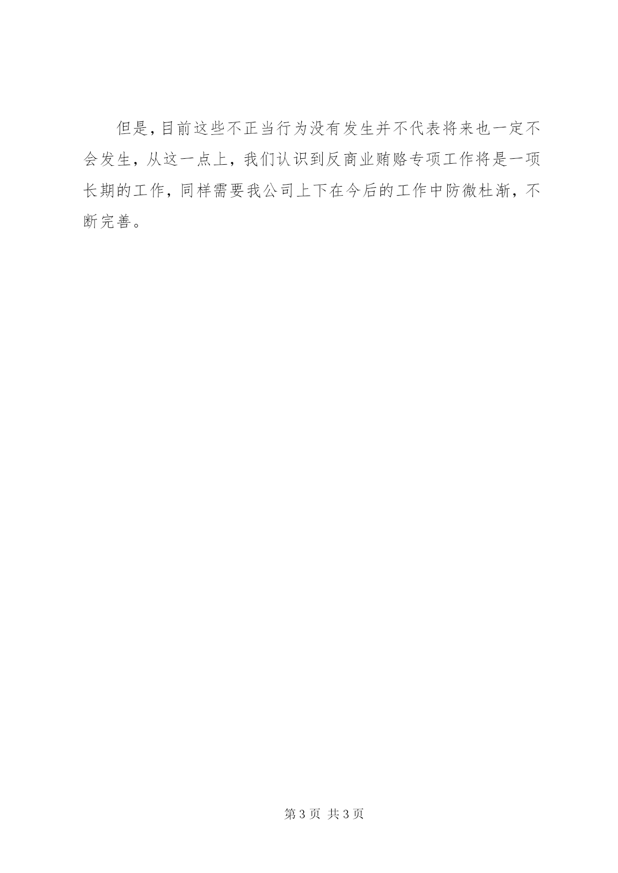 第PAGE\*Arabic\*MERGEFORMAT3页共NUMPAGES\*MERGEFORMAT3页公司反商业贿赂自查自纠总结____年,举国上下掀起了开展反商业贿赂专项活动。____年_月,我公司召开了反商业贿赂专项工作会议,通过反复学习,加深领会,充分认识此次专项工作的目的和重要意义。公司上下联系自身的工作实际,对照有关文件精神进行自查自纠,做到边学习、边检查、边核实。通过全面传达会议精神,达共识,找差距,增信心,抓落实。现就活动开展以来情况自查如下:一、积极贯彻,充分领悟文件精神内涵反商业贿赂是党中央、国务院做出的重大决策和部署,是实现经济社会又快又好发展的迫切需要,是建立健全惩治和预防腐败体系的重要内容,也是当前深化改革、确保发展的有力保障。我公司收到相关文件后,立即召开全体员工会议,要求广大员工认真学习,统筹兼顾,合理安排,按照方案内容、抓检查、抓整改,扎实有效地推动反商业贿赂工作有效开展。通过学习,大家一致认为:只有扎实开展反商业贿赂活动,才能有效遏制违法违纪案件的发生,全面提升内控和风险管理水平,为企业改革和发展创造良好环境。二、加强领导,积极落实反商业贿赂组织体系反商业贿赂工作是一项严肃的管理工作,也是企业持续健康发展的内在需求。为使文件精神落到实处,我公司及时成立了以经理杨尤林同志为组长,书记范汉明同志为副组长,其他副总经理为成员的“反商业贿赂专项工作”领导小组,形成完整体系,全面指导反商业贿赂工作。三、结合实际,认真开展自查自纠我们围绕“标本兼治,实行综合反贿赂;统筹谋划部署,稳步有序推进;明确工作重点,解决突出问题;严格把握政策,维护发展大局”的指导原则,按照上级会议精神和自身工作实际,重点自查自纠大额财务费用的开支、客户工程、房屋租赁、大宗设备采购、资金拆借过程中的不正当交易行为;重点排查客户工程、输配电网点(办公用房)装修、大宗设备采购、废旧物资处置等业务贿赂事件;重点加强对内部控制、资本约束管理、财务收支管理、资产的构建和废旧物品处理、劳动用工以及商业道德建设的长效机制建设进行自查自纠。通过此阶段反商业贿赂专项工作的开展,从自查的情况看,我公司各项内控制度能够覆盖各项业务,各项业务操作均能够按照有关规定办理,无集体和工作人员为了获得与客户、其他单位和个人的交易机会或者有利于实现交易目的,向其赠送现金、物品或者其他有价证券等行贿的行为;也无客户、其他单位和个人为了获得交易机会或者有利于实现交易目的,向集体和工作人员赠送且被接受的现金、物品或者其他有价证券等受贿和索贿的行为。但是,目前这些不正当行为没有发生并不代表将来也一定不会发生,从这一点上,我们认识到反商业贿赂专项工作将是一项长期的工作,同样需要我公司上下在今后的工作中防微杜渐,不断完善。