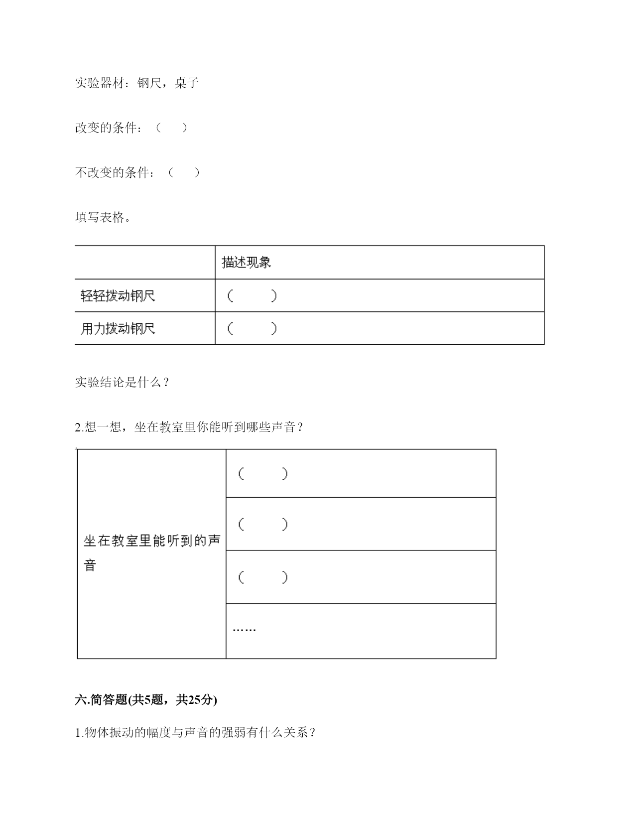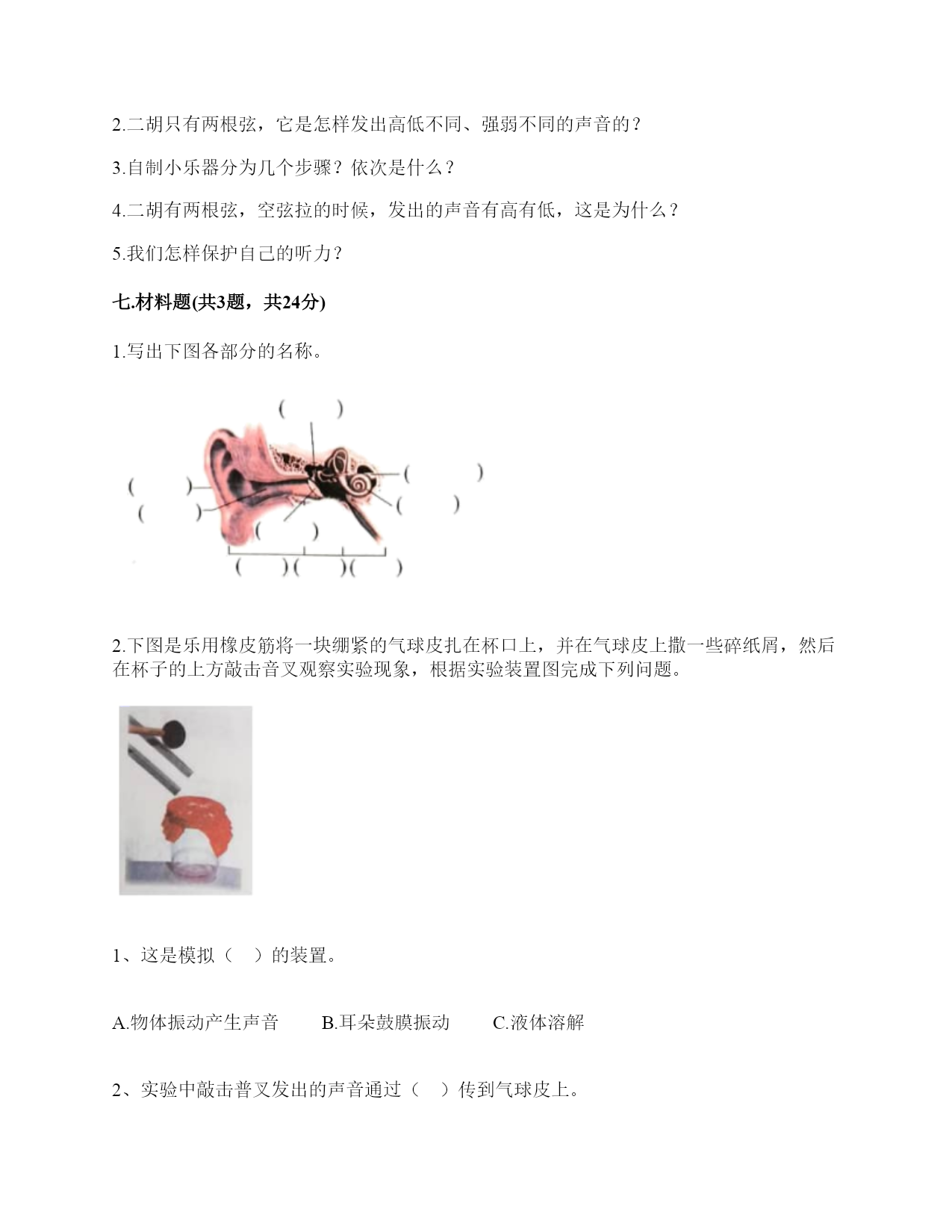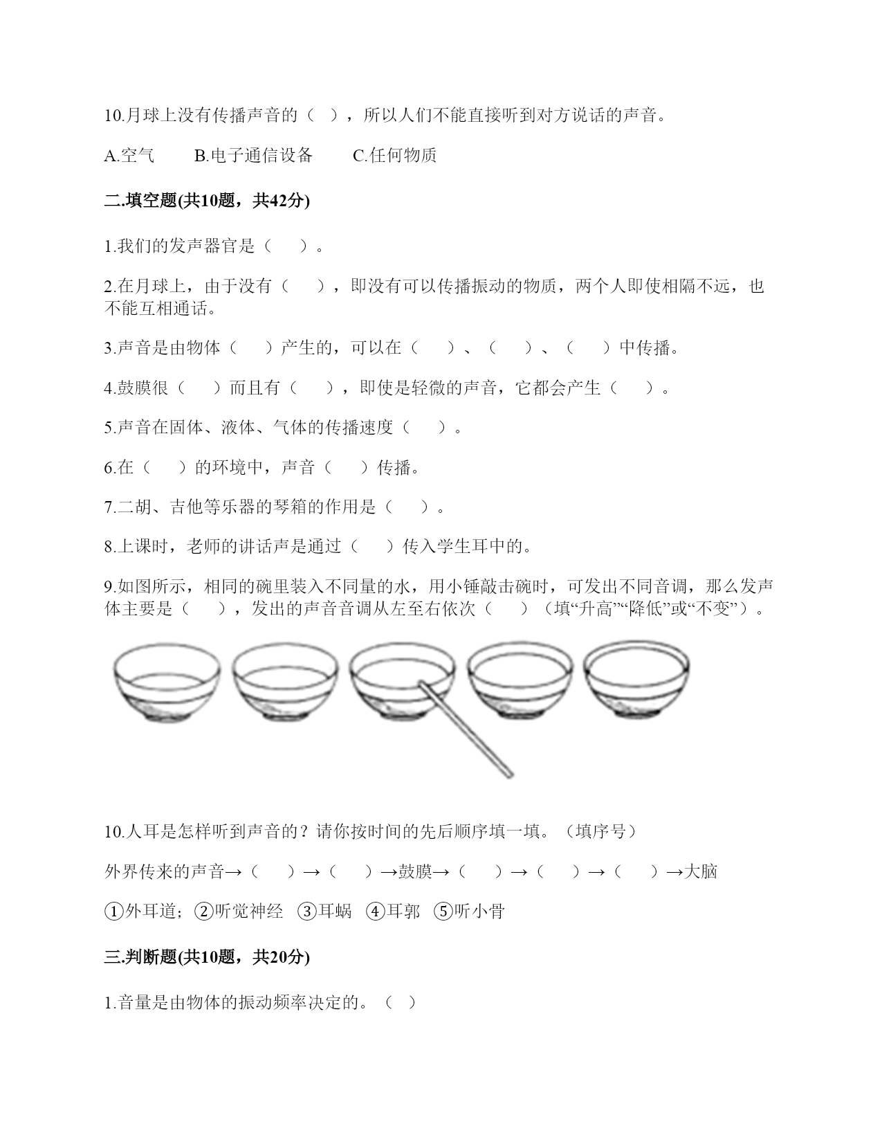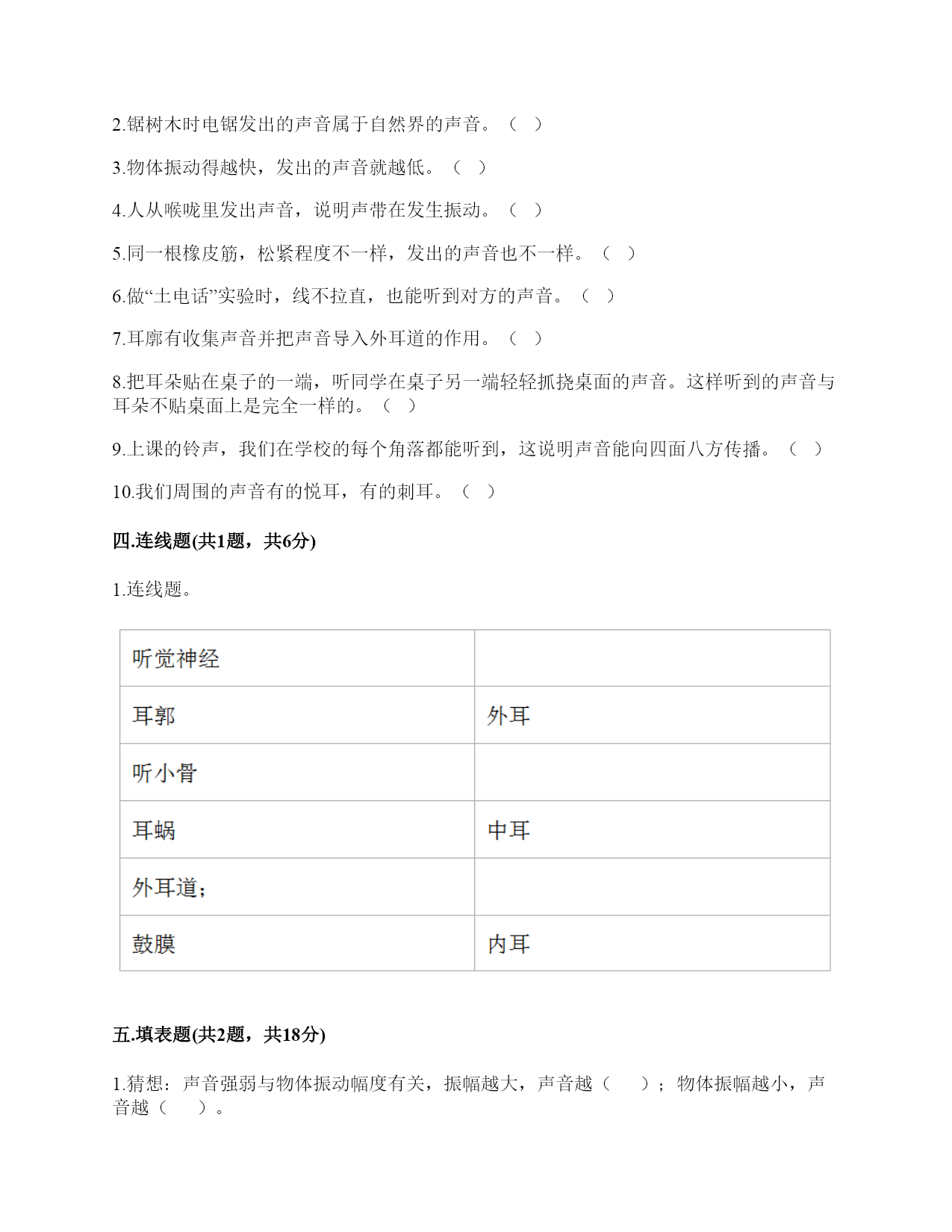 小学科学《声音》练习题一.选择题(共10题,共20分)1.声音的高低是由物体振动的()决定的。A.快慢B.幅度C.是否振动2.上课铃声响起,校园内各个地方的同学都能听到铃声,这不能说明的是()。A.声音能向四面八方传播B.空气能传播声音C.声音在空气中的传播能力比固体中强3.下列关于声音强弱的说法,正确的是()。A.声音没有强弱之分B.声音的强弱无法控制C.声音的强弱与物体的振动幅度有关4.下列描述声音的词语不合适的一组是()。A.高低、高兴B.悦耳、动听C.刺耳、难听5.在弹吉他时,若想要使它发出的声音强一些,可以()。A.换新吉他B.用的力气大一些C.调节弦的松紧度6.音乐会上不同的乐器演奏同一首乐曲,我们也能够分辨出不同乐器发出的声音,这主要是依据()。A.声音的强弱不同B.声音的高低不同C.不同物体发出声音不同7.手指轻轻接触到桌面,并在桌面上滑动一段距离,当耳贴在桌子一角上,再这样让手指滑动时,()。A.耳朵听到一样清晰的声音B.它们几乎没有声音C.贴在桌角上听得更清晰8.下列现象中,说明声音能在液体中传播的是()。A.鱼被岸上的脚步声吓走B.游客听到瀑布倾泻而下的声音C.海边的人听到海浪拍击岩石的声音9.人的耳郭有()的作用。A.收集声音B.产生振动C.传播声音10.月球上没有传播声音的(),所以人们不能直接听到对方说话的声音。A.空气B.电子通信设备C.任何物质二.填空题(共10题,共42分)1.我们的发声器官是()。2.在月球上,由于没有(),即没有可以传播振动的物质,两个人即使相隔不远,也不能互相通话。3.声音是由物体()产生的,可以在()、()、()中传播。4.鼓膜很()而且有(),即使是轻微的声音,它都会产生()。5.声音在固体、液体、气体的传播速度()。6.在()的环境中,声音()传播。7.二胡、吉他等乐器的琴箱的作用是()。8.上课时,老师的讲话声是通过()传入学生耳中的。9.如图所示,相同的碗里装入不同量的水,用小锤敲击碗时,可发出不同音调,那么发声体主要是(),发出的声音音调从左至右依次()(填“升高”“降低”或“不变”)。10.人耳是怎样听到声音的?请你按时间的先后顺序填一填。(填序号)外界传来的声音→()→()→鼓膜→()→()→()→大脑①外耳道;②听觉神经③耳蜗④耳郭⑤听小骨三.判断题(共10题,共20分)1.音量是由物体的振动频率决定的。()2.锯树木时电锯发出的声音属于自然界的声音。()3.物体振动得越快,发出的声音就越低。()4.人从喉咙里发出声音,说明声带在发生振动。()5.同一根橡皮筋,松紧程度不一样,发出的声音也不一样。()6.做“土电话”实验时,线不拉直,也能听到对方的声音。()7.耳廓有收集声音并把声音导入外耳道的作用。()8.把耳朵贴在桌子的一端,听同学在桌子另一端轻轻抓挠桌面的声音。这样听到的声音与耳朵不贴桌面上是完全一样的。()9.上课的铃声,我们在学校的每个角落都能听到,这说明声音能向四面八方传播。()10.我们周围的声音有的悦耳,有的刺耳。()四.连线题(共1题,共6分)1.连线题。五.填表题(共2题,共18分)1.猜想:声音强弱与物体振动幅度有关,振幅越大,声音越();物体振幅越小,声音越()。实验器材:钢尺,桌子改变的条件:()不改变的条件:()填写表格。实验结论是什么?2.想一想,坐在教室里你能听到哪些声音?六.简答题(共5题,共25分)1.物体振动的幅度与声音的强弱有什么关系?2.二胡只有两根弦,它是怎样发出高低不同、强弱不同的声音的?3.自制小乐器分为几个步骤?依次是什么?4.二胡有两根弦,空弦拉的时候,发出的声音有高有低,这是为什么?5.我们怎样保护自己的听力?七.材料题(共3题,共24分)1.写出下图各部分的名称。2.下图是乐用橡皮筋将一块绷紧的气球皮扎在杯口上,并在气球皮上撒一些碎纸屑,然后在杯子的上方敲击音叉观察实验现象,根据实验装置图完成下列问题。1、这是模拟()的装置。A.物体振动产生声音B.耳朵鼓膜振动C.液体溶解2、实验中敲击普叉发出的声音通过()传到气球皮上。A.音叉B.空气C.杯子3、实验时用力敲击音叉,观察到气球皮上的碎纸屑()。A.被音叉吸引B.不动C.在气球皮上跳动4、实验时用力敲音叉,气球皮上的碎纸屑跳动幅度与轻敲时相比,()。A.跳动幅度小B.跳动幅度大C.一样5、通过这个实验,我们可以知道我们耳朵里的(),它就像这个气球皮一样很薄,而且有弹性,它时时刻刻都在接收着各种声音,并产生振动。A.耳道B.鼓膜C.听小晋3.小明和小刚用细棉线连接两个纸杯做了个“土电话”。之后
