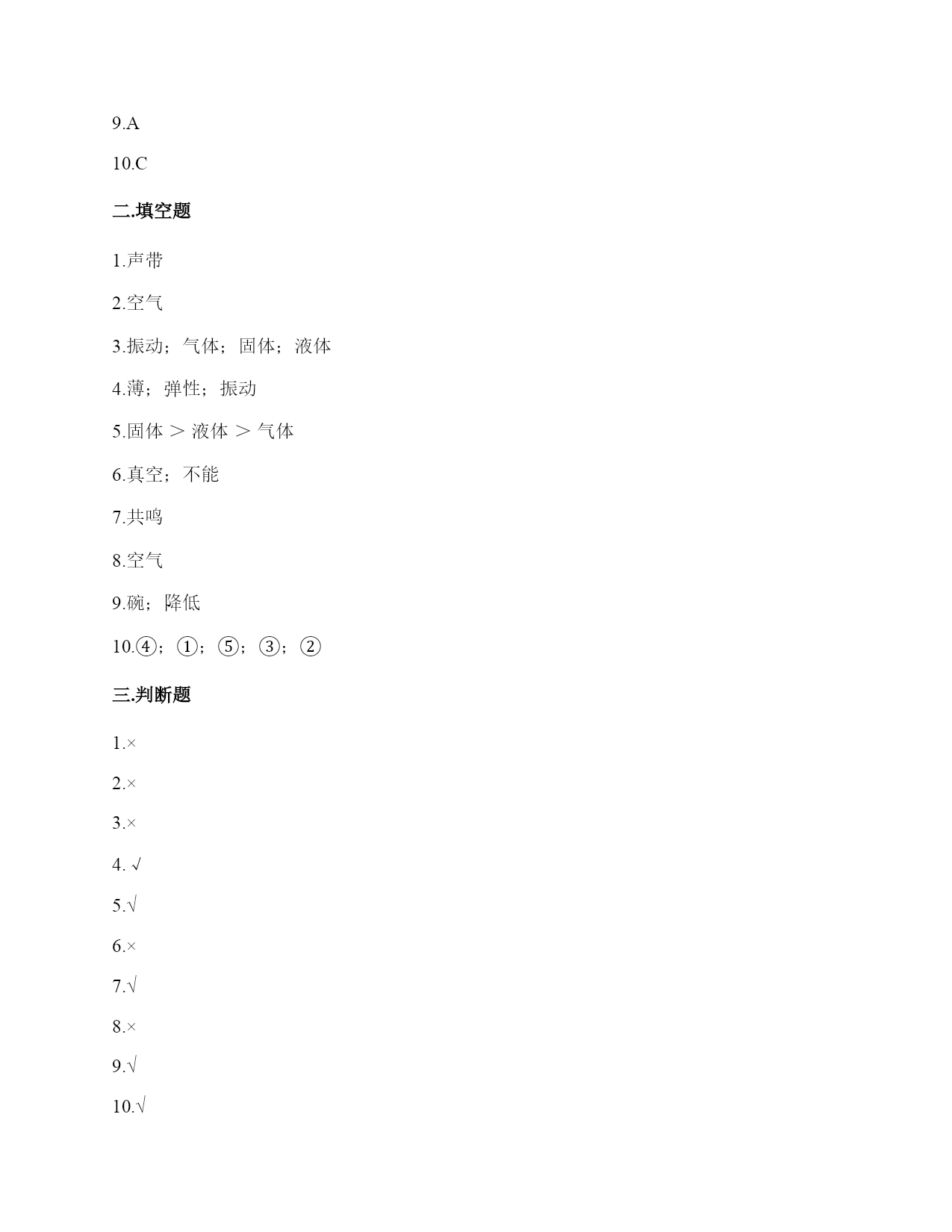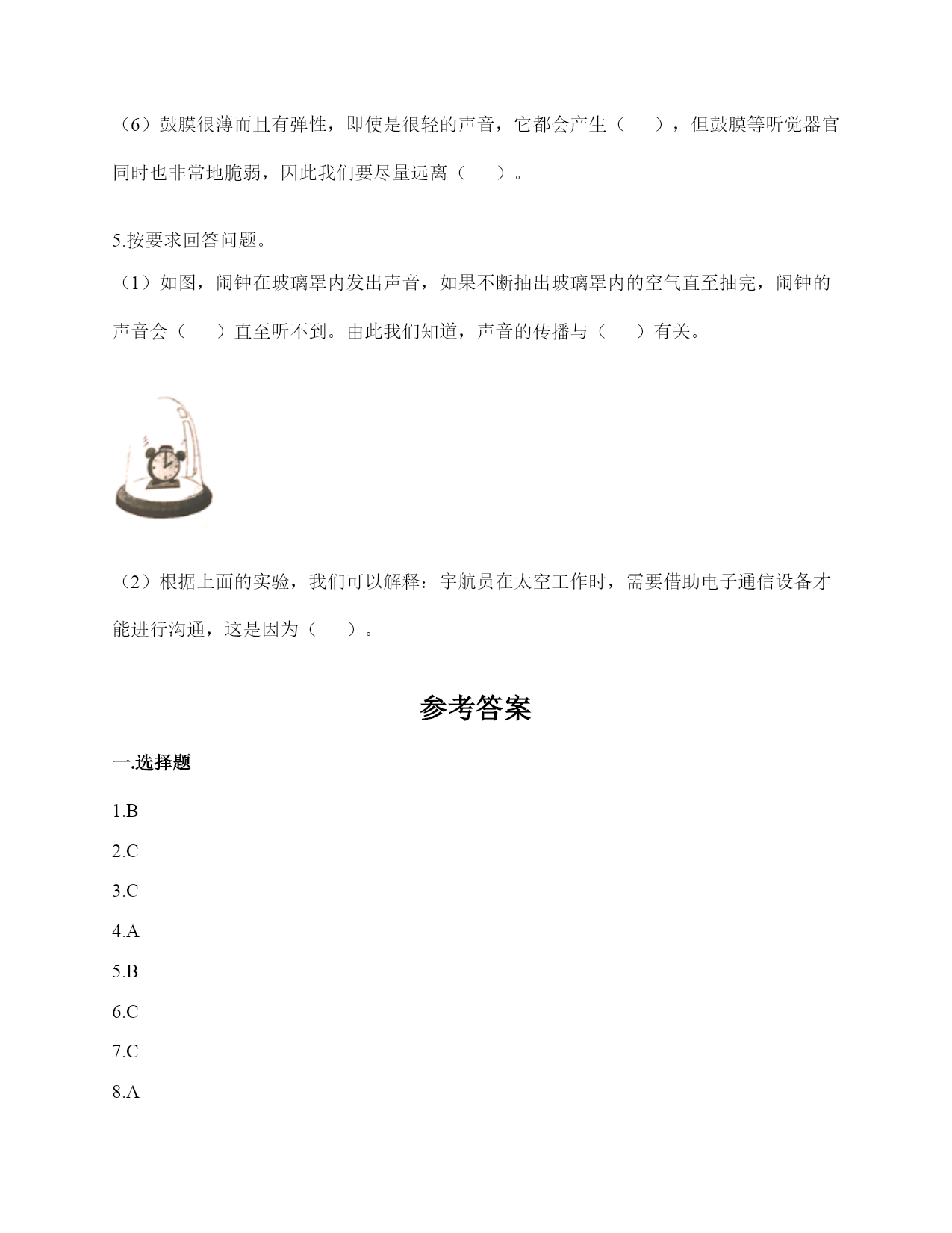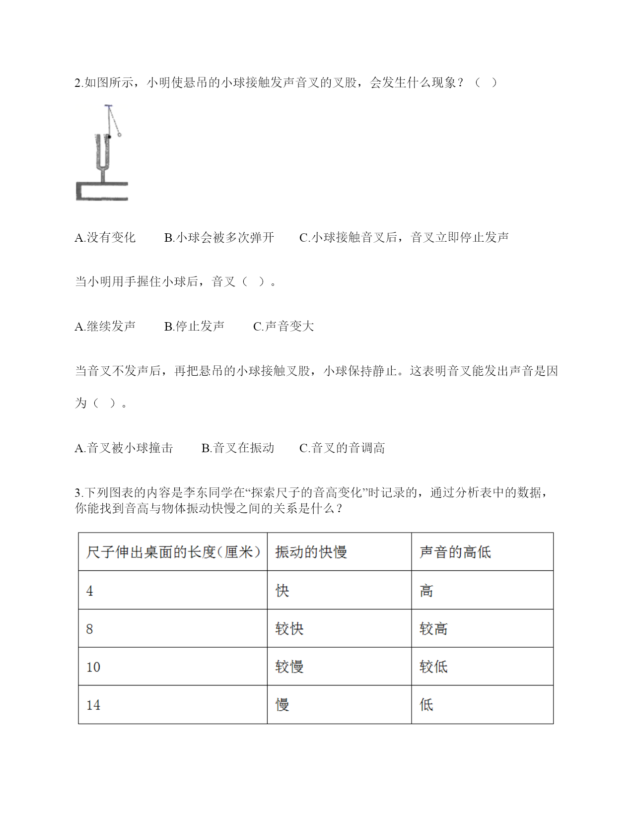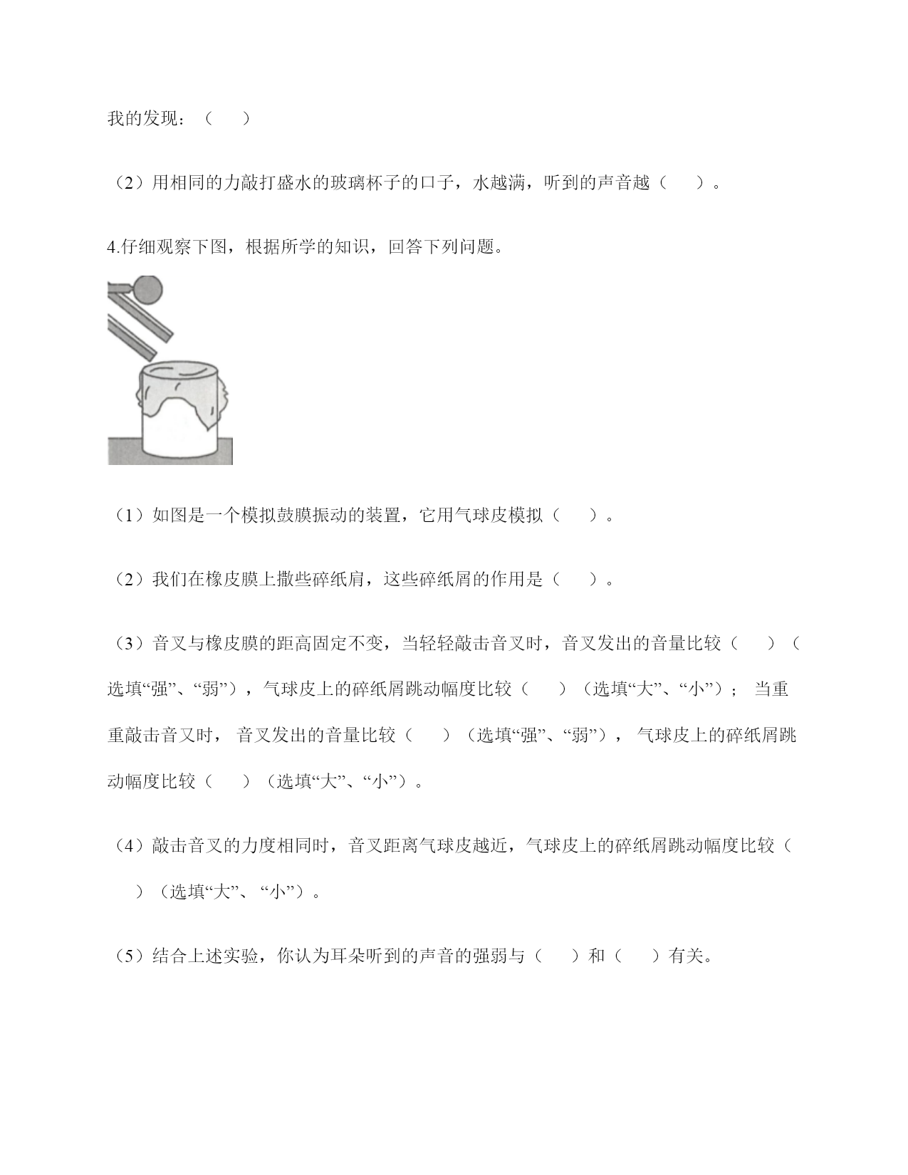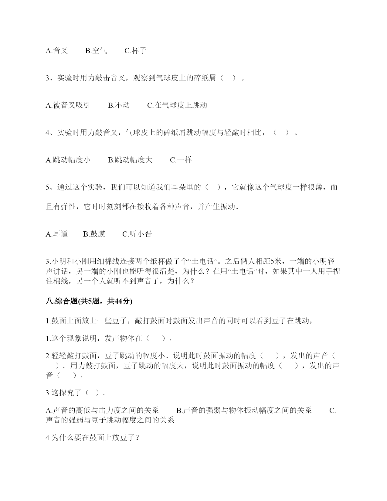 小学科学《声音》练习题一.选择题(共10题,共20分)1.声音的高低是由物体振动的()决定的。A.快慢B.幅度C.是否振动2.上课铃声响起,校园内各个地方的同学都能听到铃声,这不能说明的是()。A.声音能向四面八方传播B.空气能传播声音C.声音在空气中的传播能力比固体中强3.下列关于声音强弱的说法,正确的是()。A.声音没有强弱之分B.声音的强弱无法控制C.声音的强弱与物体的振动幅度有关4.下列描述声音的词语不合适的一组是()。A.高低、高兴B.悦耳、动听C.刺耳、难听5.在弹吉他时,若想要使它发出的声音强一些,可以()。A.换新吉他B.用的力气大一些C.调节弦的松紧度6.音乐会上不同的乐器演奏同一首乐曲,我们也能够分辨出不同乐器发出的声音,这主要是依据()。A.声音的强弱不同B.声音的高低不同C.不同物体发出声音不同7.手指轻轻接触到桌面,并在桌面上滑动一段距离,当耳贴在桌子一角上,再这样让手指滑动时,()。A.耳朵听到一样清晰的声音B.它们几乎没有声音C.贴在桌角上听得更清晰8.下列现象中,说明声音能在液体中传播的是()。A.鱼被岸上的脚步声吓走B.游客听到瀑布倾泻而下的声音C.海边的人听到海浪拍击岩石的声音9.人的耳郭有()的作用。A.收集声音B.产生振动C.传播声音10.月球上没有传播声音的(),所以人们不能直接听到对方说话的声音。A.空气B.电子通信设备C.任何物质二.填空题(共10题,共42分)1.我们的发声器官是()。2.在月球上,由于没有(),即没有可以传播振动的物质,两个人即使相隔不远,也不能互相通话。3.声音是由物体()产生的,可以在()、()、()中传播。4.鼓膜很()而且有(),即使是轻微的声音,它都会产生()。5.声音在固体、液体、气体的传播速度()。6.在()的环境中,声音()传播。7.二胡、吉他等乐器的琴箱的作用是()。8.上课时,老师的讲话声是通过()传入学生耳中的。9.如图所示,相同的碗里装入不同量的水,用小锤敲击碗时,可发出不同音调,那么发声体主要是(),发出的声音音调从左至右依次()(填“升高”“降低”或“不变”)。10.人耳是怎样听到声音的?请你按时间的先后顺序填一填。(填序号)外界传来的声音→()→()→鼓膜→()→()→()→大脑①外耳道;②听觉神经③耳蜗④耳郭⑤听小骨三.判断题(共10题,共20分)1.音量是由物体的振动频率决定的。()2.锯树木时电锯发出的声音属于自然界的声音。()3.物体振动得越快,发出的声音就越低。()4.人从喉咙里发出声音,说明声带在发生振动。()5.同一根橡皮筋,松紧程度不一样,发出的声音也不一样。()6.做“土电话”实验时,线不拉直,也能听到对方的声音。()7.耳廓有收集声音并把声音导入外耳道的作用。()8.把耳朵贴在桌子的一端,听同学在桌子另一端轻轻抓挠桌面的声音。这样听到的声音与耳朵不贴桌面上是完全一样的。()9.上课的铃声,我们在学校的每个角落都能听到,这说明声音能向四面八方传播。()10.我们周围的声音有的悦耳,有的刺耳。()四.连线题(共1题,共6分)1.连线题。五.填表题(共2题,共18分)1.猜想:声音强弱与物体振动幅度有关,振幅越大,声音越();物体振幅越小,声音越()。实验器材:钢尺,桌子改变的条件:()不改变的条件:()填写表格。实验结论是什么?2.想一想,坐在教室里你能听到哪些声音?六.简答题(共5题,共25分)1.物体振动的幅度与声音的强弱有什么关系?2.二胡只有两根弦,它是怎样发出高低不同、强弱不同的声音的?3.自制小乐器分为几个步骤?依次是什么?4.二胡有两根弦,空弦拉的时候,发出的声音有高有低,这是为什么?5.我们怎样保护自己的听力?七.材料题(共3题,共24分)1.写出下图各部分的名称。2.下图是乐用橡皮筋将一块绷紧的气球皮扎在杯口上,并在气球皮上撒一些碎纸屑,然后在杯子的上方敲击音叉观察实验现象,根据实验装置图完成下列问题。1、这是模拟()的装置。A.物体振动产生声音B.耳朵鼓膜振动C.液体溶解2、实验中敲击普叉发出的声音通过()传到气球皮上。A.音叉B.空气C.杯子3、实验时用力敲击音叉,观察到气球皮上的碎纸屑()。A.被音叉吸引B.不动C.在气球皮上跳动4、实验时用力敲音叉,气球皮上的碎纸屑跳动幅度与轻敲时相比,()。A.跳动幅度小B.跳动幅度大C.一样5、通过这个实验,我们可以知道我们耳朵里的(),它就像这个气球皮一样很薄,而且有弹性,它时时刻刻都在接收着各种声音,并产生振动。A.耳道B.鼓膜C.听小晋3.小明和小刚用细棉线连接两个纸杯做了个“土电话”。之后