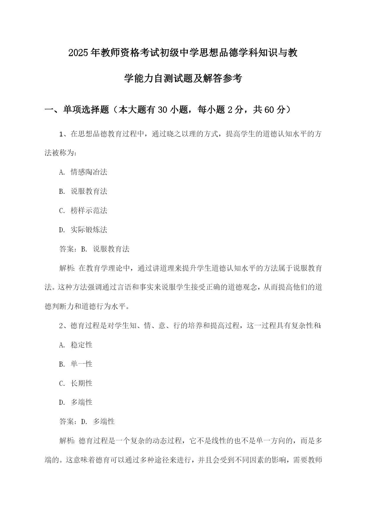 2025年教师资格考试初级中学学科知识与教学能力思想品德自测试题及解答参考.docx