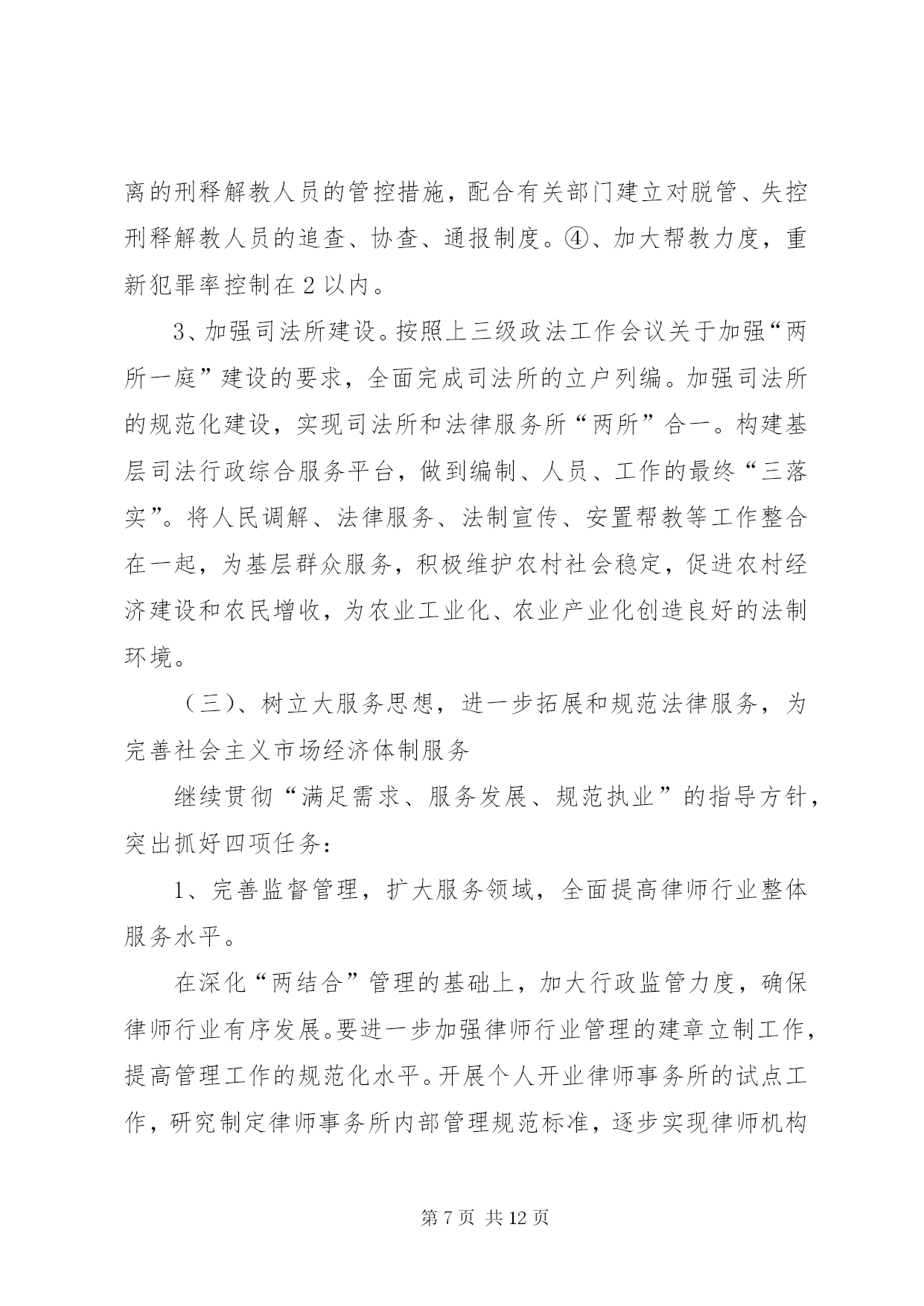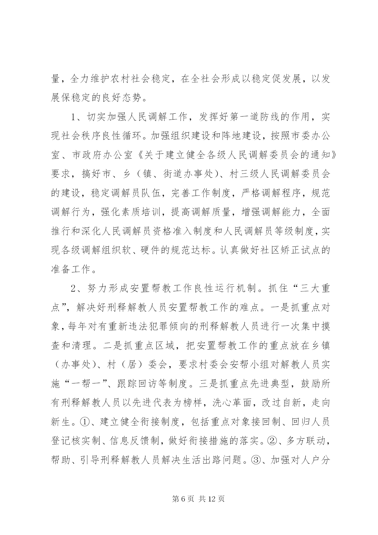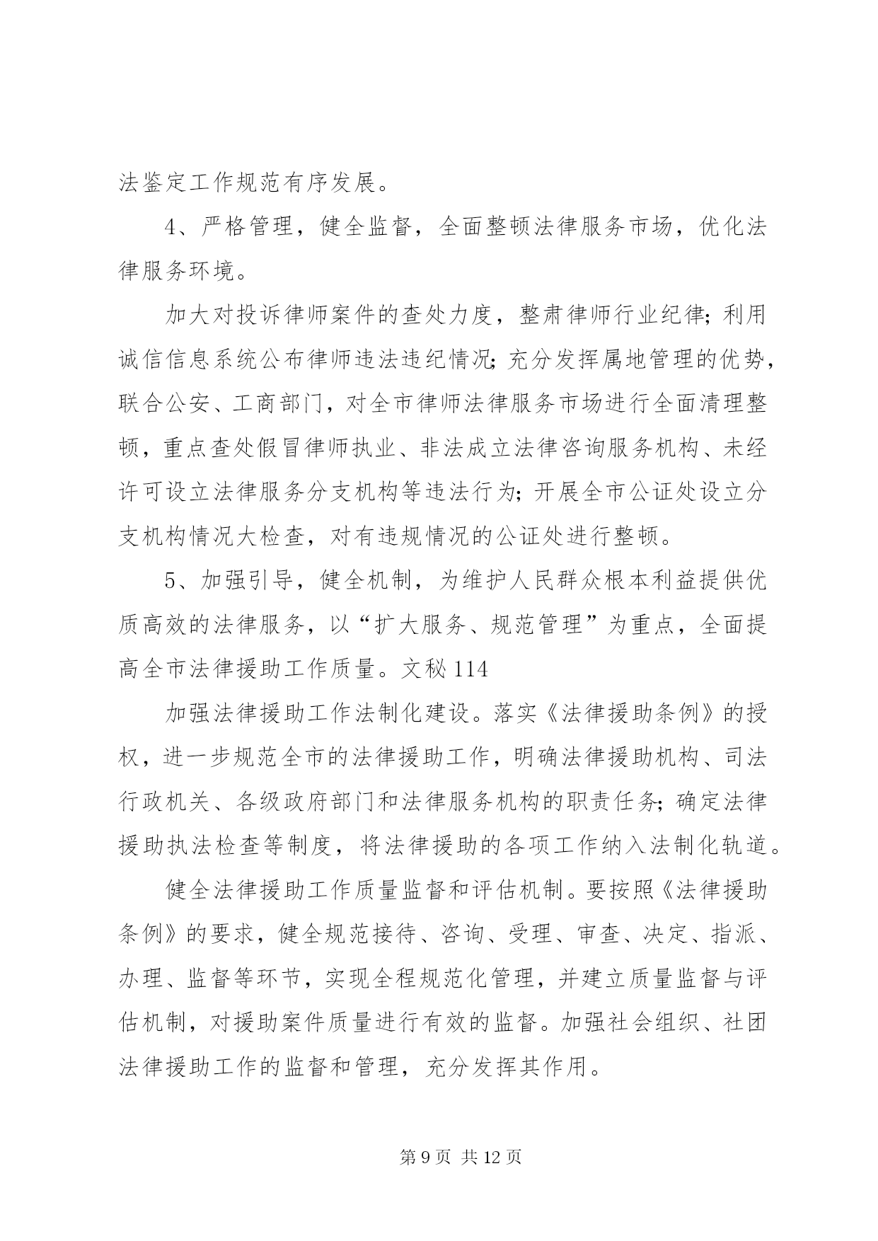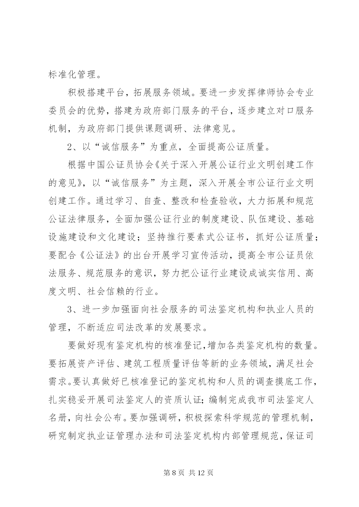 第PAGE\*Arabic\*MERGEFORMAT12页共NUMPAGES\*MERGEFORMAT12页市司法局工作意见市司法局20xx年工作意见根据xx市司法局20xx年度工作要求和我市二届三次会议精神,为充分发挥法制教育、法律服务、法律保障三大职能,更好地服务我市经济发展,特制定本意见。一、指导思想坚持以党的“十六大”精神和“三个代表”重要思想为指导,紧紧围绕全市的中心工作,立足本职,以普法为主线,以服务经济建设,维护社会稳定为首任,以民间矛盾纠纷排查为重点,进一步加强和改进司法干警队伍建设,提高服务质量,牢固树立“立警为公,司法为民”的思想观念,为“工业立市、工业强市、科教兴市”战略保驾护航。充分发挥司法行政职能,全力维护我市的稳定工作。二、工作目标今年,我局的总体工作目标是“围绕一个中心、突出四个重点、采取四项措施、围绕四个环节,完善四项管理,抓好四项强化,实现四个突破”。(一)围绕一个中心,开展各项工作。紧紧围绕为经济建设和社会稳定服务为中心,促进服务意识由传统型向现代型转变,提高服务质量,为“工业立市、工业强市、科教兴市”战略保驾护航。(二)突出四个重点,深化“四五”普法教育。一是落实党政机关干部常规学法制度。二是抓好各种对象法律教育培训工作。三是制定各类普法对象的考试考核制度。四是围绕党委政府中心工作,开展法制宣传教育。(三)采取四项措施,开创省级依法治市试点工作新局面。一是加强严格依法执法。二是加强行业依法治理,重点抓好学校等事业单位的依法治理。三是加强依法治村居、社区,深化基层民主政治建设。(四)完善四项管理,提高法律服务整体水平。一是完善“148”法律服务管理。二是完善法律援助中心管理。三是完善律师公证工作管理。四是完善基层法律服务所管理。(五)抓好四项强化,建设一支高素质的司法行政队伍。一是强化镇街道司法所的建设。二是强化村居调委会主任素质教育。三是强化机关内部管理。四是强化机关党建工作。(六)实现四个突破,确保各项工作再上新台阶。一是在领导干部学法用法上要有新突破,以领导干部的“学法用法”的带头作用推运全市学法用法,为全市的经济发展创造良好的法制环境;二是基层依法治理要有新突破,通过开展“民主法制示范村”活动,加强基层民主法制建设,年度内要有30%的村实现“示范村”标准;三是刑释教安置帮教工作要有新突破,要采取各种有效措施,做好释解人员的安置帮教工作,力争实现重新犯罪率控制在2%以内的工作目标;四是法律服务工作要有新突破,在为市政府配备法律顾问的基础上,要继续向各乡镇、企事业单位、学校延伸,并在服务质量上下功夫,做到顾问单位和当事人都满意。三、工作任务(一)、认真谋划,积极部署,推动普法依法治理工作深入开展普法工作继续深入开展“四五普法”,加强“三个建设”即:队伍建设、阵地建设、制度建设;寻求“三个突破”即:在普法工作的指导和监督力度上寻求突破;在普法工作的管理方法上寻求突破;在青少年法制教育上寻求突破,形成“大普法”的工作格局。1、认真贯彻落实上级关于加强领导干部学法用法工作的意见,全面实施《xx市领导干部学法八项制度》,对领导干部、政府公务员进行以邓小平民主法制理论、国家基本法律、市场经济法律法规、《行政处罚法》、《行政复议法》、《行政诉讼法》,特别是新的宪法修正案和即将实施的《行政许可证》为主要内容的法制培训,培养“懂法型”干部,为建设“法制化城市”,推进政府职能转变,全面建设小康社会打下坚实的法制基础;把普法合格证制度与干部任免使用制度和年终考核制度有机结合起来。将我市领导干部、政府公务人员普法步入制度化、规范化管理轨道,以切实提高他们的法律素质,真正使领导干部依法决策、依法执政;政府公务人员依法行政、依法办事。2、继续深入开展“法律五入”工作(法入社区、法入农村、法入学校、法入企业、法入市场)。组织、搭建社区普法载体,使普法入区入院;充分发挥法制副校长和法制辅导员的作用,积极协助教育行政部门做好法制副校长和法制课师资的培训工作;与工商、税务部门联合,建设、完善各类专业市场普法阵地,利用广播、板报、标语、散发普法小册子等多种手段向商户普法,培养他们的依法经营、依法纳税和诚信经营意识;探索企业普法的新路子,在规模以上企业建立法制室,使企业活动在法律的框架内健康运行。3、深入开展送法下乡活动。积极响应中宣部、科技部、司法部、文化部、卫生部等十四部委联合下发的关于在20xx年继续深入开展文化、科技、卫生“三下乡”活动的通知要求,认真组织送法制文艺、送普法资料、送法制电影下乡活动,通过举办“法律大集”和法律工作者进村入户,把“三贴近”,即贴近农村、贴近群众、贴近农民生产生活需要的法律知识,送到农村,送给农民,引导农民市司法局工作意见群众学法、懂法、守法、护法、依法办事,学会