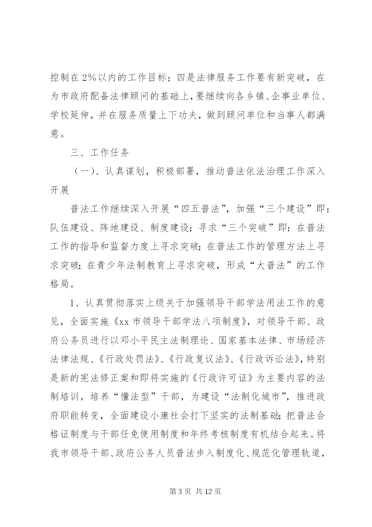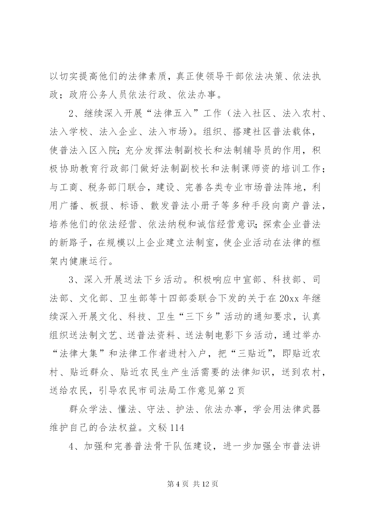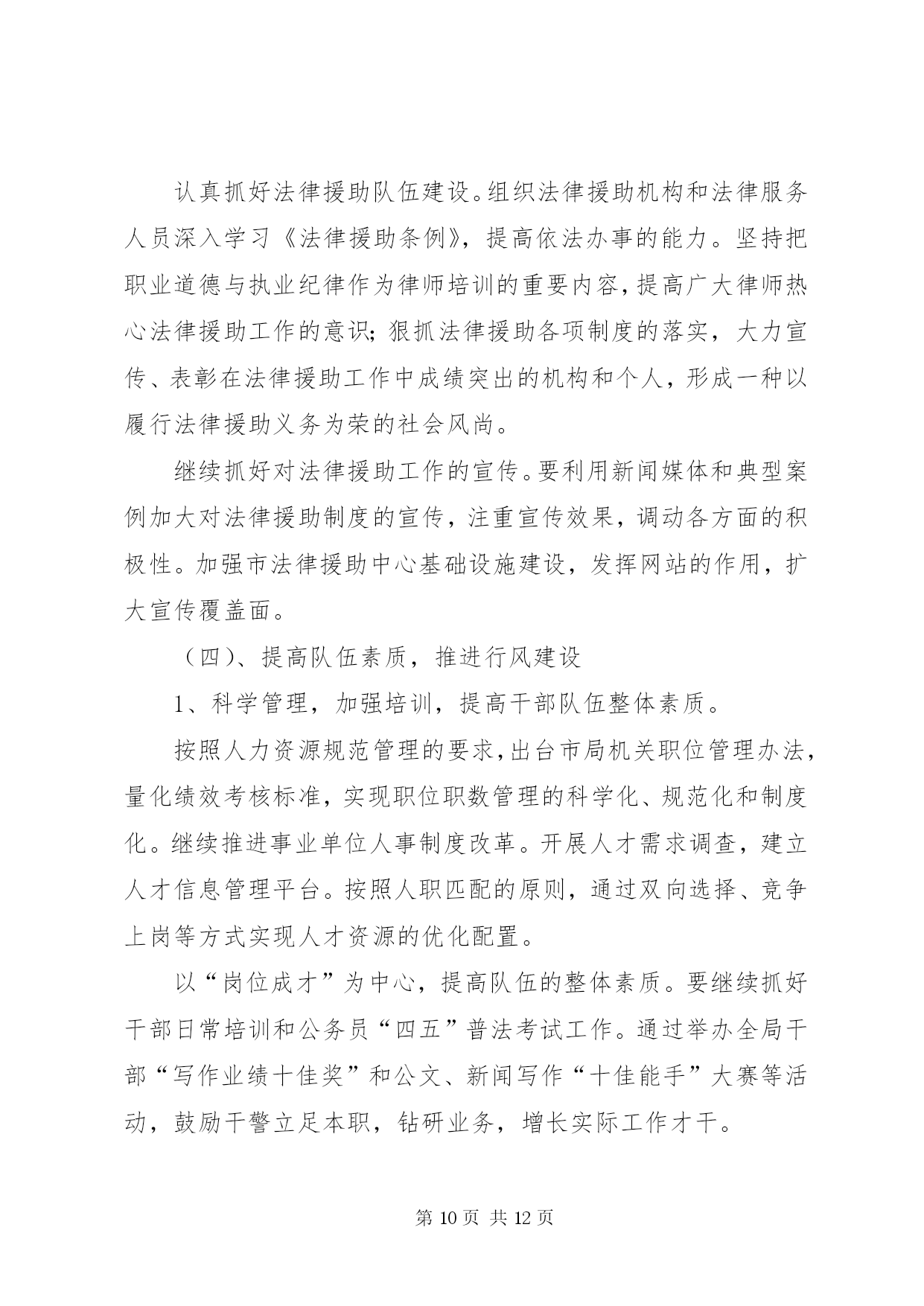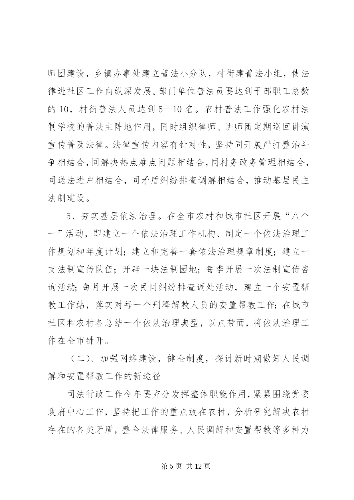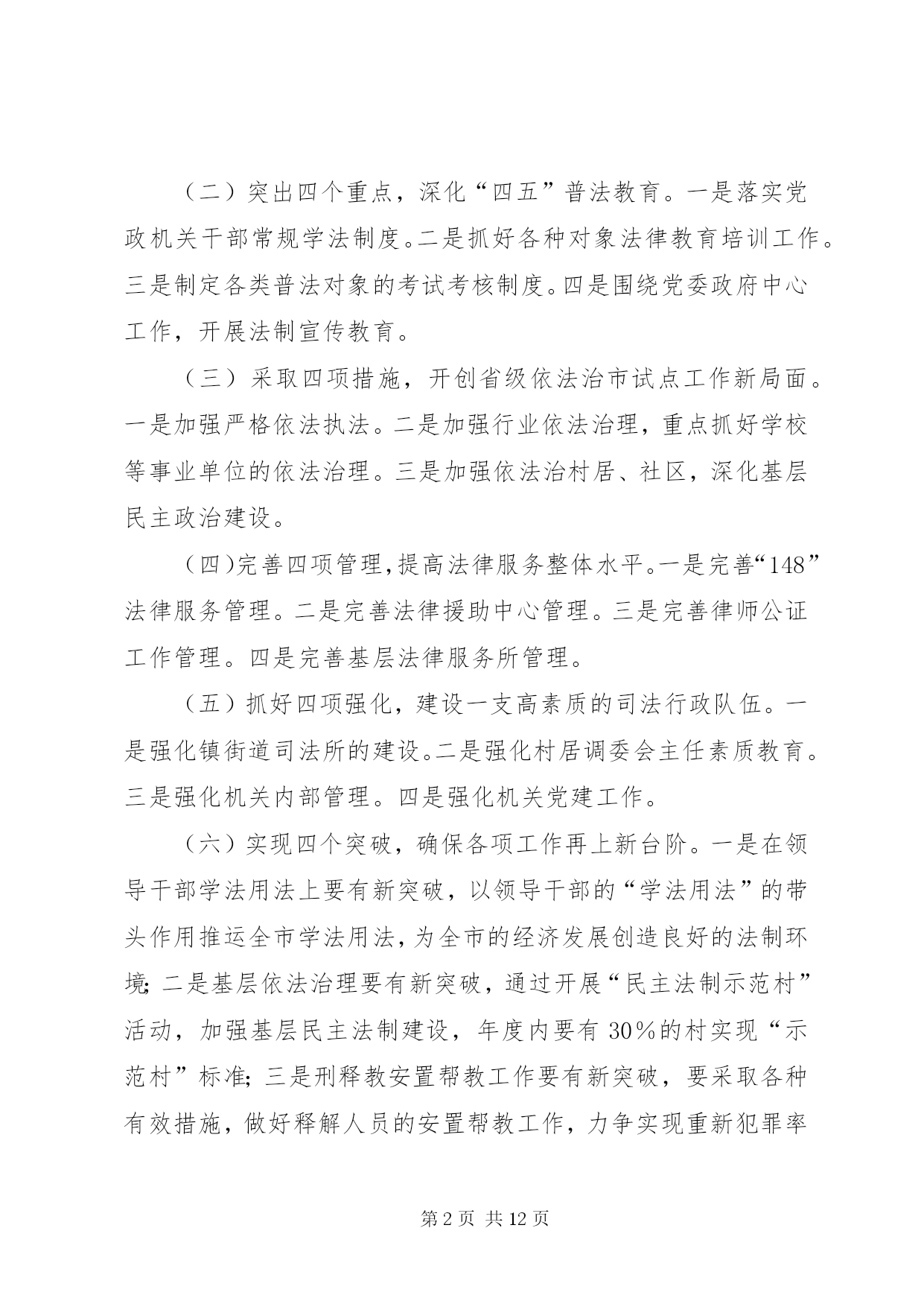 第PAGE\*Arabic\*MERGEFORMAT12页共NUMPAGES\*MERGEFORMAT12页市司法局工作意见市司法局20xx年工作意见根据xx市司法局20xx年度工作要求和我市二届三次会议精神,为充分发挥法制教育、法律服务、法律保障三大职能,更好地服务我市经济发展,特制定本意见。一、指导思想坚持以党的“十六大”精神和“三个代表”重要思想为指导,紧紧围绕全市的中心工作,立足本职,以普法为主线,以服务经济建设,维护社会稳定为首任,以民间矛盾纠纷排查为重点,进一步加强和改进司法干警队伍建设,提高服务质量,牢固树立“立警为公,司法为民”的思想观念,为“工业立市、工业强市、科教兴市”战略保驾护航。充分发挥司法行政职能,全力维护我市的稳定工作。二、工作目标今年,我局的总体工作目标是“围绕一个中心、突出四个重点、采取四项措施、围绕四个环节,完善四项管理,抓好四项强化,实现四个突破”。(一)围绕一个中心,开展各项工作。紧紧围绕为经济建设和社会稳定服务为中心,促进服务意识由传统型向现代型转变,提高服务质量,为“工业立市、工业强市、科教兴市”战略保驾护航。(二)突出四个重点,深化“四五”普法教育。一是落实党政机关干部常规学法制度。二是抓好各种对象法律教育培训工作。三是制定各类普法对象的考试考核制度。四是围绕党委政府中心工作,开展法制宣传教育。(三)采取四项措施,开创省级依法治市试点工作新局面。一是加强严格依法执法。二是加强行业依法治理,重点抓好学校等事业单位的依法治理。三是加强依法治村居、社区,深化基层民主政治建设。(四)完善四项管理,提高法律服务整体水平。一是完善“148”法律服务管理。二是完善法律援助中心管理。三是完善律师公证工作管理。四是完善基层法律服务所管理。(五)抓好四项强化,建设一支高素质的司法行政队伍。一是强化镇街道司法所的建设。二是强化村居调委会主任素质教育。三是强化机关内部管理。四是强化机关党建工作。(六)实现四个突破,确保各项工作再上新台阶。一是在领导干部学法用法上要有新突破,以领导干部的“学法用法”的带头作用推运全市学法用法,为全市的经济发展创造良好的法制环境;二是基层依法治理要有新突破,通过开展“民主法制示范村”活动,加强基层民主法制建设,年度内要有30%的村实现“示范村”标准;三是刑释教安置帮教工作要有新突破,要采取各种有效措施,做好释解人员的安置帮教工作,力争实现重新犯罪率控制在2%以内的工作目标;四是法律服务工作要有新突破,在为市政府配备法律顾问的基础上,要继续向各乡镇、企事业单位、学校延伸,并在服务质量上下功夫,做到顾问单位和当事人都满意。三、工作任务(一)、认真谋划,积极部署,推动普法依法治理工作深入开展普法工作继续深入开展“四五普法”,加强“三个建设”即:队伍建设、阵地建设、制度建设;寻求“三个突破”即:在普法工作的指导和监督力度上寻求突破;在普法工作的管理方法上寻求突破;在青少年法制教育上寻求突破,形成“大普法”的工作格局。1、认真贯彻落实上级关于加强领导干部学法用法工作的意见,全面实施《xx市领导干部学法八项制度》,对领导干部、政府公务员进行以邓小平民主法制理论、国家基本法律、市场经济法律法规、《行政处罚法》、《行政复议法》、《行政诉讼法》,特别是新的宪法修正案和即将实施的《行政许可证》为主要内容的法制培训,培养“懂法型”干部,为建设“法制化城市”,推进政府职能转变,全面建设小康社会打下坚实的法制基础;把普法合格证制度与干部任免使用制度和年终考核制度有机结合起来。将我市领导干部、政府公务人员普法步入制度化、规范化管理轨道,以切实提高他们的法律素质,真正使领导干部依法决策、依法执政;政府公务人员依法行政、依法办事。2、继续深入开展“法律五入”工作(法入社区、法入农村、法入学校、法入企业、法入市场)。组织、搭建社区普法载体,使普法入区入院;充分发挥法制副校长和法制辅导员的作用,积极协助教育行政部门做好法制副校长和法制课师资的培训工作;与工商、税务部门联合,建设、完善各类专业市场普法阵地,利用广播、板报、标语、散发普法小册子等多种手段向商户普法,培养他们的依法经营、依法纳税和诚信经营意识;探索企业普法的新路子,在规模以上企业建立法制室,使企业活动在法律的框架内健康运行。3、深入开展送法下乡活动。积极响应中宣部、科技部、司法部、文化部、卫生部等十四部委联合下发的关于在20xx年继续深入开展文化、科技、卫生“三下乡”活动的通知要求,认真组织送法制文艺、送普法资料、送法制电影下乡活动,通过举办“法律大集”和法律工作者进村入户,把“三贴近”,即贴近农村、贴近群众、贴近农民生产生活需要的法律知识,送到农村,送给农民,引导农民市司法局工作意见群众学法、懂法、守法、护法、依法办事,学会