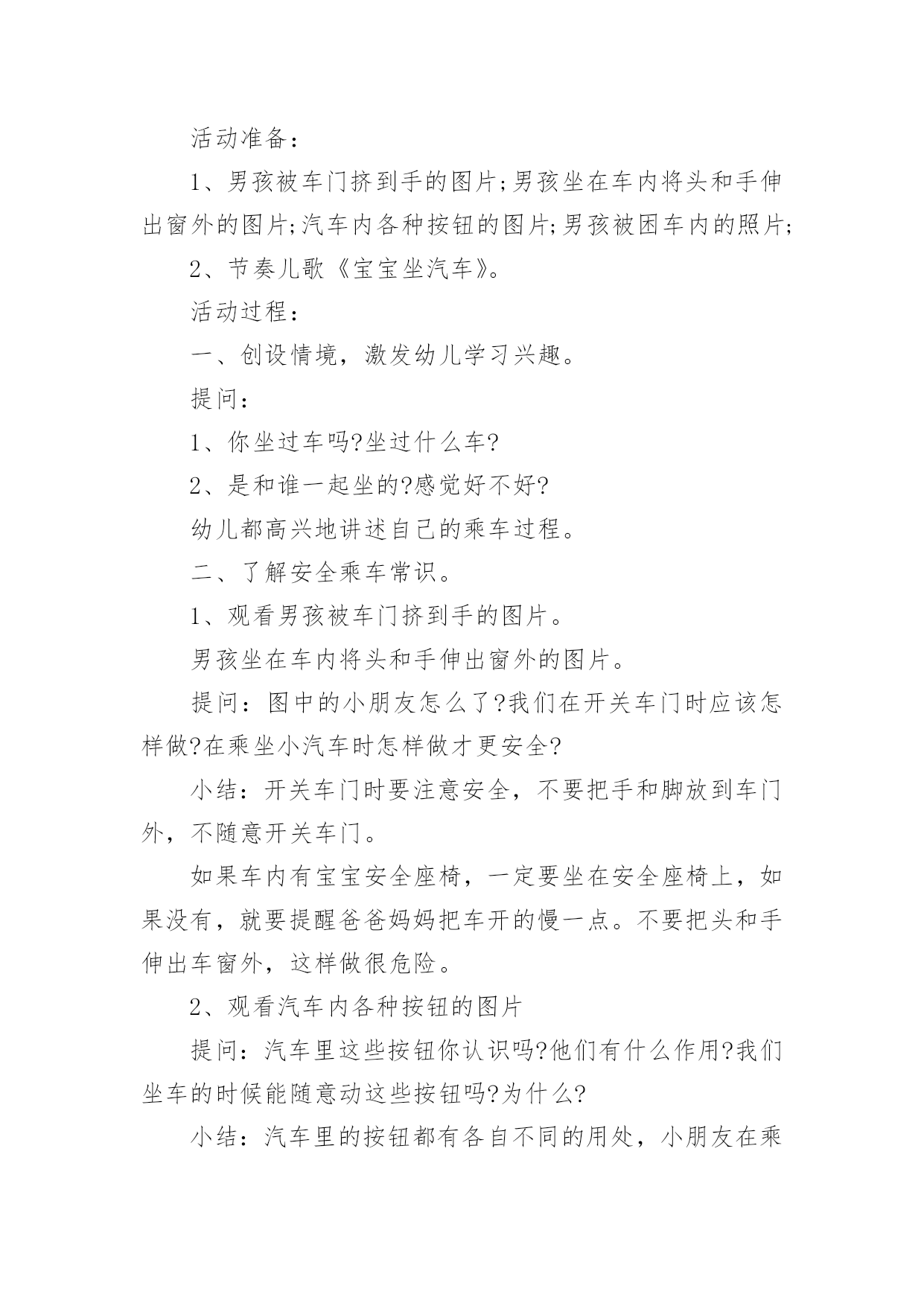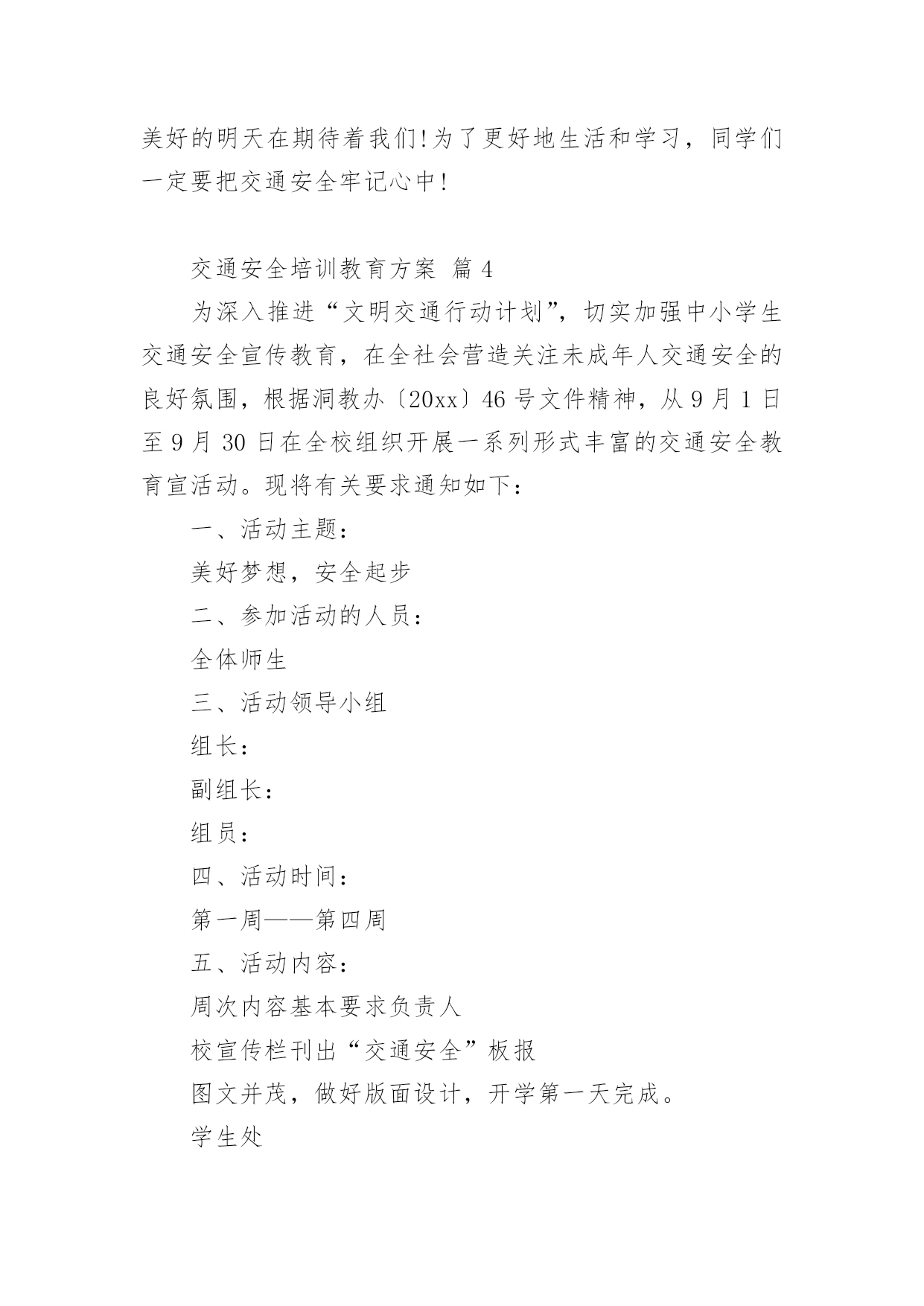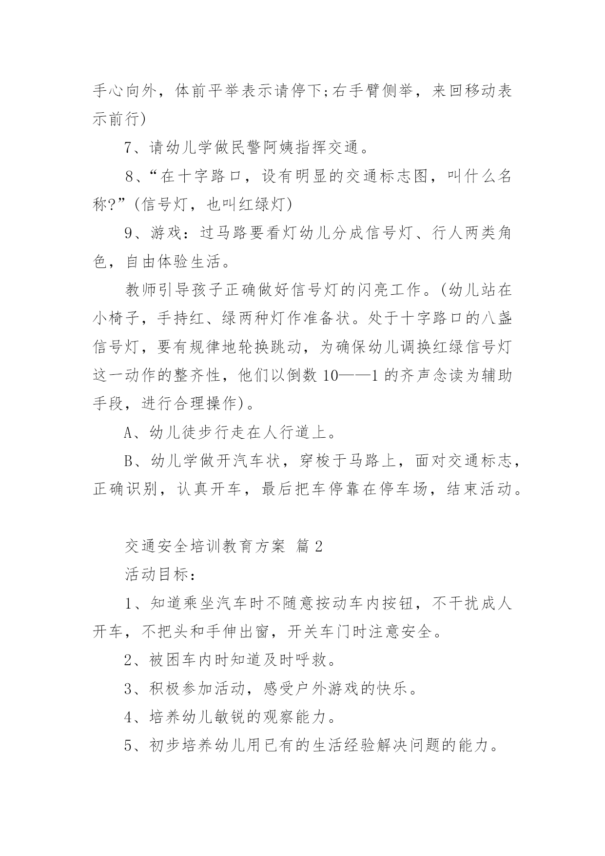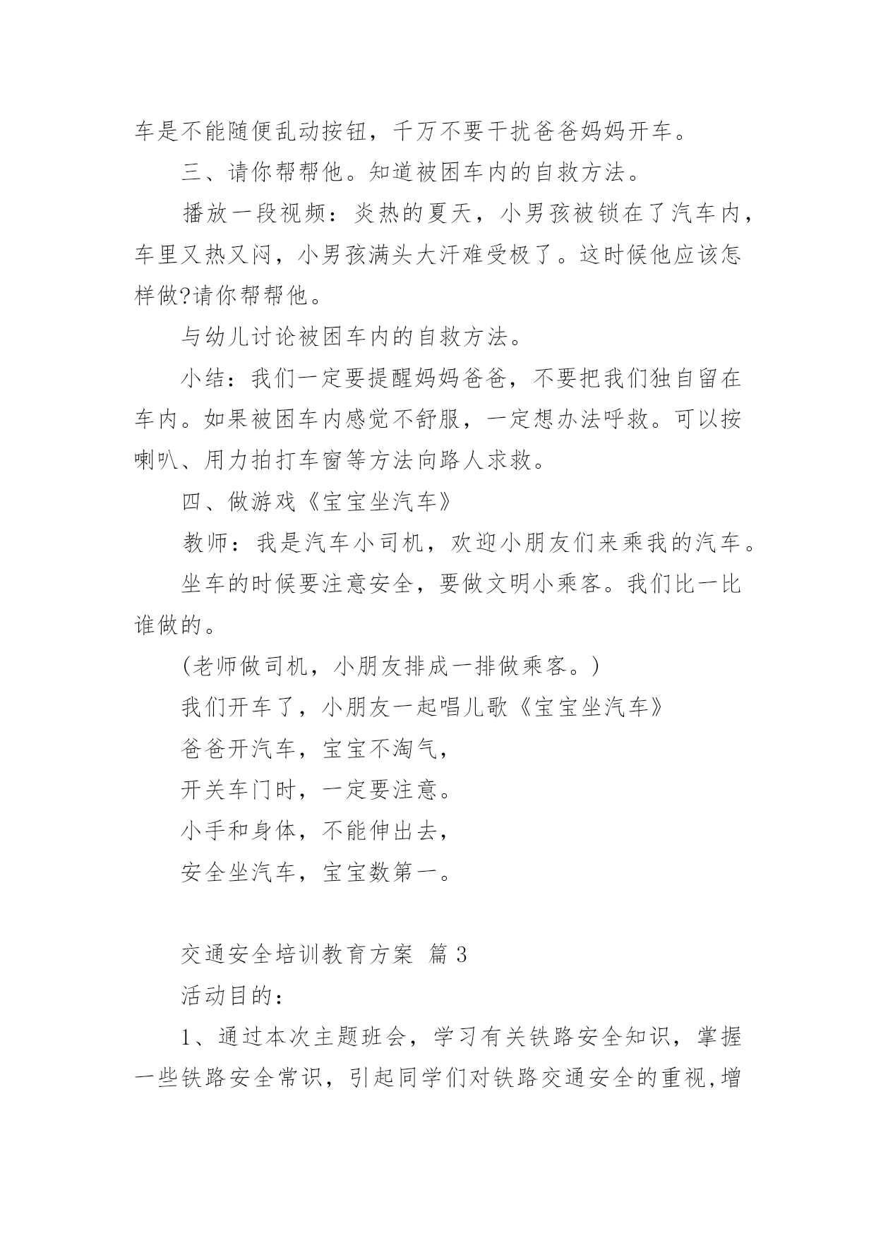 交通安全培训教育方案交通安全培训教育方案(通用23篇)为了确保我们的努力取得实效,时常需要预先开展方案准备工作,方案是书面计划,具有内容条理清楚、步骤清晰的特点。那么我们该怎么去写方案呢?以下是小编整理的交通安全培训教育方案,欢迎阅读与收藏。交通安全培训教育方案篇1活动目标:1、尝试了解各种不同的交通标志图,正确表达它们各自的作用。2、体验游戏的快乐,乐于遵守交通规则。3、加强幼儿的安全意识。4、探索、发现生活中的多样性及特征。5、遵守社会行为规则,不做“禁止”的事。活动准备:1、幼儿收集有关“交通标志图”的信息图片。2、立体的交通标志(停车标志、信号灯、左右转弯标志)。3、自制信号灯(红色八盏、绿色八盏)。4、“十字路口”场景布置。活动难点重点:活动难点:解读交通标志图。活动重点:让幼儿明白如何正确穿越“十字路口”。活动过程:1、“前些日子,老师请小朋友在马路上仔细寻找各类交通标志图,并画了下来,谢谢你们。今天,我们开展一个“交通标志图”的交流会,请小朋友把各自找到的标志图展示出来,并要用自己的语言完整讲述,让我们听明白这个标志图所表达的含义。”2、幼儿自由交流,展示标志图,表达具体含义。3、教师引导孩子设想路段的情况,以生动的例子、形象的手势,启发孩子理解标志图的作用。如某幼儿出示“禁止鸣喇叭”这个标志图后,教师引发幼儿思考:(1)这个路段旁可能有什么需要保持安静的建筑设施?(2)假如你听到连续的喇叭声,你会感觉如何?(3)预设的答案:可能幼儿园的小朋友正在睡午觉;可能医院里有病人需要休息;可能大哥哥大姐姐正在考试;(4)小结:当我们看到这个标志,在走过这个地方时,绝对不能鸣喇叭,要保持安静。4、“现在,老师扮演交通警阿姨。你们想不想当一个小记者来采访我?”5、教师引导孩子从交通警的职业情况、辛苦程度、交通手势等不同角度进行采访。6、具体了解民警在指挥交通时有什么手势?这些手势告诉我们哪些交通规则?(微笑立正表示对人尊重;右手掌往上,手心向外,体前平举表示请停下;右手臂侧举,来回移动表示前行)7、请幼儿学做民警阿姨指挥交通。8、“在十字路口,设有明显的交通标志图,叫什么名称?”(信号灯,也叫红绿灯)9、游戏:过马路要看灯幼儿分成信号灯、行人两类角色,自由体验生活。教师引导孩子正确做好信号灯的闪亮工作。(幼儿站在小椅子,手持红、绿两种灯作准备状。处于十字路口的八盏信号灯,要有规律地轮换跳动,为确保幼儿调换红绿信号灯这一动作的整齐性,他们以倒数10——1的齐声念读为辅助手段,进行合理操作)。A、幼儿徒步行走在人行道上。B、幼儿学做开汽车状,穿梭于马路上,面对交通标志,正确识别,认真开车,最后把车停靠在停车场,结束活动。交通安全培训教育方案篇2活动目标:1、知道乘坐汽车时不随意按动车内按钮,不干扰成人开车,不把头和手伸出窗,开关车门时注意安全。2、被困车内时知道及时呼救。3、积极参加活动,感受户外游戏的快乐。4、培养幼儿敏锐的观察能力。5、初步培养幼儿用已有的生活经验解决问题的能力。活动准备:1、男孩被车门挤到手的图片;男孩坐在车内将头和手伸出窗外的图片;汽车内各种按钮的图片;男孩被困车内的照片;2、节奏儿歌《宝宝坐汽车》。活动过程:一、创设情境,激发幼儿学习兴趣。提问:1、你坐过车吗?坐过什么车?2、是和谁一起坐的?感觉好不好?幼儿都高兴地讲述自己的乘车过程。二、了解安全乘车常识。1、观看男孩被车门挤到手的图片。男孩坐在车内将头和手伸出窗外的图片。提问:图中的小朋友怎么了?我们在开关车门时应该怎样做?在乘坐小汽车时怎样做才更安全?小结:开关车门时要注意安全,不要把手和脚放到车门外,不随意开关车门。如果车内有宝宝安全座椅,一定要坐在安全座椅上,如果没有,就要提醒爸爸妈妈把车开的慢一点。不要把头和手伸出车窗外,这样做很危险。2、观看汽车内各种按钮的图片提问:汽车里这些按钮你认识吗?他们有什么作用?我们坐车的时候能随意动这些按钮吗?为什么?小结:汽车里的按钮都有各自不同的用处,小朋友在乘车是不能随便乱动按钮,千万不要干扰爸爸妈妈开车。三、请你帮帮他。知道被困车内的自救方法。播放一段视频:炎热的夏天,小男孩被锁在了汽车内,车里又热又闷,小男孩满头大汗难受极了。这时候他应该怎样做?请你帮帮他。与幼儿讨论被困车内的自救方法。小结:我们一定要提醒妈妈爸爸,不要把我们独自留在车内。如果被困车内感觉不舒服,一定想办法呼救。可以按喇叭、用力拍打车窗等方法向路人求救。四、做游戏《宝宝坐汽车》教师:我是汽车小司机,欢迎小朋友们来乘我的汽车。坐车的时候要注意安全,要做文明小乘客。我们比一比谁做的。(老师做司机,小朋友排成一排做乘客。)我们开车了,小朋友一起唱儿歌《宝宝坐汽车》爸爸开汽车,宝宝不淘气,开关车门时,一定要注意。小手和身体,不能伸出去,安