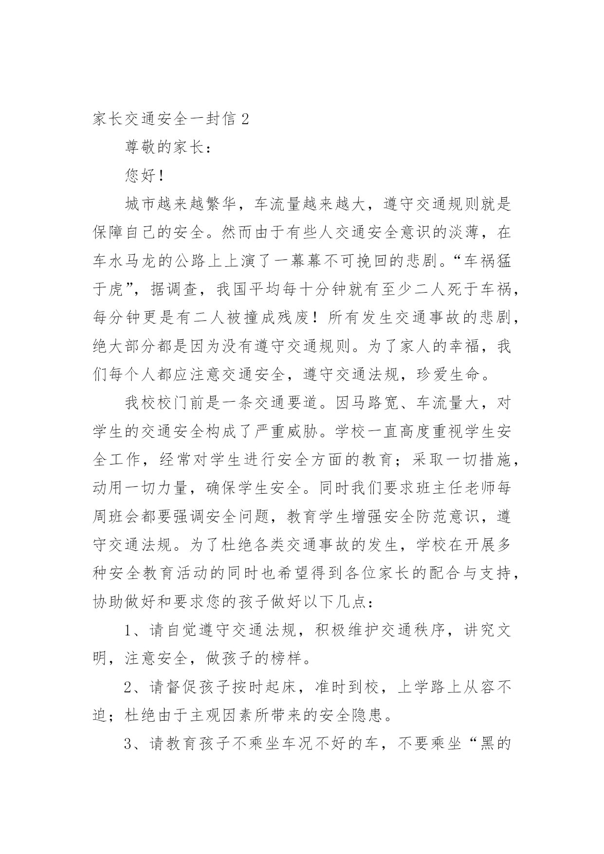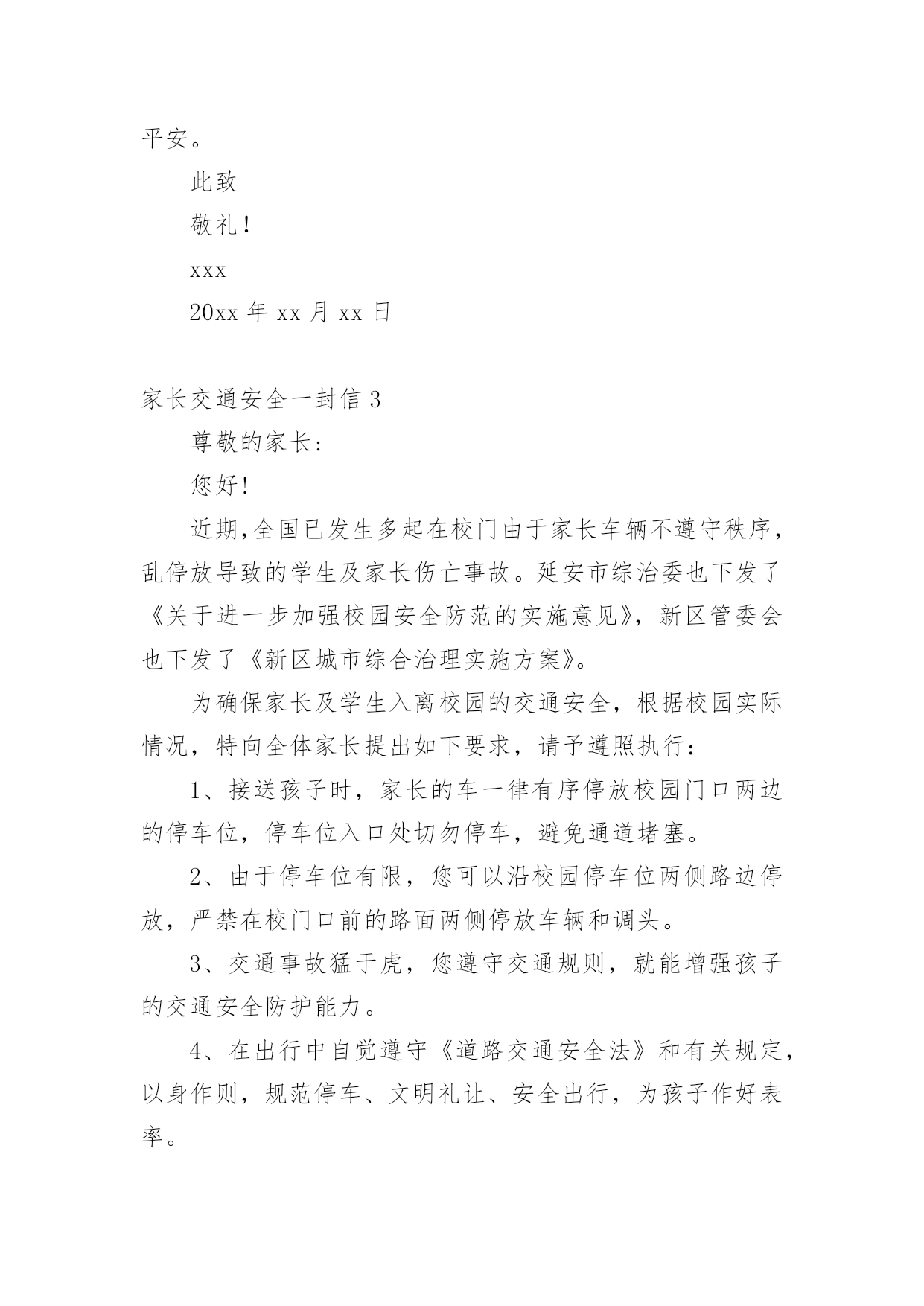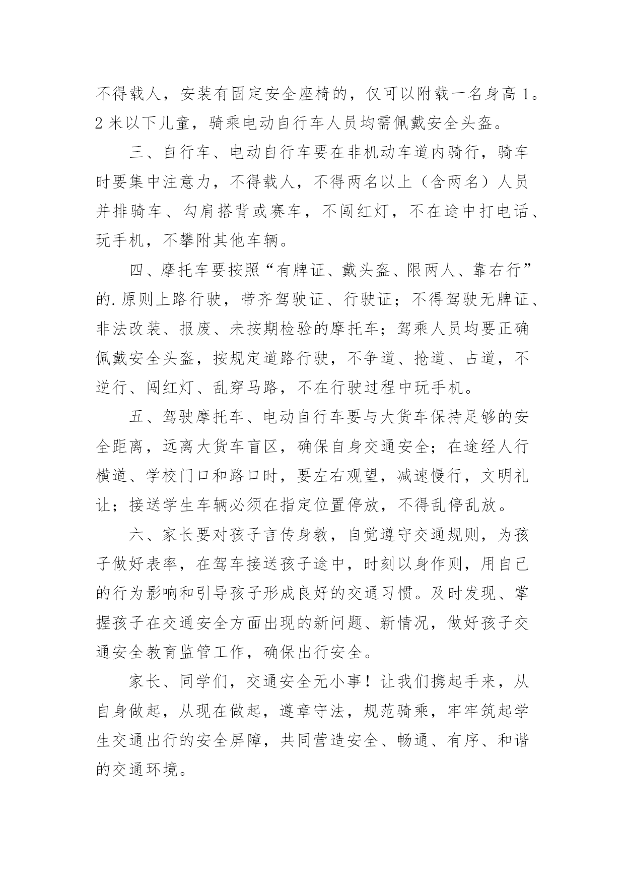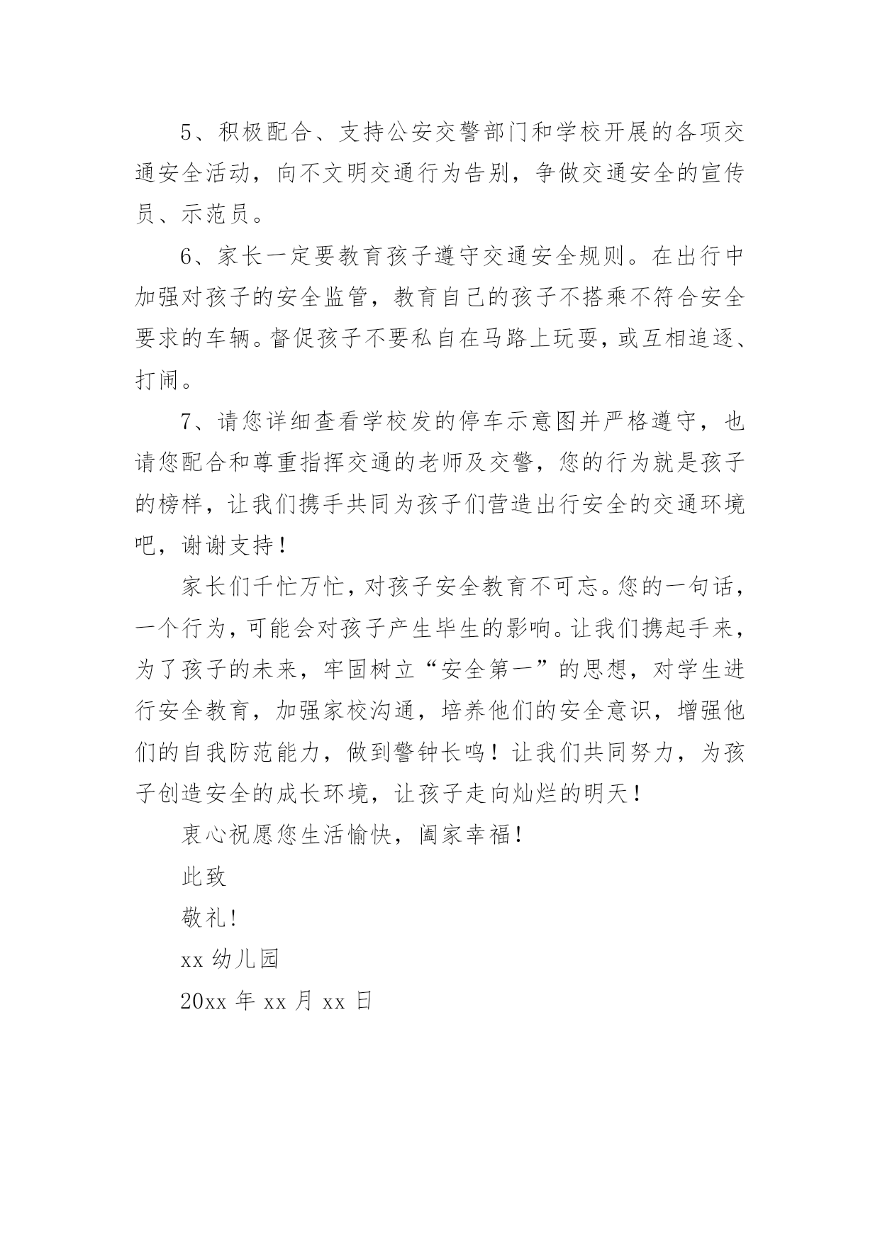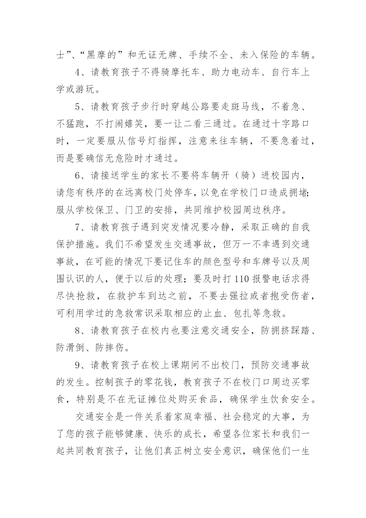 家长交通安全一封信在我们平凡的日常里,大家都跟书信打过交道吧,书信是一种用书面的形式向亲人、朋友、同志问候、谈话、联系事宜的应用文体。你所见过的书信是什么样的呢?以下是小编为大家整理的家长交通安全一封信,仅供参考,欢迎大家阅读。家长交通安全一封信1尊敬的学生家长、亲爱的同学们:您好!交通出行安全关系到每一个孩子的健康和家庭的幸福。随着潮州经济社会的快速发展,全市机动车保有量逐年增长,特别是摩电车辆的急剧增多,给交通出行安全带来极大挑战。为预防和减少涉学生、家长摩托车、电动自行车交通违法行为,共同守护孩子们的健康安全成长,倡导树立正确的交通安全观,共同遵守交通法规、杜绝交通违法,形成规范骑行、有序停放、文明礼让的良好出行风尚,敬请各位学生及家长做到:一、年龄未满12周岁不得骑自行车上路,未满16周岁不得骑电动自行车上路,未满18周岁不得驾驶摩托车上路。二、电动自行车要按照“上牌照、有保险、戴头盔、限一人、靠右行”的原则上路行驶,禁止驾驶无牌、非法改装、超期的违标电动车上路,自行车、电动自行车在城市道路上不得载人,安装有固定安全座椅的,仅可以附载一名身高1。2米以下儿童,骑乘电动自行车人员均需佩戴安全头盔。三、自行车、电动自行车要在非机动车道内骑行,骑车时要集中注意力,不得载人,不得两名以上(含两名)人员并排骑车、勾肩搭背或赛车,不闯红灯,不在途中打电话、玩手机,不攀附其他车辆。四、摩托车要按照“有牌证、戴头盔、限两人、靠右行”的.原则上路行驶,带齐驾驶证、行驶证;不得驾驶无牌证、非法改装、报废、未按期检验的摩托车;驾乘人员均要正确佩戴安全头盔,按规定道路行驶,不争道、抢道、占道,不逆行、闯红灯、乱穿马路,不在行驶过程中玩手机。五、驾驶摩托车、电动自行车要与大货车保持足够的安全距离,远离大货车盲区,确保自身交通安全;在途经人行横道、学校门口和路口时,要左右观望,减速慢行,文明礼让;接送学生车辆必须在指定位置停放,不得乱停乱放。六、家长要对孩子言传身教,自觉遵守交通规则,为孩子做好表率,在驾车接送孩子途中,时刻以身作则,用自己的行为影响和引导孩子形成良好的交通习惯。及时发现、掌握孩子在交通安全方面出现的新问题、新情况,做好孩子交通安全教育监管工作,确保出行安全。家长、同学们,交通安全无小事!让我们携起手来,从自身做起,从现在做起,遵章守法,规范骑乘,牢牢筑起学生交通出行的安全屏障,共同营造安全、畅通、有序、和谐的交通环境。家长交通安全一封信2尊敬的家长:您好!城市越来越繁华,车流量越来越大,遵守交通规则就是保障自己的安全。然而由于有些人交通安全意识的淡薄,在车水马龙的公路上上演了一幕幕不可挽回的悲剧。“车祸猛于虎”,据调查,我国平均每十分钟就有至少二人死于车祸,每分钟更是有二人被撞成残废!所有发生交通事故的悲剧,绝大部分都是因为没有遵守交通规则。为了家人的幸福,我们每个人都应注意交通安全,遵守交通法规,珍爱生命。我校校门前是一条交通要道。因马路宽、车流量大,对学生的交通安全构成了严重威胁。学校一直高度重视学生安全工作,经常对学生进行安全方面的教育;采取一切措施,动用一切力量,确保学生安全。同时我们要求班主任老师每周班会都要强调安全问题,教育学生增强安全防范意识,遵守交通法规。为了杜绝各类交通事故的发生,学校在开展多种安全教育活动的同时也希望得到各位家长的配合与支持,协助做好和要求您的孩子做好以下几点:1、请自觉遵守交通法规,积极维护交通秩序,讲究文明,注意安全,做孩子的榜样。2、请督促孩子按时起床,准时到校,上学路上从容不迫;杜绝由于主观因素所带来的安全隐患。3、请教育孩子不乘坐车况不好的车,不要乘坐“黑的士”、“黑摩的”和无证无牌、手续不全、未入保险的车辆。4、请教育孩子不得骑摩托车、助力电动车、自行车上学或游玩。5、请教育孩子步行时穿越公路要走斑马线,不着急、不猛跑,不打闹嬉笑,要一让二看三通过。在通过十字路口时,一定要服从信号灯指挥,注意来往车辆,不要急着过,而是要确信无危险时才通过。6、请接送学生的家长不要将车辆开(骑)进校园内,请您有秩序的在远离校门处停车,以免在学校门口造成拥堵;服从学校保卫、门卫的安排,共同维护校园周边秩序。7、请教育孩子遇到突发情况要冷静,采取正确的自我保护措施。我们不希望发生交通事故,但万一不幸遇到交通事故,在可能的情况下要记住车的颜色型号和车牌号以及周围认识的人,便于以后的处理;要及时打110报警电话求得尽快抢救,在救护车到达之前,不要去强拉或者抱受伤者,可利用学过的急救常识采取相应的止血、包扎等急救。8、请教育孩子在校内也要注意交通安全,防拥挤踩踏、防滑倒、防摔伤。9、请教育孩子在校上课期间不出校门,预防交通事故的发生。控制孩子的零花钱,教育孩子不在校门口周边买零食,特别是不在无证摊位处购买