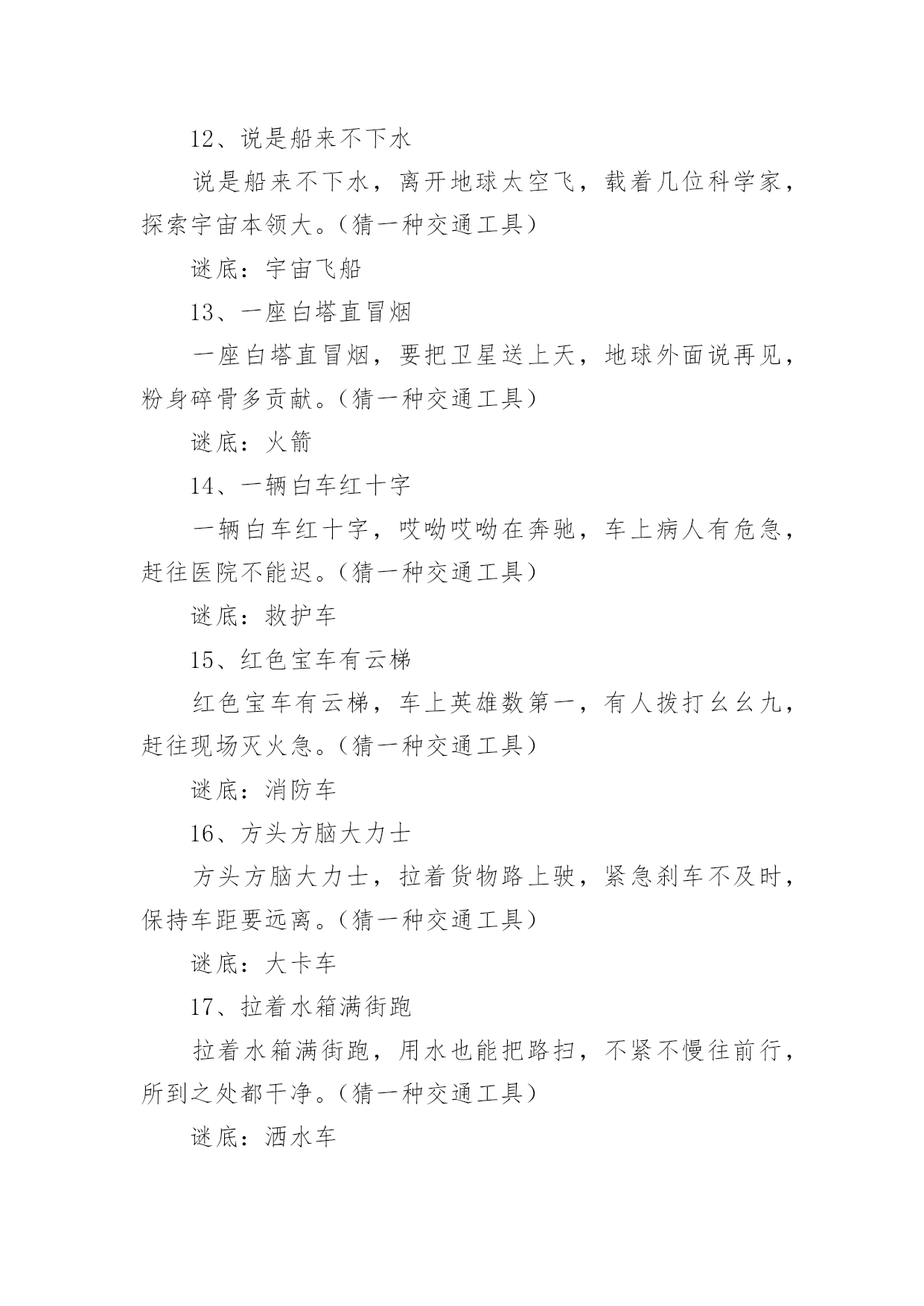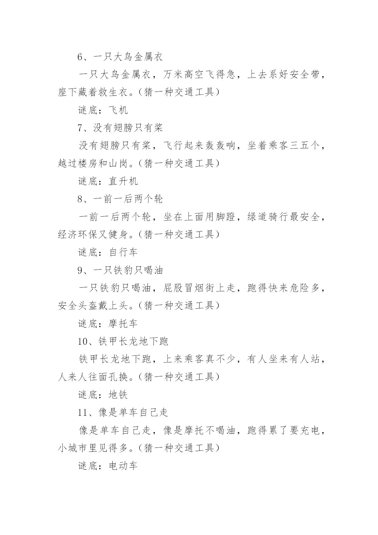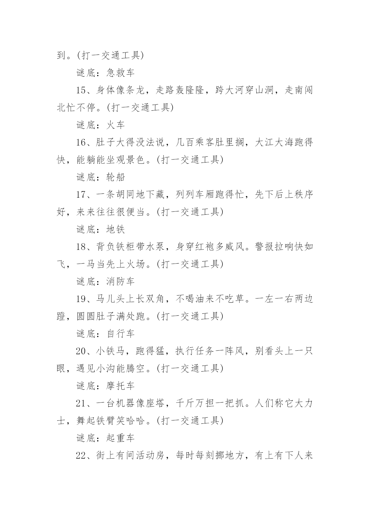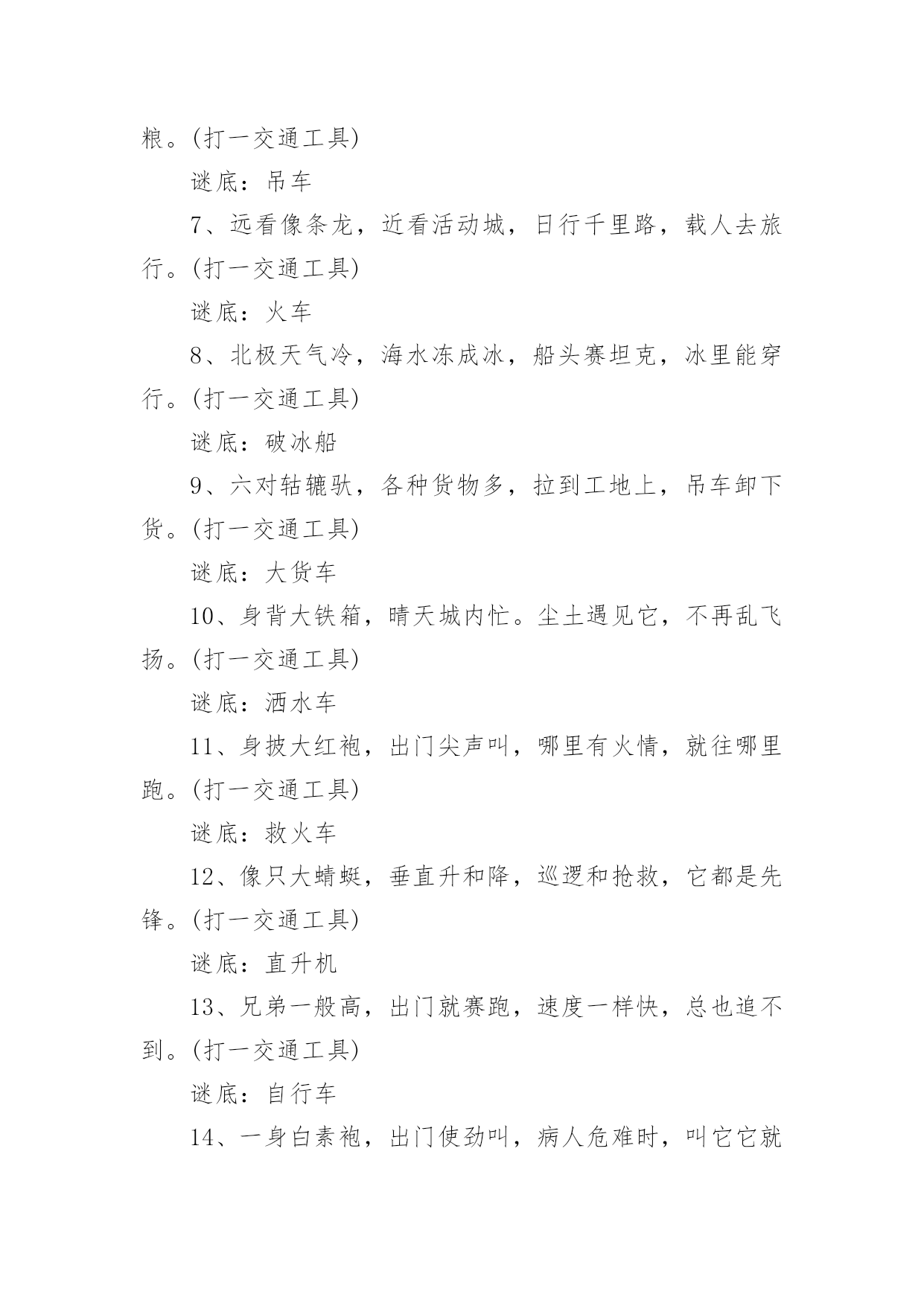 交通工具谜语及答案在学习、工作或生活中,许多人都接触过一些比较经典的谜语吧,谜语风格大致可以分为主流、民间、典雅和通俗风格四种类型。还记得都学过哪些谜语吗?以下是小编帮大家整理的交通工具谜语及答案,希望对大家有所帮助。交通工具谜语及答案11、双臂朝天,扶着长线,奔走城中,与人方便。(打一交通工具)谜底:电车2、金属铁皮身,讲话呜呜声。谁叫也不理,只帮人渡河。(打一交通工具)谜底:船3、三只眼红绿黄,红眼睁时车辆停,绿眼睁时行车忙。(打一交通工具)谜底:红绿灯4、乘客进了舱,转眼飞上天,航行几千里,全凭铁翅膀。(打一交通工具)谜底:飞机5、充气才能跑,天天要喝油,路上飞快跑,方便一家人。(打一交通工具)谜底:汽车6、模样像大象,鼻子长几丈,力气大无比,装煤又卸粮。(打一交通工具)谜底:吊车7、远看像条龙,近看活动城,日行千里路,载人去旅行。(打一交通工具)谜底:火车8、北极天气冷,海水冻成冰,船头赛坦克,冰里能穿行。(打一交通工具)谜底:破冰船9、六对轱辘驮,各种货物多,拉到工地上,吊车卸下货。(打一交通工具)谜底:大货车10、身背大铁箱,晴天城内忙。尘土遇见它,不再乱飞扬。(打一交通工具)谜底:洒水车11、身披大红袍,出门尖声叫,哪里有火情,就往哪里跑。(打一交通工具)谜底:救火车12、像只大蜻蜓,垂直升和降,巡逻和抢救,它都是先锋。(打一交通工具)谜底:直升机13、兄弟一般高,出门就赛跑,速度一样快,总也追不到。(打一交通工具)谜底:自行车14、一身白素袍,出门使劲叫,病人危难时,叫它它就到。(打一交通工具)谜底:急救车15、身体像条龙,走路轰隆隆,跨大河穿山洞,走南闯北忙不停。(打一交通工具)谜底:火车16、肚子大得没法说,几百乘客肚里搁,大江大海跑得快,能躺能坐观景色。(打一交通工具)谜底:轮船17、一条胡同地下藏,列列车厢跑得忙,先下后上秩序好,来来往往很便当。(打一交通工具)谜底:地铁18、背负铁柜带水泵,身穿红袍多威风。警报拉响快如飞,一马当先上火场。(打一交通工具)谜底:消防车19、马儿头上长双角,不喝油来不吃草。一左一右两边蹬,圆圆肚子满处跑。(打一交通工具)谜底:自行车20、小铁马,跑得猛,执行任务一阵风,别看头上一只眼,遇见小沟能腾空。(打一交通工具)谜底:摩托车21、一台机器像座塔,千斤万担一把抓。人们称它大力士,舞起铁臂笑哈哈。(打一交通工具)谜底:起重车22、街上有间活动房,每时每刻挪地方,有上有下人来往,见了老弱把座让。(打一交通工具)谜底:公共汽车交通工具谜语及答案21、铁皮小屋四个脚铁皮小屋四个脚,自己就能往前跑,爸爸给他把方向,全家出行乐逍遥。(猜一种交通工具)谜底:小汽车2、一辆汽车颜色艳一辆汽车颜色艳,顶上写字最明显,伸手招呼它就停,想去哪里都随便。(猜一种交通工具)谜底:出租车3、路边站台有人望路边站台有人望,车子来了排队上,一年四季很准时,走走停停载人忙。(猜一种交通工具)谜底:公交车4、铁甲长龙十余节铁甲长龙十余节,长梯当做溜冰鞋,滑过城市和田野,日行千里不停歇。(猜一种交通工具)谜底:火车5、海上飘来一栋楼海上飘来一栋楼,长长身体尖尖头,累了饿了停港口,带着乘客水上游。(猜一种交通工具)谜底:轮船6、一只大鸟金属衣一只大鸟金属衣,万米高空飞得急,上去系好安全带,座下藏着救生衣。(猜一种交通工具)谜底:飞机7、没有翅膀只有桨没有翅膀只有桨,飞行起来轰轰响,坐着乘客三五个,越过楼房和山岗。(猜一种交通工具)谜底:直升机8、一前一后两个轮一前一后两个轮,坐在上面用脚蹬,绿道骑行最安全,经济环保又健身。(猜一种交通工具)谜底:自行车9、一只铁豹只喝油一只铁豹只喝油,屁股冒烟街上走,跑得快来危险多,安全头盔戴上头。(猜一种交通工具)谜底:摩托车10、铁甲长龙地下跑铁甲长龙地下跑,上来乘客真不少,有人坐来有人站,人来人往面孔换。(猜一种交通工具)谜底:地铁11、像是单车自己走像是单车自己走,像是摩托不喝油,跑得累了要充电,小城市里见得多。(猜一种交通工具)谜底:电动车12、说是船来不下水说是船来不下水,离开地球太空飞,载着几位科学家,探索宇宙本领大。(猜一种交通工具)谜底:宇宙飞船13、一座白塔直冒烟一座白塔直冒烟,要把卫星送上天,地球外面说再见,粉身碎骨多贡献。(猜一种交通工具)谜底:火箭14、一辆白车红十字一辆白车红十字,哎呦哎呦在奔驰,车上病人有危急,赶往医院不能迟。(猜一种交通工具)谜底:救护车15、红色宝车有云梯红色宝车有云梯,车上英雄数第一,有人拨打幺幺九,赶往现场灭火急。(猜一种交通工具)谜底:消防车16、方头方脑大力士方头方脑大力士,拉着货物路上驶,紧急刹车不及时,保持车距要远离。(猜一种交通工具)谜底:大卡车17、拉着水箱满街跑拉着水箱满街跑,用水也能把路扫,不紧不慢往前