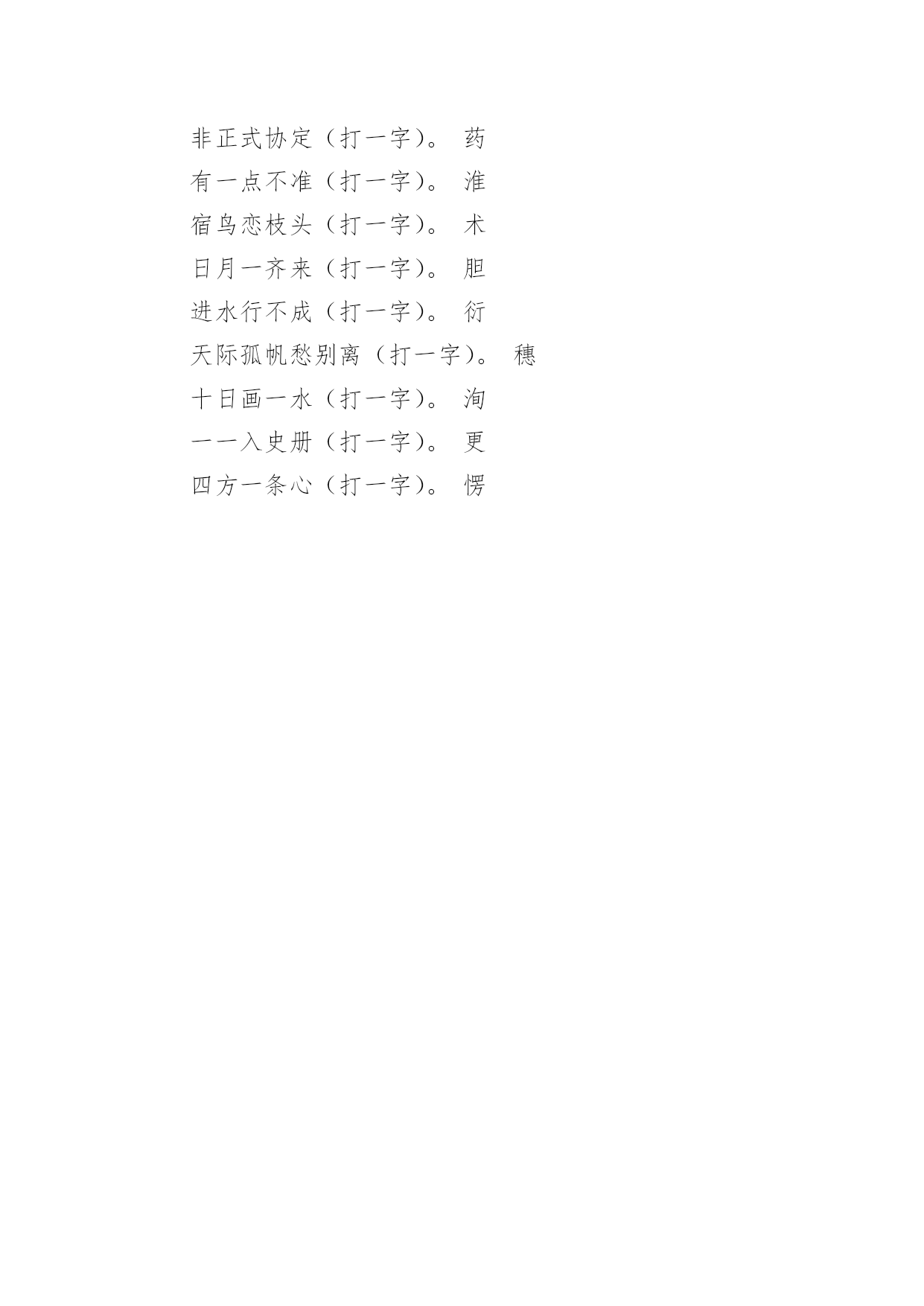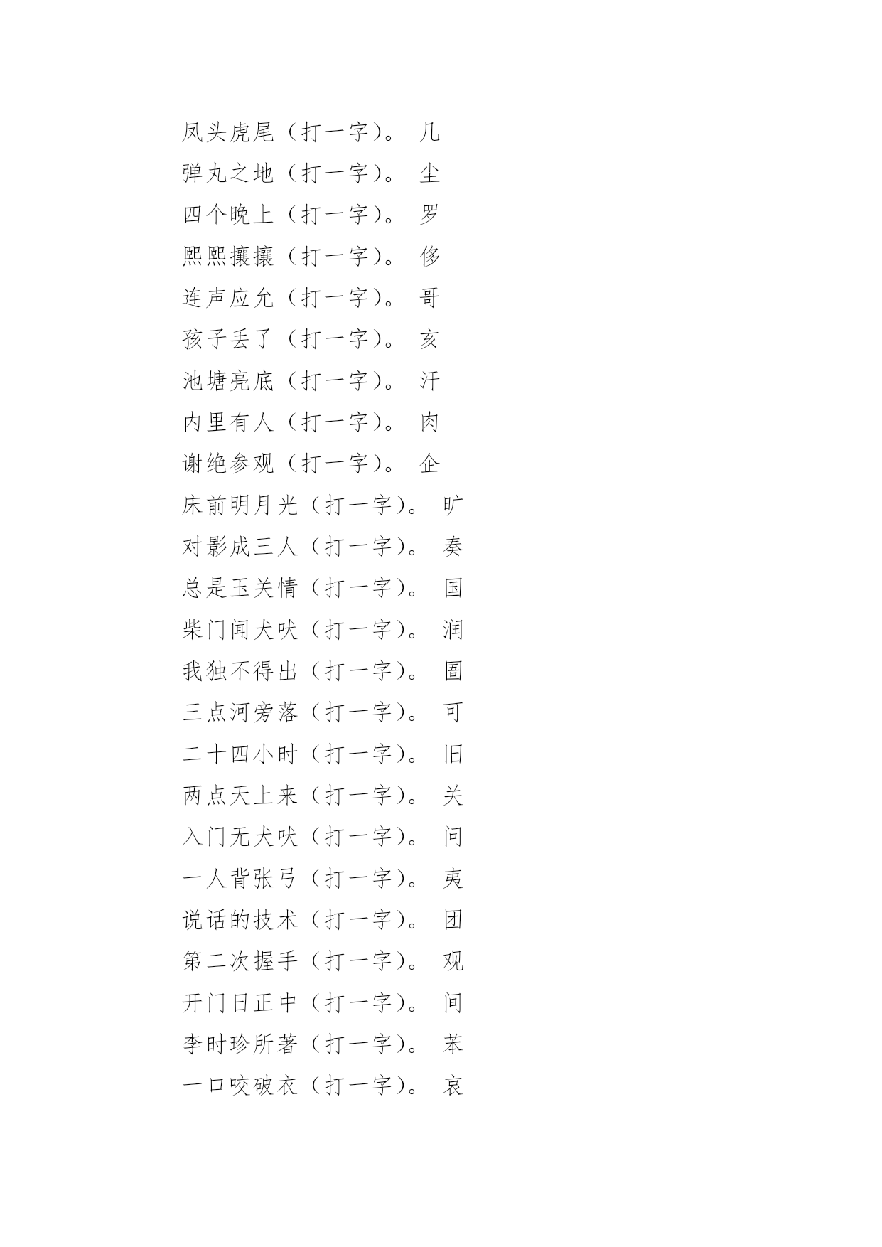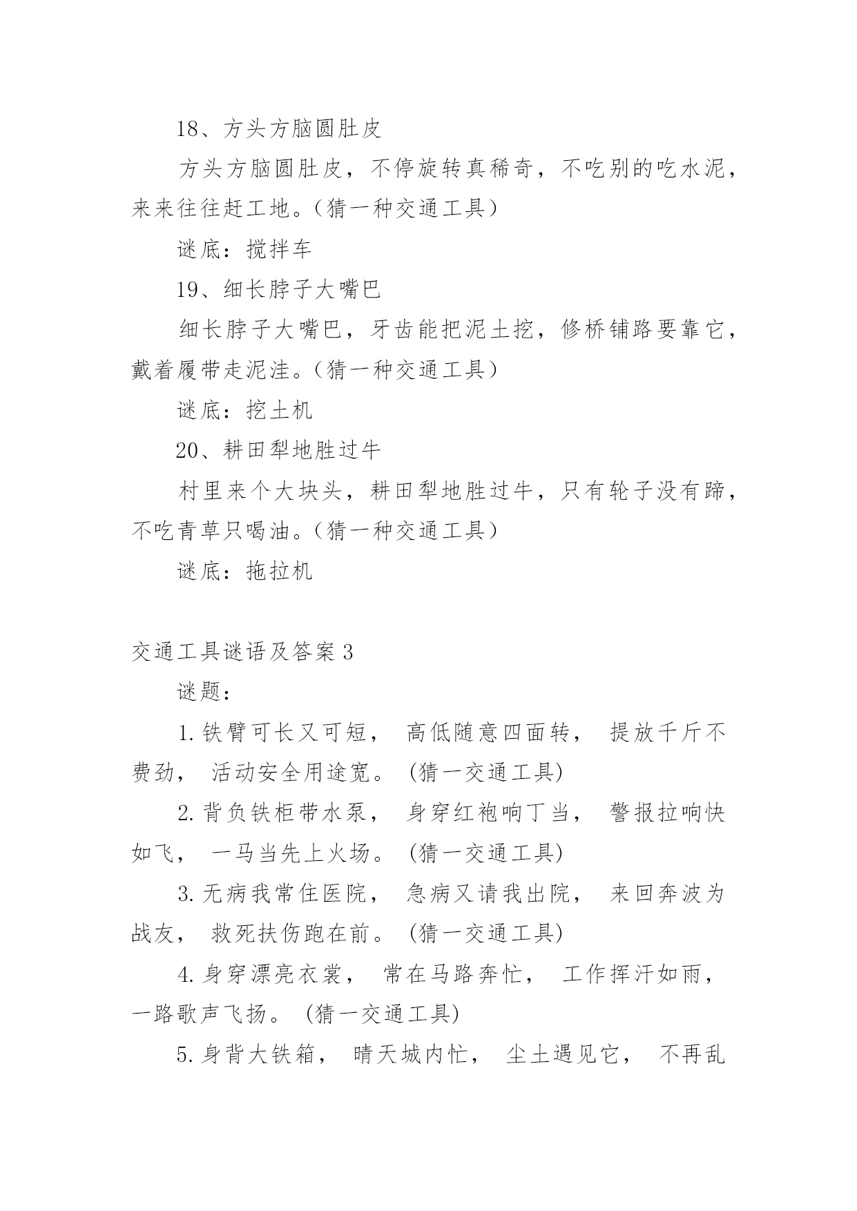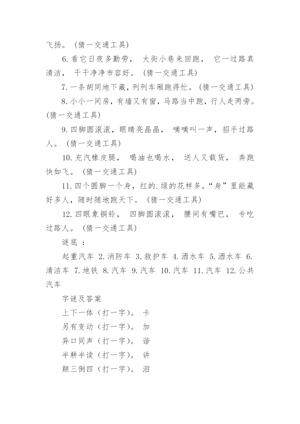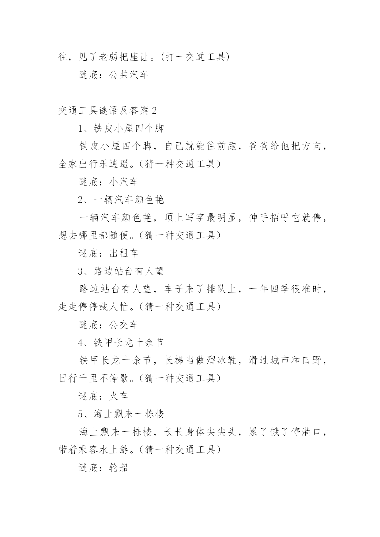 交通工具谜语及答案在学习、工作或生活中,许多人都接触过一些比较经典的谜语吧,谜语风格大致可以分为主流、民间、典雅和通俗风格四种类型。还记得都学过哪些谜语吗?以下是小编帮大家整理的交通工具谜语及答案,希望对大家有所帮助。交通工具谜语及答案11、双臂朝天,扶着长线,奔走城中,与人方便。(打一交通工具)谜底:电车2、金属铁皮身,讲话呜呜声。谁叫也不理,只帮人渡河。(打一交通工具)谜底:船3、三只眼红绿黄,红眼睁时车辆停,绿眼睁时行车忙。(打一交通工具)谜底:红绿灯4、乘客进了舱,转眼飞上天,航行几千里,全凭铁翅膀。(打一交通工具)谜底:飞机5、充气才能跑,天天要喝油,路上飞快跑,方便一家人。(打一交通工具)谜底:汽车6、模样像大象,鼻子长几丈,力气大无比,装煤又卸粮。(打一交通工具)谜底:吊车7、远看像条龙,近看活动城,日行千里路,载人去旅行。(打一交通工具)谜底:火车8、北极天气冷,海水冻成冰,船头赛坦克,冰里能穿行。(打一交通工具)谜底:破冰船9、六对轱辘驮,各种货物多,拉到工地上,吊车卸下货。(打一交通工具)谜底:大货车10、身背大铁箱,晴天城内忙。尘土遇见它,不再乱飞扬。(打一交通工具)谜底:洒水车11、身披大红袍,出门尖声叫,哪里有火情,就往哪里跑。(打一交通工具)谜底:救火车12、像只大蜻蜓,垂直升和降,巡逻和抢救,它都是先锋。(打一交通工具)谜底:直升机13、兄弟一般高,出门就赛跑,速度一样快,总也追不到。(打一交通工具)谜底:自行车14、一身白素袍,出门使劲叫,病人危难时,叫它它就到。(打一交通工具)谜底:急救车15、身体像条龙,走路轰隆隆,跨大河穿山洞,走南闯北忙不停。(打一交通工具)谜底:火车16、肚子大得没法说,几百乘客肚里搁,大江大海跑得快,能躺能坐观景色。(打一交通工具)谜底:轮船17、一条胡同地下藏,列列车厢跑得忙,先下后上秩序好,来来往往很便当。(打一交通工具)谜底:地铁18、背负铁柜带水泵,身穿红袍多威风。警报拉响快如飞,一马当先上火场。(打一交通工具)谜底:消防车19、马儿头上长双角,不喝油来不吃草。一左一右两边蹬,圆圆肚子满处跑。(打一交通工具)谜底:自行车20、小铁马,跑得猛,执行任务一阵风,别看头上一只眼,遇见小沟能腾空。(打一交通工具)谜底:摩托车21、一台机器像座塔,千斤万担一把抓。人们称它大力士,舞起铁臂笑哈哈。(打一交通工具)谜底:起重车22、街上有间活动房,每时每刻挪地方,有上有下人来往,见了老弱把座让。(打一交通工具)谜底:公共汽车交通工具谜语及答案21、铁皮小屋四个脚铁皮小屋四个脚,自己就能往前跑,爸爸给他把方向,全家出行乐逍遥。(猜一种交通工具)谜底:小汽车2、一辆汽车颜色艳一辆汽车颜色艳,顶上写字最明显,伸手招呼它就停,想去哪里都随便。(猜一种交通工具)谜底:出租车3、路边站台有人望路边站台有人望,车子来了排队上,一年四季很准时,走走停停载人忙。(猜一种交通工具)谜底:公交车4、铁甲长龙十余节铁甲长龙十余节,长梯当做溜冰鞋,滑过城市和田野,日行千里不停歇。(猜一种交通工具)谜底:火车5、海上飘来一栋楼海上飘来一栋楼,长长身体尖尖头,累了饿了停港口,带着乘客水上游。(猜一种交通工具)谜底:轮船6、一只大鸟金属衣一只大鸟金属衣,万米高空飞得急,上去系好安全带,座下藏着救生衣。(猜一种交通工具)谜底:飞机7、没有翅膀只有桨没有翅膀只有桨,飞行起来轰轰响,坐着乘客三五个,越过楼房和山岗。(猜一种交通工具)谜底:直升机8、一前一后两个轮一前一后两个轮,坐在上面用脚蹬,绿道骑行最安全,经济环保又健身。(猜一种交通工具)谜底:自行车9、一只铁豹只喝油一只铁豹只喝油,屁股冒烟街上走,跑得快来危险多,安全头盔戴上头。(猜一种交通工具)谜底:摩托车10、铁甲长龙地下跑铁甲长龙地下跑,上来乘客真不少,有人坐来有人站,人来人往面孔换。(猜一种交通工具)谜底:地铁11、像是单车自己走像是单车自己走,像是摩托不喝油,跑得累了要充电,小城市里见得多。(猜一种交通工具)谜底:电动车12、说是船来不下水说是船来不下水,离开地球太空飞,载着几位科学家,探索宇宙本领大。(猜一种交通工具)谜底:宇宙飞船13、一座白塔直冒烟一座白塔直冒烟,要把卫星送上天,地球外面说再见,粉身碎骨多贡献。(猜一种交通工具)谜底:火箭14、一辆白车红十字一辆白车红十字,哎呦哎呦在奔驰,车上病人有危急,赶往医院不能迟。(猜一种交通工具)谜底:救护车15、红色宝车有云梯红色宝车有云梯,车上英雄数第一,有人拨打幺幺九,赶往现场灭火急。(猜一种交通工具)谜底:消防车16、方头方脑大力士方头方脑大力士,拉着货物路上驶,紧急刹车不及时,保持车距要远离。(猜一种交通工具)谜底:大卡车17、拉着水箱满街跑拉着水箱满街跑,用水也能把路扫,不紧不慢往前