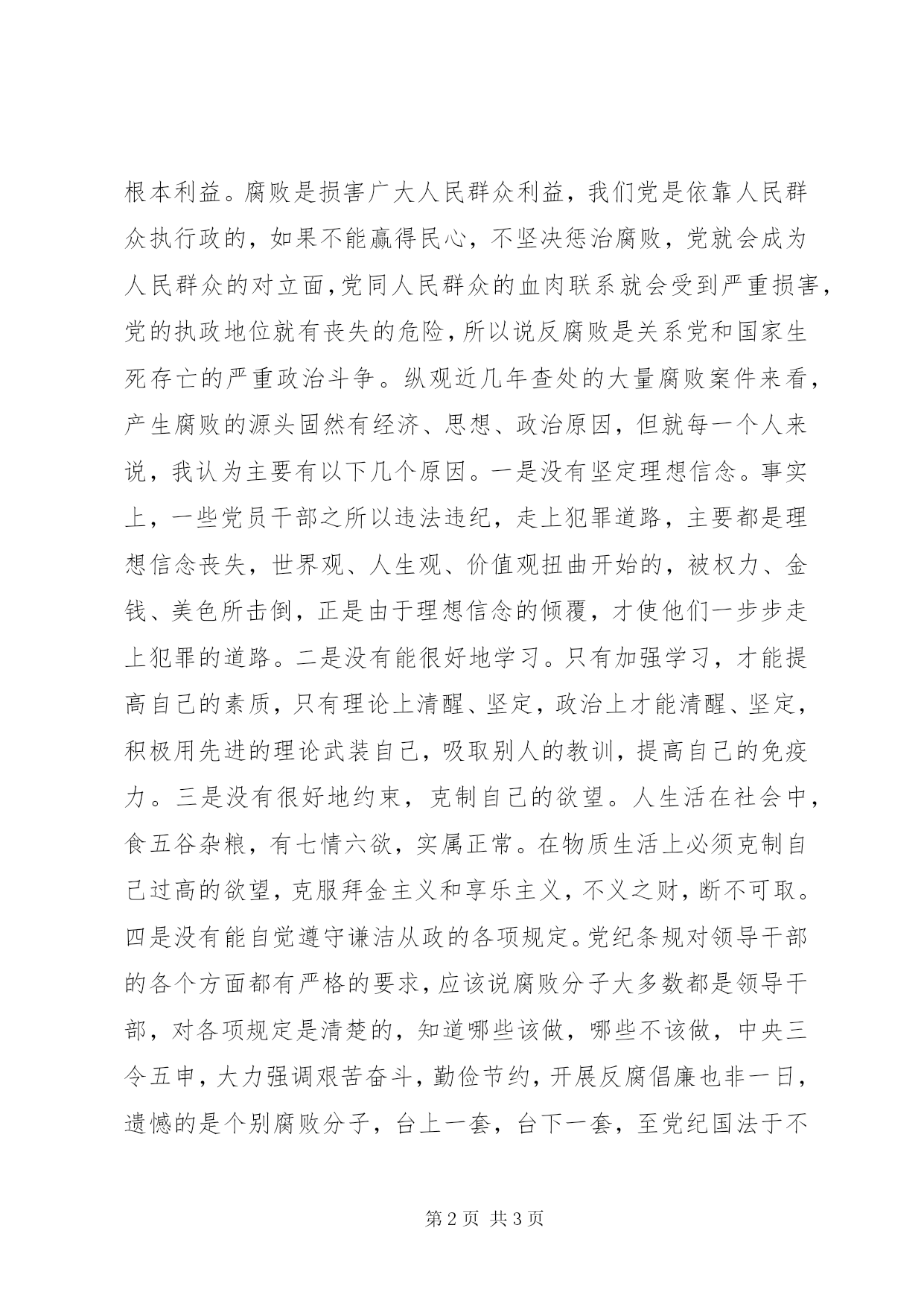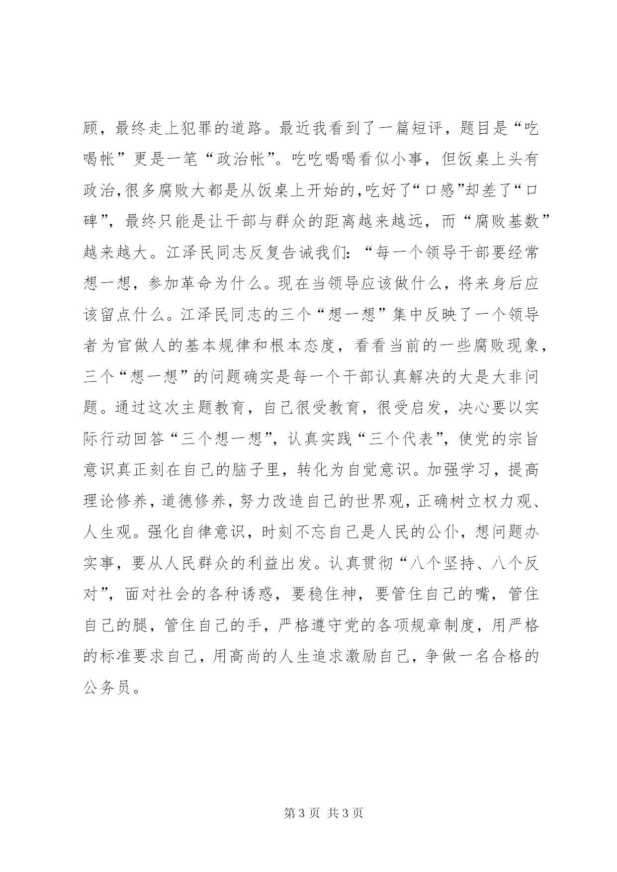 第PAGE\*Arabic\*MERGEFORMAT3页共NUMPAGES\*MERGEFORMAT3页做一个合格的公务员的思考最近一段时间,按照市委、市政府对学习教育活动的要求,我局组织广大干部职工观看了反腐倡廉电教片,警示片中,一幕幕腐败案例,一组组腐败行为,观后使我很受教育。最近又通过学习主题教育辅导材料,重温三代领导人的讲话及胡锦涛总书记在西柏坡学习考察时的讲话,使自己深深地感到三代领导对加强和发扬艰苦奋斗优良作风的建设是重视的,在各个革命时期都经常反复地向全党加以强调。同时,我们也高兴地看到以胡锦涛为核心的中央领导加强廉政建设、惩治腐败的决心,感受到反府倡廉是党心所思,民心所向。党执政后的最大危险是脱离群众,而在脱离群众的种种表现中,腐败的危害性最烈,危险性最大,具体表现在:一是践踏党的先进性,党的先进性是通过一个个党员干部的模范言行和优良作风表现出来的,如果党的性质和宗旨规定的是一套,某些党员干部的行为是另一套,那将是党的建设之大忌,党就有可能走向自我毁灭。二是破坏经济建设,腐败分子以权谋私,权力进入市场,直接破坏社会主义市场经济秩序,导致国家经济的崩溃。三是危害精神文明。腐败具有极强的传染性、腐蚀性,一些丑恶的社会现象就会污染社会。四是破坏社会稳定。稳定与党风、政风是直接相关的,腐败破坏社会主义民主与法制,损害党和政府的威信,削弱党和政府的凝聚力,使人民群众与党和政府离心离德,其结果必然导致社会**。五是损害人民群众的根本利益。腐败是损害广大人民群众利益,我们党是依靠人民群众执行政的,如果不能赢得民心,不坚决惩治腐败,党就会成为人民群众的对立面,党同人民群众的血肉联系就会受到严重损害,党的执政地位就有丧失的危险,所以说反腐败是关系党和国家生死存亡的严重政治斗争。纵观近几年查处的大量腐败案件来看,产生腐败的源头固然有经济、思想、政治原因,但就每一个人来说,我认为主要有以下几个原因。一是没有坚定理想信念。事实上,一些党员干部之所以违法违纪,走上犯罪道路,主要都是理想信念丧失,世界观、人生观、价值观扭曲开始的,被权力、金钱、美色所击倒,正是由于理想信念的倾覆,才使他们一步步走上犯罪的道路。二是没有能很好地学习。只有加强学习,才能提高自己的素质,只有理论上清醒、坚定,政治上才能清醒、坚定,积极用先进的理论武装自己,吸取别人的教训,提高自己的免疫力。三是没有很好地约束,克制自己的欲望。人生活在社会中,食五谷杂粮,有七情六欲,实属正常。在物质生活上必须克制自己过高的欲望,克服拜金主义和享乐主义,不义之财,断不可取。四是没有能自觉遵守谦洁从政的各项规定。党纪条规对领导干部的各个方面都有严格的要求,应该说腐败分子大多数都是领导干部,对各项规定是清楚的,知道哪些该做,哪些不该做,中央三令五申,大力强调艰苦奋斗,勤俭节约,开展反腐倡廉也非一日,遗憾的是个别腐败分子,台上一套,台下一套,至党纪国法于不顾,最终走上犯罪的道路。最近我看到了一篇短评,题目是“吃喝帐”更是一笔“政治帐”。吃吃喝喝看似小事,但饭桌上头有政治,很多腐败大都是从饭桌上开始的,吃好了“口感”却差了“口碑”,最终只能是让干部与群众的距离越来越远,而“腐败基数”越来越大。江泽民同志反复告诫我们:“每一个领导干部要经常想一想,参加革命为什么。现在当领导应该做什么,将来身后应该留点什么。江泽民同志的三个“想一想”集中反映了一个领导者为官做人的基本规律和根本态度,看看当前的一些腐败现象,三个“想一想”的问题确实是每一个干部认真解决的大是大非问题。通过这次主题教育,自己很受教育,很受启发,决心要以实际行动回答“三个想一想”,认真实践“三个代表”,使党的宗旨意识真正刻在自己的脑子里,转化为自觉意识。加强学习,提高理论修养,道德修养,努力改造自己的世界观,正确树立权力观、人生观。强化自律意识,时刻不忘自己是人民的公仆,想问题办实事,要从人民群众的利益出发。认真贯彻“八个坚持、八个反对”,面对社会的各种诱惑,要稳住神,要管住自己的嘴,管住自己的腿,管住自己的手,严格遵守党的各项规章制度,用严格的标准要求自己,用高尚的人生追求激励自己,争做一名合格的公务员。