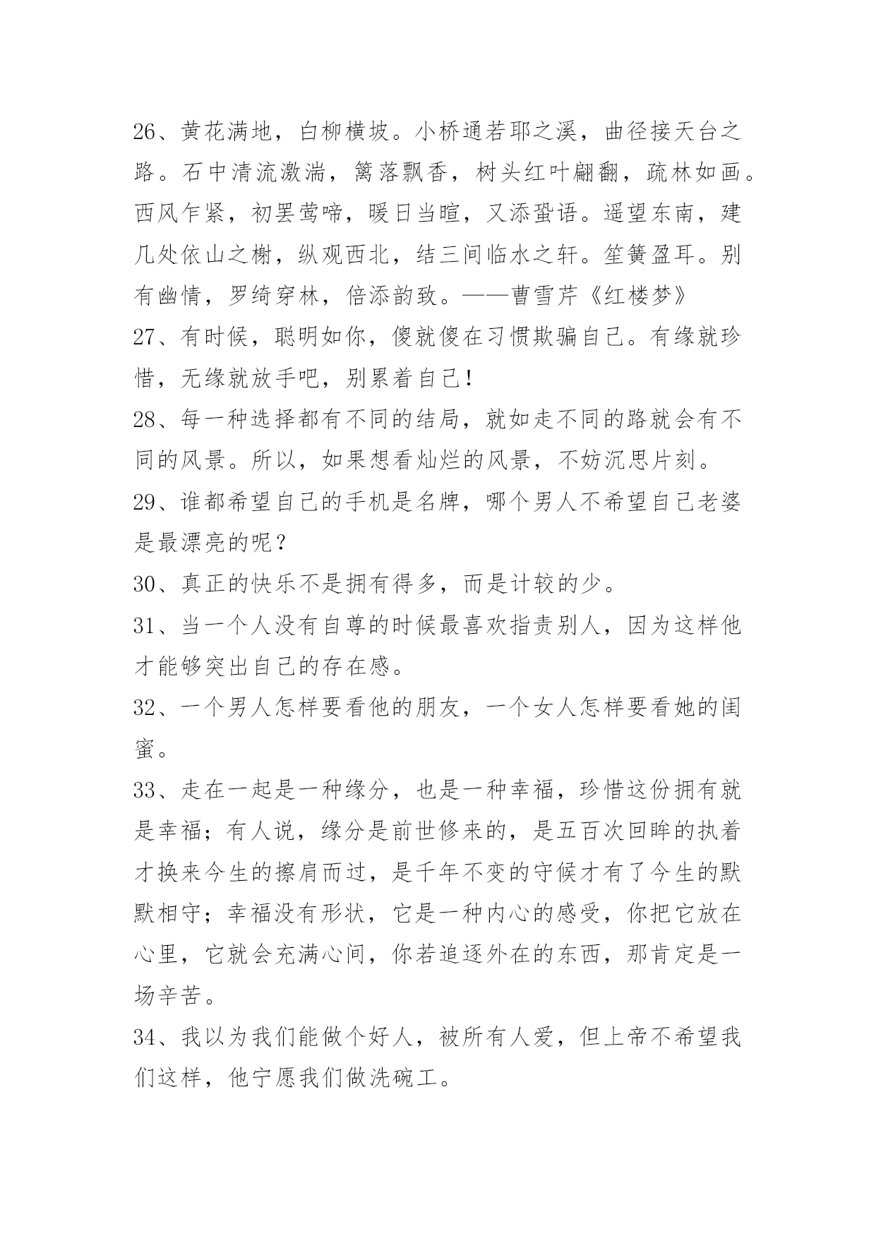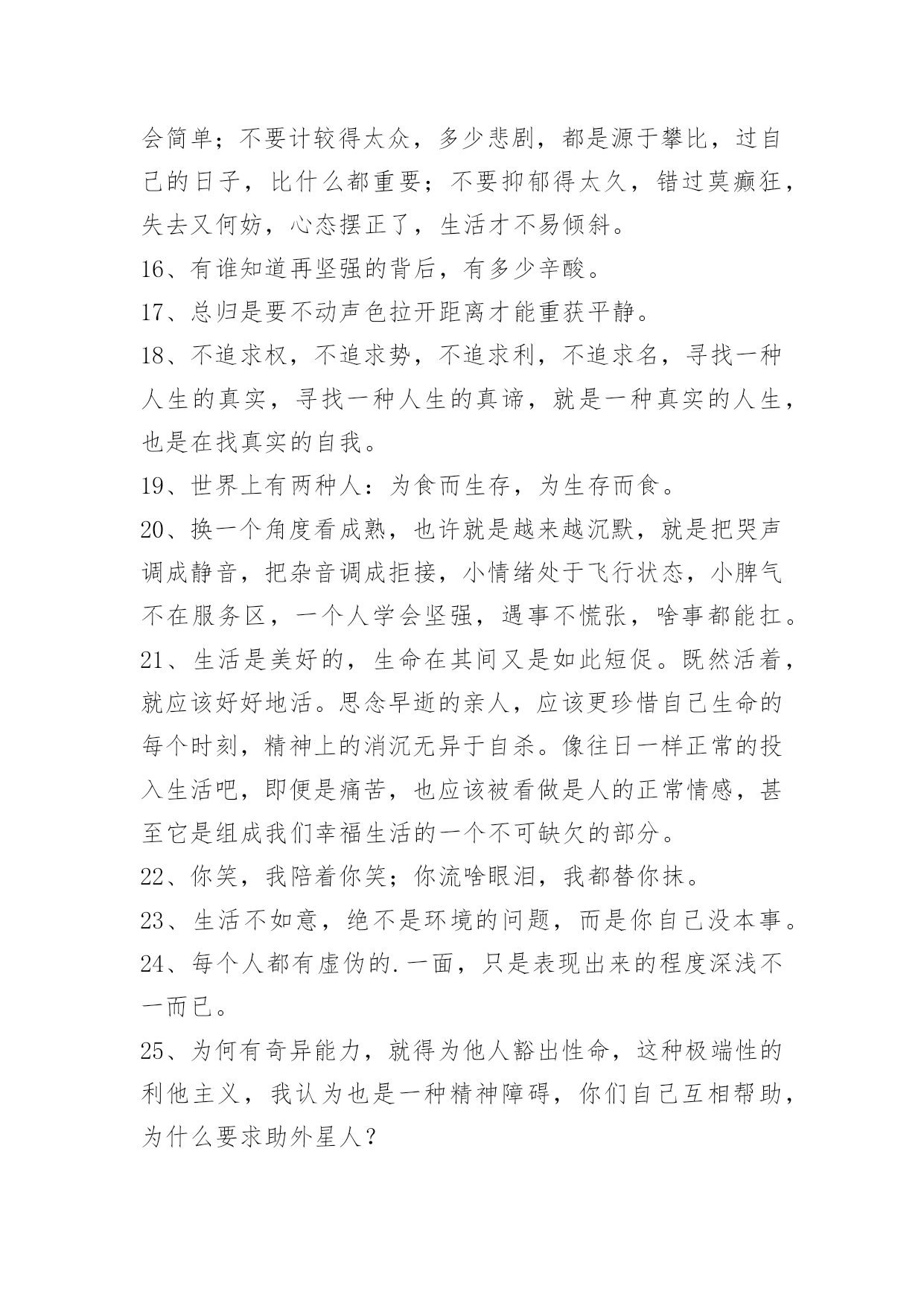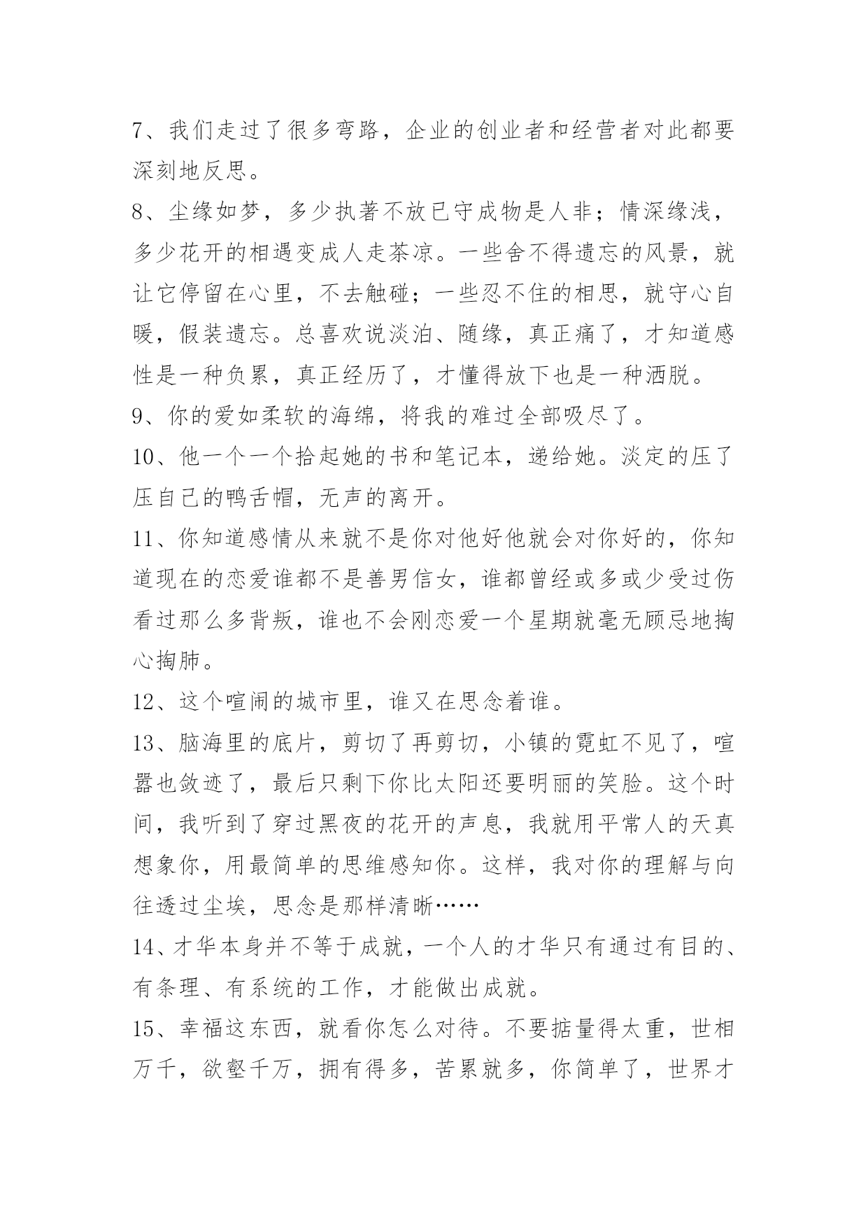 常用经典的生活语录摘录2022年常用经典的生活语录摘录65句曾经走过的路,即使再不堪回首,我们也会小心收藏,因为,那是我们的成长。以下是小编搜索整理的经典的生活语录65句,欢迎阅读借鉴。1、豪爽是清澈的眼眸,开阔的器局,是对琐屑细事的忽略与遗忘,是相逢意气为君饮的痛快淋漓;豪爽还可以是一往情深之子靡他,拼将一生休,尽君一日欢,只有拿得起放得下的豪爽女人,才会有如此灼热忘我的爱情。2、你的笑,清晰了那一捆艳红色的玫瑰花;你的笑,唯美了那一束紫蓝色的薰衣草。只有你才能让我的心情起伏而再次跌落;只有你才能让我的心情跌落而再次起伏。3、在冲床般的巨大压力弹力下,脆弱者粉碎,坚韧者成材。4、记忆不应当得到休息,因为没有一种能力比它更易动作,更能由动作得到发展的。你要每天找点东西给记忆去记忆,因为你越是多给它记,它便愈能诚实地记住,你愈少给,它便记得愈不诚实。5、让一个人记得你,是要进入他的思维和心,而不是他的房子。我一直相信永久的爱情,相信白头到老,虽然受过伤但永不会放弃。6、是你让我看穿我坚强的背后有那么多的脆弱,是你让我更明白了我自己。7、我们走过了很多弯路,企业的创业者和经营者对此都要深刻地反思。8、尘缘如梦,多少执著不放已守成物是人非;情深缘浅,多少花开的相遇变成人走茶凉。一些舍不得遗忘的风景,就让它停留在心里,不去触碰;一些忍不住的相思,就守心自暖,假装遗忘。总喜欢说淡泊、随缘,真正痛了,才知道感性是一种负累,真正经历了,才懂得放下也是一种洒脱。9、你的爱如柔软的海绵,将我的难过全部吸尽了。10、他一个一个拾起她的书和笔记本,递给她。淡定的压了压自己的鸭舌帽,无声的离开。11、你知道感情从来就不是你对他好他就会对你好的,你知道现在的恋爱谁都不是善男信女,谁都曾经或多或少受过伤看过那么多背叛,谁也不会刚恋爱一个星期就毫无顾忌地掏心掏肺。12、这个喧闹的城市里,谁又在思念着谁。13、脑海里的底片,剪切了再剪切,小镇的霓虹不见了,喧嚣也敛迹了,最后只剩下你比太阳还要明丽的笑脸。这个时间,我听到了穿过黑夜的花开的声息,我就用平常人的天真想象你,用最简单的思维感知你。这样,我对你的理解与向往透过尘埃,思念是那样清晰……14、才华本身并不等于成就,一个人的才华只有通过有目的、有条理、有系统的工作,才能做出成就。15、幸福这东西,就看你怎么对待。不要掂量得太重,世相万千,欲壑千万,拥有得多,苦累就多,你简单了,世界才会简单;不要计较得太众,多少悲剧,都是源于攀比,过自己的日子,比什么都重要;不要抑郁得太久,错过莫癫狂,失去又何妨,心态摆正了,生活才不易倾斜。16、有谁知道再坚强的背后,有多少辛酸。17、总归是要不动声色拉开距离才能重获平静。18、不追求权,不追求势,不追求利,不追求名,寻找一种人生的真实,寻找一种人生的真谛,就是一种真实的人生,也是在找真实的自我。19、世界上有两种人:为食而生存,为生存而食。20、换一个角度看成熟,也许就是越来越沉默,就是把哭声调成静音,把杂音调成拒接,小情绪处于飞行状态,小脾气不在服务区,一个人学会坚强,遇事不慌张,啥事都能扛。21、生活是美好的,生命在其间又是如此短促。既然活着,就应该好好地活。思念早逝的亲人,应该更珍惜自己生命的每个时刻,精神上的消沉无异于自杀。像往日一样正常的投入生活吧,即便是痛苦,也应该被看做是人的正常情感,甚至它是组成我们幸福生活的一个不可缺欠的部分。22、你笑,我陪着你笑;你流啥眼泪,我都替你抹。23、生活不如意,绝不是环境的问题,而是你自己没本事。24、每个人都有虚伪的.一面,只是表现出来的程度深浅不一而已。25、为何有奇异能力,就得为他人豁出性命,这种极端性的利他主义,我认为也是一种精神障碍,你们自己互相帮助,为什么要求助外星人?26、黄花满地,白柳横坡。小桥通若耶之溪,曲径接天台之路。石中清流激湍,篱落飘香,树头红叶翩翻,疏林如画。西风乍紧,初罢莺啼,暖日当暄,又添蛩语。遥望东南,建几处依山之榭,纵观西北,结三间临水之轩。笙簧盈耳。别有幽情,罗绮穿林,倍添韵致。——曹雪芹《红楼梦》27、有时候,聪明如你,傻就傻在习惯欺骗自己。有缘就珍惜,无缘就放手吧,别累着自己!28、每一种选择都有不同的结局,就如走不同的路就会有不同的风景。所以,如果想看灿烂的风景,不妨沉思片刻。29、谁都希望自己的手机是名牌,哪个男人不希望自己老婆是最漂亮的呢?30、真正的快乐不是拥有得多,而是计较的少。31、当一个人没有自尊的时候最喜欢指责别人,因为这样他才能够突出自己的存在感。32、一个男人怎样要看他的朋友,一个女人怎样要看她的闺蜜。33、走在一起是一种缘分,也是一种幸福,珍惜这份拥有就是幸福;有人说,缘分是前世修来的,是五百次回眸的执着才换来今生的擦肩而过,是千年不变的守候才有了今生的默默相