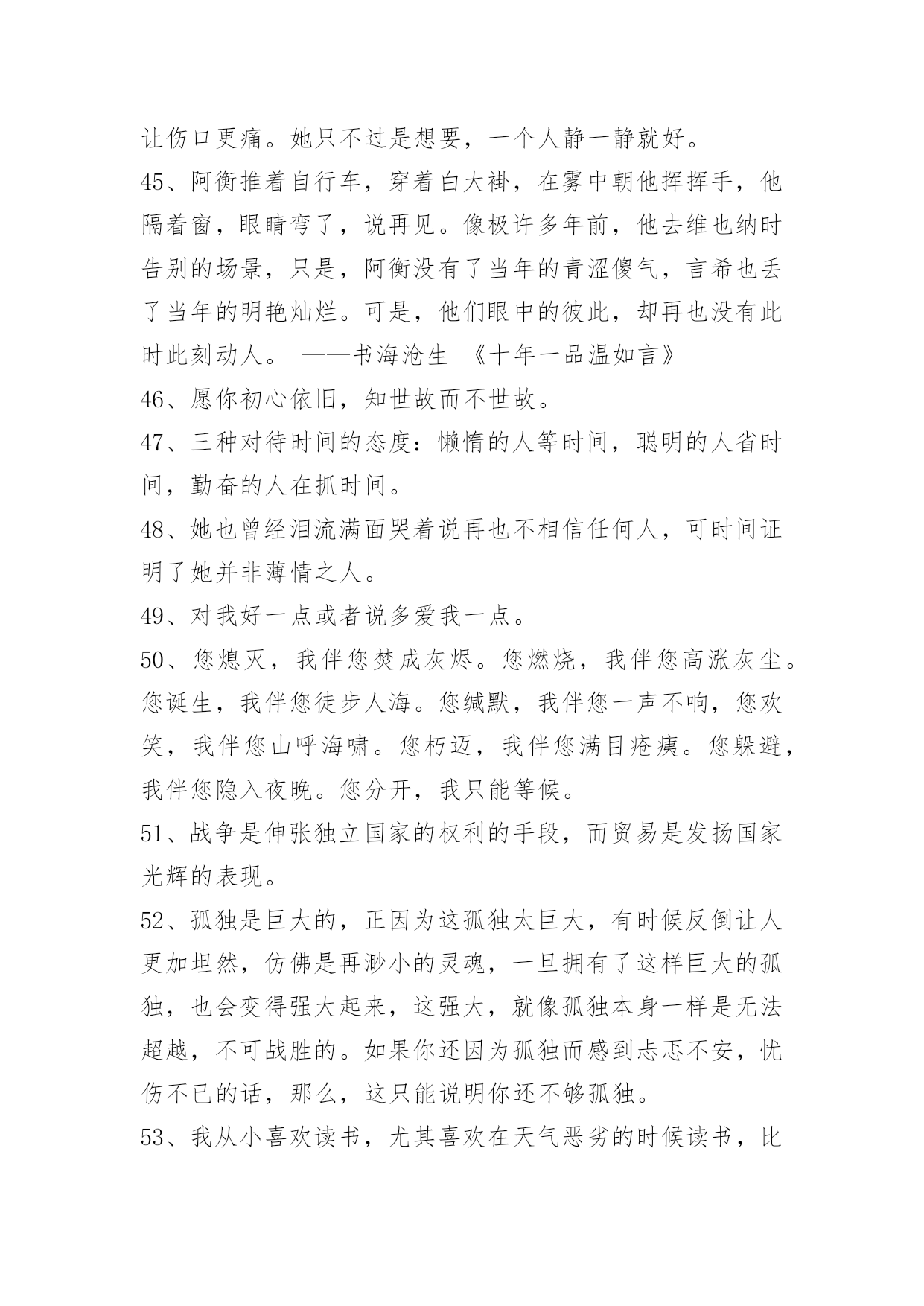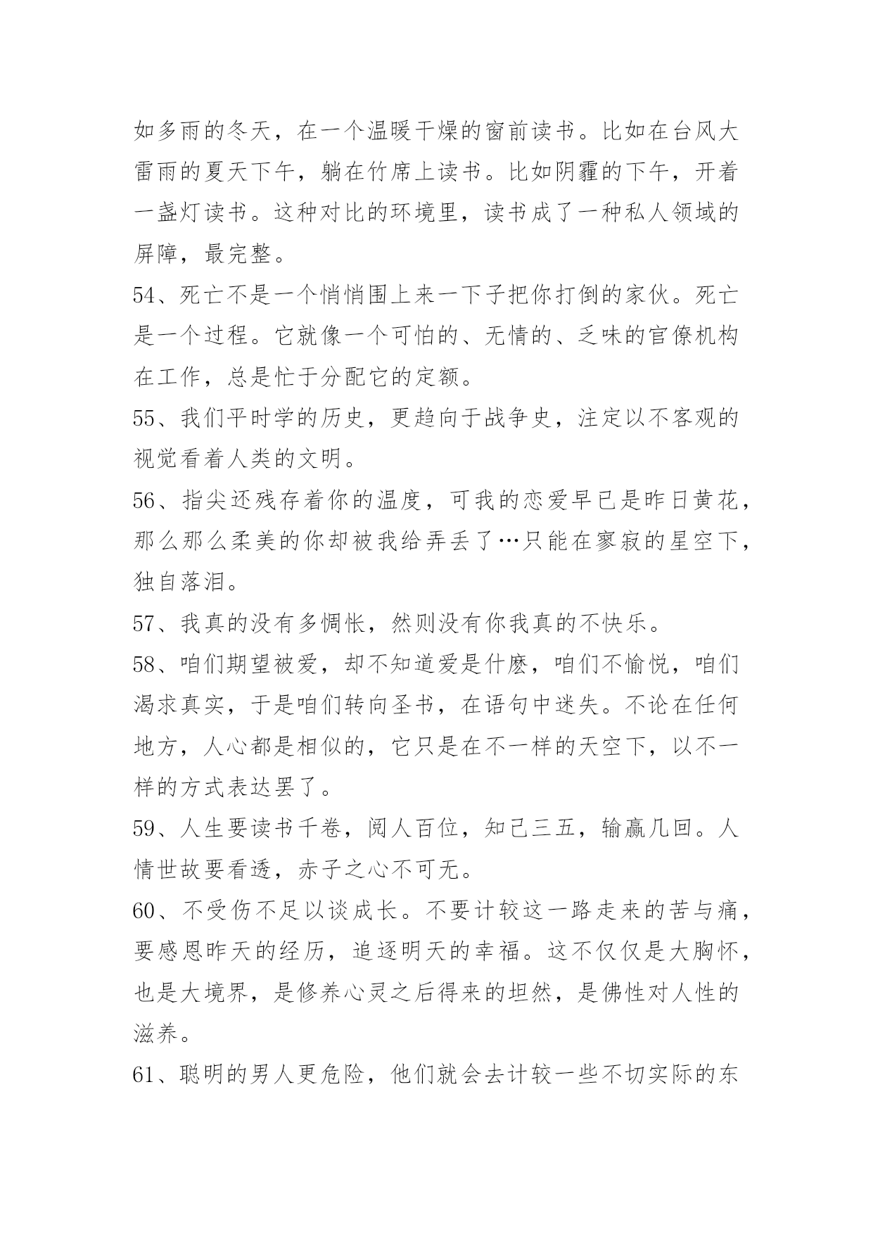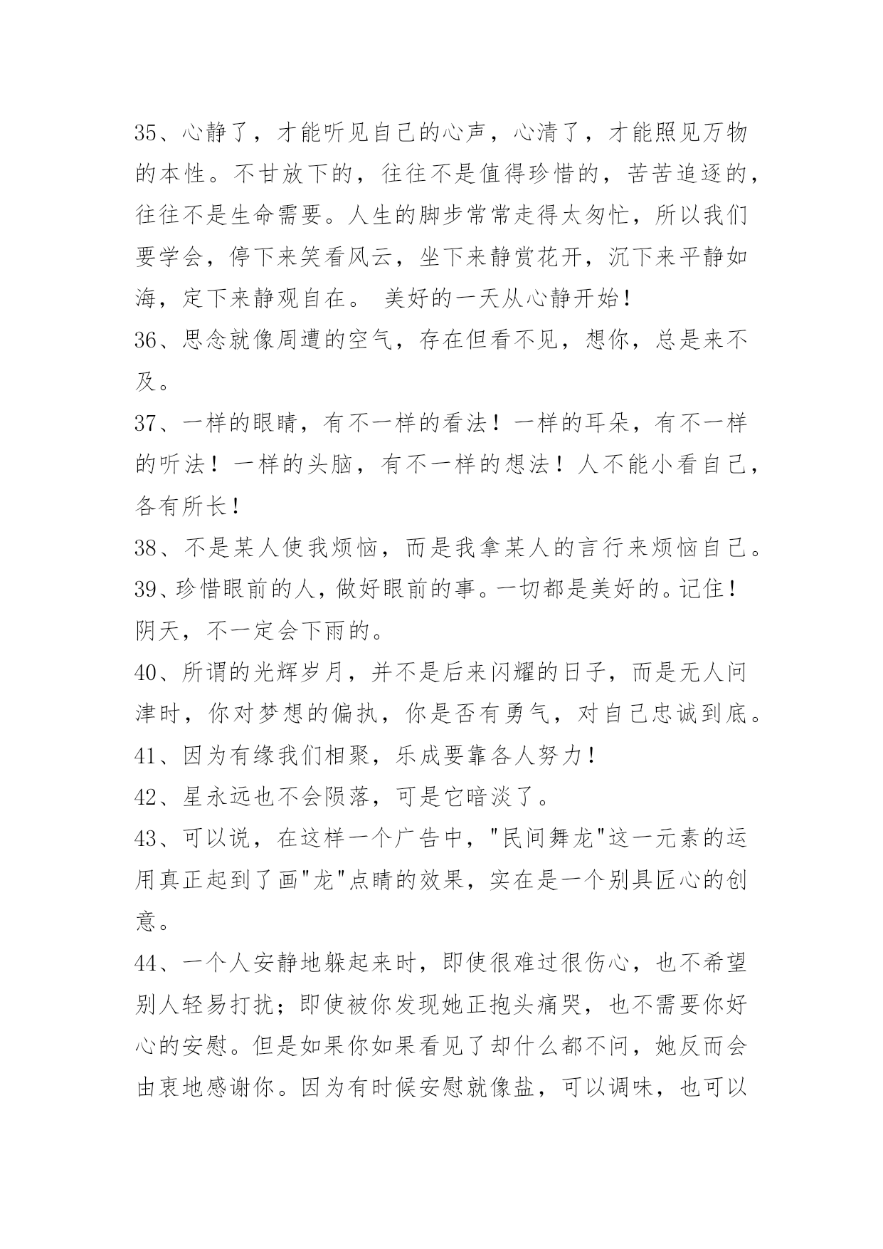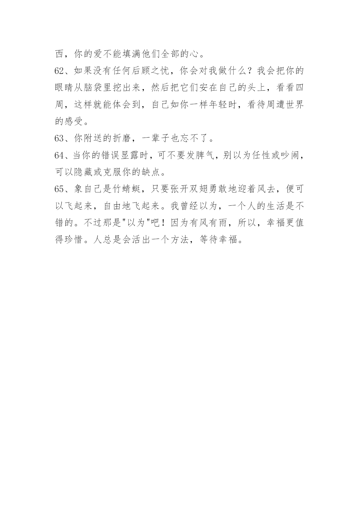 常用经典的生活语录摘录2022年常用经典的生活语录摘录65句曾经走过的路,即使再不堪回首,我们也会小心收藏,因为,那是我们的成长。以下是小编搜索整理的经典的生活语录65句,欢迎阅读借鉴。1、豪爽是清澈的眼眸,开阔的器局,是对琐屑细事的忽略与遗忘,是相逢意气为君饮的痛快淋漓;豪爽还可以是一往情深之子靡他,拼将一生休,尽君一日欢,只有拿得起放得下的豪爽女人,才会有如此灼热忘我的爱情。2、你的笑,清晰了那一捆艳红色的玫瑰花;你的笑,唯美了那一束紫蓝色的薰衣草。只有你才能让我的心情起伏而再次跌落;只有你才能让我的心情跌落而再次起伏。3、在冲床般的巨大压力弹力下,脆弱者粉碎,坚韧者成材。4、记忆不应当得到休息,因为没有一种能力比它更易动作,更能由动作得到发展的。你要每天找点东西给记忆去记忆,因为你越是多给它记,它便愈能诚实地记住,你愈少给,它便记得愈不诚实。5、让一个人记得你,是要进入他的思维和心,而不是他的房子。我一直相信永久的爱情,相信白头到老,虽然受过伤但永不会放弃。6、是你让我看穿我坚强的背后有那么多的脆弱,是你让我更明白了我自己。7、我们走过了很多弯路,企业的创业者和经营者对此都要深刻地反思。8、尘缘如梦,多少执著不放已守成物是人非;情深缘浅,多少花开的相遇变成人走茶凉。一些舍不得遗忘的风景,就让它停留在心里,不去触碰;一些忍不住的相思,就守心自暖,假装遗忘。总喜欢说淡泊、随缘,真正痛了,才知道感性是一种负累,真正经历了,才懂得放下也是一种洒脱。9、你的爱如柔软的海绵,将我的难过全部吸尽了。10、他一个一个拾起她的书和笔记本,递给她。淡定的压了压自己的鸭舌帽,无声的离开。11、你知道感情从来就不是你对他好他就会对你好的,你知道现在的恋爱谁都不是善男信女,谁都曾经或多或少受过伤看过那么多背叛,谁也不会刚恋爱一个星期就毫无顾忌地掏心掏肺。12、这个喧闹的城市里,谁又在思念着谁。13、脑海里的底片,剪切了再剪切,小镇的霓虹不见了,喧嚣也敛迹了,最后只剩下你比太阳还要明丽的笑脸。这个时间,我听到了穿过黑夜的花开的声息,我就用平常人的天真想象你,用最简单的思维感知你。这样,我对你的理解与向往透过尘埃,思念是那样清晰……14、才华本身并不等于成就,一个人的才华只有通过有目的、有条理、有系统的工作,才能做出成就。15、幸福这东西,就看你怎么对待。不要掂量得太重,世相万千,欲壑千万,拥有得多,苦累就多,你简单了,世界才会简单;不要计较得太众,多少悲剧,都是源于攀比,过自己的日子,比什么都重要;不要抑郁得太久,错过莫癫狂,失去又何妨,心态摆正了,生活才不易倾斜。16、有谁知道再坚强的背后,有多少辛酸。17、总归是要不动声色拉开距离才能重获平静。18、不追求权,不追求势,不追求利,不追求名,寻找一种人生的真实,寻找一种人生的真谛,就是一种真实的人生,也是在找真实的自我。19、世界上有两种人:为食而生存,为生存而食。20、换一个角度看成熟,也许就是越来越沉默,就是把哭声调成静音,把杂音调成拒接,小情绪处于飞行状态,小脾气不在服务区,一个人学会坚强,遇事不慌张,啥事都能扛。21、生活是美好的,生命在其间又是如此短促。既然活着,就应该好好地活。思念早逝的亲人,应该更珍惜自己生命的每个时刻,精神上的消沉无异于自杀。像往日一样正常的投入生活吧,即便是痛苦,也应该被看做是人的正常情感,甚至它是组成我们幸福生活的一个不可缺欠的部分。22、你笑,我陪着你笑;你流啥眼泪,我都替你抹。23、生活不如意,绝不是环境的问题,而是你自己没本事。24、每个人都有虚伪的.一面,只是表现出来的程度深浅不一而已。25、为何有奇异能力,就得为他人豁出性命,这种极端性的利他主义,我认为也是一种精神障碍,你们自己互相帮助,为什么要求助外星人?26、黄花满地,白柳横坡。小桥通若耶之溪,曲径接天台之路。石中清流激湍,篱落飘香,树头红叶翩翻,疏林如画。西风乍紧,初罢莺啼,暖日当暄,又添蛩语。遥望东南,建几处依山之榭,纵观西北,结三间临水之轩。笙簧盈耳。别有幽情,罗绮穿林,倍添韵致。——曹雪芹《红楼梦》27、有时候,聪明如你,傻就傻在习惯欺骗自己。有缘就珍惜,无缘就放手吧,别累着自己!28、每一种选择都有不同的结局,就如走不同的路就会有不同的风景。所以,如果想看灿烂的风景,不妨沉思片刻。29、谁都希望自己的手机是名牌,哪个男人不希望自己老婆是最漂亮的呢?30、真正的快乐不是拥有得多,而是计较的少。31、当一个人没有自尊的时候最喜欢指责别人,因为这样他才能够突出自己的存在感。32、一个男人怎样要看他的朋友,一个女人怎样要看她的闺蜜。33、走在一起是一种缘分,也是一种幸福,珍惜这份拥有就是幸福;有人说,缘分是前世修来的,是五百次回眸的执着才换来今生的擦肩而过,是千年不变的守候才有了今生的默默相