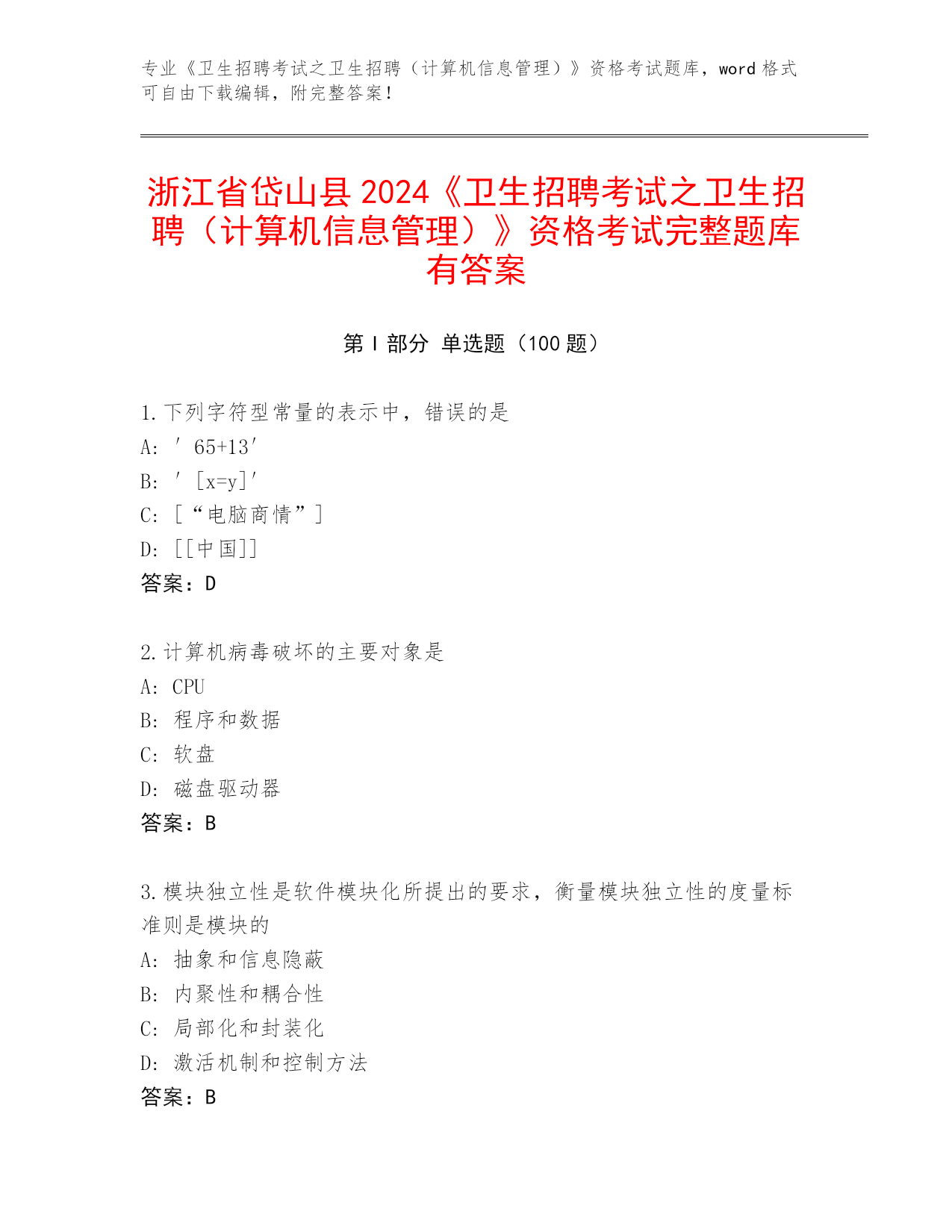 浙江省岱山县2024《卫生招聘考试之卫生招聘(计算机信息管理)》资格考试完整题库有答案