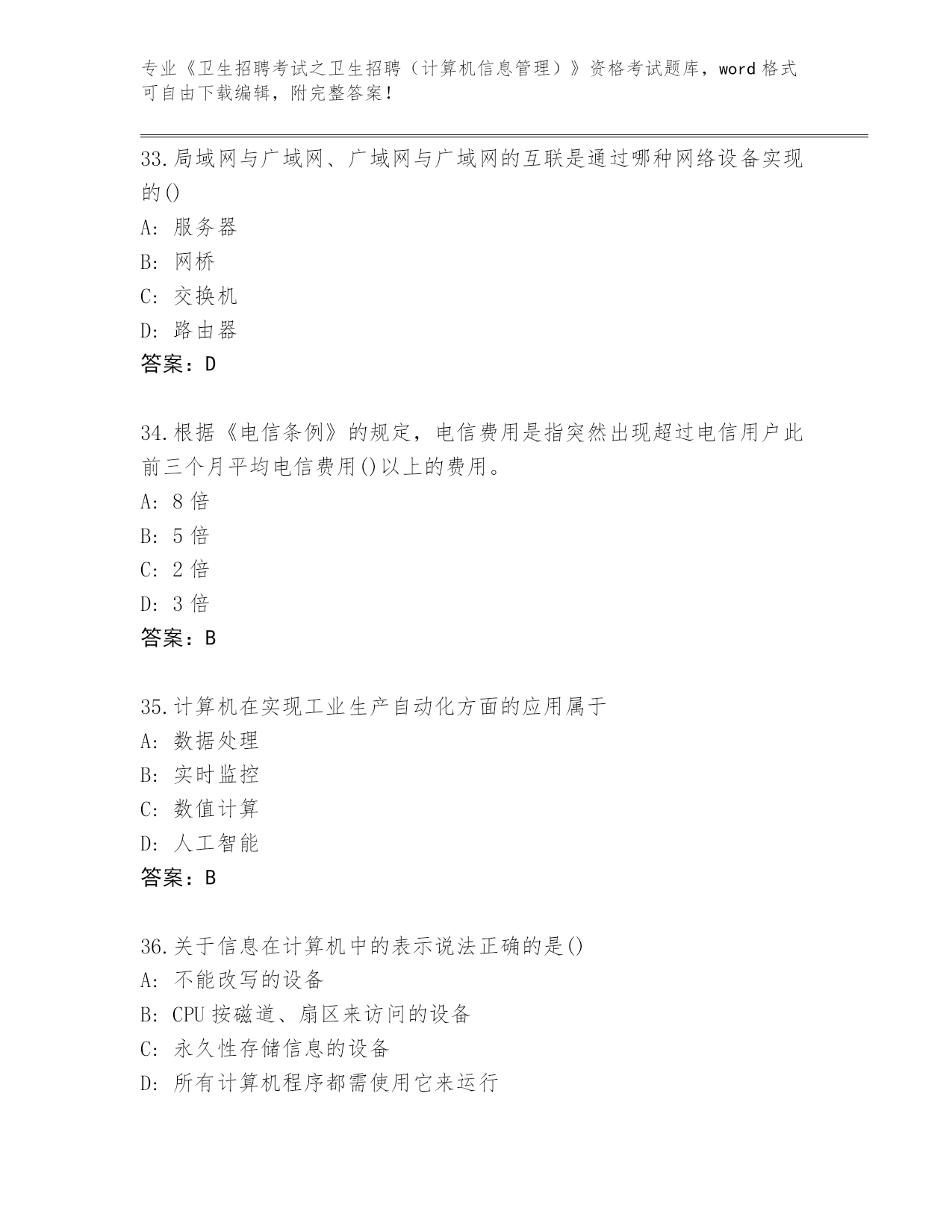 浙江省岱山县整理《卫生招聘考试之卫生招聘(计算机信息管理)》资格考试(实用)