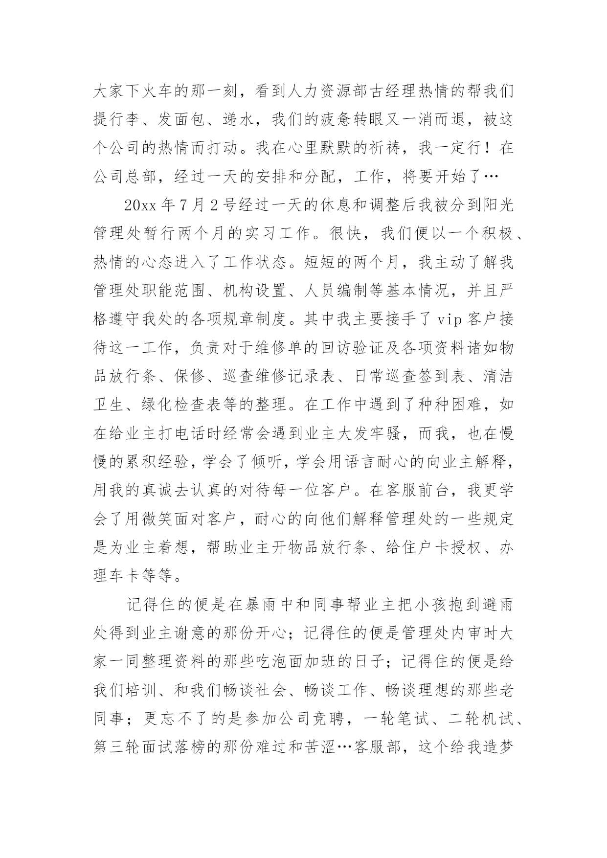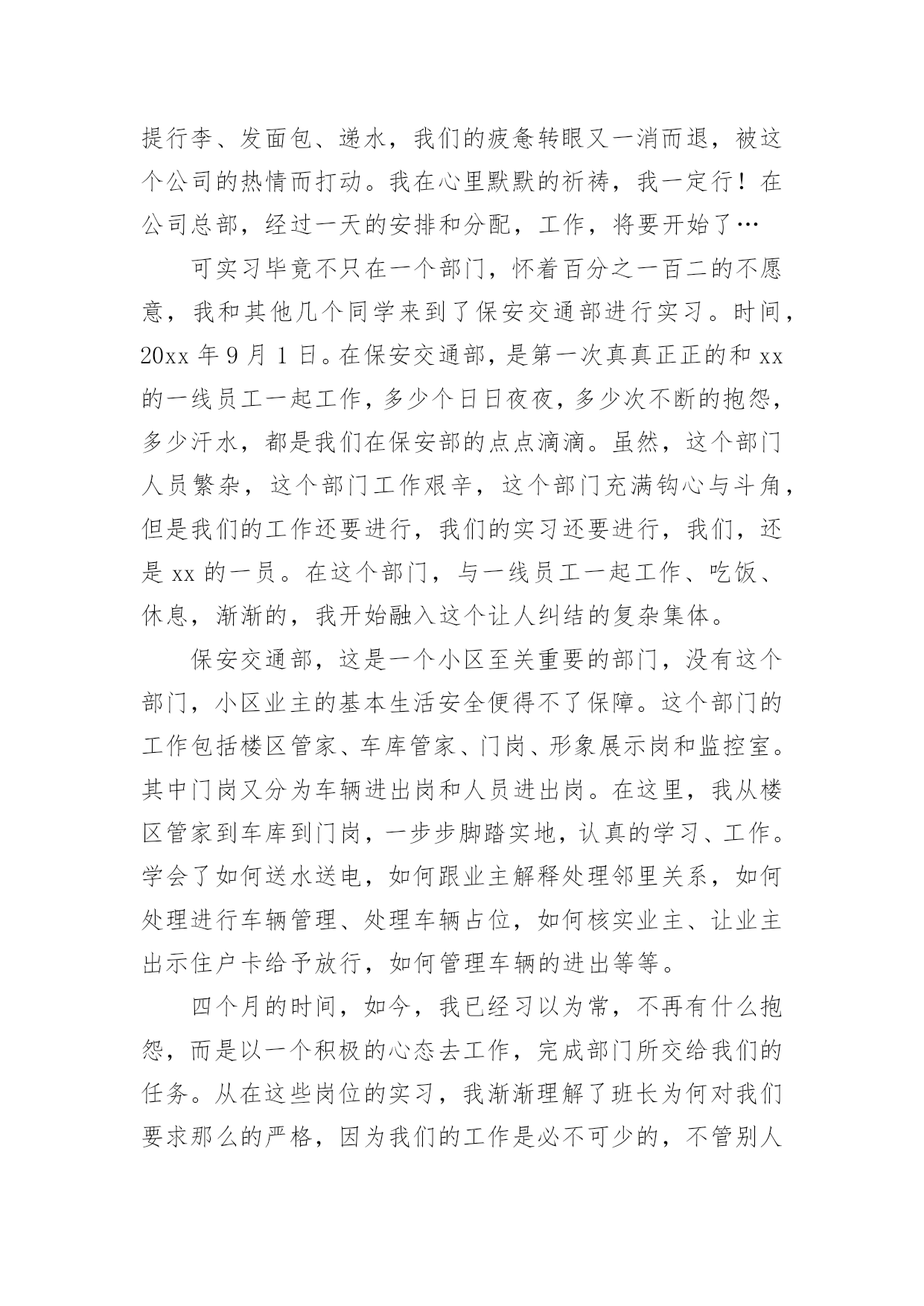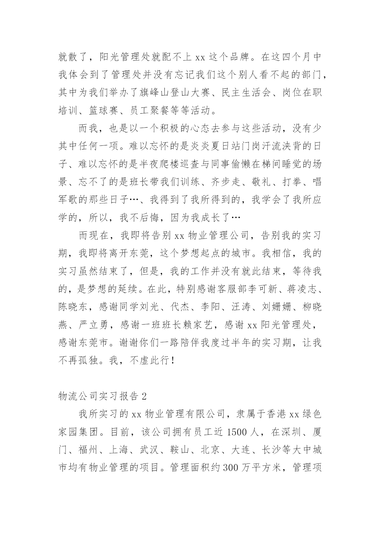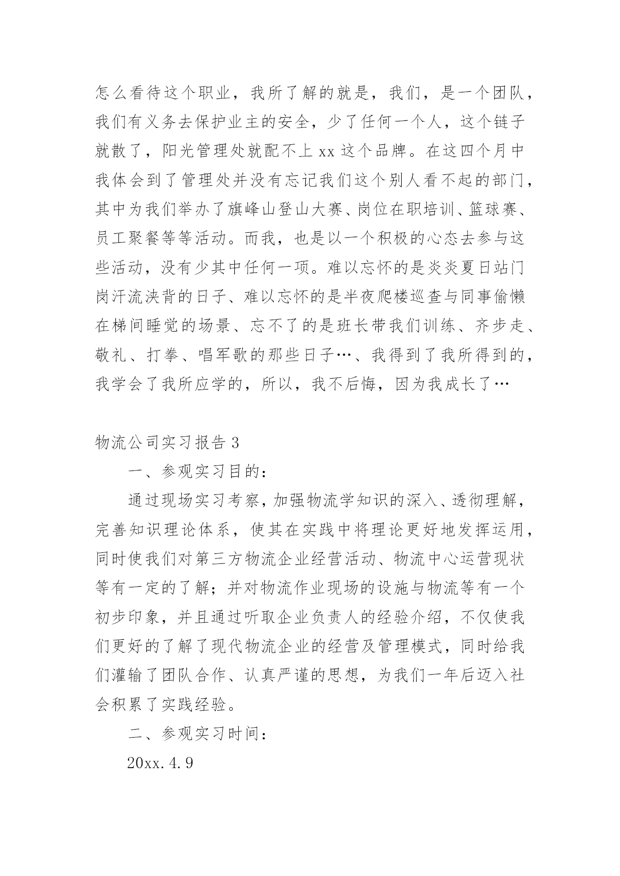 物流公司实习报告在人们越来越注重自身素养的今天,报告的适用范围越来越广泛,报告包含标题、正文、结尾等。我们应当如何写报告呢?以下是小编为大家整理的物流公司实习报告,欢迎阅读与收藏。物流公司实习报告1本人于20xx年7月至20xx年12月在广东省东莞市xx物业管理有限公司实习,其中秩序维护员4个月,客服2个月。短短的半年一晃眼便过去了,在这期间有欢笑、也有汗水。喜的是作为xx的一员,与公司同甘苦、共患难,在工作中学到了许多有关物业管理的知识和实践操让我对物业管理有了更加全面透彻的了解;苦的是我也在工作中经历了大大小小的难以处理的事情和与公司一线员工一起工作,体会到了作为秩序维护员的那份艰辛与劳累。忘不了的是将要实习工作、离开集体、离开父母、离开同学的那份难以割舍和留恋的情怀;忘不了的是与同学告别,相互拥抱、流泪、挥手告别的场面;忘不了的是我终于正式迈入社会、独立生活、将要成就属于自己的那份梦想激动的心情…20xx年7月1日,经过一天一夜的长途跋涉终于到达了东莞,这个让我渴望而又懵懂的城市,大家最初那份将要踏向异乡的兴奋心情也随着漫长的列车颠簸而渐渐消退。可当大家下火车的那一刻,看到人力资源部古经理热情的帮我们提行李、发面包、递水,我们的疲惫转眼又一消而退,被这个公司的热情而打动。我在心里默默的祈祷,我一定行!在公司总部,经过一天的安排和分配,工作,将要开始了…20xx年7月2号经过一天的休息和调整后我被分到阳光管理处暂行两个月的实习工作。很快,我们便以一个积极、热情的心态进入了工作状态。短短的两个月,我主动了解我管理处职能范围、机构设置、人员编制等基本情况,并且严格遵守我处的各项规章制度。其中我主要接手了vip客户接待这一工作,负责对于维修单的回访验证及各项资料诸如物品放行条、保修、巡查维修记录表、日常巡查签到表、清洁卫生、绿化检查表等的整理。在工作中遇到了种种困难,如在给业主打电话时经常会遇到业主大发牢骚,而我,也在慢慢的累积经验,学会了倾听,学会用语言耐心的向业主解释,用我的真诚去认真的对待每一位客户。在客服前台,我更学会了用微笑面对客户,耐心的向他们解释管理处的一些规定是为业主着想,帮助业主开物品放行条、给住户卡授权、办理车卡等等。记得住的便是在暴雨中和同事帮业主把小孩抱到避雨处得到业主谢意的那份开心;记得住的便是管理处内审时大家一同整理资料的那些吃泡面加班的日子;记得住的便是给我们培训、和我们畅谈社会、畅谈工作、畅谈理想的那些老同事;更忘不了的是参加公司竞聘,一轮笔试、二轮机试、第三轮面试落榜的那份难过和苦涩…客服部,这个给我造梦的部门给我留下了太多值得回忆的梦…可实习毕竟不只在一个部门,怀着百分之一百二的不愿意,我和其他几个同学来到了保安交通部进行实习。时间,20xx年9月1日。在保安交通部,是第一次真真正正的和xx的一线员工一起工作,多少个日日夜夜,多少次不断的抱怨,多少汗水,都是我们在保安部的点点滴滴。虽然,这个部门人员繁杂,这个部门工作艰辛,这个部门充满钩心与斗角,但是我们的工作还要进行,我们的`实习还要进行,我们,还是xx的一员。在这个部门,与一线员工一起工作、吃饭、休息,渐渐的,我开始融入这个让人纠结的复杂集体。保安交通部,这是一个小区至关重要的部门,没有这个部门,小区业主的基本生活安全便得不了保障。这个部门的工作包括楼区管家、车库管家、门岗、形象展示岗和监控室。其中门岗又分为车辆进出岗和人员进出岗。在这里,我从楼区管家到车库到门岗,一步步脚踏实地,认真的学习、工作。学会了如何送水送电,如何跟业主解释处理邻里关系,如何处理进行车辆管理、处理车辆占位,如何核实业主、让业主出示住户卡给予放行,如何管理车辆的进出等等。四个月的时间,如今,我已经习以为常,不再有什么抱怨,而是以一个积极的心态去工作,完成部门所交给我们的任务。从在这些岗位的实习,我渐渐理解了班长为何对我们要求那么的严格,因为我们的工作是必不可少的,不管别人怎么看待这个职业,我所了解的就是,我们,是一个团队,我们有义务去保护业主的安全,少了任何一个人,这个链子就散了,阳光管理处就配不上xx这个品牌。在这四个月中我体会到了管理处并没有忘记我们这个别人看不起的部门,其中为我们举办了旗峰山登山大赛、民主生活会、岗位在职培训、篮球赛、员工聚餐等等活动。而我,也是以一个积极的心态去参与这些活动,没有少其中任何一项。难以忘怀的是炎炎夏日站门岗汗流浃背的日子、难以忘怀的是半夜爬楼巡查与同事偷懒在梯间睡觉的场景、忘不了的是班长带我们训练、齐步走、敬礼、打拳、唱军歌的那些日子…、我得到了我所得到的,我学会了我所应学的,所以,我不后悔,因为我成长了…而现在,我即将告别xx物业管理公司,告别我的实习期,我即将离开东莞,这个梦想起点的城市。我相信,我的实习虽然结束了,但是,