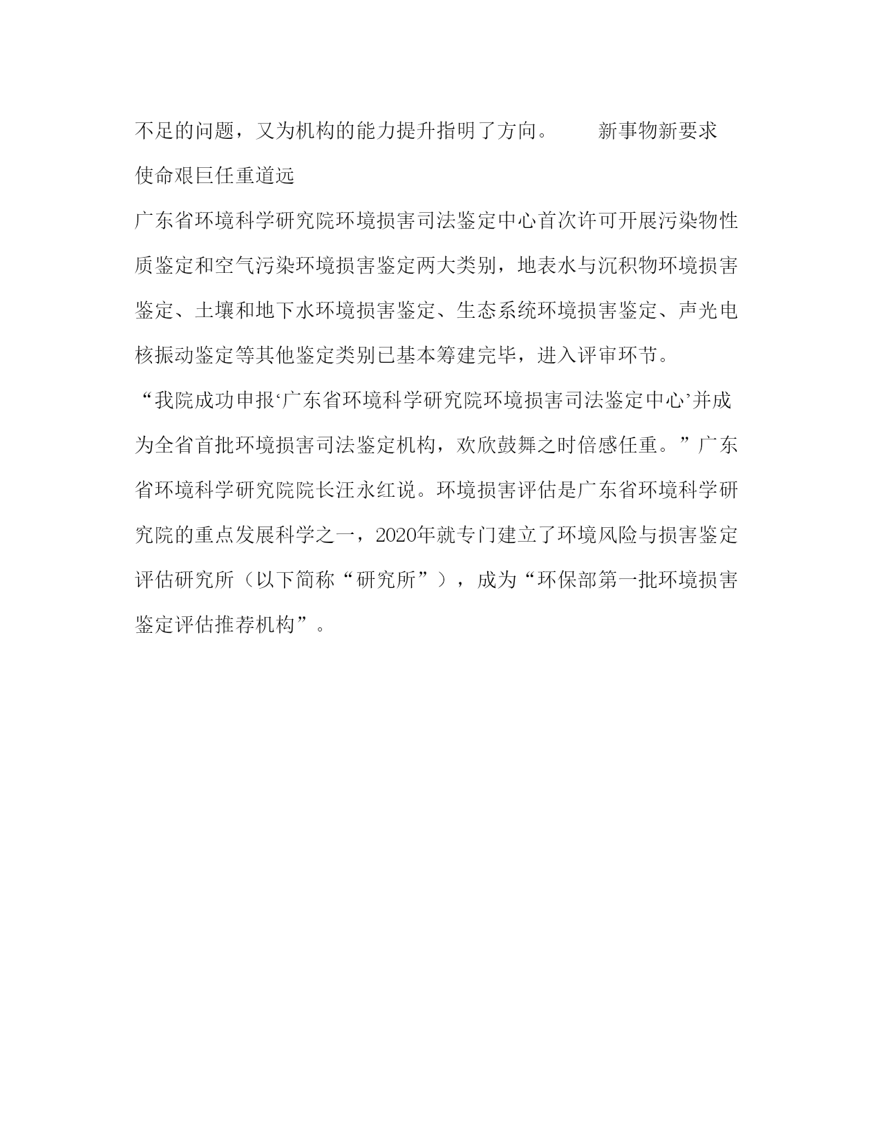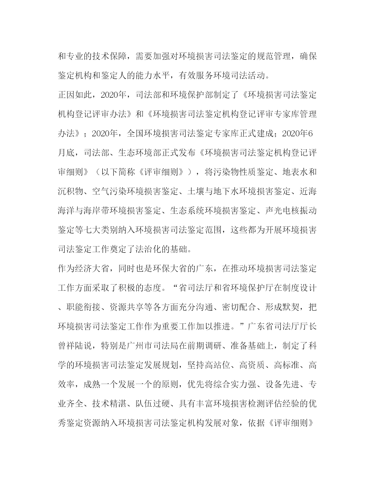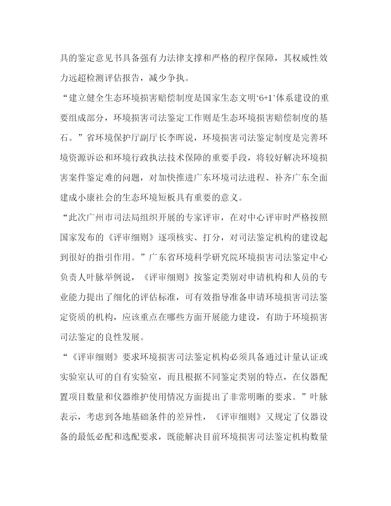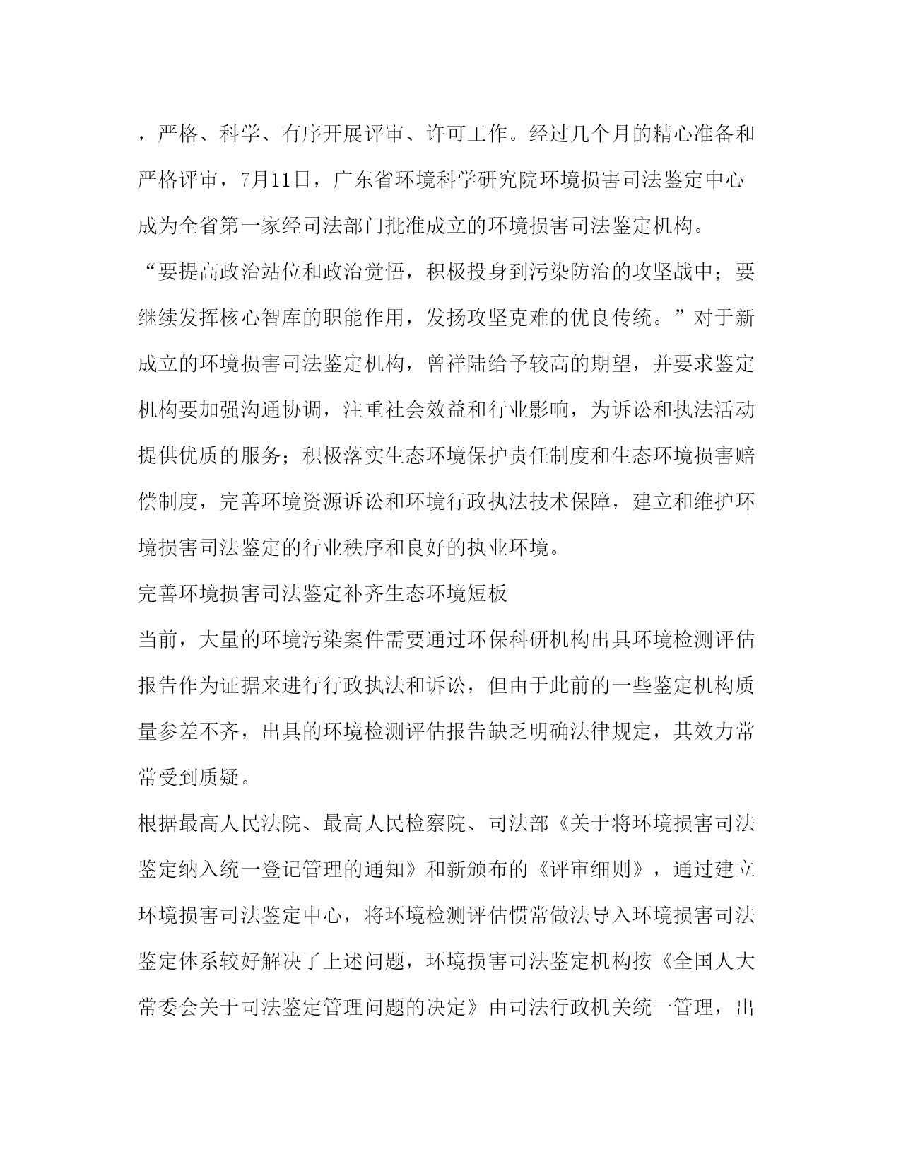 PAGE此资料由网络收集而来,如有侵权请告知上传者立即删除。资料共分享,我们负责传递知识。开启环境损害司法鉴定新征程7月17日,廣东省环境科学研究院环境损害司法鉴定中心举行揭牌仪式,这是全省成立的第一家环境损害类司法鉴定机构,标志着全省环境损害司法鉴定工作正式拉开序幕,司法鉴定力量正式投入到污染防治攻坚战中。推进环境司法进程为生态文明建设护航环境损害司法鉴定是指在诉讼活动中鉴定人运用环境科学的技术或者专门知识,采用监测、检测、现场勘察、实验模拟或者综合分析等技术方法,对环境污染或者生态破坏诉讼涉及的专门性问题进行鉴别和判断并提供鉴定意见的活动。近年来,随着工业化和城镇化的快速推进,环境污染侵害公私权益的事件不断发生,加强环境监管,健全生态环境保护责任追究制度和环境损害赔偿制度具有现实紧迫性。同时,涉及生态环境类的案件快速增长,相关诉讼活动日益增多,对环境损害司法鉴定的需求也愈加迫切。建立环境损害司法鉴定制度,通过法律的途径,合理、合法地追究污染环境的企业的损害赔偿责任,倒逼污染环境的企业提高环保意识,无疑意义重大。同时,为给环境责任界定、环境诉讼提供科学、准确和专业的技术保障,需要加强对环境损害司法鉴定的规范管理,确保鉴定机构和鉴定人的能力水平,有效服务环境司法活动。正因如此,2020年,司法部和环境保护部制定了《环境损害司法鉴定机构登记评审办法》和《环境损害司法鉴定机构登记评审专家库管理办法》;2020年,全国环境损害司法鉴定专家库正式建成;2020年6月底,司法部、生态环境部正式发布《环境损害司法鉴定机构登记评审细则》(以下简称《评审细则》),将污染物性质鉴定、地表水和沉积物、空气污染环境损害鉴定、土壤与地下水环境损害鉴定、近海海洋与海岸带环境损害鉴定、生态系统环境损害鉴定、声光电核振动鉴定等七大类别纳入环境损害司法鉴定范围,这些都为开展环境损害司法鉴定工作奠定了法治化的基础。作为经济大省,同时也是环保大省的广东,在推动环境损害司法鉴定工作方面采取了积极的态度。“省司法厅和省环境保护厅在制度设计、职能衔接、资源共享等各方面充分沟通、密切配合、形成默契,把环境损害司法鉴定工作作为重要工作加以推进。”广东省司法厅厅长曾祥陆说,特别是广州市司法局在前期调研、准备基础上,制定了科学的环境损害司法鉴定发展规划,坚持高站位、高资质、高标准、高效率,成熟一个发展一个的原则,优先将综合实力强、设备先进、专业齐全、技术精湛、队伍过硬、具有丰富环境损害检测评估经验的优秀鉴定资源纳入环境损害司法鉴定机构发展对象,依据《评审细则》,严格、科学、有序开展评审、许可工作。经过几个月的精心准备和严格评审,7月11日,广东省环境科学研究院环境损害司法鉴定中心成为全省第一家经司法部门批准成立的环境损害司法鉴定机构。“要提高政治站位和政治觉悟,积极投身到污染防治的攻坚战中;要继续发挥核心智库的职能作用,发扬攻坚克难的优良传统。”对于新成立的环境损害司法鉴定机构,曾祥陆给予较高的期望,并要求鉴定机构要加强沟通协调,注重社会效益和行业影响,为诉讼和执法活动提供优质的服务;积极落实生态环境保护责任制度和生态环境损害赔偿制度,完善环境资源诉讼和环境行政执法技术保障,建立和维护环境损害司法鉴定的行业秩序和良好的执业环境。完善环境损害司法鉴定补齐生态环境短板当前,大量的环境污染案件需要通过环保科研机构出具环境检测评估报告作为证据来进行行政执法和诉讼,但由于此前的一些鉴定机构质量参差不齐,出具的环境检测评估报告缺乏明确法律规定,其效力常常受到质疑。根据最高人民法院、最高人民检察院、司法部《关于将环境损害司法鉴定纳入统一登记管理的通知》和新颁布的《评审细则》,通过建立环境损害司法鉴定中心,将环境检测评估惯常做法导入环境损害司法鉴定体系较好解决了上述问题,环境损害司法鉴定机构按《全国人大常委会关于司法鉴定管理问题的决定》由司法行政机关统一管理,出具的鉴定意见书具备强有力法律支撑和严格的程序保障,其权威性效力远超检测评估报告,减少争执。“建立健全生态环境损害赔偿制度是国家生态文明‘6+1’体系建设的重要组成部分,环境损害司法鉴定工作则是生态环境损害赔偿制度的基石。”省环境保护厅副厅长李晖说,环境损害司法鉴定制度是完善环境资源诉讼和环境行政执法技术保障的重要手段,将较好解决环境损害案件鉴定难的问题,对加快推进广东环境司法进程、补齐广东全面建成小康社会的生态环境短板具有重要的意义。“此次广州市司法局组织开展的专家评审,在对中心评审时严格按照国家发布的《评审细则》逐项核实、打分,对司法鉴定机构的建设起到很好的指引作用。”广东省环境科学研究院环境损害司法鉴定中心负责人叶脉举例说,《评审细则》按鉴定类别对申请机构和人员的专业能力提出了细化的评估标准,可有效指导准备申请环