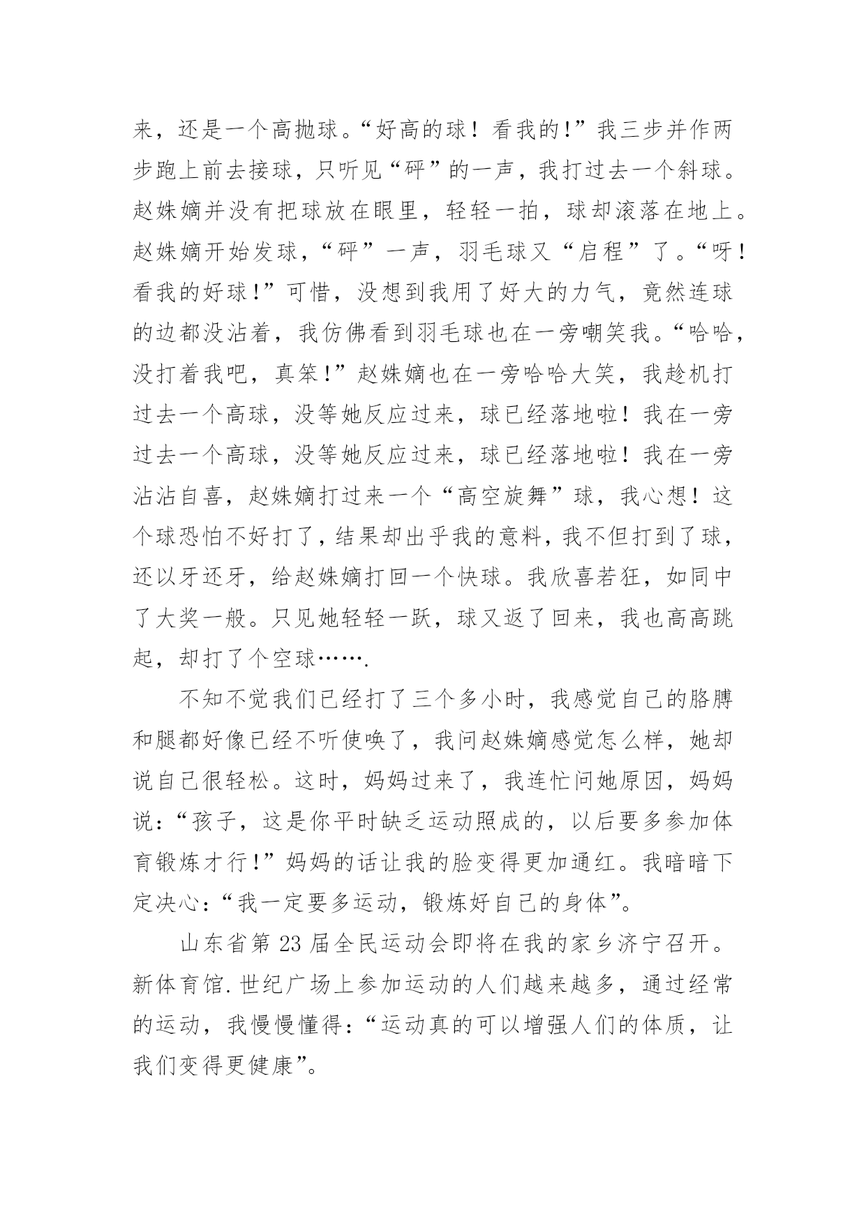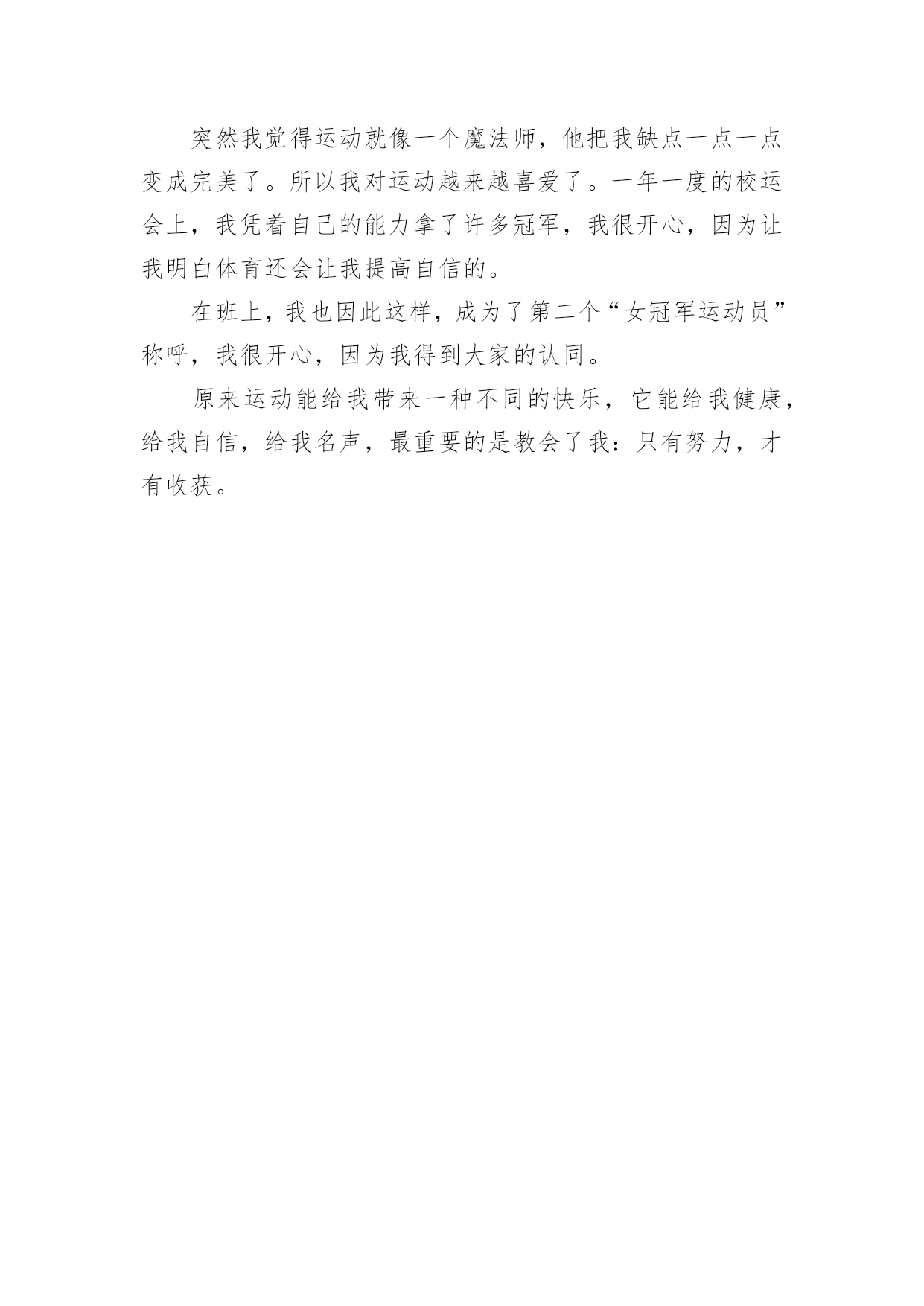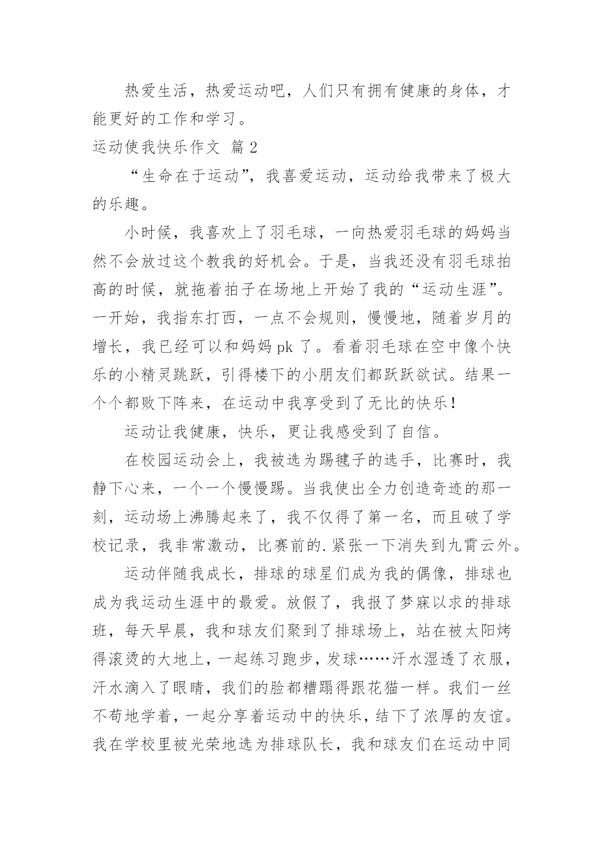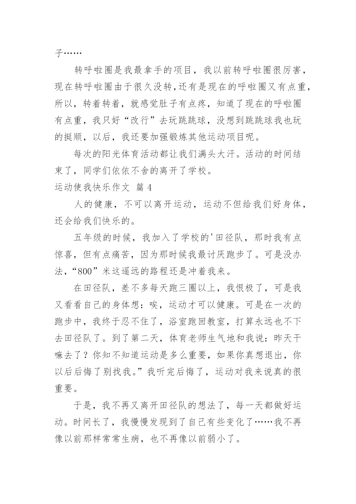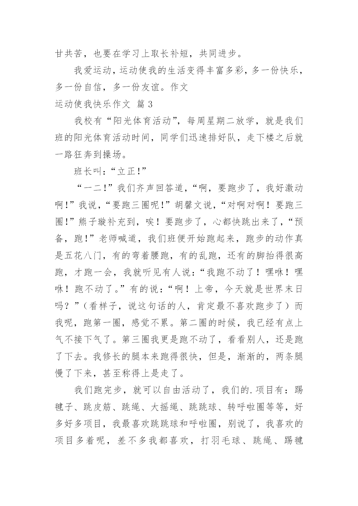 运动使我快乐作文运动使我快乐作文4篇在日常的学习、工作、生活中,大家都不可避免地会接触到作文吧,写作文是培养人们的观察力、联想力、想象力、思考力和记忆力的重要手段。你知道作文怎样写才规范吗?以下是小编帮大家整理的运动使我快乐作文4篇,供大家参考借鉴,希望可以帮助到有需要的朋友。运动使我快乐作文篇1星期天的上午,阳光明媚,微风徐徐,但这一切和我无关,以为我是一个不太喜欢运动的女孩。做完作业,躺在沙发上看电视是我最大的享受。后来是经常去广场锻炼身体的妈妈让我慢慢懂得,运动能给人带来许多快乐。有一次,妈妈对我说:“孩子,去广场活动活动吧!”我极不情愿的说:“不去!没意思!还不如在家看电视呢!”在一旁的爸爸说:“你现在正是长身体的时候,要多多锻炼才行,那样身体才会更加健康!我说:“不去!偏不去!”过了两天,我的好朋友赵姝嫡约我去广场打羽毛球,我不好意思拒绝,就对她说:“那好吧!不过不能超过两个小时!”其实我心里还惦记着我最爱的`动画片呢!开始打羽毛球了,我先发球,羽毛球像火箭一样向赵姝嫡冲去,“啊!她的速度好快!”只见她很熟练地把球打了过来,还是一个高抛球。“好高的球!看我的!”我三步并作两步跑上前去接球,只听见“砰”的一声,我打过去一个斜球。赵姝嫡并没有把球放在眼里,轻轻一拍,球却滚落在地上。赵姝嫡开始发球,“砰”一声,羽毛球又“启程”了。“呀!看我的好球!”可惜,没想到我用了好大的力气,竟然连球的边都没沾着,我仿佛看到羽毛球也在一旁嘲笑我。“哈哈,没打着我吧,真笨!”赵姝嫡也在一旁哈哈大笑,我趁机打过去一个高球,没等她反应过来,球已经落地啦!我在一旁过去一个高球,没等她反应过来,球已经落地啦!我在一旁沾沾自喜,赵姝嫡打过来一个“高空旋舞”球,我心想!这个球恐怕不好打了,结果却出乎我的意料,我不但打到了球,还以牙还牙,给赵姝嫡打回一个快球。我欣喜若狂,如同中了大奖一般。只见她轻轻一跃,球又返了回来,我也高高跳起,却打了个空球…….不知不觉我们已经打了三个多小时,我感觉自己的胳膊和腿都好像已经不听使唤了,我问赵姝嫡感觉怎么样,她却说自己很轻松。这时,妈妈过来了,我连忙问她原因,妈妈说:“孩子,这是你平时缺乏运动照成的,以后要多参加体育锻炼才行!”妈妈的话让我的脸变得更加通红。我暗暗下定决心:“我一定要多运动,锻炼好自己的身体”。山东省第23届全民运动会即将在我的家乡济宁召开。新体育馆.世纪广场上参加运动的人们越来越多,通过经常的运动,我慢慢懂得:“运动真的可以增强人们的体质,让我们变得更健康”。热爱生活,热爱运动吧,人们只有拥有健康的身体,才能更好的工作和学习。运动使我快乐作文篇2“生命在于运动”,我喜爱运动,运动给我带来了极大的乐趣。小时候,我喜欢上了羽毛球,一向热爱羽毛球的妈妈当然不会放过这个教我的好机会。于是,当我还没有羽毛球拍高的时候,就拖着拍子在场地上开始了我的“运动生涯”。一开始,我指东打西,一点不会规则,慢慢地,随着岁月的增长,我已经可以和妈妈pk了。看着羽毛球在空中像个快乐的小精灵跳跃,引得楼下的小朋友们都跃跃欲试。结果一个个都败下阵来,在运动中我享受到了无比的快乐!运动让我健康,快乐,更让我感受到了自信。在校园运动会上,我被选为踢毽子的选手,比赛时,我静下心来,一个一个慢慢踢。当我使出全力创造奇迹的那一刻,运动场上沸腾起来了,我不仅得了第一名,而且破了学校记录,我非常激动,比赛前的.紧张一下消失到九霄云外。运动伴随我成长,排球的球星们成为我的偶像,排球也成为我运动生涯中的最爱。放假了,我报了梦寐以求的排球班,每天早晨,我和球友们聚到了排球场上,站在被太阳烤得滚烫的大地上,一起练习跑步,发球……汗水湿透了衣服,汗水滴入了眼睛,我们的脸都糟蹋得跟花猫一样。我们一丝不苟地学着,一起分享着运动中的快乐,结下了浓厚的友谊。我在学校里被光荣地选为排球队长,我和球友们在运动中同甘共苦,也要在学习上取长补短,共同进步。我爱运动,运动使我的生活变得丰富多彩,多一份快乐,多一份自信,多一份友谊。作文运动使我快乐作文篇3我校有“阳光体育活动”,每周星期二放学,就是我们班的阳光体育活动时间,同学们迅速排好队,走下楼之后就一路狂奔到操场。班长叫:“立正!”“一二!”我们齐声回答道,“啊,要跑步了,我好激动啊!”我说,“要跑三圈呢!”胡馨文说,“对啊对啊!要跑三圈!”熊子璇补充到,唉!要跑步了,心都快跳出来了,“预备,跑!”老师喊道,我们班便开始跑起来,跑步的动作真是五花八门,有的弯着腰跑,有的乱跑,还有的脚抬得很高跑,才跑一会,我就听见有人说:“我跑不动了!嘿咻!嘿咻!跑不动了。”有的说:“啊!上帝,今天就是世界末日吗?”(看样子,说这句话的人,肯定最不喜欢跑步了)而我呢,跑第一圈,感觉不累。第二圈的时候,我已经有点上气不接下气了。第三圈