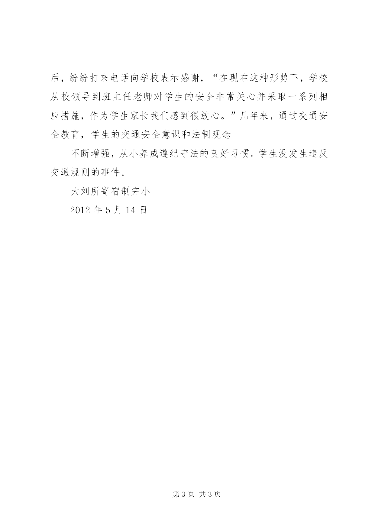 第PAGE\*Arabic\*MERGEFORMAT3页共NUMPAGES\*MERGEFORMAT3页交通安全教育活动总结大留所寄宿制完小交通安全教育活动总结随着经济的发展,交通车辆日流量的增多,学生的道路交通安全问题越来越突出。长期以来,小学生的道路交通意识相对淡薄,导致交通事故时有发生。为贯彻落实公安部、教育部《关于加强中小学校交通安全工作的通知》精神,进一步搞好我校的交通安全教育,避免我校学生交通违章和交通事故的发生,除在平时对学生加强教育外,我校将每年5月份作为“交通安全教育月”举行系列活动。为保证我校交通安全教育活动的贯彻落实与顺利开展,我校专门成立了交通安全教育领导小组,以组长:贾争艳。副组长:王兴友领导指导下,继续完善我校交通安全管理制度和学习制度,每月定期组织教师召开交通安全学习会议,部署交通安全教育工作,并组织全校师生学习新颁布的《交通法》及相关交通知识。首先,学校在学年初就制定了学生上放学途中的交通安全管理规定,各班成立上放的路队小组,这样把学生的上放学的交通安全落实到每一班、每一个人。其次,以班级为单位开展交通安全宣传管理工作,为班主任开设交通法规培训及如何系统开展交通安全教育活动的培训,并对班级交通安全教育活动进行有力的监督。教师对学生能够进行随时随地的交通安全教育,并在每班设立一名“小交通安全员”,对其进行培训,使其能够配合班主任搞好全班的交通安全教育工作。每学期在节假日、寒、暑假放假之前都要对学生进行安全教育。除了规定学校应有的《交通安全宣传栏》、警示牌和每天要求学生必带联系卡之外,每年在12月份学校组织开展了“六个一”的活动,利用校会的时间对全校学生集中进行交通安全教育。各班召开一次主题班会《文明行为伴我行》,全校学生每人制定一份《学生交通安全保证书》,自己提出在交通安全问题上应注意的问题,提高交通安全意识,并由家长签字,班主任签字后装订,留存在学校存档。各班出一期以交通安全为主题的黑板报,学校举办一期手抄报的展览、每年还积极组织学生积极参加交通安全的征文活动,在德育考核中增加了交通安全的内容,加深同学们的交通意识今年在我校又组织了师生观看《关爱生命、安全出行》交通安全光盘,用一幕幕惨痛的悲剧警示后人,一点小的失误会造成无法挽回的损失,造成巨大的遗憾。河北支队陈文盛警官用血的事实讲述了注意交通安全的重要性,总结了超速、超载、违章停车,违反交通规则等造成重大事故的原因,教育全校同学要学习交通规则,遵守交通规则,珍爱年轻生命。学生们看后很受震动,纷纷表示要做遵守交通规则的小公民。家长们在得知我们的活动后,纷纷打来电话向学校表示感谢,“在现在这种形势下,学校从校领导到班主任老师对学生的安全非常关心并采取一系列相应措施,作为学生家长我们感到很放心。”几年来,通过交通安全教育,学生的交通安全意识和法制观念不断增强,从小养成遵纪守法的良好习惯。学生没发生违反交通规则的事件。大刘所寄宿制完小2012年5月14日