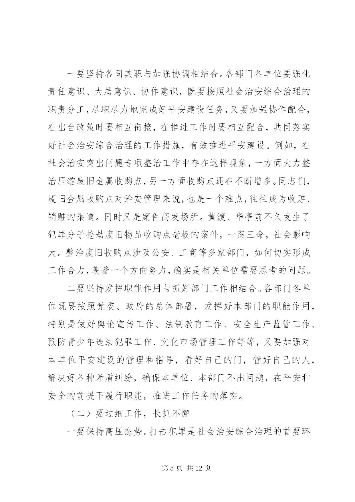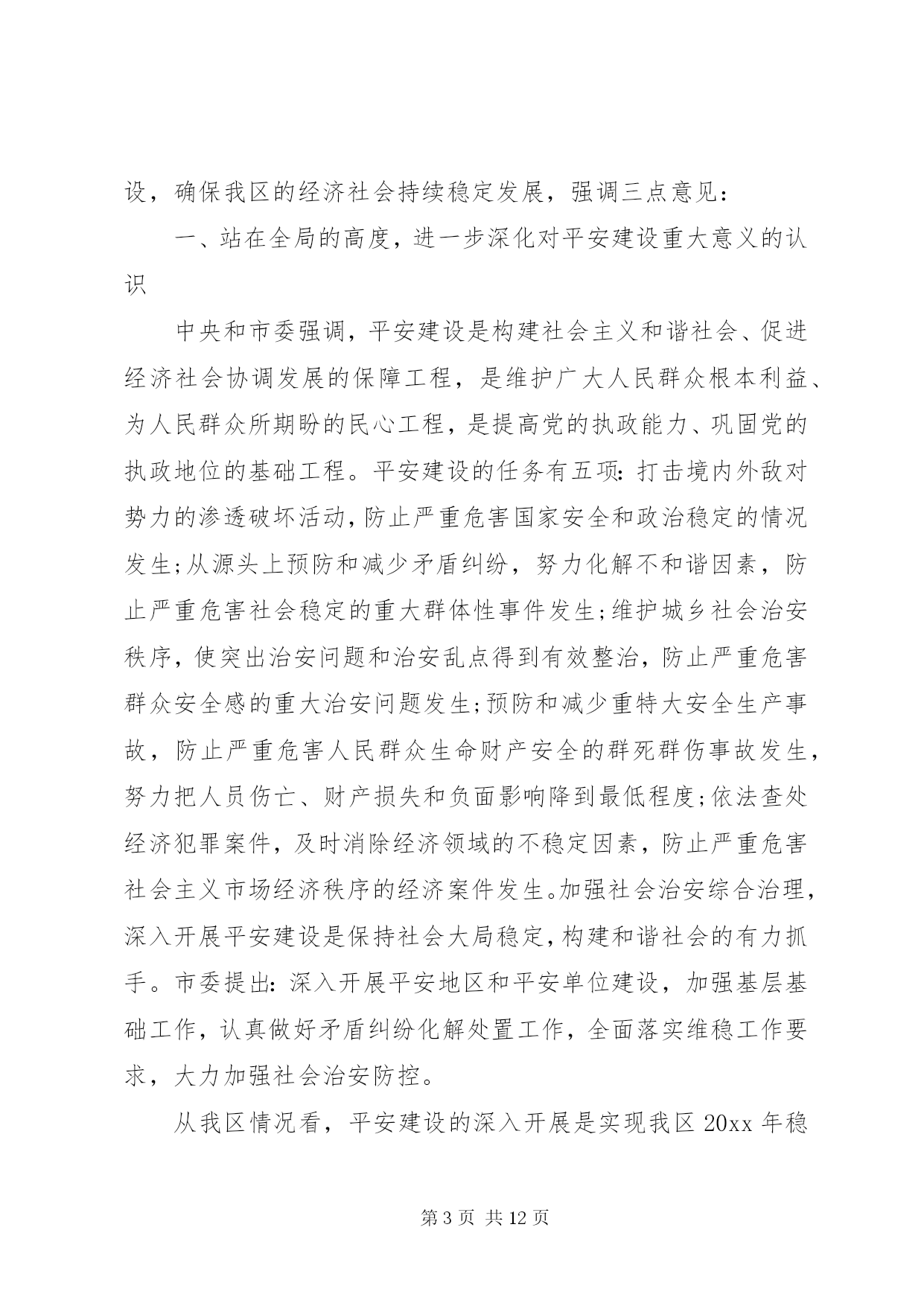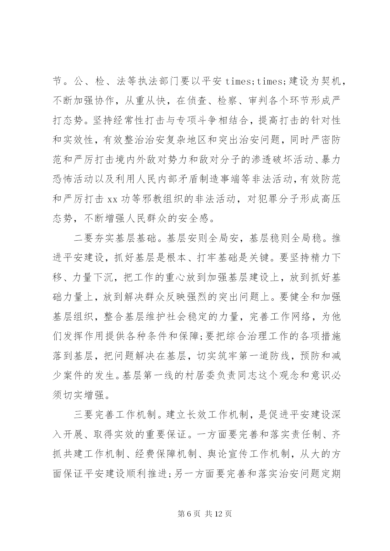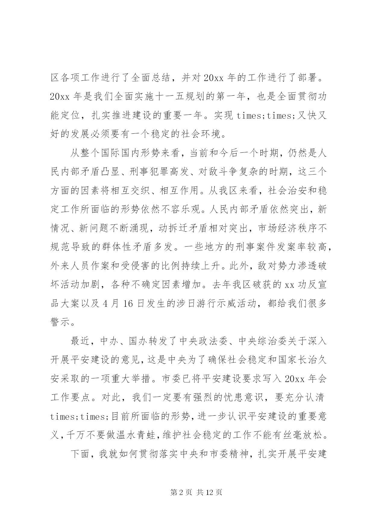 第PAGE\*Arabic\*MERGEFORMAT12页共NUMPAGES\*MERGEFORMAT12页政法维稳工作会议讲话(2)政法维稳工作会议讲话(二):同志们:刚才,**同志对我区20xx年的政法维稳工作进行了回顾总结,对20xx年的工作作了具体部署,这些意见我都同意。过去一年我区各级党政组织,特别是政法维稳各部门,认真贯彻中央、市委的指示精神,在区委、区政府的坚强领导下,围绕中心,服务大局,坚持稳定压倒一切的指导方针,为确保times;times;一方平安,尽心尽责,区委、区政府对大家的工作是满意的。在这里我代表区委、区政府,向同志们表示衷心的感谢。过去的一年,我区各项工作都取得了骄人的业绩,圆满完成了十五计划和三年行动计划所确定的各项目标,实现了经济社会又快又好的发展,我们以国际汽车城建设为引领,地区综合经济实力跃上了新台阶。全年完成增加值410.7亿元,同比增长20.5%;工业总产值1322亿元,同比增长20.1%;财政总收入131.1亿元,其中地方财政收入57.5亿元,同比分别增长35.6%和38.6%。与此同时,times;times;新城建设取得了阶段性突破,轨道交通11号线建设正式启动,三个集中稳步推进,城市文明程度显著提高。前不久,区委召开了times;届times;次全会,对20xx年我区各项工作进行了全面总结,并对20xx年的工作进行了部署。20xx年是我们全面实施十一五规划的第一年,也是全面贯彻功能定位,扎实推进建设的重要一年。实现times;times;又快又好的发展必须要有一个稳定的社会环境。从整个国际国内形势来看,当前和今后一个时期,仍然是人民内部矛盾凸显、刑事犯罪高发、对敌斗争复杂的时期,这三个方面的因素将相互交织、相互作用。从我区来看,社会治安和稳定工作所面临的形势依然不容乐观。人民内部矛盾依然突出,新情况、新问题不断涌现,动拆迁矛盾相对突出,市场经济秩序不规范导致的群体性矛盾多发。一些地方的刑事案件发案率较高,外来人员作案和受侵害的比例持续上升。此外,敌对势力渗透破坏活动加剧,各种不确定因素增加。去年我区破获的xx功反宣品大案以及4月16日发生的涉日游行示威活动,都给我们很多警示。最近,中办、国办转发了中央政法委、中央综治委关于深入开展平安建设的意见,这是中央为了确保社会稳定和国家长治久安采取的一项重大举措。市委已将平安建设要求写入20xx年会工作要点。对此,我们一定要有强烈的忧患意识,要充分认清times;times;目前所面临的形势,进一步认识平安建设的重要意义,千万不要做温水青蛙,维护社会稳定的工作不能有丝毫放松。下面,我就如何贯彻落实中央和市委精神,扎实开展平安建设,确保我区的经济社会持续稳定发展,强调三点意见:一、站在全局的高度,进一步深化对平安建设重大意义的认识中央和市委强调,平安建设是构建社会主义和谐社会、促进经济社会协调发展的保障工程,是维护广大人民群众根本利益、为人民群众所期盼的民心工程,是提高党的执政能力、巩固党的执政地位的基础工程。平安建设的任务有五项:打击境内外敌对势力的渗透破坏活动,防止严重危害国家安全和政治稳定的情况发生;从源头上预防和减少矛盾纠纷,努力化解不和谐因素,防止严重危害社会稳定的重大群体性事件发生;维护城乡社会治安秩序,使突出治安问题和治安乱点得到有效整治,防止严重危害群众安全感的重大治安问题发生;预防和减少重特大安全生产事故,防止严重危害人民群众生命财产安全的群死群伤事故发生,努力把人员伤亡、财产损失和负面影响降到最低程度;依法查处经济犯罪案件,及时消除经济领域的不稳定因素,防止严重危害社会主义市场经济秩序的经济案件发生。加强社会治安综合治理,深入开展平安建设是保持社会大局稳定,构建和谐社会的有力抓手。市委提出:深入开展平安地区和平安单位建设,加强基层基础工作,认真做好矛盾纠纷化解处置工作,全面落实维稳工作要求,大力加强社会治安防控。从我区情况看,平安建设的深入开展是实现我区20xx年稳定工作目标的有效抓手,同时更是确保全面实现十一五发展良好开局的重要保障。十一五时期既是times;times;可以大有作为的黄金发展期,也是矛盾、风险和制约凸显期,如何化解矛盾和风险,构建和谐times;times;,抢抓黄金发展期,确保改革、发展、稳定的统一是我们必须破解的难题。为此,区委要把平安建设作为一项系统工程来抓,从多方面入手,制定我区深入开展平安建设的实施意见,突出积极预防和有效化解各种社会矛盾、依法打击各类犯罪和敌对势力的渗透破坏活动、大力加强社会治安防范工作、加强社会管理等方面工作重点,扎实推进我区平安建设的深入开展。二、齐抓共管,确保把维护社会稳定的各项工作措施落到实处深入开展平安建设,关键是把维护社会稳定的各项工作