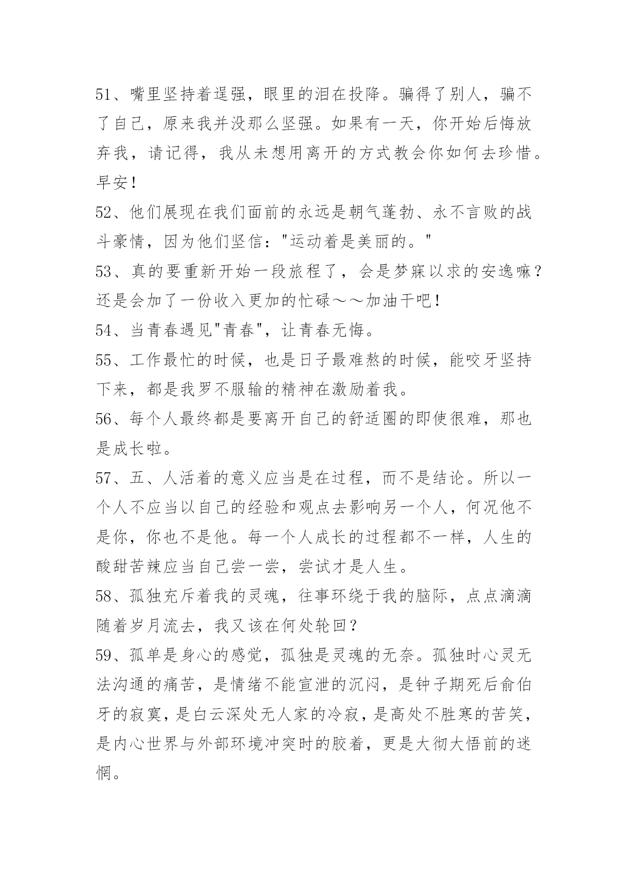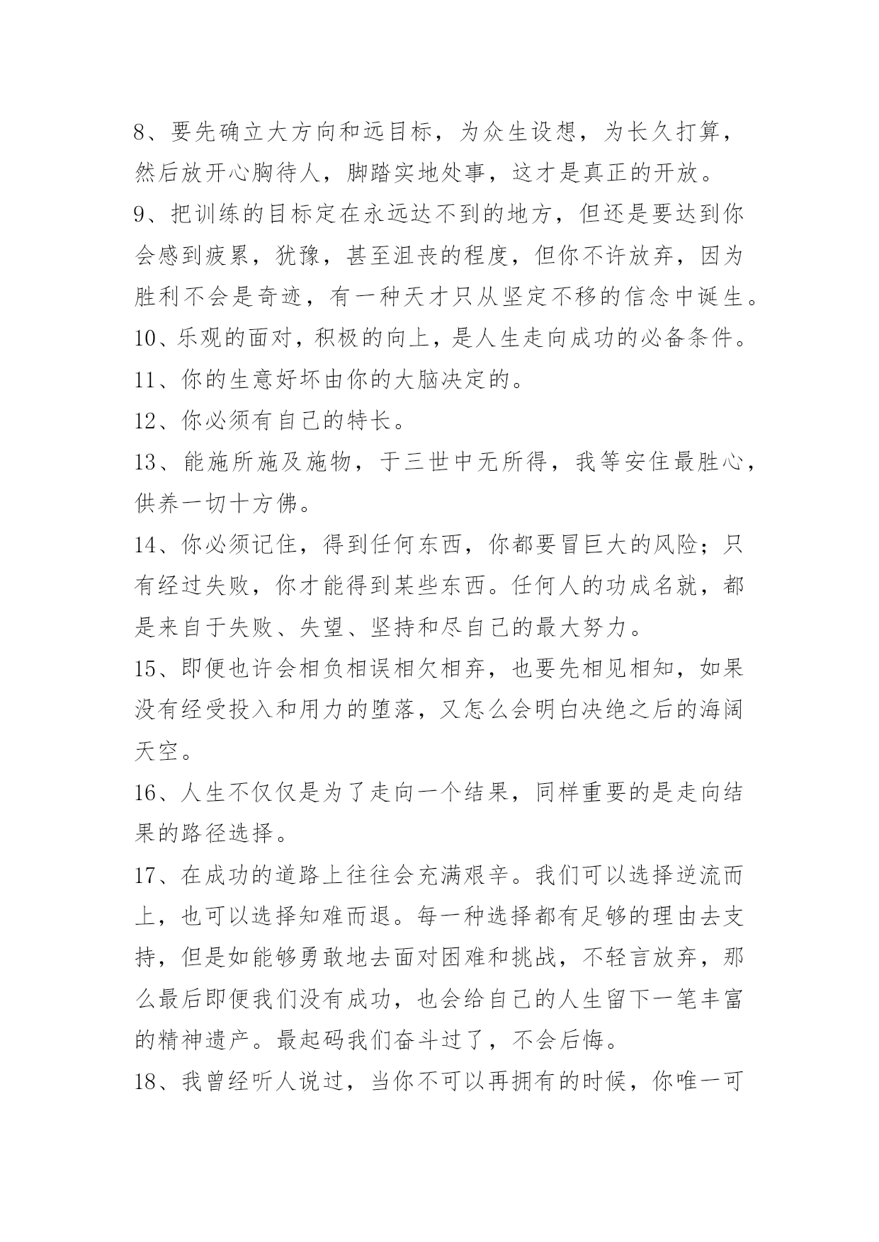 励志名句66条2024年精选励志名句汇总66条把目标按周与日进行具体化分解,设定计划来实现总体目标。尽可能把每天的任务数量设得低一点儿,把注意力集中在你所计划的任务上。如果你发现自己完成了任务,从每周任务列表里再选一个目标。在你状态最佳时完成最难的任务,这通常意味着最先去完成它们。以下是小编精心准备的励志名句66条,欢迎大家借鉴与参考,希望对大家有所帮助。1、此时喜欢的,此时就要努力捧在手里。世上真真假假,唯有眼前的幸福最可贵。该放手去爱的时候,别犹豫;该狠心努力的时候,别懒惰。2、我很好,正在努力的忘记你。3、我坚信最终是工作在激发人们的潜质,有时我期望是我来推动他们,但其实不是,而是工作本身。我的工作是使工作尽可能的显现完美,并激发出人们的最大潜能。4、把一些委派出去你就会有更多的时间专注于最重要的事情。那样确保你已经认真评估了自己的日常任务,剔除那些没有具体目标的工作,专注那些只有你能完成的任务。5、无数个夜你我都曾为了理想睡不着,只有经历越多才会变的越强。6、我们的梦想必须足够宏大,这样,在追寻的过程中,她才不会消失。7、只要坚持奋斗,人生终将辉煌。8、要先确立大方向和远目标,为众生设想,为长久打算,然后放开心胸待人,脚踏实地处事,这才是真正的开放。9、把训练的目标定在永远达不到的地方,但还是要达到你会感到疲累,犹豫,甚至沮丧的程度,但你不许放弃,因为胜利不会是奇迹,有一种天才只从坚定不移的信念中诞生。10、乐观的面对,积极的向上,是人生走向成功的必备条件。11、你的生意好坏由你的大脑决定的。12、你必须有自己的特长。13、能施所施及施物,于三世中无所得,我等安住最胜心,供养一切十方佛。14、你必须记住,得到任何东西,你都要冒巨大的风险;只有经过失败,你才能得到某些东西。任何人的功成名就,都是来自于失败、失望、坚持和尽自己的最大努力。15、即便也许会相负相误相欠相弃,也要先相见相知,如果没有经受投入和用力的堕落,又怎么会明白决绝之后的海阔天空。16、人生不仅仅是为了走向一个结果,同样重要的是走向结果的路径选择。17、在成功的道路上往往会充满艰辛。我们可以选择逆流而上,也可以选择知难而退。每一种选择都有足够的理由去支持,但是如能够勇敢地去面对困难和挑战,不轻言放弃,那么最后即便我们没有成功,也会给自己的人生留下一笔丰富的精神遗产。最起码我们奋斗过了,不会后悔。18、我曾经听人说过,当你不可以再拥有的时候,你唯一可以做的,就是让自己不要再忘记!早安,周四!19、灵魂在耕耘中净化耕耘后是一片清新的天地一个绚丽的人生。20、做题的时候先易后难是真理,高考比的不是攻坚而是拿分。21、你绝望了,你感觉自己无力面对一切,你不知道自己该做些什么,你感觉一切都是没有意义的,但是你要知道,你的想法完全是错误的,你完全有能力面对一切,你也能够作很多事情,只要你相信自己,改变自己,一切都会变得非常好的。22、不思过去,不想将来,珍惜体验即刻,随缘即是福。23、堵住你的耳朵,以免被那骇人的喧嚣乱了方寸,然后便沿着那条已设下的跑道一心一意地向前冲吧。24、当你成功瘦下来的时候,你会发现原来鸡汤都是真的!25、生活简单让人轻松快乐,想法简单让人平和宁静。只有心境简单了,才能有心思经营生活;只有生活简单了,才能有时间享受人生!看书,旅行,努力工作,关心身体和心情,成为最好的自己!26、我可以接受失败,但是绝不接受未奋斗过的自己!27、世界如此之大,做一个什么样的自己完全取决于你的选择。你可以选择破罐子破摔,待在原地,也可以选择一个不抱怨的世界,成就自己。28、如果你有想要完成的事或者爱的人,不进要努力,还要拼命。29、请不要在最能吃苦的时候选择安逸。30、要么沉溺于美好的幻想,要么破茧于未来的朝阳!31、如何做到为人和善又不失强硬?从不说硬话,从不做软事。32、该来的都会来,该走的全会走,别抗拒,别挽留,别贪恋,别不舍,别担心。学着看淡一些事情,才是对自己最好的保护。亲爱的姑娘,愿你像向日葵一样,每天都充满正能量。33、高考是汇百万人参加的一次练习。34、微笑拥抱每一天,做像向日葵般温暖的女子。这个社会是存在不公平的,不要抱怨,因为没有用,人总是在反省中进步的!35、当我们一同迎着晨曦走进这里时,当我们为了同一个目标共同打拼时,日子在悄悄地流逝,当这一切已成为了历史,伴随着这段历史,我们在慢慢成长!回忆过去,总结经验和教训,可以让我们成长;面向未来,不断地去学习可以让我们成熟!36、我还希望你们努力做到平凡而不平庸,大胆而不大意,敢说而不空说,谦让而不迁就,虚心而不虚荣,天真而不幼稚,活泼而守纪律,倔强而不固执,热情而不冲动,乐观而不盲目。37、今天,把自己变得优秀。38、鸡蛋,从外打破是食物,从内打破是生命。人生亦是如此,从外打破是压力,从内打