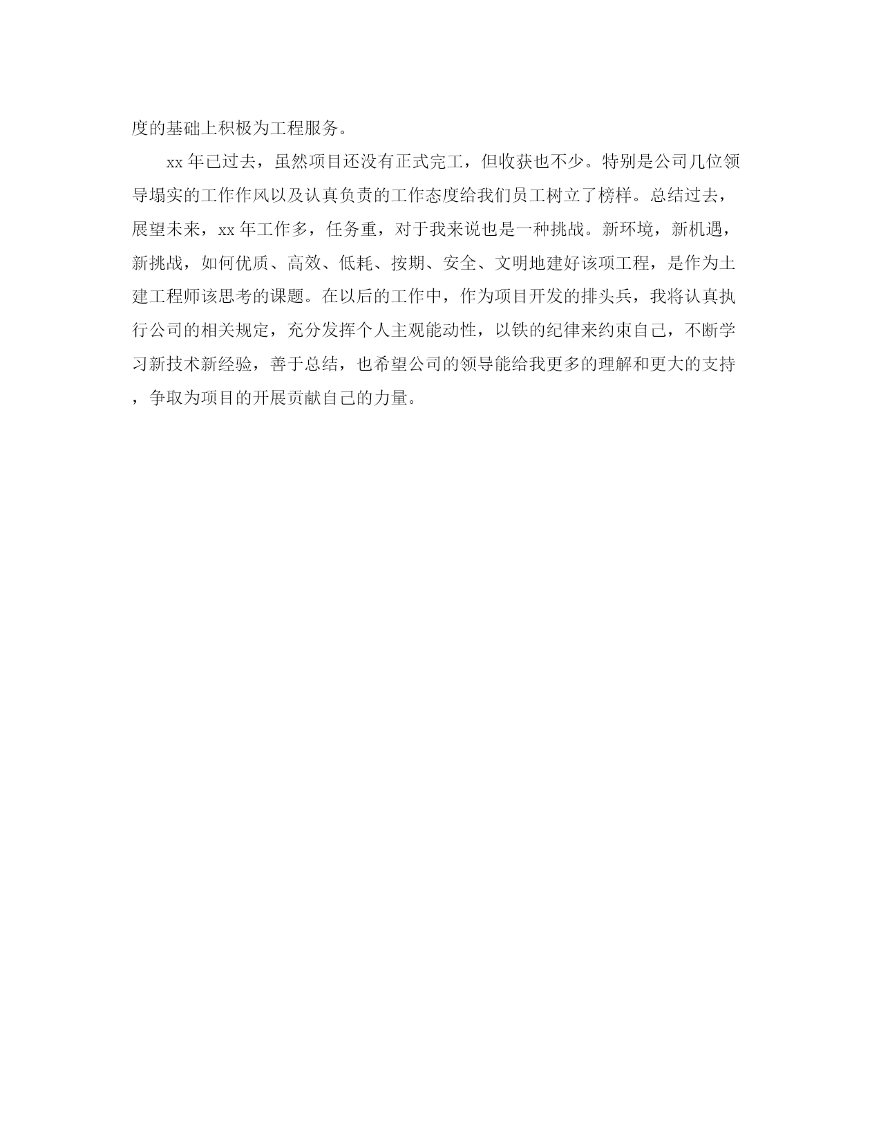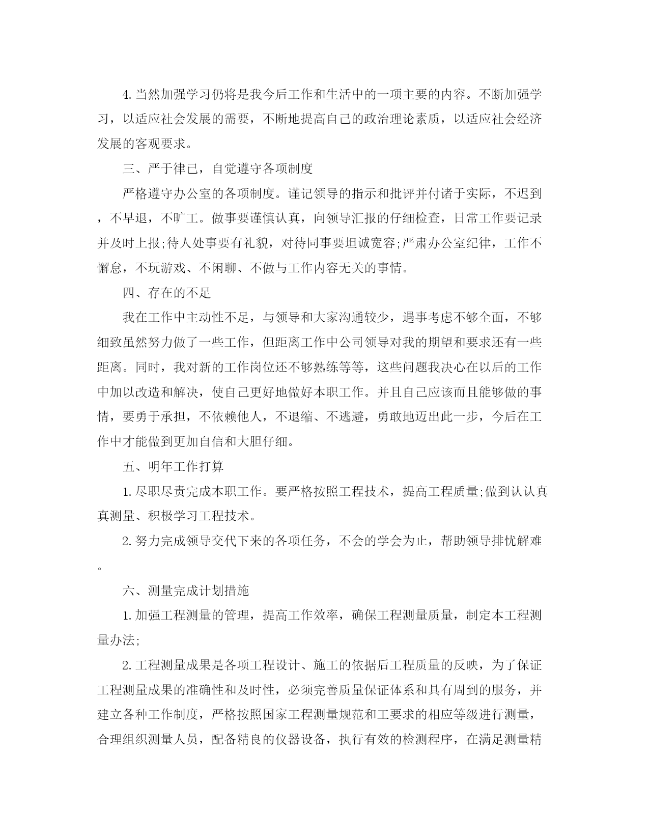 此资料由网络收集而来,如有侵权请告知上传者立即删除。资料共分享,我们负责传递知识。项目技术员个人工作总结样本示例进入公司已经有将近五年的时间来到四公司后,在公司领导的强有力的领导以及关心支持下,个人在xx年度取得了不小的进步。本人在工作过程中,较好地完成了xx年年度工作目标。下面我将这一年来的具体工作情况汇总如下:一、认认真真,做好本职工作。在四川xx项目中坚持完成了领导交办的各项任务,尽量做到让领导满意;在测量过程中遵章守纪,服从管理,做好本职工作;对测量工负责。熟悉设计图纸和施工图纸,严格执行测量技术和操作流程;按照规定的测量精度进行施测,确保精度和测量数据准确;施测后对测量成果进行复核工作;做好测量记录和定期对测量控制点测复查,确保测量数据正确;施测后对测量仪进行保养工作:定期对测量仪进行自检自校;施工过程中,发现问题及时上报;在本职测量工作中没出现过较大失误。在xx5标项目中暂代技术负责认真完成领导安排的工作,做到尽职尽责不怕辛苦;由于我平时认真学习各项施工技术,在世博园路改建铁阜高速等项目中一直工作在施工队第一线,对施工现场运作非常了解所以做起现场技术负责比较得心应手。在施工过程中认真履行规范要求严格细心发现并解决质量问题,工程质量和进度完成的比较顺利。二、自觉加强理论学习,努力提高政治思想素质,积极上进。1.加强理论学习,首先是从思想上重视。在过去的一段时间里,我能够加强对政治理论知识的学习,认真学习党的章程,学习马列主义、毛泽东思想邓小平理论和三个代表重要思想,并思考“我如何在自己的岗位上实践三个代表的重要思想”?同时注重加强对世界时事政治的了解,通过学习,提高了自己的政治鉴别能力,在大是大非问题面前,能够始终保持清醒的头脑。2.加强理论学习,其次是在行动上落实。在工作中针对自己的本职工作,系统地进行学习。3.加强理论学习注重实践,就是能够掌握并能熟悉运用理论知识,帮助自己在复杂多变的社会现象中认识事物的本质。4.当然加强学习仍将是我今后工作和生活中的一项主要的内容。不断加强学习,以适应社会发展的需要,不断地提高自己的政治理论素质,以适应社会经济发展的客观要求。三、严于律已,自觉遵守各项制度严格遵守办公室的各项制度。谨记领导的指示和批评并付诸于实际,不迟到,不早退,不旷工。做事要谨慎认真,向领导汇报的仔细检查,日常工作要记录并及时上报;待人处事要有礼貌,对待同事要坦诚宽容;严肃办公室纪律,工作不懈怠,不玩游戏、不闲聊、不做与工作内容无关的事情。四、存在的不足我在工作中主动性不足,与领导和大家沟通较少,遇事考虑不够全面,不够细致虽然努力做了一些工作,但距离工作中公司领导对我的期望和要求还有一些距离。同时,我对新的工作岗位还不够熟练等等,这些问题我决心在以后的工作中加以改造和解决,使自己更好地做好本职工作。并且自己应该而且能够做的事情,要勇于承担,不依赖他人,不退缩、不逃避,勇敢地迈出此一步,今后在工作中才能做到更加自信和大胆仔细。五、明年工作打算1.尽职尽责完成本职工作。要严格按照工程技术,提高工程质量;做到认认真真测量、积极学习工程技术。2.努力完成领导交代下来的各项任务,不会的学会为止,帮助领导排忧解难。六、测量完成计划措施1.加强工程测量的管理,提高工作效率,确保工程测量质量,制定本工程测量办法;2.工程测量成果是各项工程设计、施工的依据后工程质量的反映,为了保证工程测量成果的准确性和及时性,必须完善质量保证体系和具有周到的服务,并建立各种工作制度,严格按照国家工程测量规范和工要求的相应等级进行测量,合理组织测量人员,配备精良的仪器设备,执行有效的检测程序,在满足测量精度的基础上积极为工程服务。xx年已过去,虽然项目还没有正式完工,但收获也不少。特别是公司几位领导塌实的工作作风以及认真负责的工作态度给我们员工树立了榜样。总结过去,展望未来,xx年工作多,任务重,对于我来说也是一种挑战。新环境,新机遇,新挑战,如何优质、高效、低耗、按期、安全、文明地建好该项工程,是作为土建工程师该思考的课题。在以后的工作中,作为项目开发的排头兵,我将认真执行公司的相关规定,充分发挥个人主观能动性,以铁的纪律来约束自己,不断学习新技术新经验,善于总结,也希望公司的领导能给我更多的理解和更大的支持,争取为项目的开展贡献自己的力量。