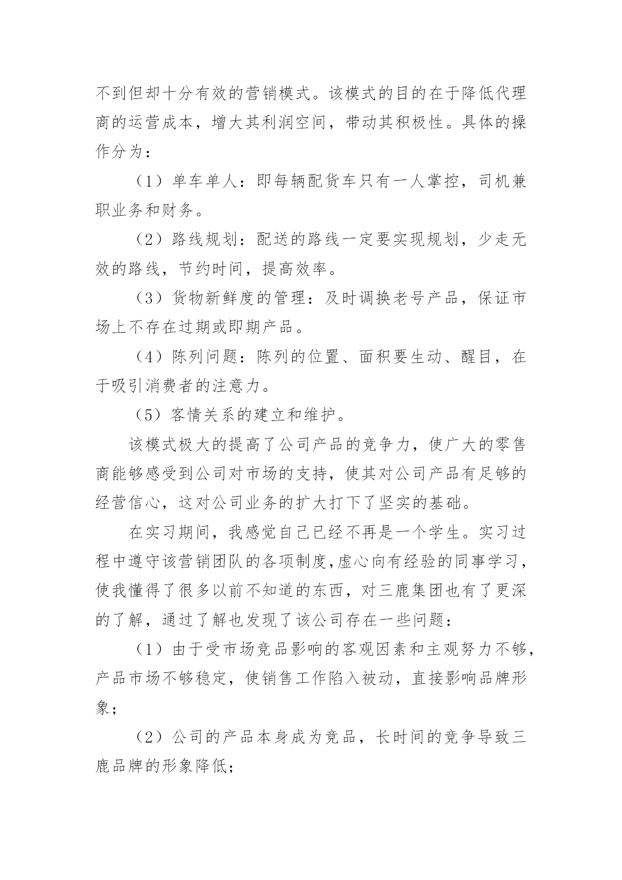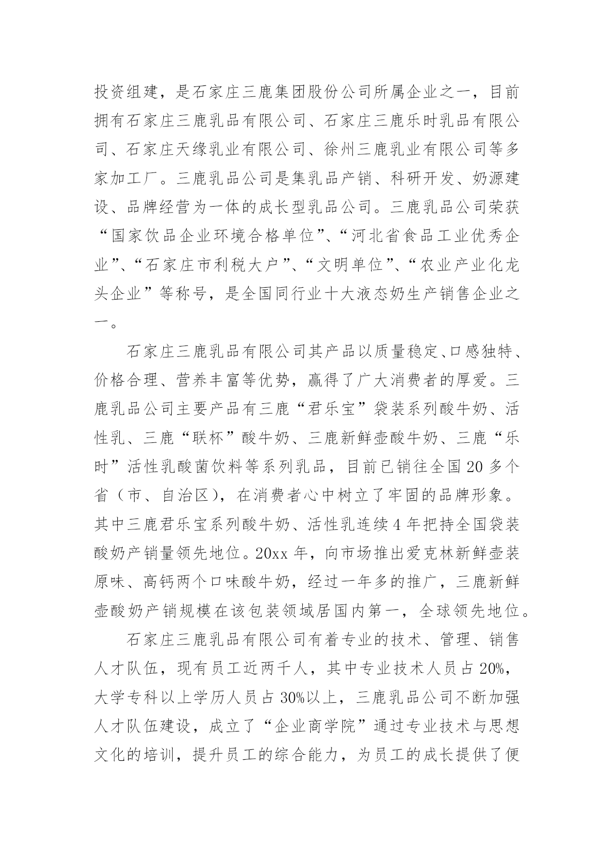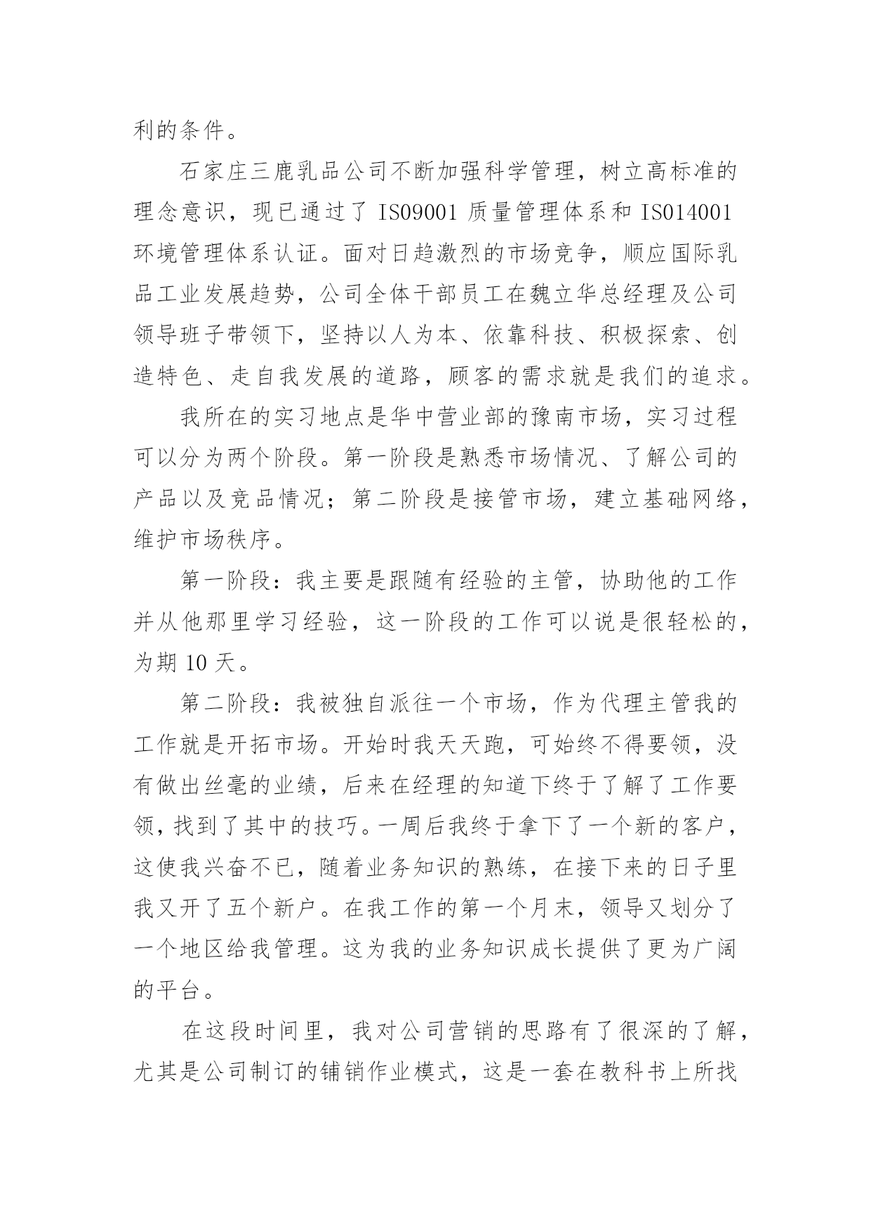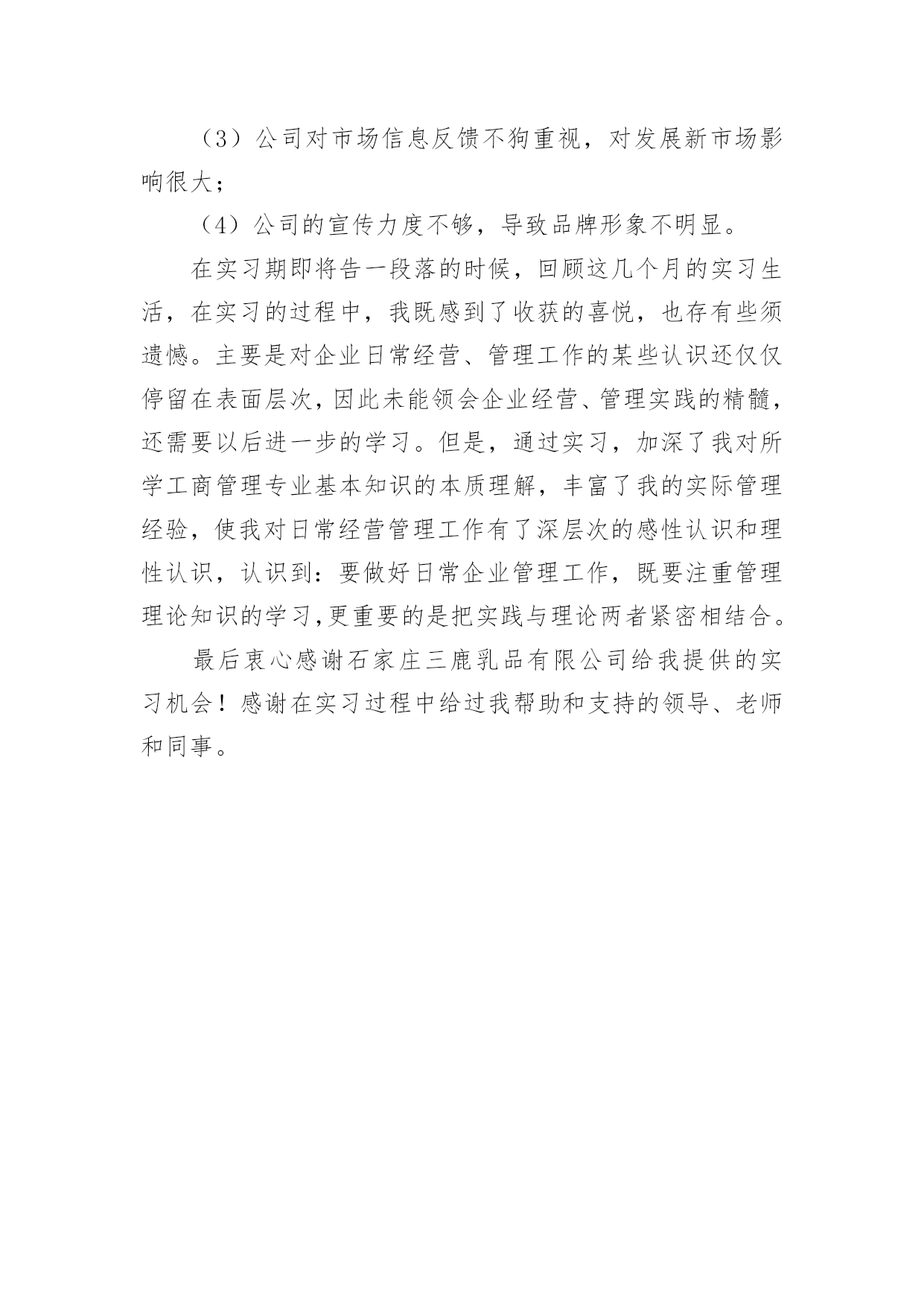 工商管理专业实习报告工商管理专业实习报告随着社会一步步向前发展,报告的使用成为日常生活的常态,其在写作上具有一定的窍门。你还在对写报告感到一筹莫展吗?下面是小编为大家整理的工商管理专业实习报告,欢迎大家分享。实习时间:07.03.01---07.04.25实习目的:用理论加深对实践的感性认识,用实践来验证理论知识的准确性,将理论知识与实际工作相结合,使自己更好的掌握管理的技巧,积极探求日常管理工作的本质与规律。实习单位:石家庄三鹿乳品有限公司自3月1日起,我在石家庄三鹿集团开始了我的实习生活。为期2个月的实习结束了,我在这2个月的实习中学到了很多在课堂上所就学不到的知识,受益非浅。为我从一个学生成长为一个合格的社会人打下了坚实的基础。现在我就对这一个月的实习做一个工作小结。首先介绍一下我的实习单位:石家庄三鹿乳品有限公司是三鹿集团的核心企业之一,专业从事酸奶系列产品的生产与销售,现已成为华北地区最大的发酵乳生产基地。石家庄三鹿乳品有限公司成立于20xx年4月,由三鹿集团股份公司、石家庄市君乐宝乳品有限公司、石家庄红旗乳品厂共同投资组建,是石家庄三鹿集团股份公司所属企业之一,目前拥有石家庄三鹿乳品有限公司、石家庄三鹿乐时乳品有限公司、石家庄天缘乳业有限公司、徐州三鹿乳业有限公司等多家加工厂。三鹿乳品公司是集乳品产销、科研开发、奶源建设、品牌经营为一体的成长型乳品公司。三鹿乳品公司荣获“国家饮品企业环境合格单位”、“河北省食品工业优秀企业”、“石家庄市利税大户”、“文明单位”、“农业产业化龙头企业”等称号,是全国同行业十大液态奶生产销售企业之一。石家庄三鹿乳品有限公司其产品以质量稳定、口感独特、价格合理、营养丰富等优势,赢得了广大消费者的厚爱。三鹿乳品公司主要产品有三鹿“君乐宝”袋装系列酸牛奶、活性乳、三鹿“联杯”酸牛奶、三鹿新鲜壶酸牛奶、三鹿“乐时”活性乳酸菌饮料等系列乳品,目前已销往全国20多个省(市、自治区),在消费者心中树立了牢固的品牌形象。其中三鹿君乐宝系列酸牛奶、活性乳连续4年把持全国袋装酸奶产销量领先地位。20xx年,向市场推出爱克林新鲜壶装原味、高钙两个口味酸牛奶,经过一年多的推广,三鹿新鲜壶酸奶产销规模在该包装领域居国内第一,全球领先地位。石家庄三鹿乳品有限公司有着专业的技术、管理、销售人才队伍,现有员工近两千人,其中专业技术人员占20%,大学专科以上学历人员占30%以上,三鹿乳品公司不断加强人才队伍建设,成立了“企业商学院”通过专业技术与思想文化的培训,提升员工的综合能力,为员工的成长提供了便利的条件。石家庄三鹿乳品公司不断加强科学管理,树立高标准的理念意识,现已通过了IS09001质量管理体系和IS014001环境管理体系认证。面对日趋激烈的市场竞争,顺应国际乳品工业发展趋势,公司全体干部员工在魏立华总经理及公司领导班子带领下,坚持以人为本、依靠科技、积极探索、创造特色、走自我发展的道路,顾客的需求就是我们的追求。我所在的实习地点是华中营业部的豫南市场,实习过程可以分为两个阶段。第一阶段是熟悉市场情况、了解公司的产品以及竞品情况;第二阶段是接管市场,建立基础网络,维护市场秩序。第一阶段:我主要是跟随有经验的主管,协助他的工作并从他那里学习经验,这一阶段的工作可以说是很轻松的,为期10天。第二阶段:我被独自派往一个市场,作为代理主管我的工作就是开拓市场。开始时我天天跑,可始终不得要领,没有做出丝毫的业绩,后来在经理的知道下终于了解了工作要领,找到了其中的技巧。一周后我终于拿下了一个新的客户,这使我兴奋不已,随着业务知识的熟练,在接下来的日子里我又开了五个新户。在我工作的第一个月末,领导又划分了一个地区给我管理。这为我的业务知识成长提供了更为广阔的平台。在这段时间里,我对公司营销的思路有了很深的了解,尤其是公司制订的铺销作业模式,这是一套在教科书上所找不到但却十分有效的营销模式。该模式的目的在于降低代理商的运营成本,增大其利润空间,带动其积极性。具体的操作分为:(1)单车单人:即每辆配货车只有一人掌控,司机兼职业务和财务。(2)路线规划:配送的路线一定要实现规划,少走无效的路线,节约时间,提高效率。(3)货物新鲜度的管理:及时调换老号产品,保证市场上不存在过期或即期产品。(4)陈列问题:陈列的位置、面积要生动、醒目,在于吸引消费者的注意力。(5)客情关系的建立和维护。该模式极大的提高了公司产品的竞争力,使广大的零售商能够感受到公司对市场的支持,使其对公司产品有足够的经营信心,这对公司业务的扩大打下了坚实的基础。在实习期间,我感觉自己已经不再是一个学生。实习过程中遵守该营销团队的各项制度,虚心向有经验的同事学习,使我懂得了很多以前不知道的东西,对三鹿集团也有了更深的了解,通过了解也发现了该公司存在一些问题:(1