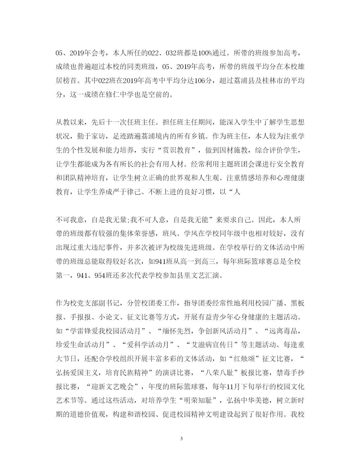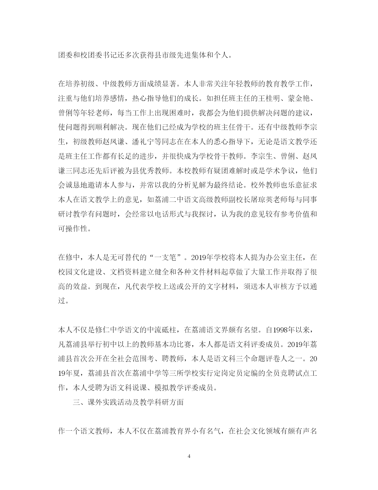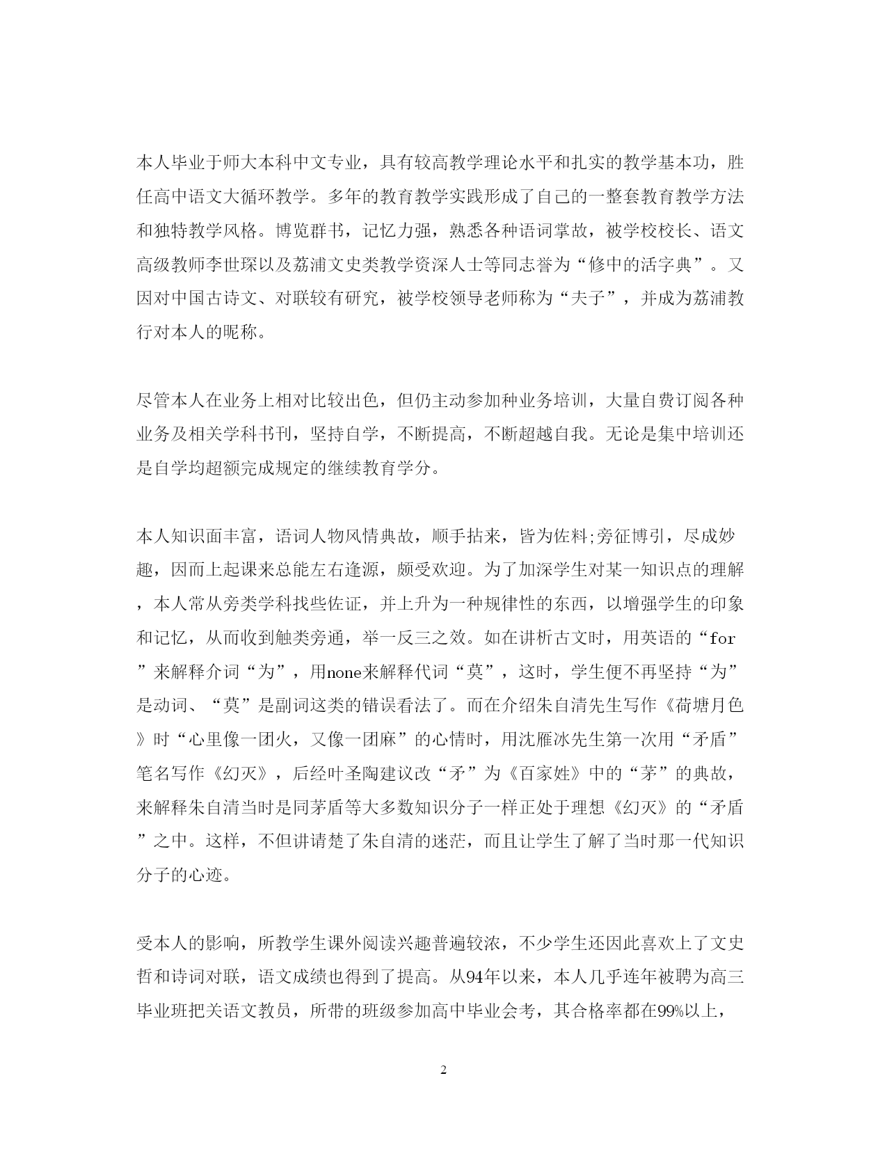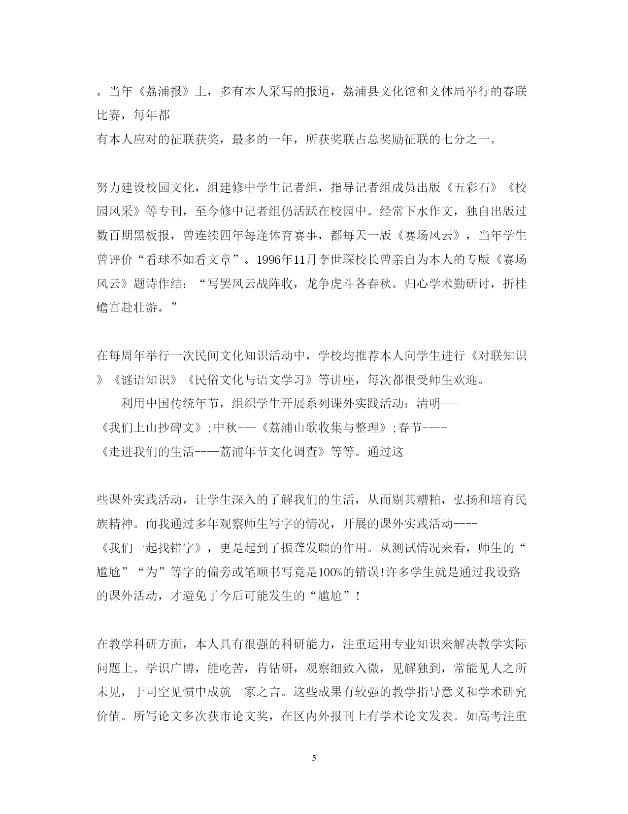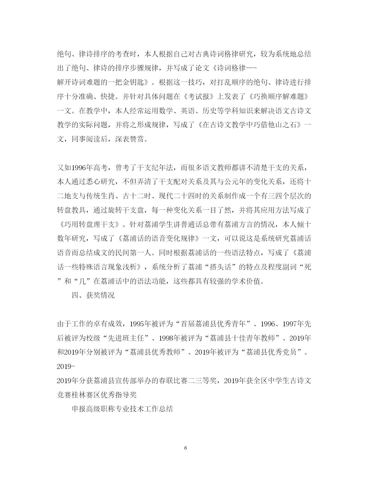 此资料由网络收集而来,如有侵权请告知上传者立即删除。资料共分享,我们负责传递知识。PAGEPAGE10高级职称申报专业技术工作总结申报高级职称专业技术工作总结是我们申报高级职称时必须要写的文稿。下面是小编搜集整理的高级职称申报专业技术工作总结,欢迎阅读。更多资讯请继续关注个人工作总结栏目!申报高级职称专业技术工作总结现将任职以来的工作总结如下:一、思想态度、履行职责方面本人身体健康,对工作热情饱满、兢兢业业,讲求实效、乐于奉献。热爱教育事业,满负荷或超负荷工作。任劳任怨,从不计较个人得失,以一种高度的社会责任感和献身农村高中教育的精神,根植修仁中学,二十年如一日,对学校分给的各项任务毫无怨言并按质按量主动完成,绝少因个人原因而请假误课。除了正常的教育教学外,还经常主动加班加点做好学校的其他工作。为人师表、教书育人,以自己的教育教学效果和人格魅力赢得了广大师生的赞誉。在思想上要求进步,行动上严于律己,使自己从一个普通教师成长为校党支部副书记、副校长。作为分管党务工作和后勤工作的校级领导,注重教师的师德师风教育,全面推行素质教育,积极创设学校精神文化,利用多种形式在师生中开展“八荣八耻”和“学会做人,学会学习、学习做事,学会锻炼”等励志教育和各种安全教育。依法治校,校园文明洁净,从未有过吸毒现象,无人员参与邪教活动,未发生过校园恶性事故,也没有乱收费现象。学校先后被评为县“综合治安治理”先进单位,区“安全文明小区”。二、专业技术工作方面本人毕业于师大本科中文专业,具有较高教学理论水平和扎实的教学基本功,胜任高中语文大循环教学。多年的教育教学实践形成了自己的一整套教育教学方法和独特教学风格。博览群书,记忆力强,熟悉各种语词掌故,被学校校长、语文高级教师李世琛以及荔浦文史类教学资深人士等同志誉为“修中的活字典”。又因对中国古诗文、对联较有研究,被学校领导老师称为“夫子”,并成为荔浦教行对本人的昵称。尽管本人在业务上相对比较出色,但仍主动参加种业务培训,大量自费订阅各种业务及相关学科书刊,坚持自学,不断提高,不断超越自我。无论是集中培训还是自学均超额完成规定的继续教育学分。本人知识面丰富,语词人物风情典故,顺手拈来,皆为佐料;旁征博引,尽成妙趣,因而上起课来总能左右逢源,颇受欢迎。为了加深学生对某一知识点的理解,本人常从旁类学科找些佐证,并上升为一种规律性的东西,以增强学生的印象和记忆,从而收到触类旁通,举一反三之效。如在讲析古文时,用英语的“for”来解释介词“为”,用none来解释代词“莫”,这时,学生便不再坚持“为”是动词、“莫”是副词这类的错误看法了。而在介绍朱自清先生写作《荷塘月色》时“心里像一团火,又像一团麻”的心情时,用沈雁冰先生第一次用“矛盾”笔名写作《幻灭》,后经叶圣陶建议改“矛”为《百家姓》中的“茅”的典故,来解释朱自清当时是同茅盾等大多数知识分子一样正处于理想《幻灭》的“矛盾”之中。这样,不但讲请楚了朱自清的迷茫,而且让学生了解了当时那一代知识分子的心迹。受本人的影响,所教学生课外阅读兴趣普遍较浓,不少学生还因此喜欢上了文史哲和诗词对联,语文成绩也得到了提高。从94年以来,本人几乎连年被聘为高三毕业班把关语文教员,所带的班级参加高中毕业会考,其合格率都在99%以上,05、2019年会考,本人所任的022、032班都是100%通过。所带的班级参加高考,成绩也普遍超过本校的同类班级,05、2019年高考,所带的班级平均分在本校雄居榜首。其中022班在2019年高考中平均分达106分,超过荔浦县及桂林市的平均分,这一成绩在修仁中学也是空前的。从教以来,先后十一次任班主任。担任班主任期间,能深入学生中了解学生思想状况,勤于家访,足迹踏遍荔浦境内的所有乡镇。作为班主任,本人较为注重学生的个性发展和能力培养,实行“赏识教育”,做到因材施教,综合评价学生,让学生都能成为各有所长的社会有用人材。经常利用主题班团会课进行安全教育和团队精神培育,让学生树立正确的世界观和人生观。注重情感培养和心理健康教育,让学生养成严于律己、不断上进的良好习惯,以“人不可我意,自是我无量;我不可人意,自是我无能”来要求自己。因此,本人所带的班级都有较强的集体荣誉感,班风、学风在学校同年级中也相对较好,没有出现过重大违纪事件,并多次被评为校级先进班级。在学校举行的文体活动中所带的班级总能取得较好名次,如941班从高一到高三,每年班际篮球赛总是全校第一,941、954班还多次代表学校参加县里文艺汇演。作为校党支部副书记,分管校团委工作,指导团委经常性地利用校园广播、黑板报、手报报、小论文、征文比赛等方式,开展有益青少年心身健康的主题活动。如“学雷锋爱我校园活动月”、“缅怀先烈,争创新风活动月”、“远离毒品