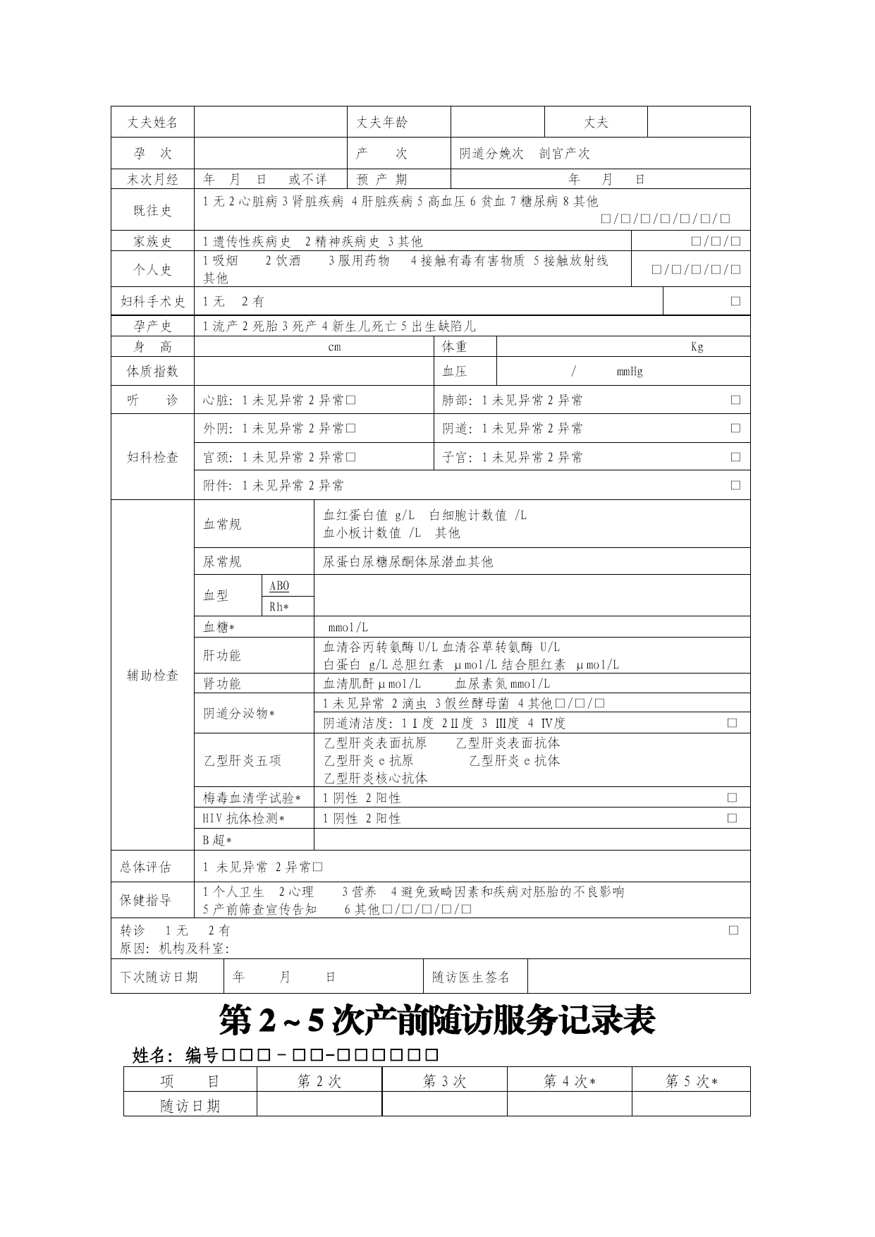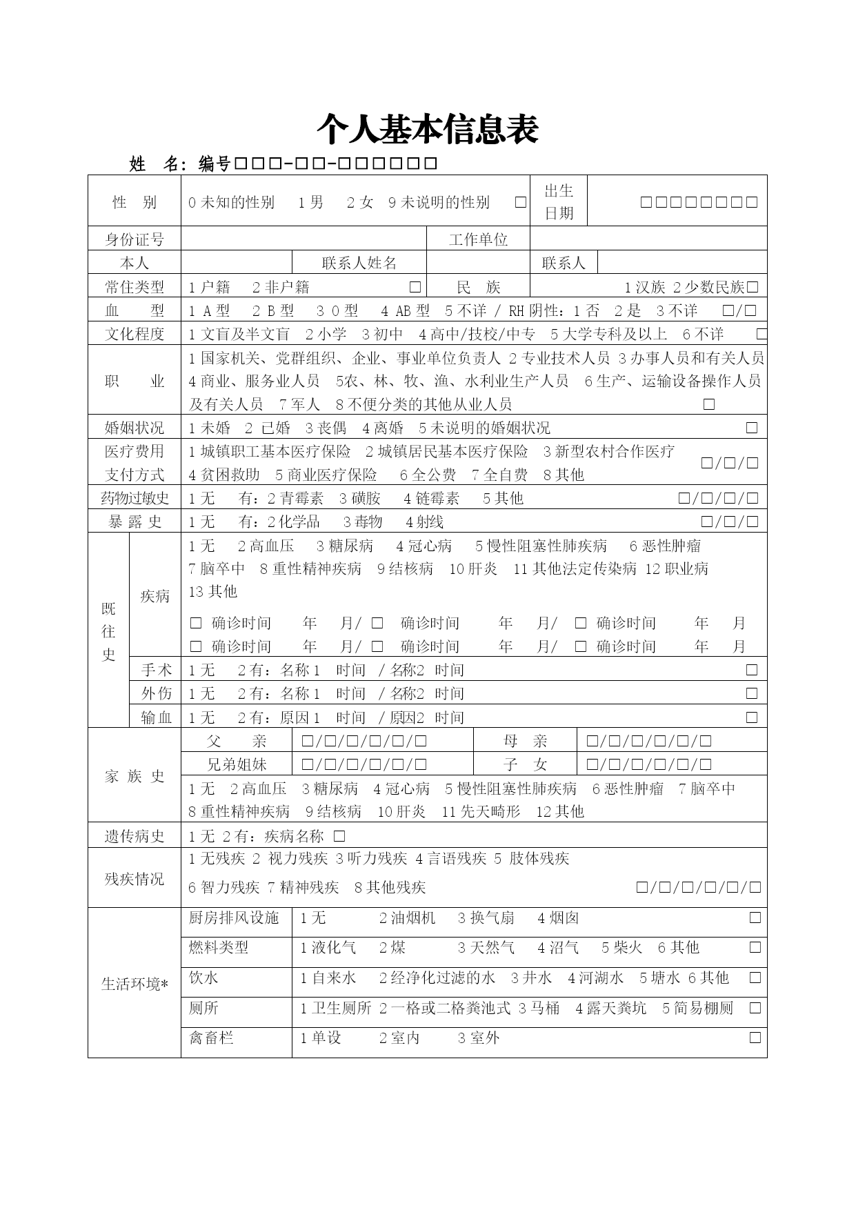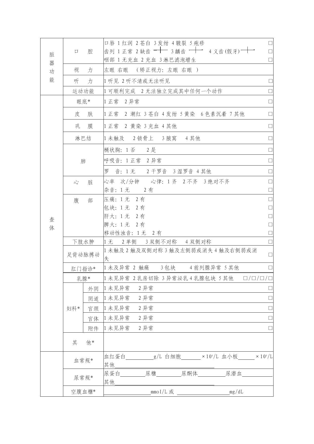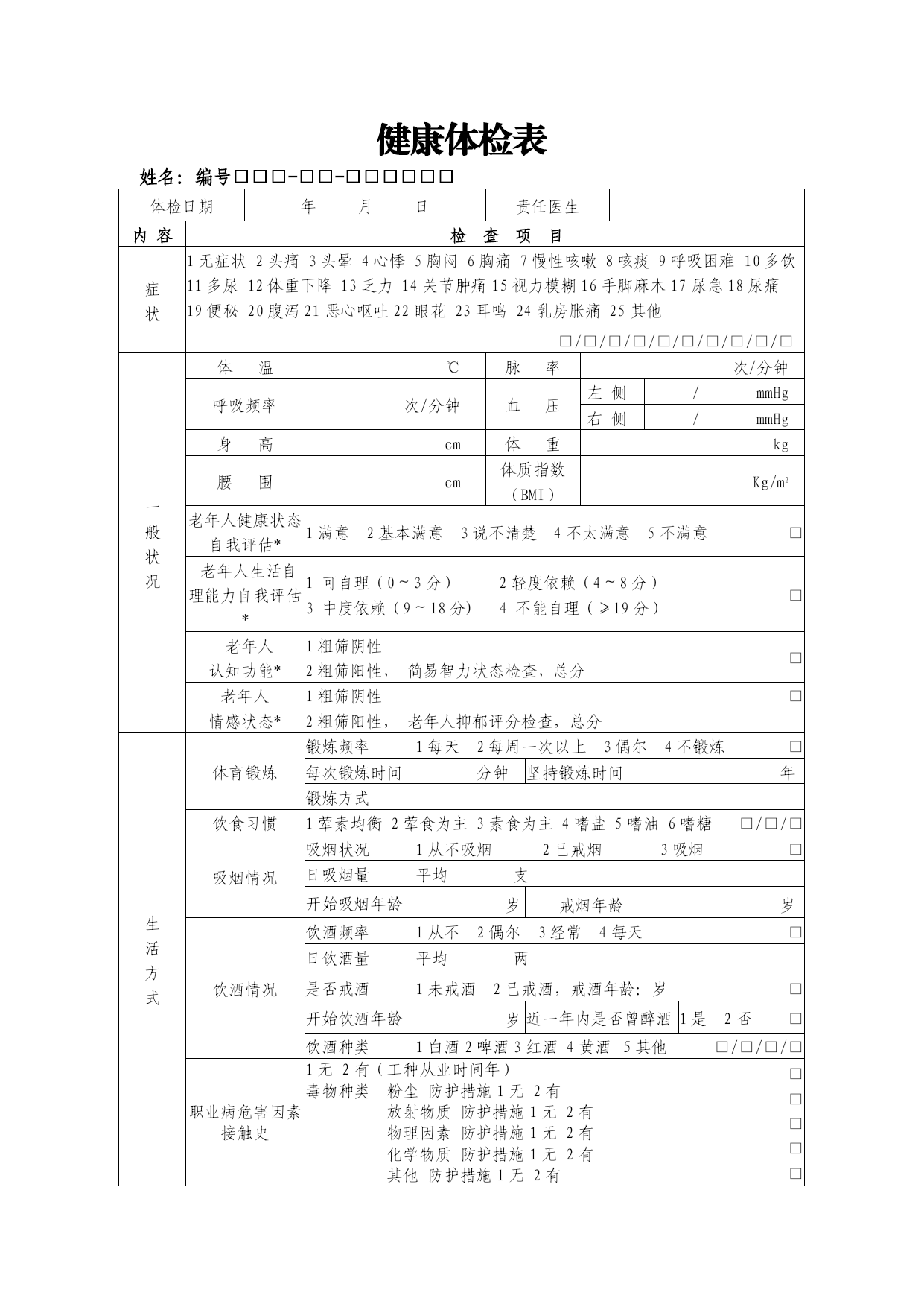 基本公共卫生服务表格优质资料(可以直接使用,可编辑优质资料,欢迎下载)个人基本信息表姓名:编号□□□-□□-□□□□□□性别0未知的性别1男2女9未说明的性别□出生日期□□□□□□□□身份证号工作单位本人联系人姓名联系人常住类型1户籍2非户籍□民族1汉族2少数民族□血型1A型2B型3O型4AB型5不详/RH阴性:1否2是3不详□/□文化程度1文盲及半文盲2小学3初中4高中/技校/中专5大学专科及以上6不详□职业1国家机关、党群组织、企业、事业单位负责人2专业技术人员3办事人员和有关人员4商业、服务业人员5农、林、牧、渔、水利业生产人员6生产、运输设备操作人员及有关人员7军人8不便分类的其他从业人员□婚姻状况1未婚2已婚3丧偶4离婚5未说明的婚姻状况□医疗费用支付方式1城镇职工基本医疗保险2城镇居民基本医疗保险3新型农村合作医疗4贫困救助5商业医疗保险6全公费7全自费8其他□/□/□药物过敏史1无有:2青霉素3磺胺4链霉素5其他□/□/□/□暴露史1无有:2化学品3毒物4射线□/□/□既往史疾病1无2高血压3糖尿病4冠心病5慢性阻塞性肺疾病6恶性肿瘤7脑卒中8重性精神疾病9结核病10肝炎11其他法定传染病12职业病13其他□确诊时间年月/□确诊时间年月/□确诊时间年月□确诊时间年月/□确诊时间年月/□确诊时间年月手术1无2有:名称1时间/名称2时间□外伤1无2有:名称1时间/名称2时间□输血1无2有:原因1时间/原因2时间□家族史父亲□/□/□/□/□/□母亲□/□/□/□/□/□兄弟姐妹□/□/□/□/□/□子女□/□/□/□/□/□1无2高血压3糖尿病4冠心病5慢性阻塞性肺疾病6恶性肿瘤7脑卒中8重性精神疾病9结核病10肝炎11先天畸形12其他遗传病史1无2有:疾病名称□残疾情况1无残疾2视力残疾3听力残疾4言语残疾5肢体残疾6智力残疾7精神残疾8其他残疾□/□/□/□/□/□生活环境*厨房排风设施1无2油烟机3换气扇4烟囱□燃料类型1液化气2煤3天然气4沼气5柴火6其他□饮水1自来水2经净化过滤的水3井水4河湖水5塘水6其他□厕所1卫生厕所2一格或二格粪池式3马桶4露天粪坑5简易棚厕□禽畜栏1单设2室内3室外□健康体检表姓名:编号□□□-□□-□□□□□□体检日期年月日责任医生内容检查项目症状1无症状2头痛3头晕4心悸5胸闷6胸痛7慢性咳嗽8咳痰9呼吸困难10多饮11多尿12体重下降13乏力14关节肿痛15视力模糊16手脚麻木17尿急18尿痛19便秘20腹泻21恶心呕吐22眼花23耳鸣24乳房胀痛25其他□/□/□/□/□/□/□/□/□/□一般状况体温℃脉率次/分钟呼吸频率次/分钟血压左侧/mmHg右侧/mmHg身高cm体重kg腰围cm体质指数(BMI)Kg/m2老年人健康状态自我评估*1满意2基本满意3说不清楚4不太满意5不满意□老年人生活自理能力自我评估*1可自理(0~3分)2轻度依赖(4~8分)3中度依赖(9~18分)4不能自理(≥19分)□老年人认知功能*1粗筛阴性2粗筛阳性,简易智力状态检查,总分□老年人情感状态*1粗筛阴性2粗筛阳性,老年人抑郁评分检查,总分□生活方式体育锻炼锻炼频率1每天2每周一次以上3偶尔4不锻炼□每次锻炼时间分钟坚持锻炼时间年锻炼方式饮食习惯1荤素均衡2荤食为主3素食为主4嗜盐5嗜油6嗜糖□/□/□吸烟情况吸烟状况1从不吸烟2已戒烟3吸烟□日吸烟量平均支开始吸烟年龄岁戒烟年龄岁饮酒情况饮酒频率1从不2偶尔3经常4每天□日饮酒量平均两是否戒酒1未戒酒2已戒酒,戒酒年龄:岁□开始饮酒年龄岁近一年内是否曾醉酒1是2否□饮酒种类1白酒2啤酒3红酒4黄酒5其他□/□/□/□职业病危害因素接触史1无2有(工种从业时间年)毒物种类粉尘防护措施1无2有放射物质防护措施1无2有物理因素防护措施1无2有化学物质防护措施1无2有其他防护措施1无2有□□□□□脏器功能口腔口唇1红润2苍白3发绀4皲裂5疱疹齿列1正常2缺齿3龋齿4义齿(假牙)咽部1无充血2充血3淋巴滤泡增生□□□视力左眼右眼(矫正视力:左眼右眼)听力1听见2听不清或无法听见□运动功能1可顺利完成2无法独立完成其中任何一个动作□查体眼底*1正常2异常□皮肤1正常2潮红3苍白4发绀5黄染6色素沉着7其他□巩膜1正常2黄染3充血4其他□淋巴结1未触及2锁骨上3腋窝4其他□肺桶状胸:1否2是□呼吸音:1正常2异常□罗音:1无2干罗音3湿罗音4其他□心脏心率次/分钟心律:1齐2不齐3绝对不齐杂音:1无2有□□腹部压痛:1无2有包块:1无2有肝大:1无2有脾大:1无2有移动性浊音:1无2有□□□□□下肢水肿1无2单侧3双侧不对称4双侧对称□足背动脉