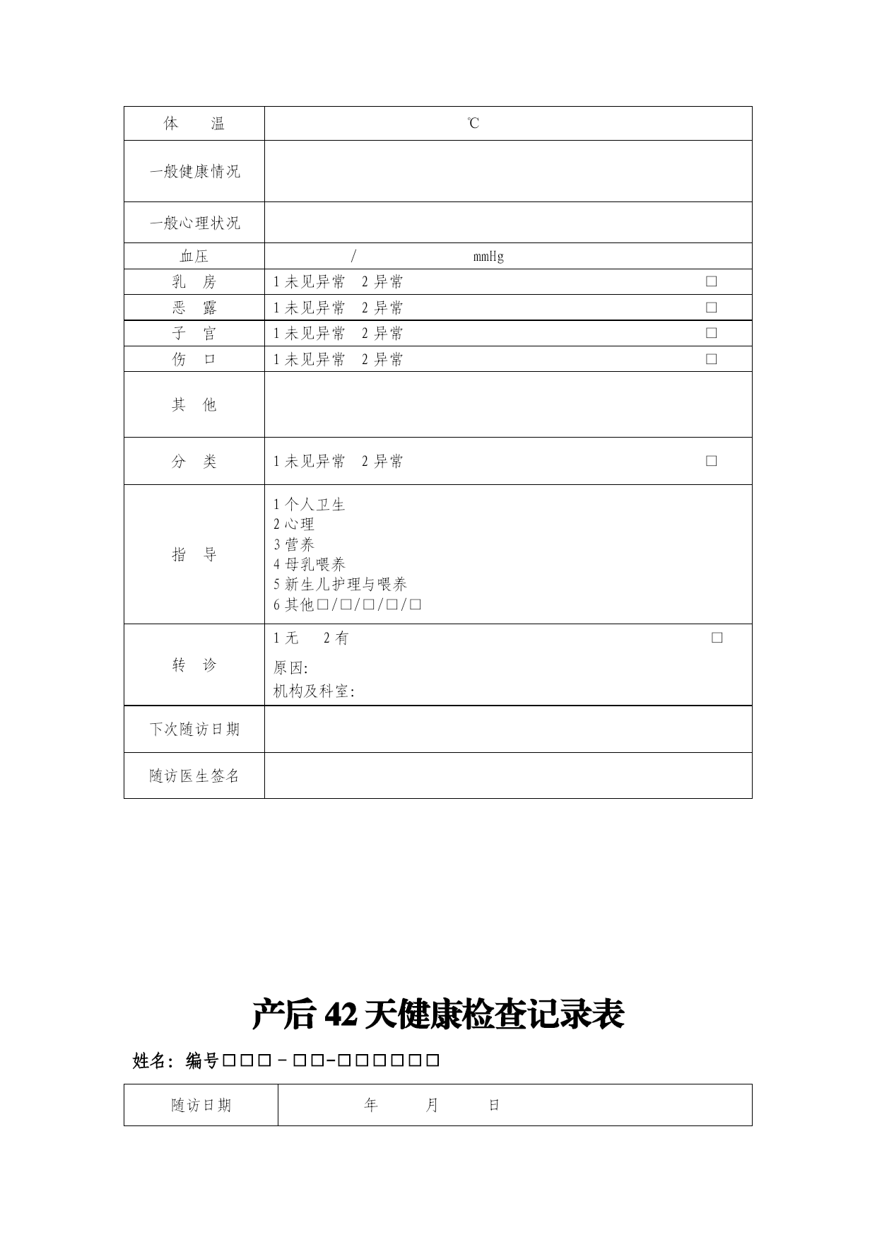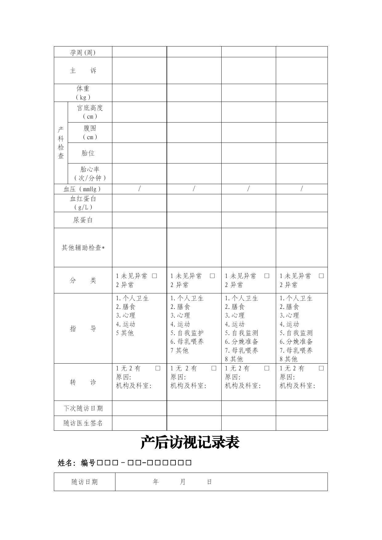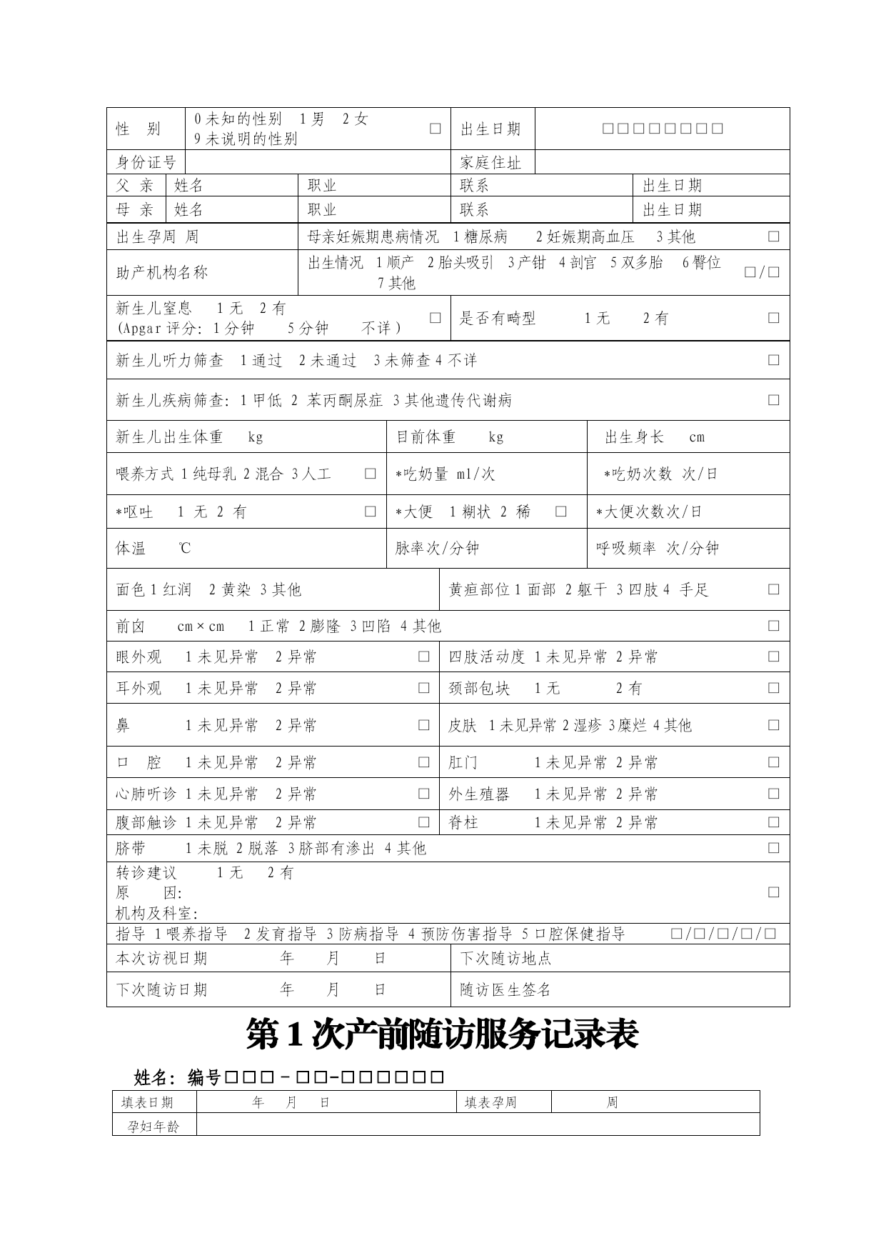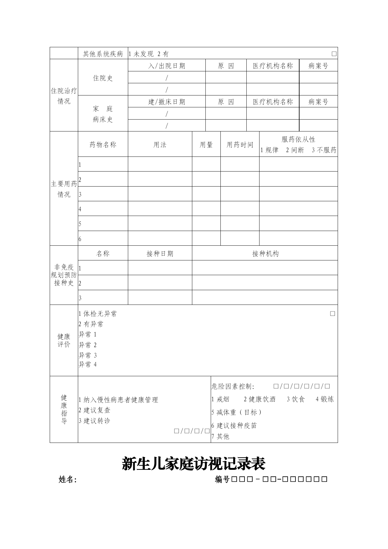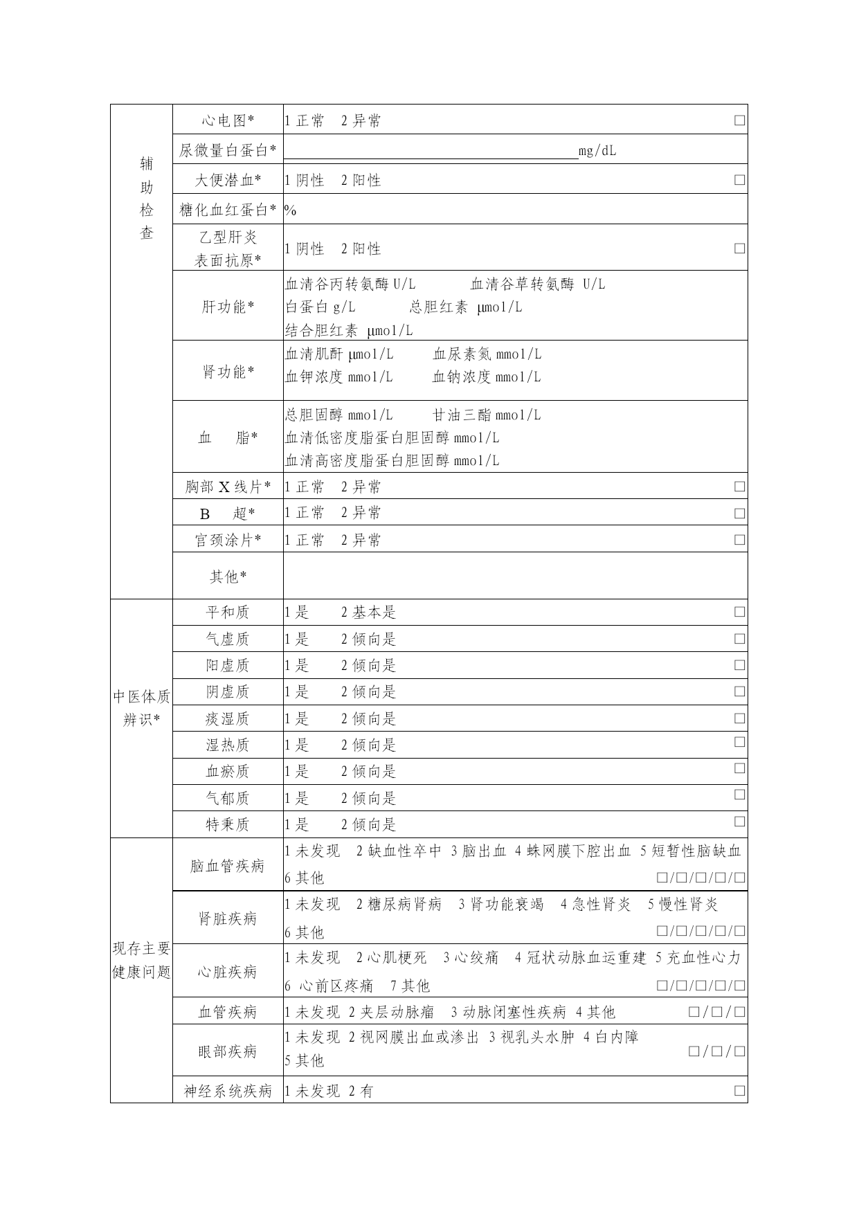 基本公共卫生服务表格优质资料(可以直接使用,可编辑优质资料,欢迎下载)个人基本信息表姓名:编号□□□-□□-□□□□□□性别0未知的性别1男2女9未说明的性别□出生日期□□□□□□□□身份证号工作单位本人联系人姓名联系人常住类型1户籍2非户籍□民族1汉族2少数民族□血型1A型2B型3O型4AB型5不详/RH阴性:1否2是3不详□/□文化程度1文盲及半文盲2小学3初中4高中/技校/中专5大学专科及以上6不详□职业1国家机关、党群组织、企业、事业单位负责人2专业技术人员3办事人员和有关人员4商业、服务业人员5农、林、牧、渔、水利业生产人员6生产、运输设备操作人员及有关人员7军人8不便分类的其他从业人员□婚姻状况1未婚2已婚3丧偶4离婚5未说明的婚姻状况□医疗费用支付方式1城镇职工基本医疗保险2城镇居民基本医疗保险3新型农村合作医疗4贫困救助5商业医疗保险6全公费7全自费8其他□/□/□药物过敏史1无有:2青霉素3磺胺4链霉素5其他□/□/□/□暴露史1无有:2化学品3毒物4射线□/□/□既往史疾病1无2高血压3糖尿病4冠心病5慢性阻塞性肺疾病6恶性肿瘤7脑卒中8重性精神疾病9结核病10肝炎11其他法定传染病12职业病13其他□确诊时间年月/□确诊时间年月/□确诊时间年月□确诊时间年月/□确诊时间年月/□确诊时间年月手术1无2有:名称1时间/名称2时间□外伤1无2有:名称1时间/名称2时间□输血1无2有:原因1时间/原因2时间□家族史父亲□/□/□/□/□/□母亲□/□/□/□/□/□兄弟姐妹□/□/□/□/□/□子女□/□/□/□/□/□1无2高血压3糖尿病4冠心病5慢性阻塞性肺疾病6恶性肿瘤7脑卒中8重性精神疾病9结核病10肝炎11先天畸形12其他遗传病史1无2有:疾病名称□残疾情况1无残疾2视力残疾3听力残疾4言语残疾5肢体残疾6智力残疾7精神残疾8其他残疾□/□/□/□/□/□生活环境*厨房排风设施1无2油烟机3换气扇4烟囱□燃料类型1液化气2煤3天然气4沼气5柴火6其他□饮水1自来水2经净化过滤的水3井水4河湖水5塘水6其他□厕所1卫生厕所2一格或二格粪池式3马桶4露天粪坑5简易棚厕□禽畜栏1单设2室内3室外□健康体检表姓名:编号□□□-□□-□□□□□□体检日期年月日责任医生内容检查项目症状1无症状2头痛3头晕4心悸5胸闷6胸痛7慢性咳嗽8咳痰9呼吸困难10多饮11多尿12体重下降13乏力14关节肿痛15视力模糊16手脚麻木17尿急18尿痛19便秘20腹泻21恶心呕吐22眼花23耳鸣24乳房胀痛25其他□/□/□/□/□/□/□/□/□/□一般状况体温℃脉率次/分钟呼吸频率次/分钟血压左侧/mmHg右侧/mmHg身高cm体重kg腰围cm体质指数(BMI)Kg/m2老年人健康状态自我评估*1满意2基本满意3说不清楚4不太满意5不满意□老年人生活自理能力自我评估*1可自理(0~3分)2轻度依赖(4~8分)3中度依赖(9~18分)4不能自理(≥19分)□老年人认知功能*1粗筛阴性2粗筛阳性,简易智力状态检查,总分□老年人情感状态*1粗筛阴性2粗筛阳性,老年人抑郁评分检查,总分□生活方式体育锻炼锻炼频率1每天2每周一次以上3偶尔4不锻炼□每次锻炼时间分钟坚持锻炼时间年锻炼方式饮食习惯1荤素均衡2荤食为主3素食为主4嗜盐5嗜油6嗜糖□/□/□吸烟情况吸烟状况1从不吸烟2已戒烟3吸烟□日吸烟量平均支开始吸烟年龄岁戒烟年龄岁饮酒情况饮酒频率1从不2偶尔3经常4每天□日饮酒量平均两是否戒酒1未戒酒2已戒酒,戒酒年龄:岁□开始饮酒年龄岁近一年内是否曾醉酒1是2否□饮酒种类1白酒2啤酒3红酒4黄酒5其他□/□/□/□职业病危害因素接触史1无2有(工种从业时间年)毒物种类粉尘防护措施1无2有放射物质防护措施1无2有物理因素防护措施1无2有化学物质防护措施1无2有其他防护措施1无2有□□□□□脏器功能口腔口唇1红润2苍白3发绀4皲裂5疱疹齿列1正常2缺齿3龋齿4义齿(假牙)咽部1无充血2充血3淋巴滤泡增生□□□视力左眼右眼(矫正视力:左眼右眼)听力1听见2听不清或无法听见□运动功能1可顺利完成2无法独立完成其中任何一个动作□查体眼底*1正常2异常□皮肤1正常2潮红3苍白4发绀5黄染6色素沉着7其他□巩膜1正常2黄染3充血4其他□淋巴结1未触及2锁骨上3腋窝4其他□肺桶状胸:1否2是□呼吸音:1正常2异常□罗音:1无2干罗音3湿罗音4其他□心脏心率次/分钟心律:1齐2不齐3绝对不齐杂音:1无2有□□腹部压痛:1无2有包块:1无2有肝大:1无2有脾大:1无2有移动性浊音:1无2有□□□□□下肢水肿1无2单侧3双侧不对称4双侧对称□足背动脉