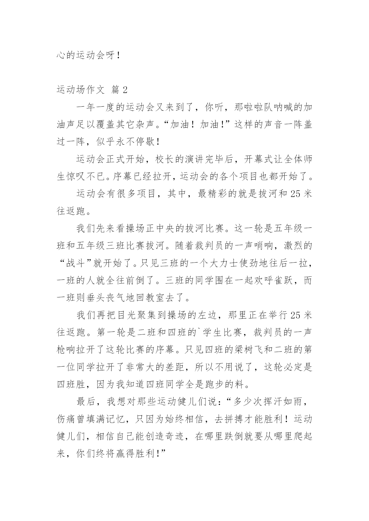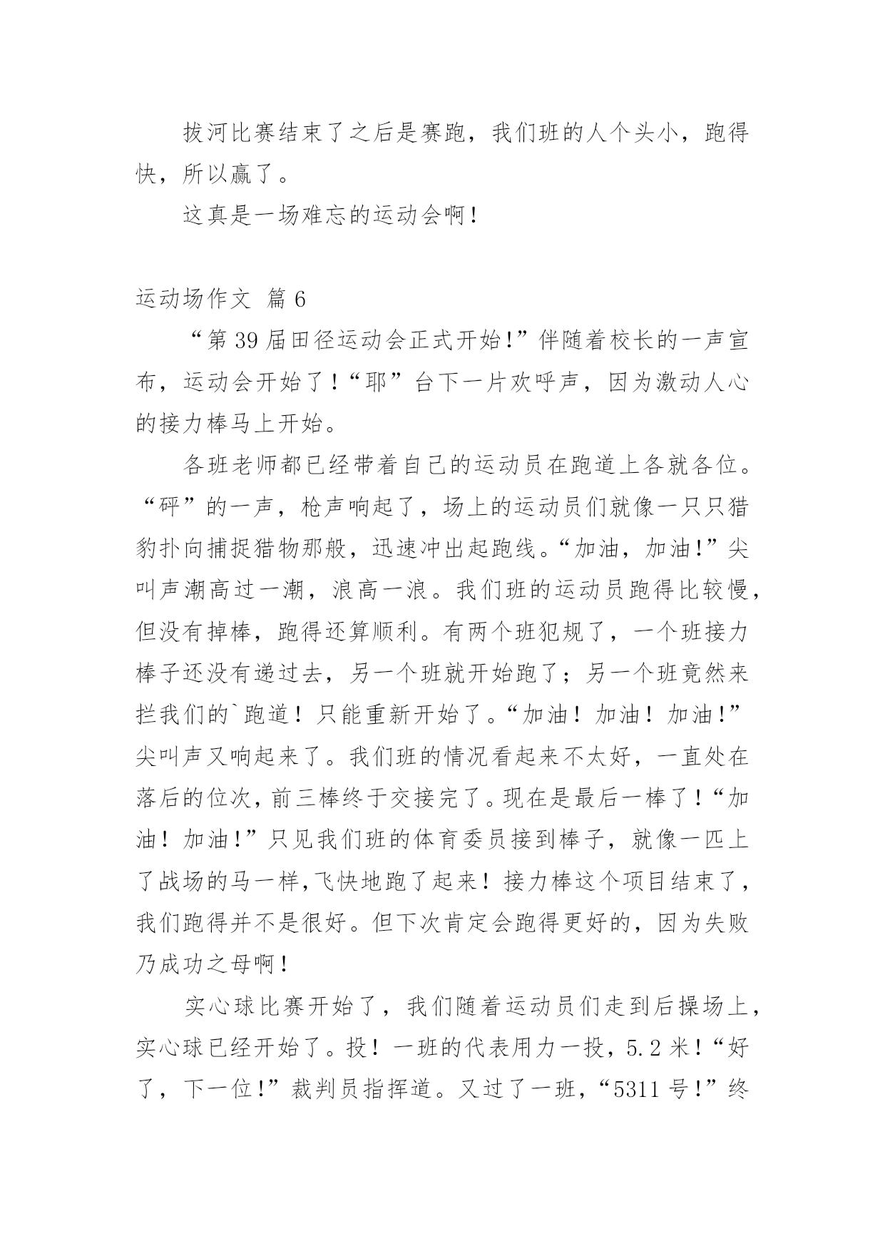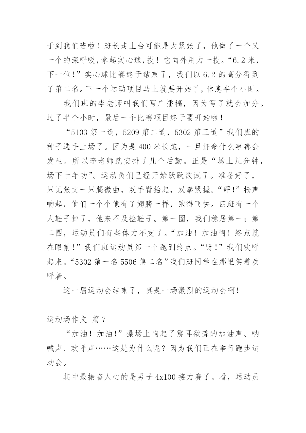 运动场作文运动场作文(精选)在学习、工作或生活中,大家都写过作文吧,借助作文人们可以反映客观事物、表达思想感情、传递知识信息。相信写作文是一个让许多人都头痛的问题,以下是小编帮大家整理的运动场作文7篇,欢迎阅读与收藏。运动场作文篇1“明天可以去看姐姐那举行运动会。”妈妈说完就去厨房做菜,留下我和姐姐。顿时房间里紧张起来起来了,姐姐说自己跑的有时快有时慢;姐姐说她们班的陈瑜可以跳得很远;这时姐姐说有一个人他叫朱明,他说:我呀要参加赛跑,因为我跑得“飞快”,“嗖”的一声跑完一圈,树上的叶子肯定全落光了。”这句话逗得我哈哈大笑。为了参加运动会同学们早早就来到学校,同学们有的春风满面,有的精神抖擞,有的有些紧张……老师走进教室宣布了参加各项比赛的同学名单,并且带领我们来到操场上,她让同学们先练习一下,并做好比赛准备,同学们有的练跳高,有的练跑步,有的练垒球,还有的练跳绳……此时的运动场上既高兴又紧张。比赛开始了,参加比赛的同学都回到了各自的赛场上,其他同学有的在鼓励的、有的在为同学打气的、有的在喊加油的,一个比一个喊的有劲,会场上真是热闹非凡。拉拉队同学给自己班参加运动会的同学增加了十足的信心看,这边是比赛赛跑的.,同学们跑得像一只只飞奔的兔子,那边是比赛实心球的,同学们一个比一个扔得远,远处是比赛跳远的一个个好象跳得身轻如燕,竞争好激烈!每个同学都使出自己最强的一面。终于等到下午的接力赛了,姐姐她们全班同学排好队进入会场,老师把接力棒交给了各班的第一位同学,只听一声发令枪响,同学们像射出的弓箭一样冲出起跑线,同学们你来我往地传递着手中的接力棒,快轮到姐姐了,我的心像小鹿一样跳得快,觉得姐姐会成功吗?姐姐伸手紧紧抓住木棒,飞快地跑了起来,渐渐地姐姐超过了跑在前面的同学,快传棒了,姐姐把手伸得长长的,将木棒迅速交给对面的同学,“终于成功了!姐姐没有给她们班拖后腿。”我和姐姐高兴极了!运动会终于结束了,回到教室,老师满面笑容地告诉姐姐她们:“我们班的接力赛赢得了第一名!”“太棒了”同学们欢呼雀跃。她们们调整好状态后,老师说:“要去操场参加最后的仪式,顺便总结整场运动会各班的总分数。”到了操场后,知道他们的分数是74分,是第2名,与第一名差了几分而已。太可惜了!不过这次运动会的成绩比以往的成绩好多了!虽然这不是我们班参加但是我要说这真是一场激动人心的运动会呀!运动场作文篇2一年一度的运动会又来到了,你听,那啦啦队呐喊的加油声足以覆盖其它杂声。“加油!加油!”这样的声音一阵盖过一阵,似乎永不停歇!运动会正式开始,校长的演讲完毕后,开幕式让全体师生惊叹不已。序幕已经拉开,运动会的各个项目也都开始了。运动会有很多项目,其中,最精彩的就是拔河和25米往返跑。我们先来看操场正中央的拔河比赛。这一轮是五年级一班和五年级三班比赛拔河。随着裁判员的一声哨响,激烈的“战斗”就开始了。只见三班的一个大力士使劲地往后一拉,一班的人就全往前倒了。三班的同学围在一起欢呼雀跃,而一班则垂头丧气地回教室去了。我们再把目光聚集到操场的左边,那里正在举行25米往返跑。第一轮是二班和四班的`学生比赛,裁判员的一声枪响拉开了这轮比赛的序幕。只见四班的梁树飞和二班的第一位同学拉开了非常大的差距,所以不用说了,这轮必定是四班胜,因为我知道四班同学全是跑步的料。最后,我想对那些运动健儿们说:“多少次挥汗如雨,伤痛曾填满记忆,只因为始终相信,去拼搏才能胜利!运动健儿们,相信自己能创造奇迹,在哪里跌倒就要从哪里爬起来,你们终将赢得胜利!”运动场作文篇3俗话说:生命在于运动。因此,小主人报新闻学校为了丰富小记者们的学习生活,精心举办了一场别开生面的运动会。我毫不犹豫地报名参加了。10月26日,天气很好。灿烂的阳光照向大地,撒下金色的光芒。小记者们相聚在师院的足球场上,开始了我们精彩的游戏。第一个游戏是大力士的强项--运转乾坤。虽然这个项目是家长参加的,但是我们却一刻也没闲着,一直在为他们呐喊助威。最终,在我们的一片欢声笑语中结束了这个游戏。紧接着的'游戏则到了小记者们大展身手的时刻--疯狂毛毛虫。大家分为三小队,我是第三小队的成员。开始前,我们小队还制定了一个临时比赛计划。我心里暗暗下决心:一定要为我们队的胜利而努力。在傅傅老师的一声令下,游戏开始了。我卯足全力,一路前进。经过“遥远”的一段距离后我们小队终于以第二名的成绩到达终点。我因为有事情所以遗憾提前结束了运动会。虽然没有和好伙伴们一起欢乐到底,但是我相信:所有参加运动会的小记者和家长们都在运动中增加了感情、感受到快乐。运动场作文篇4期中考试前,老师会疯狂地布置作业、抄题目……不过,我觉得最痛苦的还是考试时。期中考试开始了,我的"心脏运动会"也就开幕了——运动会开幕时间:早晨8:30比赛项目:拳击唉,又要考试了!我无精打采地走进教