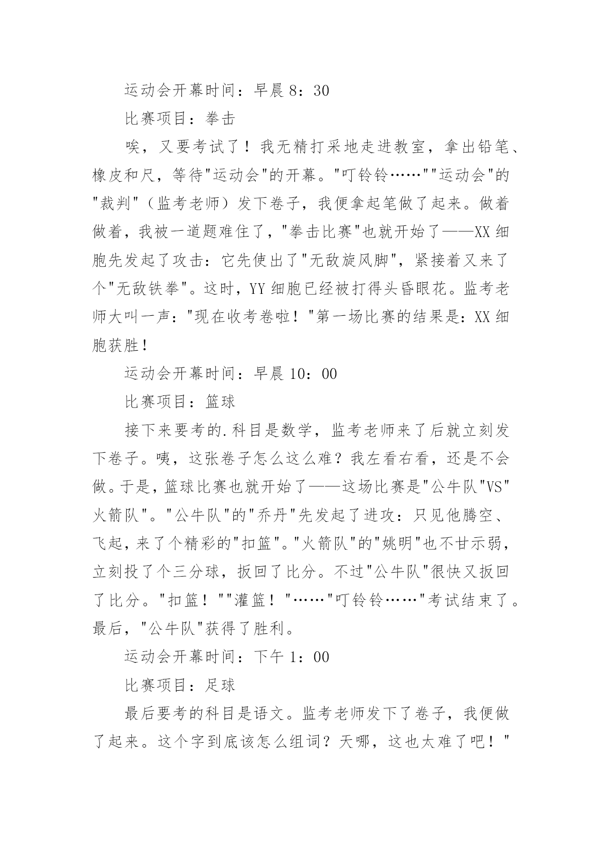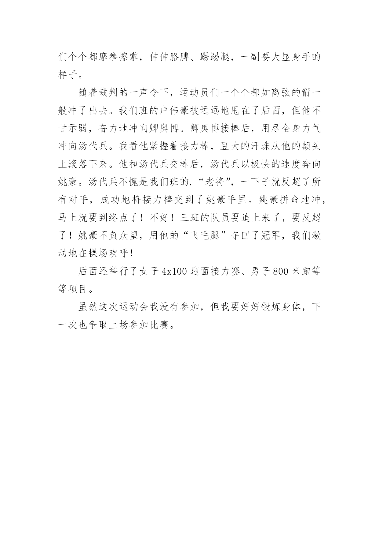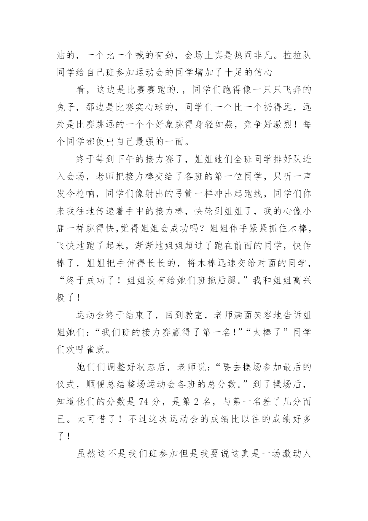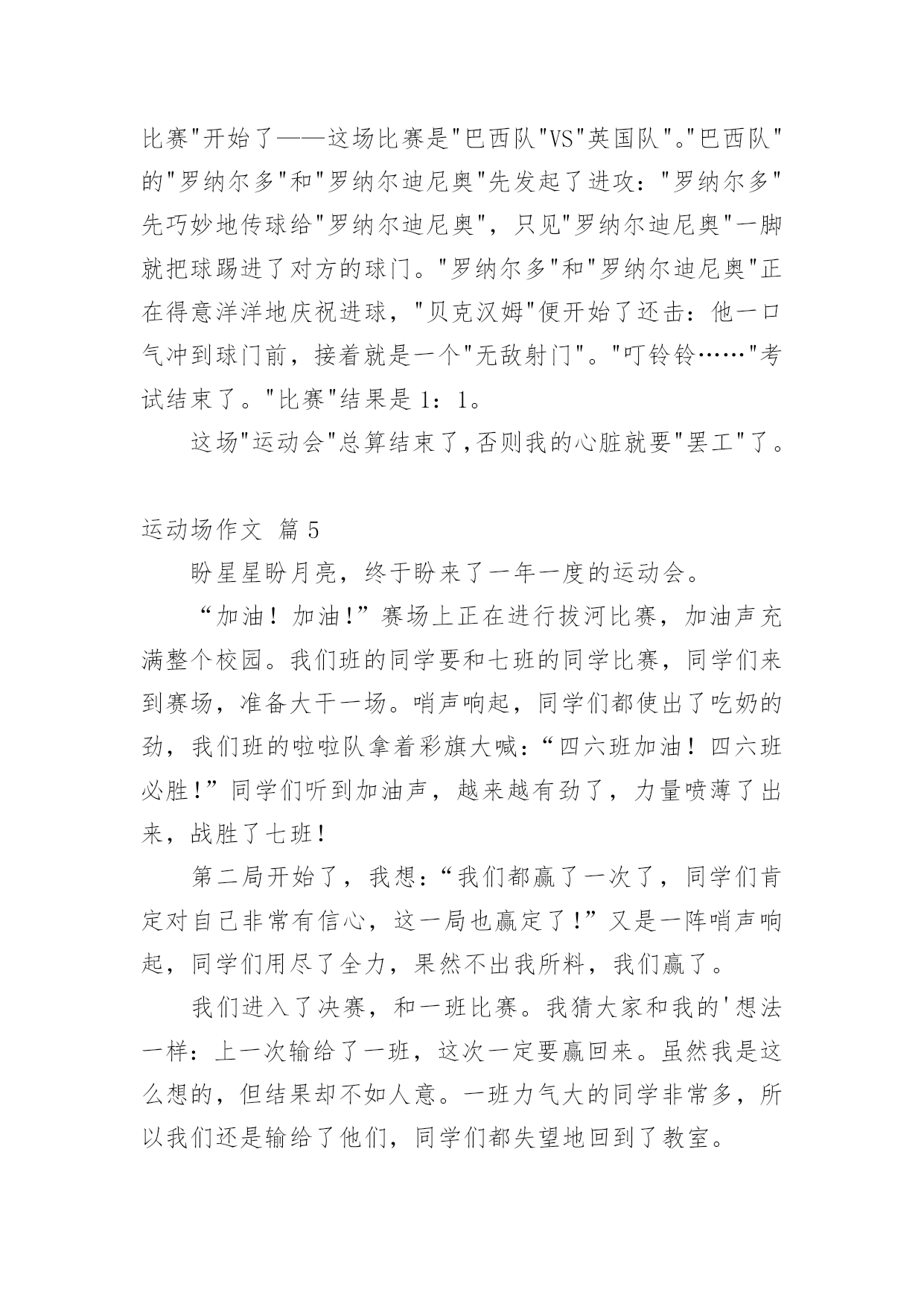 运动场作文运动场作文(精选)在学习、工作或生活中,大家都写过作文吧,借助作文人们可以反映客观事物、表达思想感情、传递知识信息。相信写作文是一个让许多人都头痛的问题,以下是小编帮大家整理的运动场作文7篇,欢迎阅读与收藏。运动场作文篇1“明天可以去看姐姐那举行运动会。”妈妈说完就去厨房做菜,留下我和姐姐。顿时房间里紧张起来起来了,姐姐说自己跑的有时快有时慢;姐姐说她们班的陈瑜可以跳得很远;这时姐姐说有一个人他叫朱明,他说:我呀要参加赛跑,因为我跑得“飞快”,“嗖”的一声跑完一圈,树上的叶子肯定全落光了。”这句话逗得我哈哈大笑。为了参加运动会同学们早早就来到学校,同学们有的春风满面,有的精神抖擞,有的有些紧张……老师走进教室宣布了参加各项比赛的同学名单,并且带领我们来到操场上,她让同学们先练习一下,并做好比赛准备,同学们有的练跳高,有的练跑步,有的练垒球,还有的练跳绳……此时的运动场上既高兴又紧张。比赛开始了,参加比赛的同学都回到了各自的赛场上,其他同学有的在鼓励的、有的在为同学打气的、有的在喊加油的,一个比一个喊的有劲,会场上真是热闹非凡。拉拉队同学给自己班参加运动会的同学增加了十足的信心看,这边是比赛赛跑的.,同学们跑得像一只只飞奔的兔子,那边是比赛实心球的,同学们一个比一个扔得远,远处是比赛跳远的一个个好象跳得身轻如燕,竞争好激烈!每个同学都使出自己最强的一面。终于等到下午的接力赛了,姐姐她们全班同学排好队进入会场,老师把接力棒交给了各班的第一位同学,只听一声发令枪响,同学们像射出的弓箭一样冲出起跑线,同学们你来我往地传递着手中的接力棒,快轮到姐姐了,我的心像小鹿一样跳得快,觉得姐姐会成功吗?姐姐伸手紧紧抓住木棒,飞快地跑了起来,渐渐地姐姐超过了跑在前面的同学,快传棒了,姐姐把手伸得长长的,将木棒迅速交给对面的同学,“终于成功了!姐姐没有给她们班拖后腿。”我和姐姐高兴极了!运动会终于结束了,回到教室,老师满面笑容地告诉姐姐她们:“我们班的接力赛赢得了第一名!”“太棒了”同学们欢呼雀跃。她们们调整好状态后,老师说:“要去操场参加最后的仪式,顺便总结整场运动会各班的总分数。”到了操场后,知道他们的分数是74分,是第2名,与第一名差了几分而已。太可惜了!不过这次运动会的成绩比以往的成绩好多了!虽然这不是我们班参加但是我要说这真是一场激动人心的运动会呀!运动场作文篇2一年一度的运动会又来到了,你听,那啦啦队呐喊的加油声足以覆盖其它杂声。“加油!加油!”这样的声音一阵盖过一阵,似乎永不停歇!运动会正式开始,校长的演讲完毕后,开幕式让全体师生惊叹不已。序幕已经拉开,运动会的各个项目也都开始了。运动会有很多项目,其中,最精彩的就是拔河和25米往返跑。我们先来看操场正中央的拔河比赛。这一轮是五年级一班和五年级三班比赛拔河。随着裁判员的一声哨响,激烈的“战斗”就开始了。只见三班的一个大力士使劲地往后一拉,一班的人就全往前倒了。三班的同学围在一起欢呼雀跃,而一班则垂头丧气地回教室去了。我们再把目光聚集到操场的左边,那里正在举行25米往返跑。第一轮是二班和四班的`学生比赛,裁判员的一声枪响拉开了这轮比赛的序幕。只见四班的梁树飞和二班的第一位同学拉开了非常大的差距,所以不用说了,这轮必定是四班胜,因为我知道四班同学全是跑步的料。最后,我想对那些运动健儿们说:“多少次挥汗如雨,伤痛曾填满记忆,只因为始终相信,去拼搏才能胜利!运动健儿们,相信自己能创造奇迹,在哪里跌倒就要从哪里爬起来,你们终将赢得胜利!”运动场作文篇3俗话说:生命在于运动。因此,小主人报新闻学校为了丰富小记者们的学习生活,精心举办了一场别开生面的运动会。我毫不犹豫地报名参加了。10月26日,天气很好。灿烂的阳光照向大地,撒下金色的光芒。小记者们相聚在师院的足球场上,开始了我们精彩的游戏。第一个游戏是大力士的强项--运转乾坤。虽然这个项目是家长参加的,但是我们却一刻也没闲着,一直在为他们呐喊助威。最终,在我们的一片欢声笑语中结束了这个游戏。紧接着的'游戏则到了小记者们大展身手的时刻--疯狂毛毛虫。大家分为三小队,我是第三小队的成员。开始前,我们小队还制定了一个临时比赛计划。我心里暗暗下决心:一定要为我们队的胜利而努力。在傅傅老师的一声令下,游戏开始了。我卯足全力,一路前进。经过“遥远”的一段距离后我们小队终于以第二名的成绩到达终点。我因为有事情所以遗憾提前结束了运动会。虽然没有和好伙伴们一起欢乐到底,但是我相信:所有参加运动会的小记者和家长们都在运动中增加了感情、感受到快乐。运动场作文篇4期中考试前,老师会疯狂地布置作业、抄题目……不过,我觉得最痛苦的还是考试时。期中考试开始了,我的"心脏运动会"也就开幕了——运动会开幕时间:早晨8:30比赛项目:拳击唉,又要考试了!我无精打采地走进教