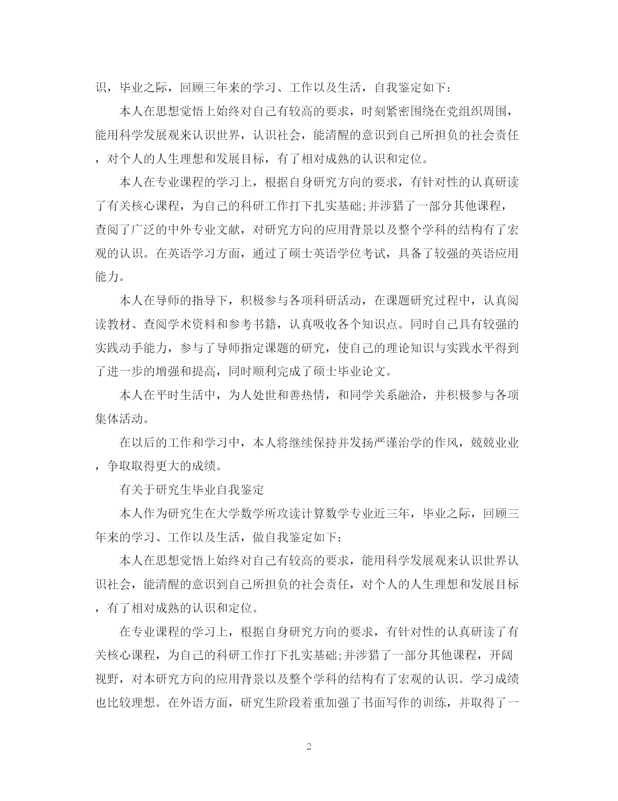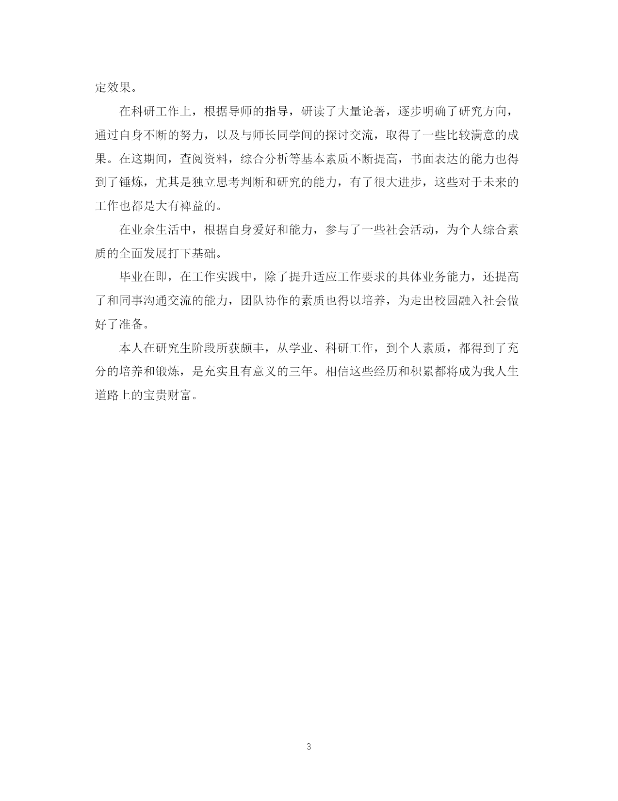 此资料由网络收集而来,如有侵权请告知上传者立即删除。资料共分享,我们负责传递知识。PAGEPAGE32020年应届研究生毕业自我鉴定研究生毕业登记表自我鉴定该怎么写呢?研究生毕业登记表自我鉴定范文有哪些呢,下面小编就给大家来整理了写作指导,有兴趣的的要来阅读哦研究生毕业登记表自我鉴定本人在硕士研究生学习阶段,思想上要求上进,认真学习,努力钻研专业知识,毕业之际,回顾三年来的学习、工作以及生活,自我鉴定如下:本人在思想觉悟上始终对自己有较高的要求,时刻紧密围绕在党组织周围,能用科学发展观来认识世界,认识社会,能清醒的意识到自己所担负的社会责任,对个人的人生理想和发展目标,有了相对成熟的认识和定位。本人在专业课程的学习上,根据自身研究方向的要求,有针对性的认真研读了有关核心课程,为自己的科研工作打下扎实基础;并涉猎了一部分其他课程,查阅了广泛的中外专业文献,对研究方向的应用背景以及整个学科的结构有了宏观的认识。在英语学习方面,通过了硕士英语学位考试,具备了较强的英语应用能力。本人在导师的指导下,积极参与各项科研活动,在课题研究过程中,认真阅读教材、查阅学术资料和参考书籍,认真吸收各个知识点。同时自己具有较强的实践动手能力,参与了导师指定课题的研究,使自己的理论知识与实践水平得到了进一步的增强和提高,同时顺利完成了硕士毕业论文。本人在平时生活中,为人处世和善热情,和同学关系融洽,并积极参与各项集体活动。本人在研究生阶段所获颇丰,从学业、科研工作,到个人素质,都得到了充分的培养和锻炼,是充实且有意义的三年。相信这些经历和积累都将成为本人人生道路上的宝贵财富。在以后的工作和学习中,本人将继续保持并发扬严谨治学的作风,兢兢业业,争取取得更大的成绩。研究生毕业自我鉴定范文参考本人在硕士研究生学习阶段,思想上要求上进,认真学习,努力钻研专业知识,毕业之际,回顾三年来的学习、工作以及生活,自我鉴定如下:本人在思想觉悟上始终对自己有较高的要求,时刻紧密围绕在党组织周围,能用科学发展观来认识世界,认识社会,能清醒的意识到自己所担负的社会责任,对个人的人生理想和发展目标,有了相对成熟的认识和定位。本人在专业课程的学习上,根据自身研究方向的要求,有针对性的认真研读了有关核心课程,为自己的科研工作打下扎实基础;并涉猎了一部分其他课程,查阅了广泛的中外专业文献,对研究方向的应用背景以及整个学科的结构有了宏观的认识。在英语学习方面,通过了硕士英语学位考试,具备了较强的英语应用能力。本人在导师的指导下,积极参与各项科研活动,在课题研究过程中,认真阅读教材、查阅学术资料和参考书籍,认真吸收各个知识点。同时自己具有较强的实践动手能力,参与了导师指定课题的研究,使自己的理论知识与实践水平得到了进一步的增强和提高,同时顺利完成了硕士毕业论文。本人在平时生活中,为人处世和善热情,和同学关系融洽,并积极参与各项集体活动。在以后的工作和学习中,本人将继续保持并发扬严谨治学的作风,兢兢业业,争取取得更大的成绩。有关于研究生毕业自我鉴定本人作为研究生在大学数学所攻读计算数学专业近三年,毕业之际,回顾三年来的学习、工作以及生活,做自我鉴定如下:本人在思想觉悟上始终对自己有较高的要求,能用科学发展观来认识世界认识社会,能清醒的意识到自己所担负的社会责任,对个人的人生理想和发展目标,有了相对成熟的认识和定位。在专业课程的学习上,根据自身研究方向的要求,有针对性的认真研读了有关核心课程,为自己的科研工作打下扎实基础;并涉猎了一部分其他课程,开阔视野,对本研究方向的应用背景以及整个学科的结构有了宏观的认识。学习成绩也比较理想。在外语方面,研究生阶段着重加强了书面写作的训练,并取得了一定效果。在科研工作上,根据导师的指导,研读了大量论著,逐步明确了研究方向,通过自身不断的努力,以及与师长同学间的探讨交流,取得了一些比较满意的成果。在这期间,查阅资料,综合分析等基本素质不断提高,书面表达的能力也得到了锤炼,尤其是独立思考判断和研究的能力,有了很大进步,这些对于未来的工作也都是大有裨益的。在业余生活中,根据自身爱好和能力,参与了一些社会活动,为个人综合素质的全面发展打下基础。毕业在即,在工作实践中,除了提升适应工作要求的具体业务能力,还提高了和同事沟通交流的能力,团队协作的素质也得以培养,为走出校园融入社会做好了准备。本人在研究生阶段所获颇丰,从学业、科研工作,到个人素质,都得到了充分的培养和锻炼,是充实且有意义的三年。相信这些经历和积累都将成为我人生道路上的宝贵财富。