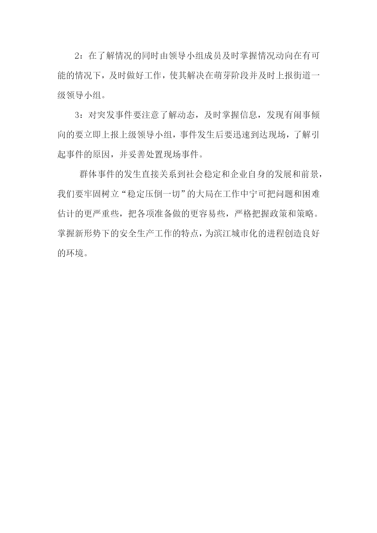 江三社区突发公共事件总体应急救援预案为及时有效的处置各类本社区社会稳定的群体性突发事件,维护本社区社会政治稳定。为社务经济个各项发展营造良好的社会环境结合本社区实际,特制度本方案。一:指导思想以邓小平理论和“三个代表”重要思想为指导,认真贯彻上级关于切实做好安全生产的指示精神,充分发挥党的政治优势,认真贯彻落实安全工作,维护本社区的稳定。二:适用范围1:因人为而引起的企业工伤事故,道路交通、建筑质量安全事故、危险品泄漏等事故事件。2:对刑事案件、火灾事故、环境污染、土地、水利等引发的突发事件。3:对其他引起的各类突发性事件。三:组织领导组长:孔先忠副组长:何国祥成员:傅幼刚、张伟江、来国梅、张利军、唐晓啸四:处置事件的方案1:在具体掌握各企业、单位的相关情况下,及时提交上级组织,不得瞒报漏报,否则给以一定的处罚。2:在了解情况的同时由领导小组成员及时掌握情况动向在有可能的情况下,及时做好工作,使其解决在萌芽阶段并及时上报街道一级领导小组。3:对突发事件要注意了解动态,及时掌握信息,发现有闹事倾向的要立即上报上级领导小组,事件发生后要迅速到达现场,了解引起事件的原因,并妥善处置现场事件。群体事件的发生直接关系到社会稳定和企业自身的发展和前景,我们要牢固树立“稳定压倒一切”的大局在工作中宁可把问题和困难估计的更严重些,把各项准备做的更容易些,严格把握政策和策略。掌握新形势下的安全生产工作的特点,为滨江城市化的进程创造良好的环境。