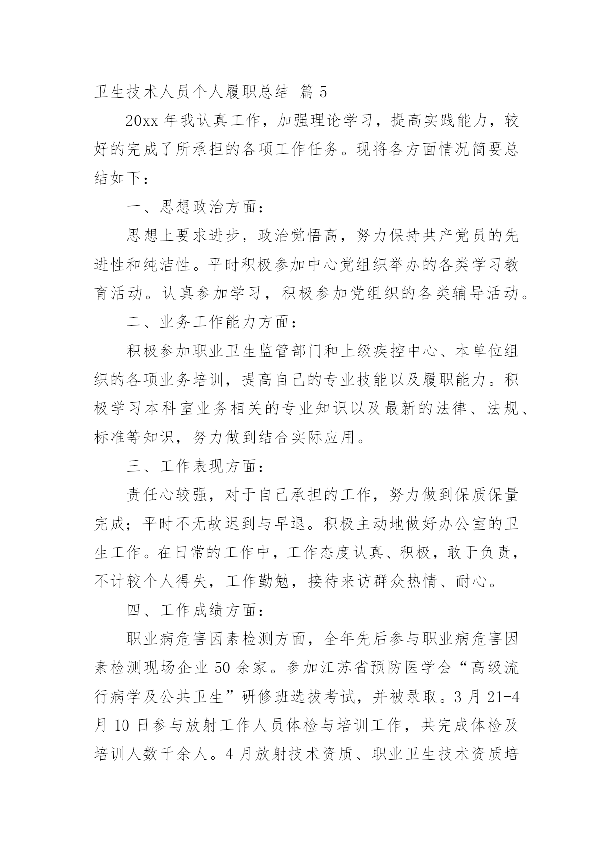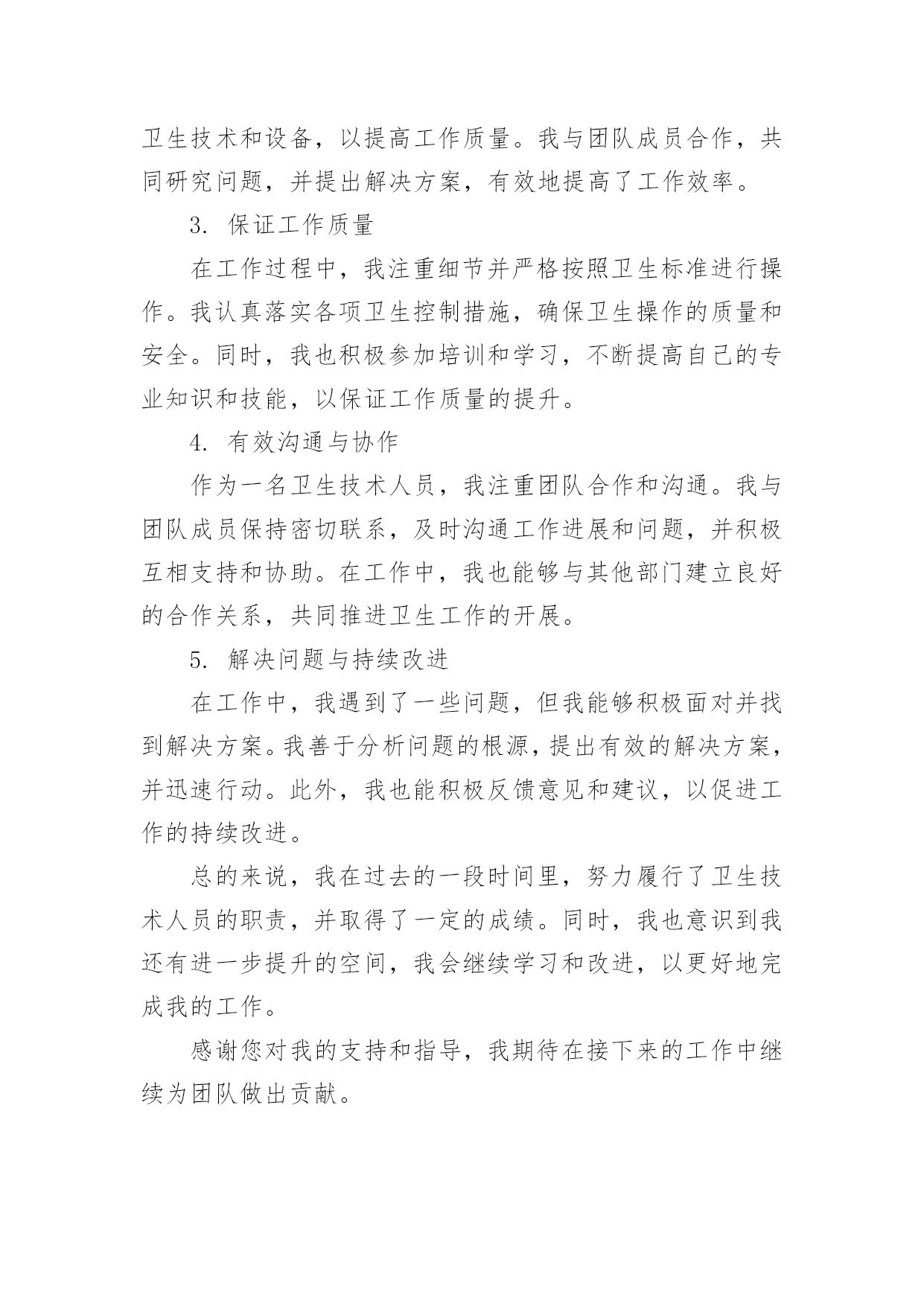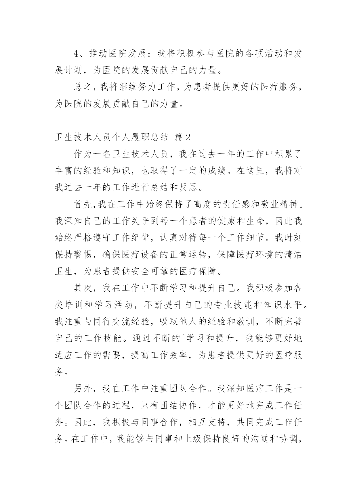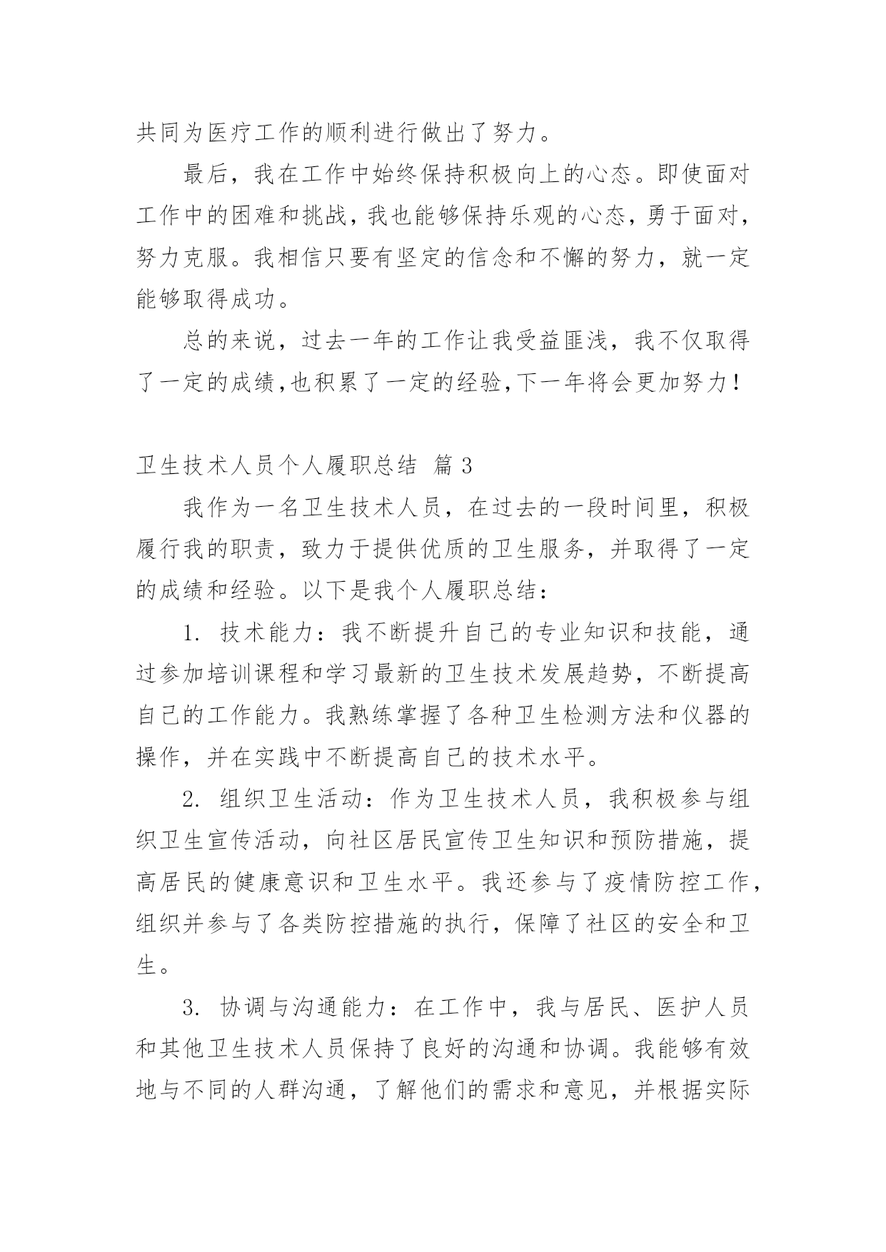 卫生技术人员个人履职总结篇1卫生技术人员个人履职总结必备(10篇)总结是对取得的成绩、存在的问题及得到的经验和教训等方面情况进行评价与描述的一种书面材料,它可使零星的、肤浅的、表面的感性认知上升到全面的、系统的、本质的理性认识上来,让我们一起来学习写总结吧。但是总结有什么要求呢?下面是小编收集整理的卫生技术人员个人履职总结,希望对大家有所帮助。卫生技术人员个人履职总结篇1在过去的一年里,我作为一名卫生技术人员,认真履行职责,积极投入工作,取得了一定的成绩。现将个人履职情况总结如下:一、工作概述我主要负责医院内科的日常诊疗工作,包括接诊、诊断、治疗、护理等。在过去的一年里,我共接诊了XX余名患者,为患者提供了优质的医疗服务。二、工作成绩1、医疗质量提升:通过不断学习和实践,我提高了自己的医疗技能水平,减少了误诊和漏诊的发生。同时,我也注重与患者的沟通,及时了解患者的病情和需求,为患者提供个性化的诊疗方案。2、患者满意度提高:我始终坚持以患者为中心的服务理念,关心患者的病情和需求,积极为患者提供帮助和支持。通过不断改进服务流程和提高服务质量,患者满意度得到了明显提高。3、团队协作能力增强:我积极参与团队工作,与同事们保持良好的沟通和协作。在工作中,我不仅关注自己的工作,也积极为团队贡献力量,共同推动工作的顺利进行。三、经验教训1、注重细节:在工作中,我深刻认识到细节的重要性。只有注重每一个细节,才能保证工作的准确性和效率。因此,我在工作中始终保持高度的警惕和专注。2、不断学习:医学是一个不断发展的`领域,我需要不断学习和更新知识。只有不断学习,才能跟上医学发展的步伐,为患者提供更好的医疗服务。3、保持耐心和热情:在面对患者时,我需要保持耐心和热情。只有真正关心患者,才能为患者提供更好的服务。同时,我也需要保持积极的心态,面对工作中的挑战和困难。四、未来计划1、提高专业技能:我将继续学习和提高自己的专业技能水平,为患者提供更优质的医疗服务。2、加强团队协作:我将积极参与团队工作,与同事们保持良好的沟通和协作,共同推动工作的顺利进行。3、关注患者需求:我将更加关注患者的需求和反馈,不断改进服务流程和提高服务质量,为患者提供更好的服务体验。4、推动医院发展:我将积极参与医院的各项活动和发展计划,为医院的发展贡献自己的力量。总之,我将继续努力工作,为患者提供更好的医疗服务,为医院的发展贡献自己的力量。卫生技术人员个人履职总结篇2作为一名卫生技术人员,我在过去一年的工作中积累了丰富的经验和知识,也取得了一定的成绩。在这里,我将对我过去一年的工作进行总结和反思。首先,我在工作中始终保持了高度的责任感和敬业精神。我深知自己的工作关乎到每一个患者的健康和生命,因此我始终严格遵守工作纪律,认真对待每一个工作细节。我时刻保持警惕,确保医疗设备的正常运转,保障医疗环境的清洁卫生,为患者提供安全可靠的医疗保障。其次,我在工作中不断学习和提升自己。我积极参加各类培训和学习活动,不断提升自己的专业技能和知识水平。我注重与同行交流经验,吸取他人的经验和教训,不断完善自己的工作技能。通过不断的'学习和提升,我能够更好地适应工作的需要,提高工作效率,为患者提供更好的医疗服务。另外,我在工作中注重团队合作。我深知医疗工作是一个团队合作的过程,只有团结协作,才能更好地完成工作任务。因此,我积极与同事合作,相互支持,共同完成工作任务。在工作中,我能够与同事和上级保持良好的沟通和协调,共同为医疗工作的顺利进行做出了努力。最后,我在工作中始终保持积极向上的心态。即使面对工作中的困难和挑战,我也能够保持乐观的心态,勇于面对,努力克服。我相信只要有坚定的信念和不懈的努力,就一定能够取得成功。总的来说,过去一年的工作让我受益匪浅,我不仅取得了一定的成绩,也积累了一定的经验,下一年将会更加努力!卫生技术人员个人履职总结篇3我作为一名卫生技术人员,在过去的一段时间里,积极履行我的职责,致力于提供优质的卫生服务,并取得了一定的成绩和经验。以下是我个人履职总结:1.技术能力:我不断提升自己的专业知识和技能,通过参加培训课程和学习最新的卫生技术发展趋势,不断提高自己的工作能力。我熟练掌握了各种卫生检测方法和仪器的操作,并在实践中不断提高自己的技术水平。2.组织卫生活动:作为卫生技术人员,我积极参与组织卫生宣传活动,向社区居民宣传卫生知识和预防措施,提高居民的健康意识和卫生水平。我还参与了疫情防控工作,组织并参与了各类防控措施的执行,保障了社区的安全和卫生。3.协调与沟通能力:在工作中,我与居民、医护人员和其他卫生技术人员保持了良好的沟通和协调。我能够有效地与不同的人群沟通,了解他们的需求和意见,并根据实际情况做出相应的'调整和改进。4.管理能力:我负责卫生设备的维护和保养,定期检查设备