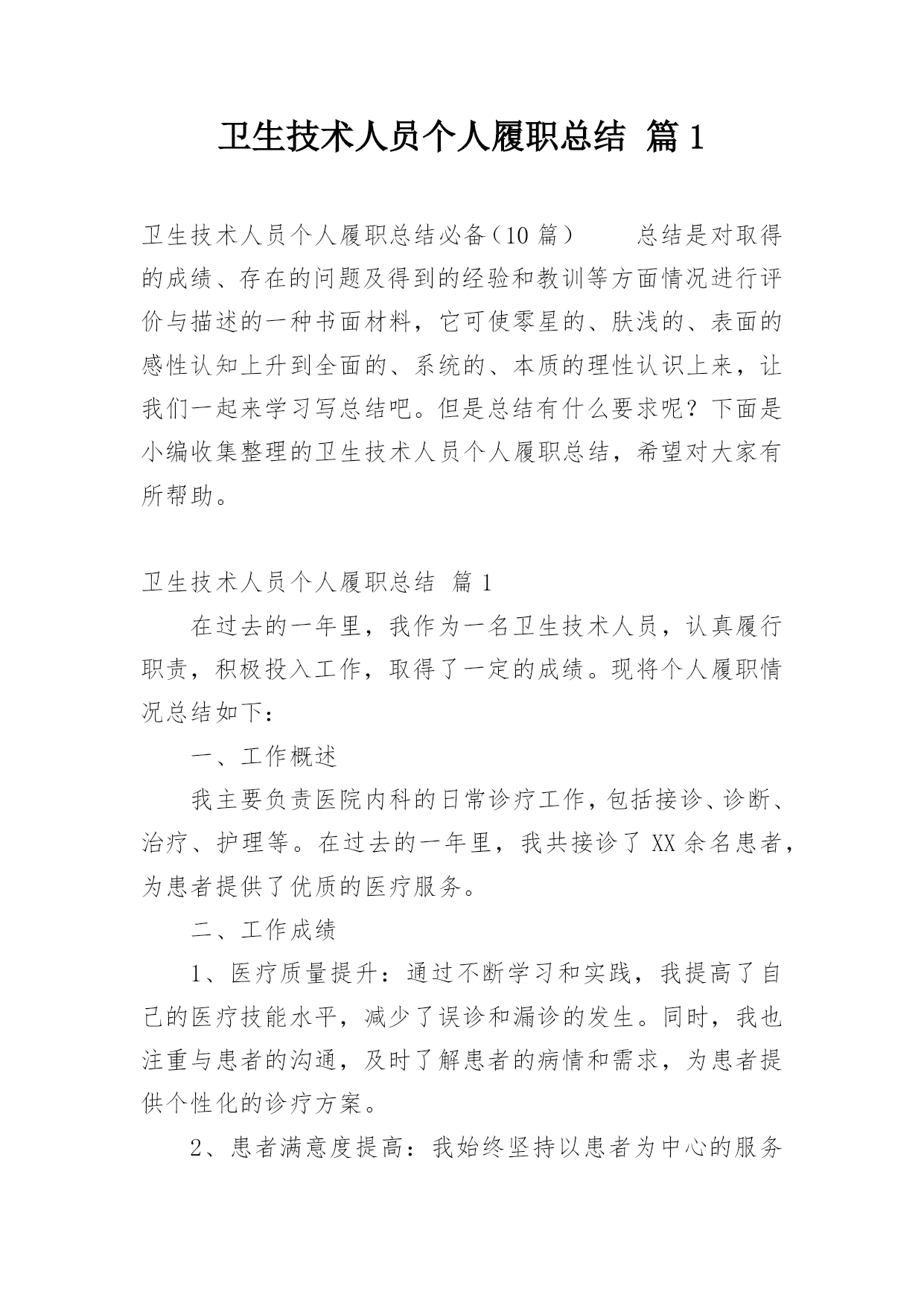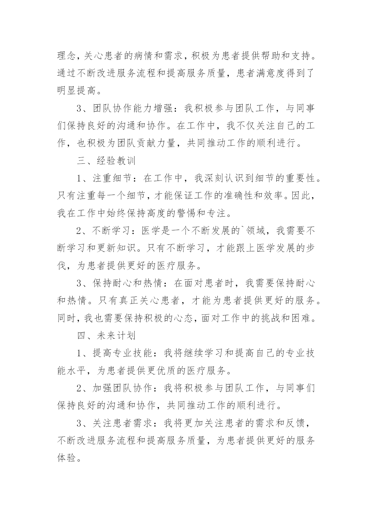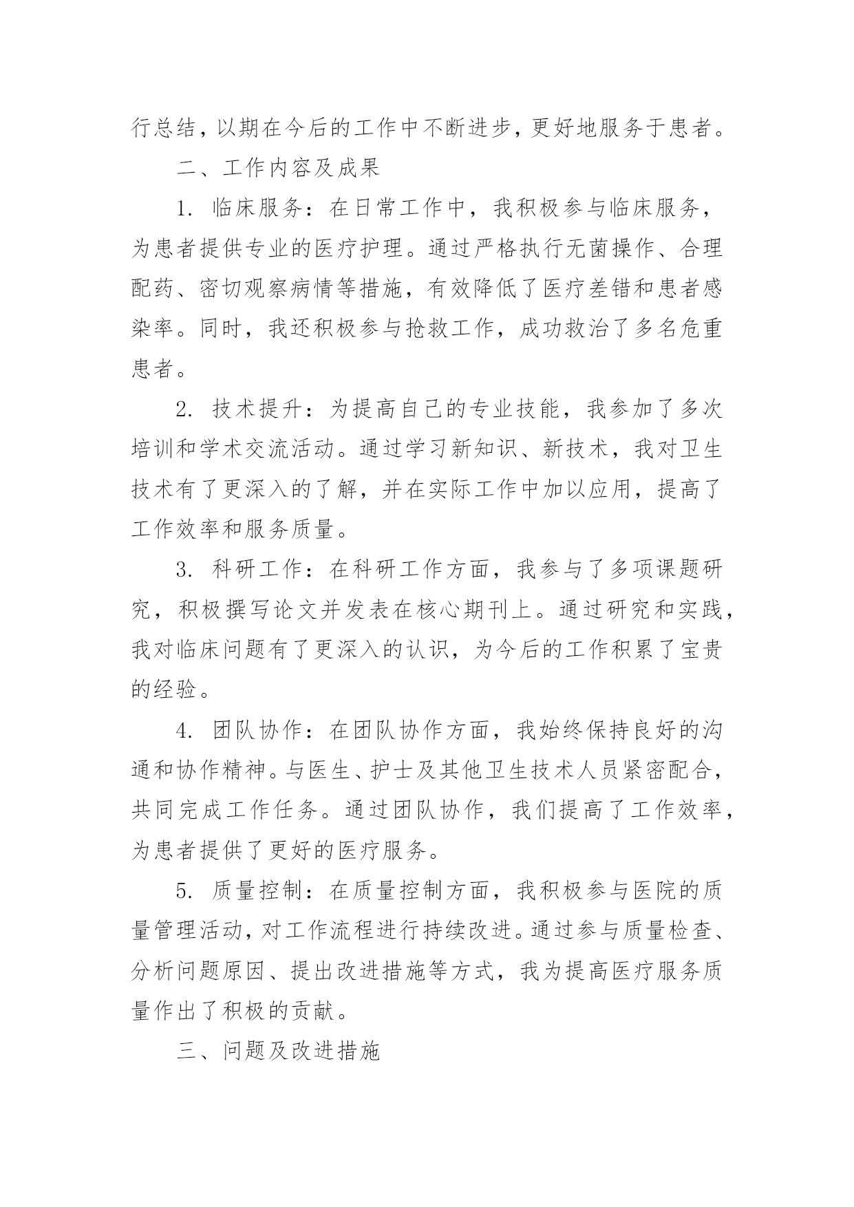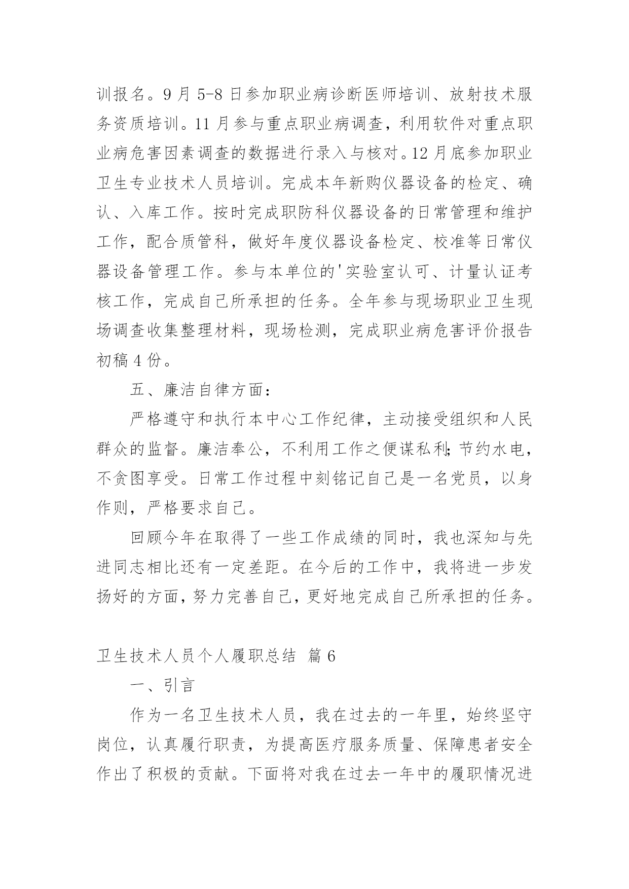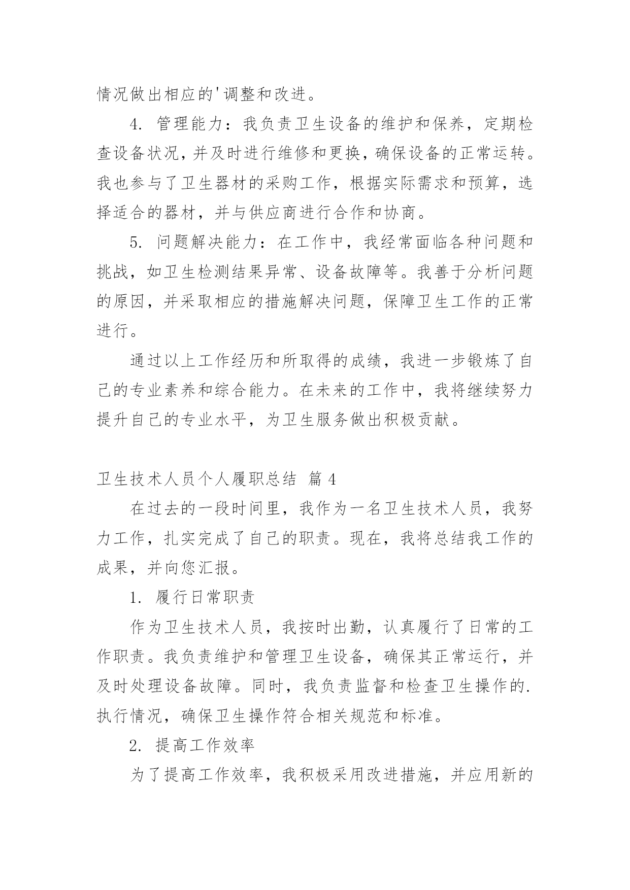 卫生技术人员个人履职总结篇1卫生技术人员个人履职总结必备(10篇)总结是对取得的成绩、存在的问题及得到的经验和教训等方面情况进行评价与描述的一种书面材料,它可使零星的、肤浅的、表面的感性认知上升到全面的、系统的、本质的理性认识上来,让我们一起来学习写总结吧。但是总结有什么要求呢?下面是小编收集整理的卫生技术人员个人履职总结,希望对大家有所帮助。卫生技术人员个人履职总结篇1在过去的一年里,我作为一名卫生技术人员,认真履行职责,积极投入工作,取得了一定的成绩。现将个人履职情况总结如下:一、工作概述我主要负责医院内科的日常诊疗工作,包括接诊、诊断、治疗、护理等。在过去的一年里,我共接诊了XX余名患者,为患者提供了优质的医疗服务。二、工作成绩1、医疗质量提升:通过不断学习和实践,我提高了自己的医疗技能水平,减少了误诊和漏诊的发生。同时,我也注重与患者的沟通,及时了解患者的病情和需求,为患者提供个性化的诊疗方案。2、患者满意度提高:我始终坚持以患者为中心的服务理念,关心患者的病情和需求,积极为患者提供帮助和支持。通过不断改进服务流程和提高服务质量,患者满意度得到了明显提高。3、团队协作能力增强:我积极参与团队工作,与同事们保持良好的沟通和协作。在工作中,我不仅关注自己的工作,也积极为团队贡献力量,共同推动工作的顺利进行。三、经验教训1、注重细节:在工作中,我深刻认识到细节的重要性。只有注重每一个细节,才能保证工作的准确性和效率。因此,我在工作中始终保持高度的警惕和专注。2、不断学习:医学是一个不断发展的`领域,我需要不断学习和更新知识。只有不断学习,才能跟上医学发展的步伐,为患者提供更好的医疗服务。3、保持耐心和热情:在面对患者时,我需要保持耐心和热情。只有真正关心患者,才能为患者提供更好的服务。同时,我也需要保持积极的心态,面对工作中的挑战和困难。四、未来计划1、提高专业技能:我将继续学习和提高自己的专业技能水平,为患者提供更优质的医疗服务。2、加强团队协作:我将积极参与团队工作,与同事们保持良好的沟通和协作,共同推动工作的顺利进行。3、关注患者需求:我将更加关注患者的需求和反馈,不断改进服务流程和提高服务质量,为患者提供更好的服务体验。4、推动医院发展:我将积极参与医院的各项活动和发展计划,为医院的发展贡献自己的力量。总之,我将继续努力工作,为患者提供更好的医疗服务,为医院的发展贡献自己的力量。卫生技术人员个人履职总结篇2作为一名卫生技术人员,我在过去一年的工作中积累了丰富的经验和知识,也取得了一定的成绩。在这里,我将对我过去一年的工作进行总结和反思。首先,我在工作中始终保持了高度的责任感和敬业精神。我深知自己的工作关乎到每一个患者的健康和生命,因此我始终严格遵守工作纪律,认真对待每一个工作细节。我时刻保持警惕,确保医疗设备的正常运转,保障医疗环境的清洁卫生,为患者提供安全可靠的医疗保障。其次,我在工作中不断学习和提升自己。我积极参加各类培训和学习活动,不断提升自己的专业技能和知识水平。我注重与同行交流经验,吸取他人的经验和教训,不断完善自己的工作技能。通过不断的'学习和提升,我能够更好地适应工作的需要,提高工作效率,为患者提供更好的医疗服务。另外,我在工作中注重团队合作。我深知医疗工作是一个团队合作的过程,只有团结协作,才能更好地完成工作任务。因此,我积极与同事合作,相互支持,共同完成工作任务。在工作中,我能够与同事和上级保持良好的沟通和协调,共同为医疗工作的顺利进行做出了努力。最后,我在工作中始终保持积极向上的心态。即使面对工作中的困难和挑战,我也能够保持乐观的心态,勇于面对,努力克服。我相信只要有坚定的信念和不懈的努力,就一定能够取得成功。总的来说,过去一年的工作让我受益匪浅,我不仅取得了一定的成绩,也积累了一定的经验,下一年将会更加努力!卫生技术人员个人履职总结篇3我作为一名卫生技术人员,在过去的一段时间里,积极履行我的职责,致力于提供优质的卫生服务,并取得了一定的成绩和经验。以下是我个人履职总结:1.技术能力:我不断提升自己的专业知识和技能,通过参加培训课程和学习最新的卫生技术发展趋势,不断提高自己的工作能力。我熟练掌握了各种卫生检测方法和仪器的操作,并在实践中不断提高自己的技术水平。2.组织卫生活动:作为卫生技术人员,我积极参与组织卫生宣传活动,向社区居民宣传卫生知识和预防措施,提高居民的健康意识和卫生水平。我还参与了疫情防控工作,组织并参与了各类防控措施的执行,保障了社区的安全和卫生。3.协调与沟通能力:在工作中,我与居民、医护人员和其他卫生技术人员保持了良好的沟通和协调。我能够有效地与不同的人群沟通,了解他们的需求和意见,并根据实际情况做出相应的'调整和改进。4.管理能力:我负责卫生设备的维护和保养,定期检查设备