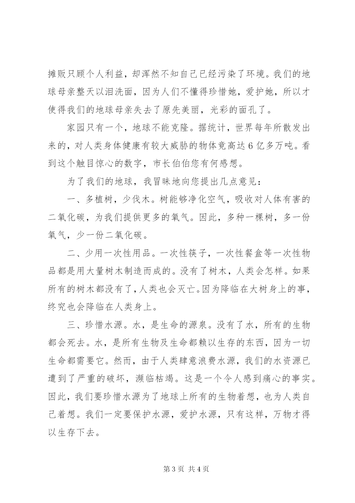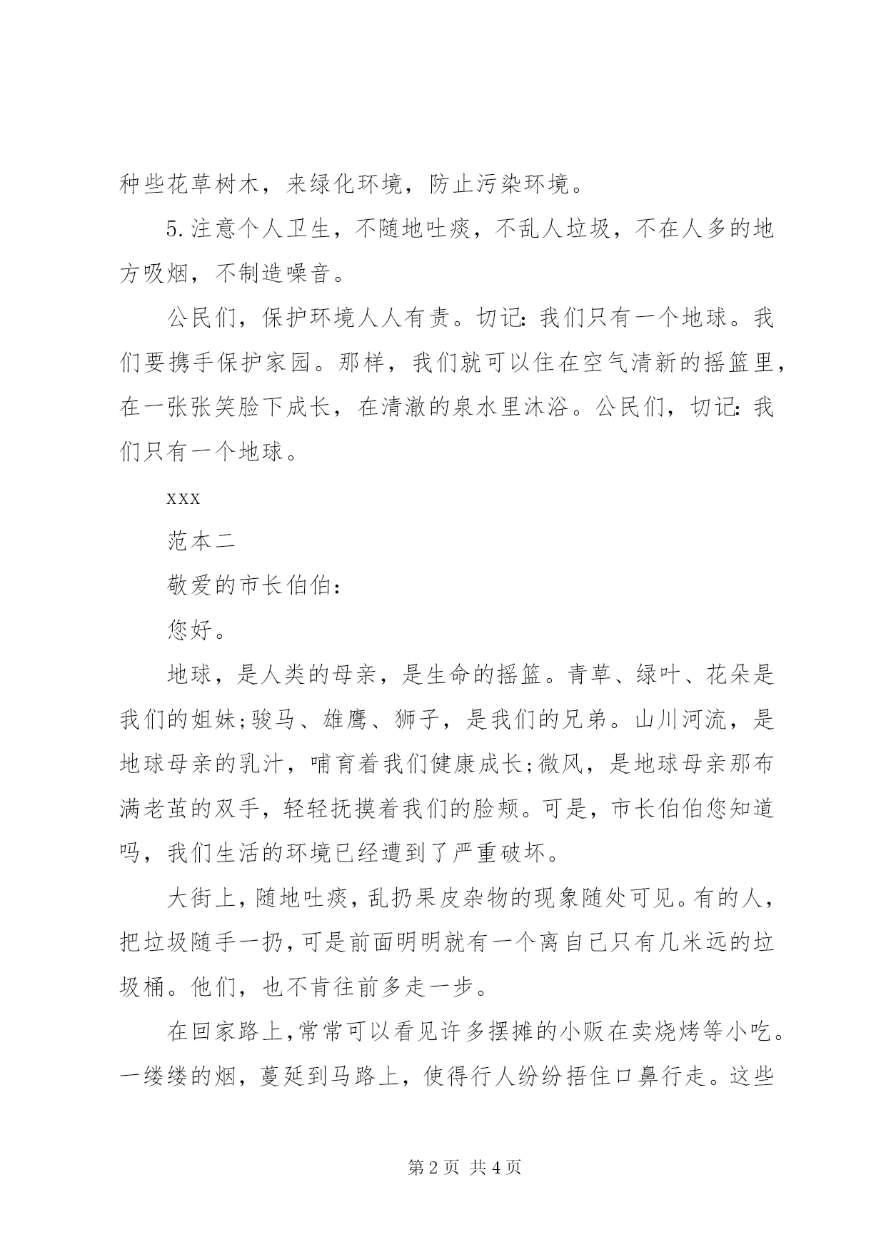 第PAGE\*Arabic\*MERGEFORMAT4页共NUMPAGES\*MERGEFORMAT4页市民环保倡议书范本一地球村的小公民们:我们赖以生存的地球只有一个,它多么需要我们的保护啊。可是,有些小公民非但不听,你们看,餐桌上被丢弃的食物,堆积如山的一次性筷子,哗哗流淌的自来水。。。。。。。这样的画面真是触目惊心。地球,这位人类的母亲,生命的摇篮。曾是那样美丽,那么壮观。但现在,人类为了自己的利益,不惜乱采乱挖,随意排放污染物......于是,一座座挺拔的山变秃了,一条条清澈的河水变黑了......地球母亲正在痛苦的呻吟。如果地球被污染,我们的生命将会毁在自己手上。作为地球上的一员,我们有责任,有义务来保护地球。从小事做起,从身边做起。保护我们的家园,让我们的地球恢复原来的面貌。因此,我建议:1.尽量少用一次性类物品,减少白色污染,自备购物袋和篮子。2.不管在生活中,学习中,还是工作中,都要节约资源。用水,用电,要节制。杜绝各种浪费迹象,消费也要节俭一点。3.废纸,废塑料,废金属等所有可回收物品,要分类回收,是资源可以不断再生,从而减少垃圾污染。4.植树造林,爱护身边的一寸地,一株花草,一棵树木。多种些花草树木,来绿化环境,防止污染环境。5.注意个人卫生,不随地吐痰,不乱人垃圾,不在人多的地方吸烟,不制造噪音。公民们,保护环境人人有责。切记:我们只有一个地球。我们要携手保护家园。那样,我们就可以住在空气清新的摇篮里,在一张张笑脸下成长,在清澈的泉水里沐浴。公民们,切记:我们只有一个地球。xxx范本二敬爱的市长伯伯:您好。地球,是人类的母亲,是生命的摇篮。青草、绿叶、花朵是我们的姐妹;骏马、雄鹰、狮子,是我们的兄弟。山川河流,是地球母亲的乳汁,哺育着我们健康成长;微风,是地球母亲那布满老茧的双手,轻轻抚摸着我们的脸颊。可是,市长伯伯您知道吗,我们生活的环境已经遭到了严重破坏。大街上,随地吐痰,乱扔果皮杂物的现象随处可见。有的人,把垃圾随手一扔,可是前面明明就有一个离自己只有几米远的垃圾桶。他们,也不肯往前多走一步。在回家路上,常常可以看见许多摆摊的小贩在卖烧烤等小吃。一缕缕的烟,蔓延到马路上,使得行人纷纷捂住口鼻行走。这些摊贩只顾个人利益,却浑然不知自己已经污染了环境。我们的地球母亲整天以泪洗面,因为人们不懂得珍惜她,爱护她,所以才使得我们的地球母亲失去了原先美丽,光彩的面孔了。家园只有一个,地球不能克隆。据统计,世界每年所散发出来的,对人类身体健康有较大威胁的物体竟高达6亿多万吨。看到这个触目惊心的数字,市长伯伯您有何感想。为了我们的地球,我冒昧地向您提出几点意见:一、多植树,少伐木。树能够净化空气,吸收对人体有害的二氧化碳,为我们提供更多的氧气。因此,多种一棵树,多一份氧气,少一份二氧化碳。二、少用一次性用品。一次性筷子,一次性餐盒等一次性物品都是用大量树木制造而成的。没有了树木,人类会怎样。如果所有的树木都没有了,人类也会灭亡。因为降临在大树身上的事,终究也会降临在人类身上。三、珍惜水源。水,是生命的源泉。没有了水,所有的生物都会死去。水,是所有生物及生命都赖以生存的东西,因为一切生命都需要它。然而,由于人类肆意浪费水源,我们的水资源已遭到了严重的破坏,濒临枯竭。这是一个令人感到痛心的事实。因此,我们要珍惜水源为了地球上所有的生物着想,也为人类自己着想。我们一定要保护水源,爱护水源,只有这样,万物才得以生存下去。市长伯伯,您同意我的这些建议和观点吗。期待您的回信。xxxx