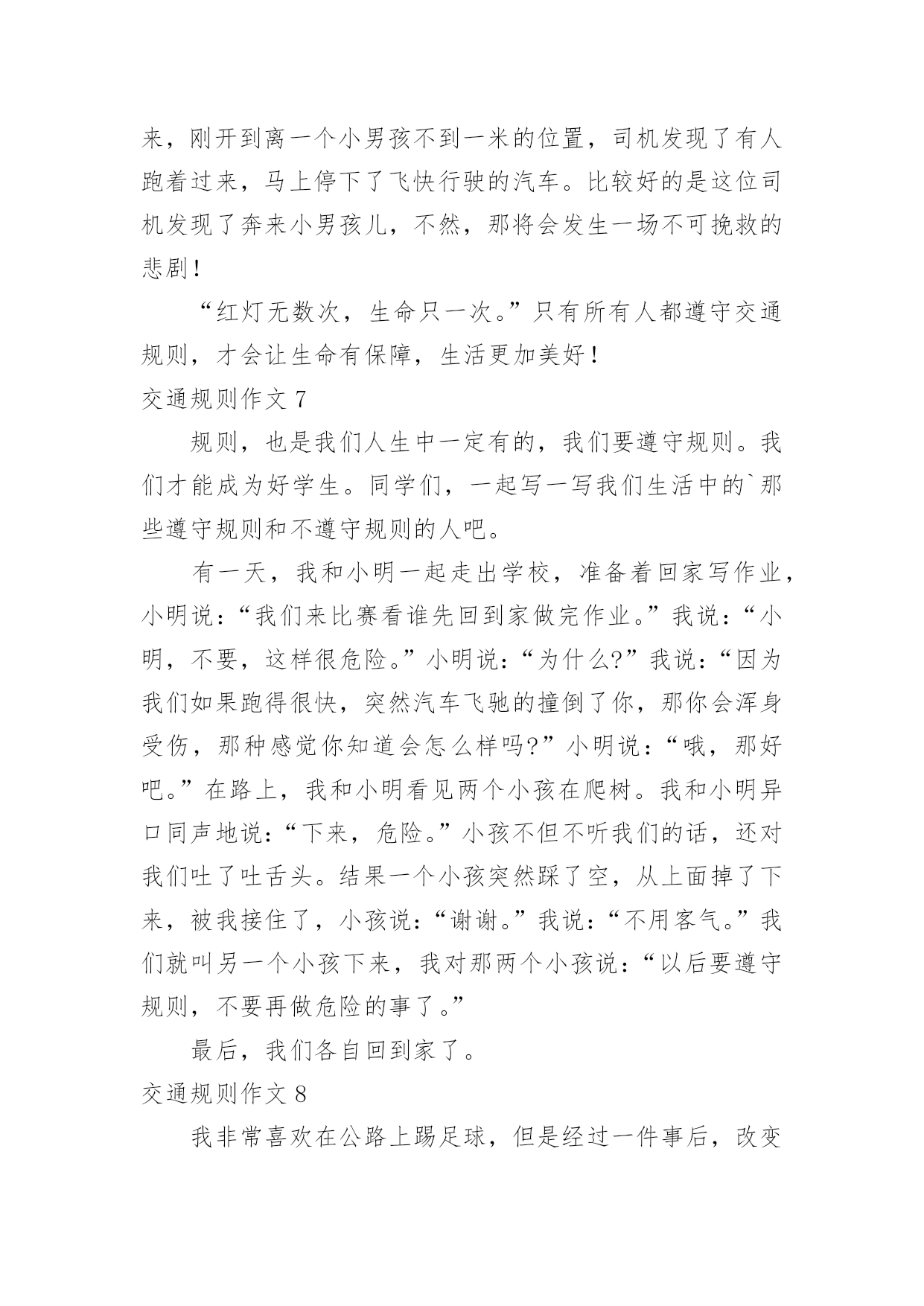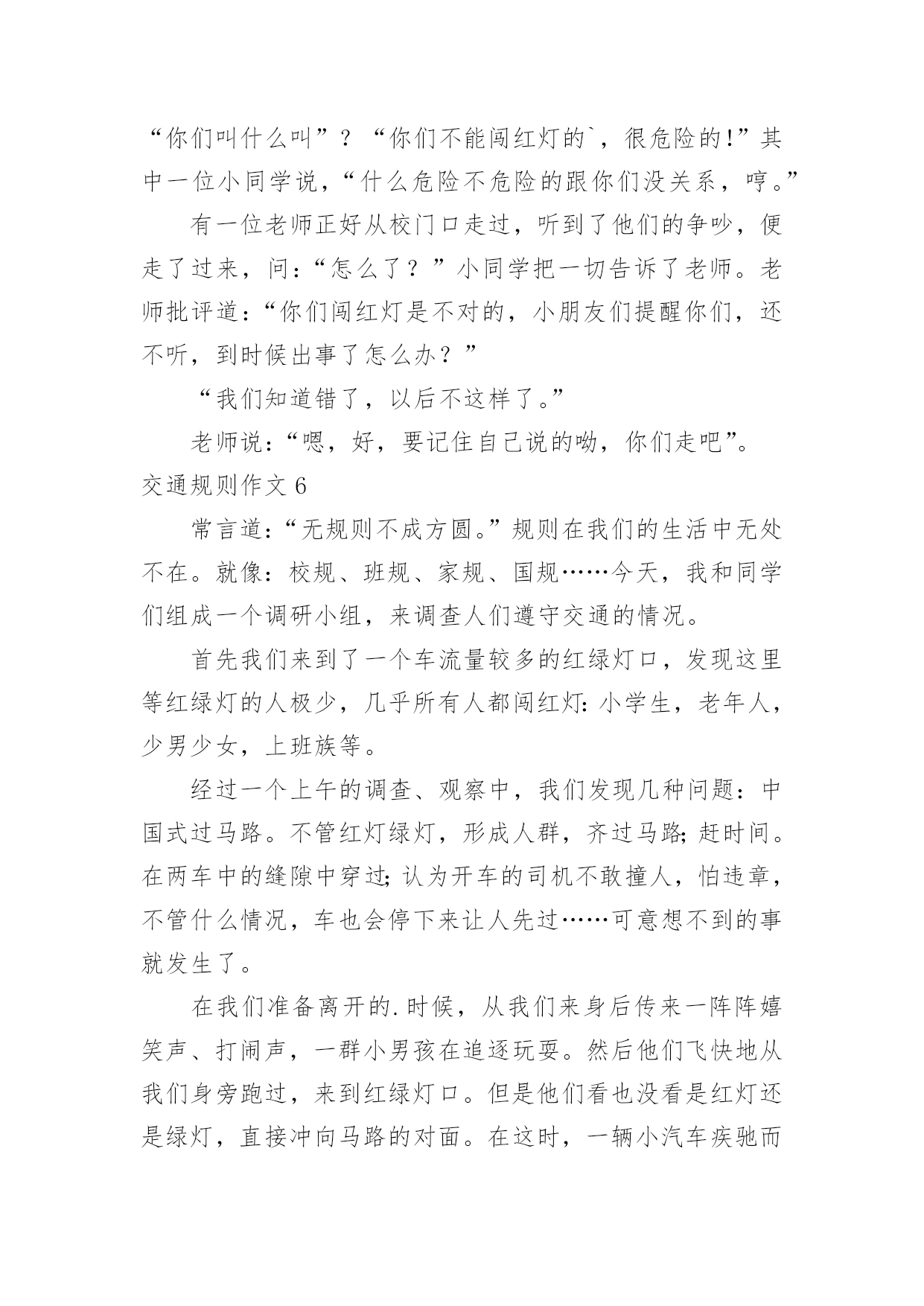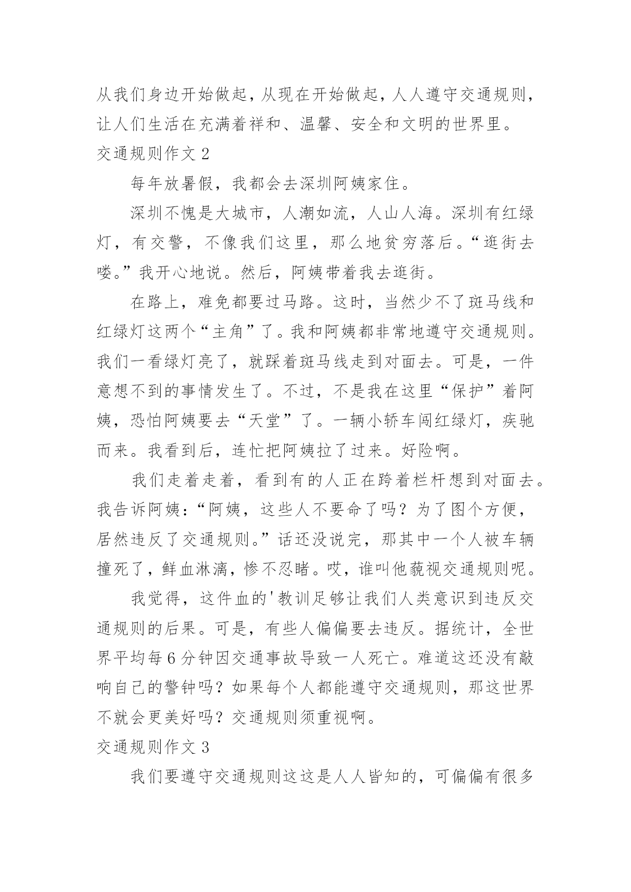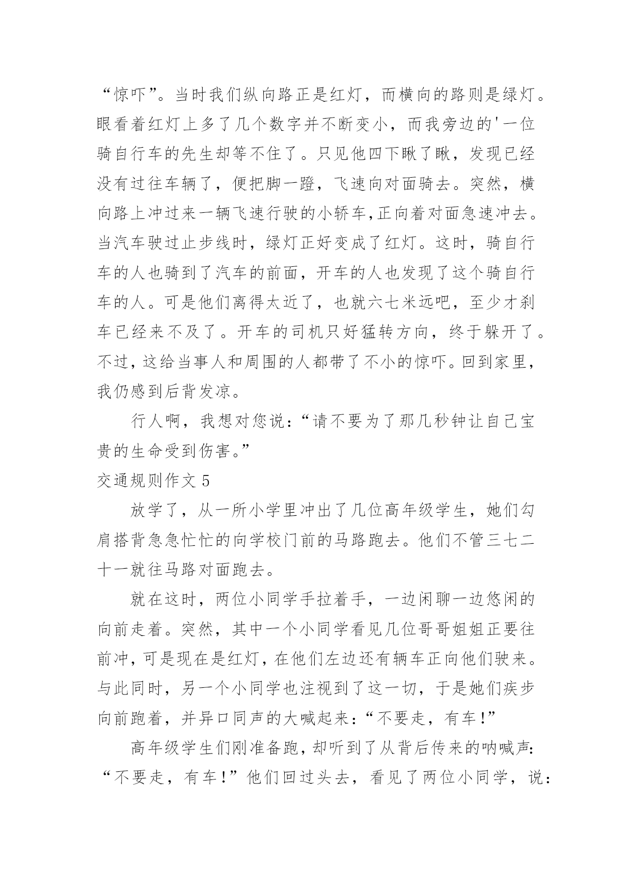 交通规则作文交通规则作文(推荐)在生活、工作和学习中,大家最不陌生的就是作文了吧,作文是一种言语活动,具有高度的综合性和创造性。怎么写作文才能避免踩雷呢?下面是小编帮大家整理的交通规则作文,希望对大家有所帮助。交通规则作文1“轰隆”一声巨响,接着是几声撕心裂肺的慘叫声。刹那间,一个惨不忍睹的场面就这样发生了,真是可悲、可怕。这是我们今天看的一部电影《流泪的花季》中一个骇人的交通事故场面。大家都知道,童年是人生中最美好的.时光,可《流泪的花季》影片中,她们的童年却是流泪的,她们有的因车祸失去了父母,变成了孤儿;有的因车祸失去了手和脚,变成了残废;还有的甚至因车祸失去了宝贵的生命,失去了花季般的童年。那么是什么引起了这么多的车祸事故呢?就是没有遵守交通规则。所以,我要高声的对所有的人说:“请务必遵守交通规则。”不论是驾驶员叔叔,还是行人,都应该努力提高自己的交通法规意识,珍惜自己和别人的生命。看了这部《流泪的花季》电影后,我们应该立即行动,从我们身边开始做起,从现在开始做起,人人遵守交通规则,让人们生活在充满着祥和、温馨、安全和文明的世界里。交通规则作文2每年放暑假,我都会去深圳阿姨家住。深圳不愧是大城市,人潮如流,人山人海。深圳有红绿灯,有交警,不像我们这里,那么地贫穷落后。“逛街去喽。”我开心地说。然后,阿姨带着我去逛街。在路上,难免都要过马路。这时,当然少不了斑马线和红绿灯这两个“主角”了。我和阿姨都非常地遵守交通规则。我们一看绿灯亮了,就踩着斑马线走到对面去。可是,一件意想不到的事情发生了。不过,不是我在这里“保护”着阿姨,恐怕阿姨要去“天堂”了。一辆小轿车闯红绿灯,疾驰而来。我看到后,连忙把阿姨拉了过来。好险啊。我们走着走着,看到有的人正在跨着栏杆想到对面去。我告诉阿姨:“阿姨,这些人不要命了吗?为了图个方便,居然违反了交通规则。”话还没说完,那其中一个人被车辆撞死了,鲜血淋漓,惨不忍睹。哎,谁叫他藐视交通规则呢。我觉得,这件血的'教训足够让我们人类意识到违反交通规则的后果。可是,有些人偏偏要去违反。据统计,全世界平均每6分钟因交通事故导致一人死亡。难道这还没有敲响自己的警钟吗?如果每个人都能遵守交通规则,那这世界不就会更美好吗?交通规则须重视啊。交通规则作文3我们要遵守交通规则这这是人人皆知的,可偏偏有很多人充耳不闻,视而不见。把遵守交通规则当成儿戏,在我们的日常生活中就有不少人因为出车祸而丧失了性命,他们是平白无故出车祸的吗?不是的,是因为他们没有遵守交通规则而导致的。在学校里老师反复强调在路上不要并排骑自行车,可是有一部分同学就把老师的话当成了耳旁风,呼得一下早已抛到了九霄云外,后果,可想而知。同学们一定要记住:一失足成千古恨。我要告诉大家的是:生命是万分之短暂,而且只有一次。所以,大家一定要加倍珍爱生命,更确切的说不热爱生命,就会害己害人害社会……百害而无一利。不论你珍爱生命也好,不珍爱生命也罢,都应有则改之,无则加勉。常言道:冰冻三尺,非一日之寒,我想只要我们坚持,只要我们努力,大家总有一天会豁然悔悟。我始终坚信:疮痍满目的“旧社会”将会一去不复返,而万象更新的`“新社会”正迈着矫健的步伐向我们21世纪的青少年走来。交通规则作文4“宁等一分钟,不抢一秒钟。”每当我在路上看到这条道路安全宣传标语,我都在心中暗暗提醒自己,千万不要抢灯。同时,与我一样常在路上行走的行人啊,我想对你说:“千万不要为了几秒的时间让自己受到伤害的几率变大。”记得那是上个月的一个星期六,我自己一个人走路回家。当我到了离家不远的一个十字路口时,却亲眼目睹了一场“惊吓”。当时我们纵向路正是红灯,而横向的路则是绿灯。眼看着红灯上多了几个数字并不断变小,而我旁边的'一位骑自行车的先生却等不住了。只见他四下瞅了瞅,发现已经没有过往车辆了,便把脚一蹬,飞速向对面骑去。突然,横向路上冲过来一辆飞速行驶的小轿车,正向着对面急速冲去。当汽车驶过止步线时,绿灯正好变成了红灯。这时,骑自行车的人也骑到了汽车的前面,开车的人也发现了这个骑自行车的人。可是他们离得太近了,也就六七米远吧,至少才刹车已经来不及了。开车的司机只好猛转方向,终于躲开了。不过,这给当事人和周围的人都带了不小的惊吓。回到家里,我仍感到后背发凉。行人啊,我想对您说:“请不要为了那几秒钟让自己宝贵的生命受到伤害。”交通规则作文5放学了,从一所小学里冲出了几位高年级学生,她们勾肩搭背急急忙忙的向学校门前的马路跑去。他们不管三七二十一就往马路对面跑去。就在这时,两位小同学手拉着手,一边闲聊一边悠闲的向前走着。突然,其中一个小同学看见几位哥哥姐姐正要往前冲,可是现在是红灯,在他们左边还有辆车正向他们驶来。与此同时,另一个小同学也注视到了这一切,于是她们疾步向前跑着,并异口同声的大喊起来:“不要走,有