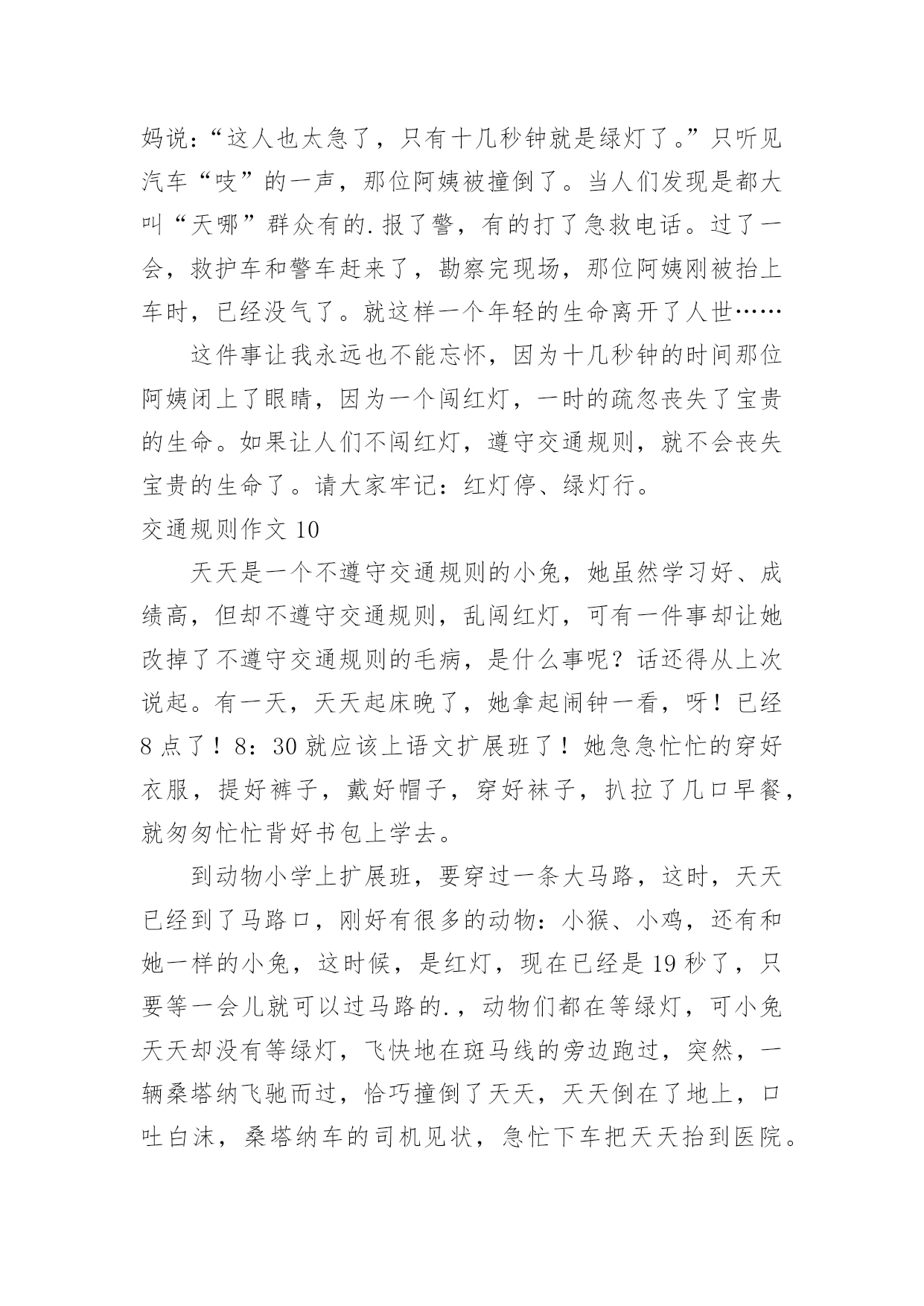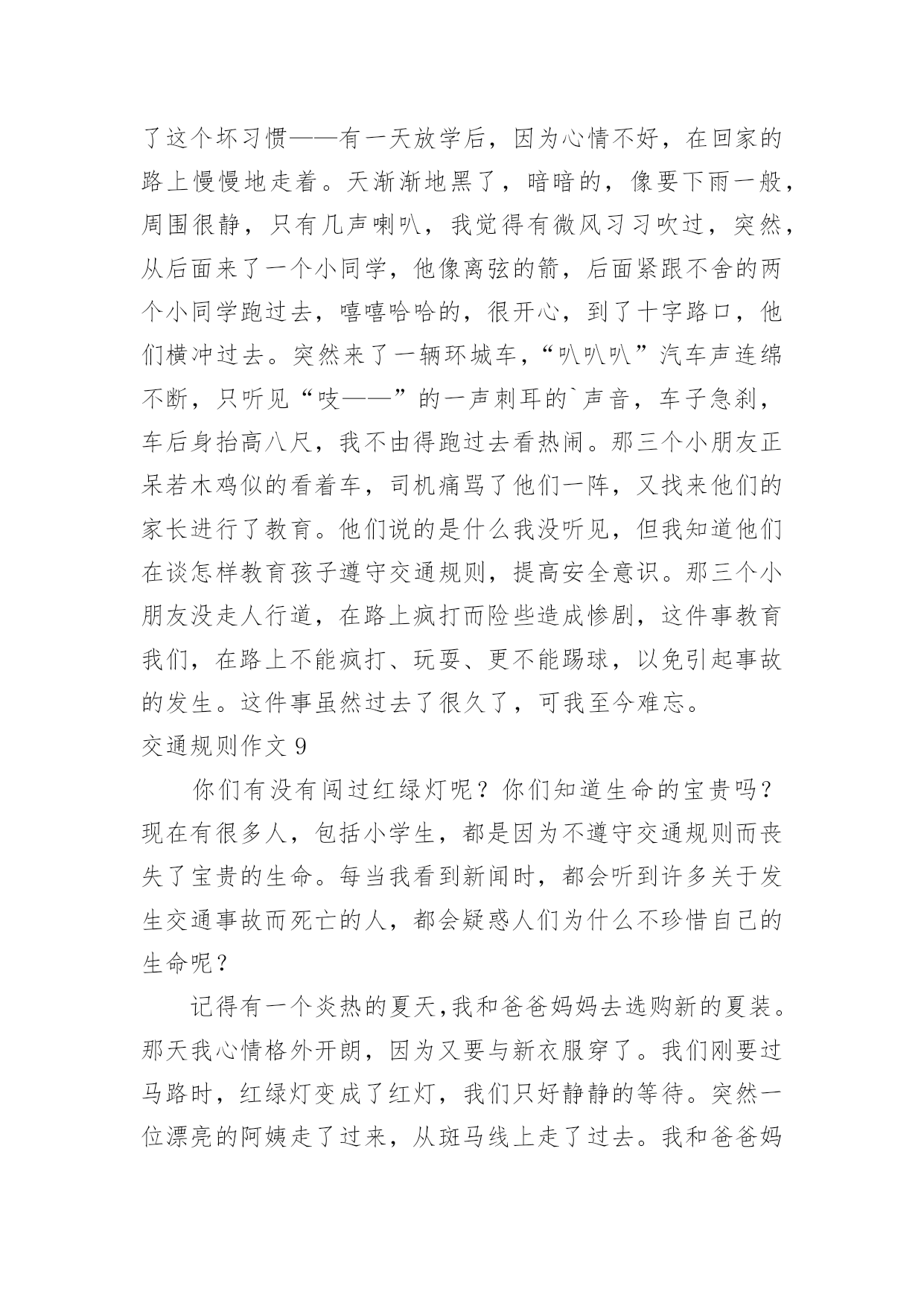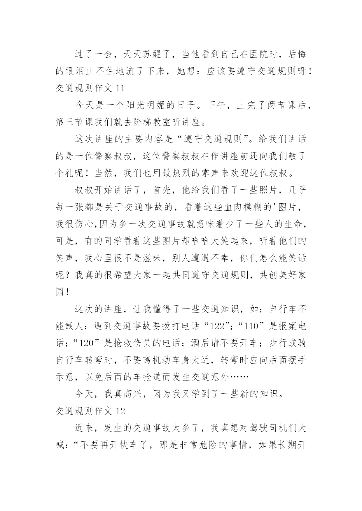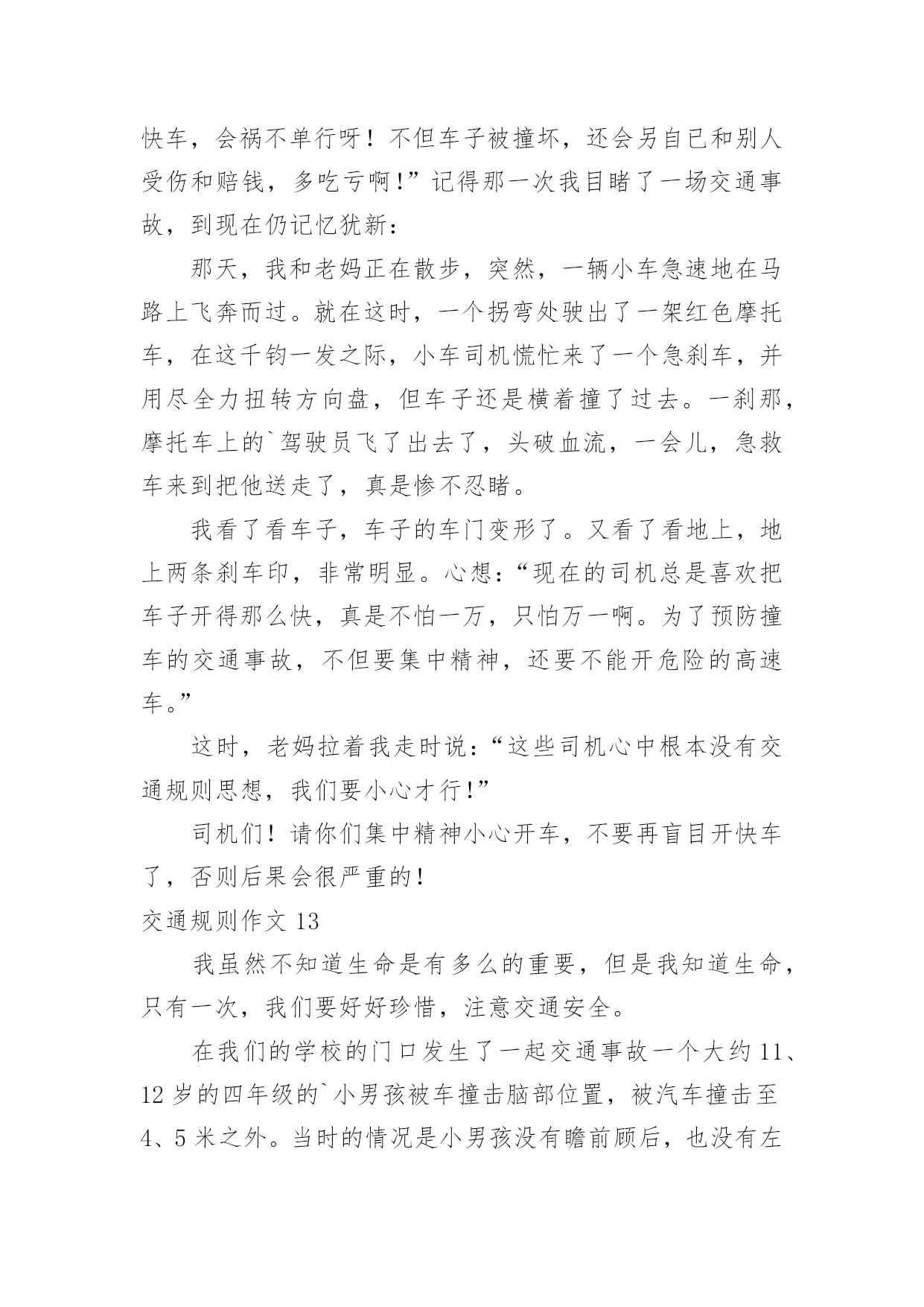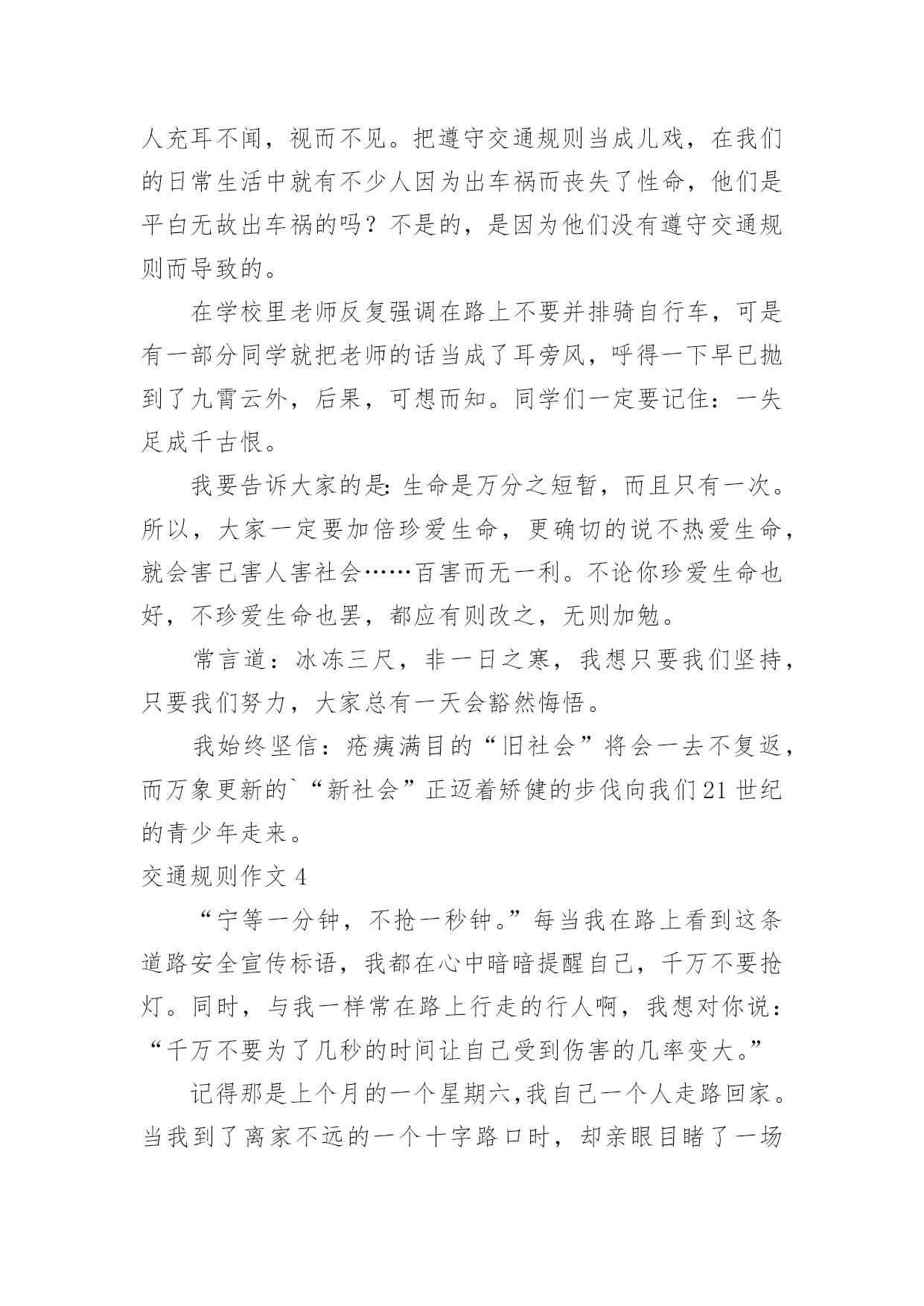交通规则作文交通规则作文(推荐)在生活、工作和学习中,大家最不陌生的就是作文了吧,作文是一种言语活动,具有高度的综合性和创造性。怎么写作文才能避免踩雷呢?下面是小编帮大家整理的交通规则作文,希望对大家有所帮助。交通规则作文1“轰隆”一声巨响,接着是几声撕心裂肺的慘叫声。刹那间,一个惨不忍睹的场面就这样发生了,真是可悲、可怕。这是我们今天看的一部电影《流泪的花季》中一个骇人的交通事故场面。大家都知道,童年是人生中最美好的.时光,可《流泪的花季》影片中,她们的童年却是流泪的,她们有的因车祸失去了父母,变成了孤儿;有的因车祸失去了手和脚,变成了残废;还有的甚至因车祸失去了宝贵的生命,失去了花季般的童年。那么是什么引起了这么多的车祸事故呢?就是没有遵守交通规则。所以,我要高声的对所有的人说:“请务必遵守交通规则。”不论是驾驶员叔叔,还是行人,都应该努力提高自己的交通法规意识,珍惜自己和别人的生命。看了这部《流泪的花季》电影后,我们应该立即行动,从我们身边开始做起,从现在开始做起,人人遵守交通规则,让人们生活在充满着祥和、温馨、安全和文明的世界里。交通规则作文2每年放暑假,我都会去深圳阿姨家住。深圳不愧是大城市,人潮如流,人山人海。深圳有红绿灯,有交警,不像我们这里,那么地贫穷落后。“逛街去喽。”我开心地说。然后,阿姨带着我去逛街。在路上,难免都要过马路。这时,当然少不了斑马线和红绿灯这两个“主角”了。我和阿姨都非常地遵守交通规则。我们一看绿灯亮了,就踩着斑马线走到对面去。可是,一件意想不到的事情发生了。不过,不是我在这里“保护”着阿姨,恐怕阿姨要去“天堂”了。一辆小轿车闯红绿灯,疾驰而来。我看到后,连忙把阿姨拉了过来。好险啊。我们走着走着,看到有的人正在跨着栏杆想到对面去。我告诉阿姨:“阿姨,这些人不要命了吗?为了图个方便,居然违反了交通规则。”话还没说完,那其中一个人被车辆撞死了,鲜血淋漓,惨不忍睹。哎,谁叫他藐视交通规则呢。我觉得,这件血的'教训足够让我们人类意识到违反交通规则的后果。可是,有些人偏偏要去违反。据统计,全世界平均每6分钟因交通事故导致一人死亡。难道这还没有敲响自己的警钟吗?如果每个人都能遵守交通规则,那这世界不就会更美好吗?交通规则须重视啊。交通规则作文3我们要遵守交通规则这这是人人皆知的,可偏偏有很多人充耳不闻,视而不见。把遵守交通规则当成儿戏,在我们的日常生活中就有不少人因为出车祸而丧失了性命,他们是平白无故出车祸的吗?不是的,是因为他们没有遵守交通规则而导致的。在学校里老师反复强调在路上不要并排骑自行车,可是有一部分同学就把老师的话当成了耳旁风,呼得一下早已抛到了九霄云外,后果,可想而知。同学们一定要记住:一失足成千古恨。我要告诉大家的是:生命是万分之短暂,而且只有一次。所以,大家一定要加倍珍爱生命,更确切的说不热爱生命,就会害己害人害社会……百害而无一利。不论你珍爱生命也好,不珍爱生命也罢,都应有则改之,无则加勉。常言道:冰冻三尺,非一日之寒,我想只要我们坚持,只要我们努力,大家总有一天会豁然悔悟。我始终坚信:疮痍满目的“旧社会”将会一去不复返,而万象更新的`“新社会”正迈着矫健的步伐向我们21世纪的青少年走来。交通规则作文4“宁等一分钟,不抢一秒钟。”每当我在路上看到这条道路安全宣传标语,我都在心中暗暗提醒自己,千万不要抢灯。同时,与我一样常在路上行走的行人啊,我想对你说:“千万不要为了几秒的时间让自己受到伤害的几率变大。”记得那是上个月的一个星期六,我自己一个人走路回家。当我到了离家不远的一个十字路口时,却亲眼目睹了一场“惊吓”。当时我们纵向路正是红灯,而横向的路则是绿灯。眼看着红灯上多了几个数字并不断变小,而我旁边的'一位骑自行车的先生却等不住了。只见他四下瞅了瞅,发现已经没有过往车辆了,便把脚一蹬,飞速向对面骑去。突然,横向路上冲过来一辆飞速行驶的小轿车,正向着对面急速冲去。当汽车驶过止步线时,绿灯正好变成了红灯。这时,骑自行车的人也骑到了汽车的前面,开车的人也发现了这个骑自行车的人。可是他们离得太近了,也就六七米远吧,至少才刹车已经来不及了。开车的司机只好猛转方向,终于躲开了。不过,这给当事人和周围的人都带了不小的惊吓。回到家里,我仍感到后背发凉。行人啊,我想对您说:“请不要为了那几秒钟让自己宝贵的生命受到伤害。”交通规则作文5放学了,从一所小学里冲出了几位高年级学生,她们勾肩搭背急急忙忙的向学校门前的马路跑去。他们不管三七二十一就往马路对面跑去。就在这时,两位小同学手拉着手,一边闲聊一边悠闲的向前走着。突然,其中一个小同学看见几位哥哥姐姐正要往前冲,可是现在是红灯,在他们左边还有辆车正向他们驶来。与此同时,另一个小同学也注视到了这一切,于是她们疾步向前跑着,并异口同声的大喊起来:“不要走,有