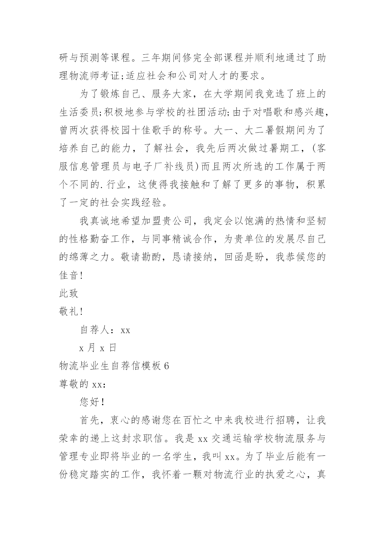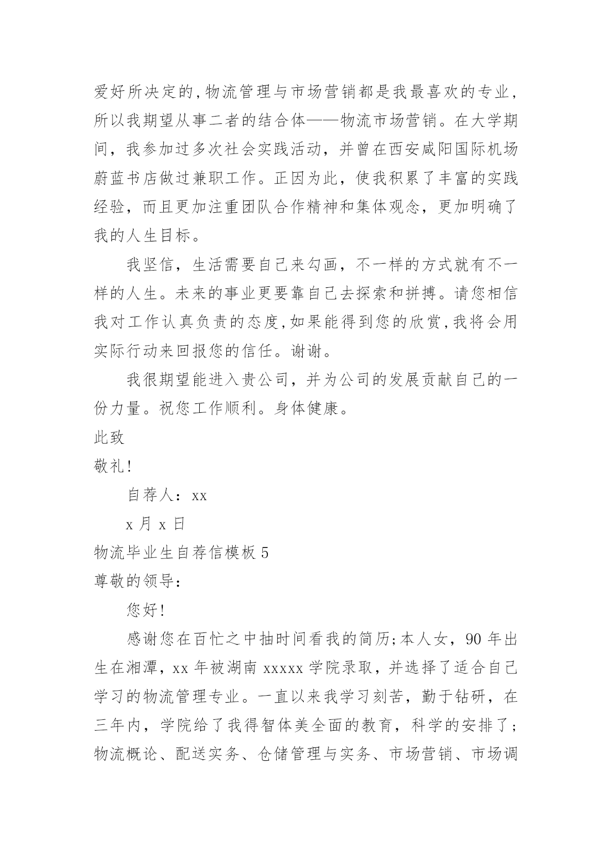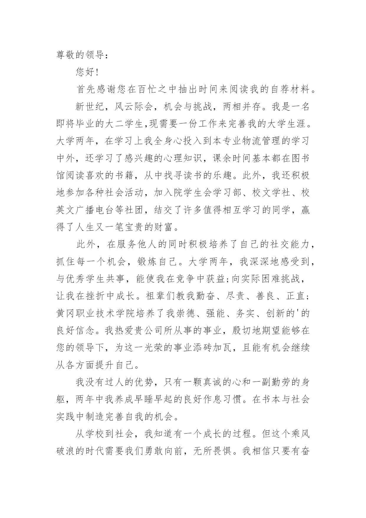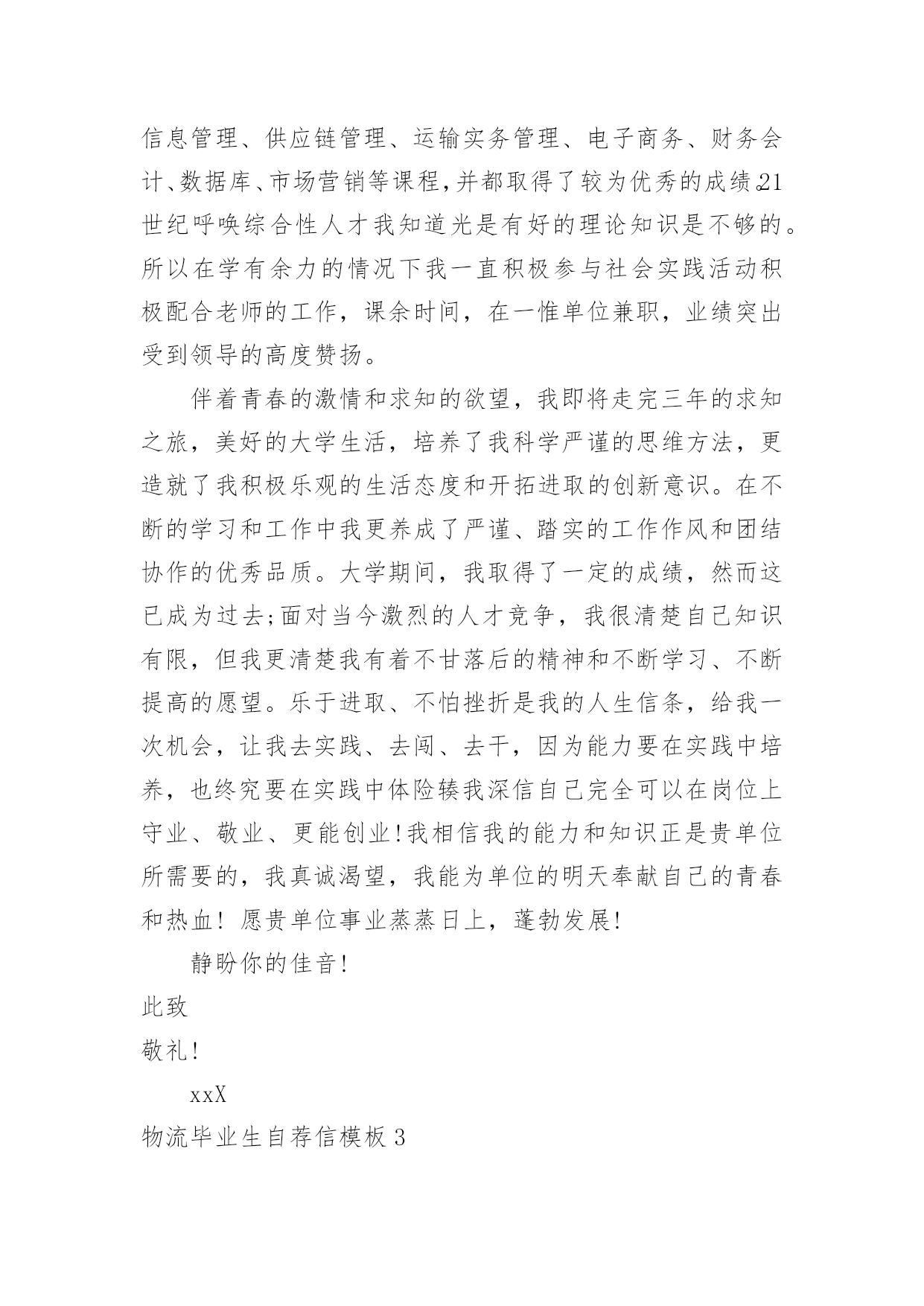 物流毕业生自荐信物流毕业生自荐信模板在如今这个时代,自荐信的使用频率越来越高,我们在写自荐信的时候可以注意一些写作要诀。相信大家又在为写自荐信犯愁了吧!以下是小编精心整理的物流毕业生自荐信模板,供大家参考借鉴,希望可以帮助到有需要的朋友。物流毕业生自荐信模板1尊敬的领导:您好!请恕打扰!我是一名即将从江苏建筑职业技术学院物流管理专业毕业的大学生。我很荣幸有机会向您呈上我的个人资料。在投身社会之际,为了找到符合自己专业和兴趣的工作,更好地发挥自己的才能,实现自己的人生价值,谨向各位领导做一自我推荐。在三年的学习生活中,在学校期间,我不断积极进取,立足基础扎实,努力学习专业知识,成绩优异,积极参与学校组织的各种活动,同时也得到老师和同学们的认可,作为的毕业生,在这样一个竞争激烈的社会里,不仅要掌握好专业知识,更加做到与社会与时代接轨。因此,学习之余,我注重知识与能力的平衡发展。在学校工作中,加强锻炼处世能力,学习管理知识,吸收管理经验。未踏出校门的我谈不上十分的成熟和足够的.经验,但我有过人的胆识和自信心,正所谓:“是龙,就应该去大海搏击;是鹰,就应该去长空翱翔”面临人生的重大抉择之际,我希望能加盟于归单位,展示自己的才能,实现个人的理想与价值。感谢您在百忙之中所给与我的关注,衷心祝愿贵单位事业蒸蒸日上,屡创佳绩,祝您的事业百尺竿头,更进一步!希望各位领导能够予以考虑,我热切期盼你们的回音。谢谢!茅庆4月25日物流毕业生自荐信模板2尊敬的领导:你好!非常感谢你能在百忙之中抽出时间审阅我的自荐书!我是兰州外语职业学院物流管理的学生,将在6月毕业。在即将踏上征程之际,在此呈上自己的自荐信息,特毛遂自荐,愿意接受贵公司的考核与挑选。我通过各种渠道大致了解了贵公司的情况,知道贵公司是个很有发展前途的具有现代潮流的公司,具有很大的活力,而我也非常希望能加入这样的企业,尽自己最大努力为公司的.发展奉献自己的微薄之力。同时能对自己的发展起到积极的作用,希望能在贵公司的帮助下、在贵公司大发展的环境下促进自己的发展。现谨向你作一下自我推荐:在大学生活中,我很好的掌握了专业知识,主修了物流概论、企业物流管理、仓储与配送管理、物流经济学、物流信息管理、供应链管理、运输实务管理、电子商务、财务会计、数据库、市场营销等课程,并都取得了较为优秀的成绩。21世纪呼唤综合性人才我知道光是有好的理论知识是不够的。所以在学有余力的情况下我一直积极参与社会实践活动积极配合老师的工作,课余时间,在一惟单位兼职,业绩突出受到领导的高度赞扬。伴着青春的激情和求知的欲望,我即将走完三年的求知之旅,美好的大学生活,培养了我科学严谨的思维方法,更造就了我积极乐观的生活态度和开拓进取的创新意识。在不断的学习和工作中我更养成了严谨、踏实的工作作风和团结协作的优秀品质。大学期间,我取得了一定的成绩,然而这已成为过去;面对当今激烈的人才竞争,我很清楚自己知识有限,但我更清楚我有着不甘落后的精神和不断学习、不断提高的愿望。乐于进取、不怕挫折是我的人生信条,给我一次机会,让我去实践、去闯、去干,因为能力要在实践中培养,也终究要在实践中体险辏我深信自己完全可以在岗位上守业、敬业、更能创业!我相信我的能力和知识正是贵单位所需要的,我真诚渴望,我能为单位的明天奉献自己的青春和热血!愿贵单位事业蒸蒸日上,蓬勃发展!静盼你的佳音!此致敬礼!xxX物流毕业生自荐信模板3尊敬的领导:您好!首先感谢您在百忙之中抽出时间来阅读我的自荐材料。新世纪,风云际会,机会与挑战,两相并存。我是一名即将毕业的大二学生,现需要一份工作来完善我的大学生涯。大学两年,在学习上我全身心投入到本专业物流管理的学习中外,还学习了感兴趣的心理知识,课余时间基本都在图书馆阅读喜欢的书籍,从中找寻读书的乐趣。此外,我还积极地参加各种社会活动,加入院学生会学习部、校文学社、校英文广播电台等社团,结交了许多值得相互学习的同学,赢得了人生又一笔宝贵的财富。此外,在服务他人的同时积极培养了自己的社交能力,抓住每一个机会,锻炼自己。大学两年,我深深地感受到,与优秀学生共事,能使我在竞争中获益;向实际困难挑战,让我在挫折中成长。祖辈们教我勤奋、尽责、善良、正直;黄冈职业技术学院培养了我崇德、强能、务实、创新的'的良好信念。我热爱贵公司所从事的事业,殷切地期望能够在您的领导下,为这一光荣的事业添砖加瓦,且能有机会继续从各方面提升自己。我没有过人的优势,只有一颗真诚的心和一副勤劳的身躯,两年中我养成早睡早起的良好作息习惯。在书本与社会实践中制造完善自我的机会。从学校到社会,我知道有一个成长的过程。但这个乘风破浪的时代需要我们勇敢向前,无所畏惧。我相信只要有奋斗不息的精神和和强大的内心,前进的动力不衰,凭着对未来的追求和探索,对事业的执着和热爱,我自信