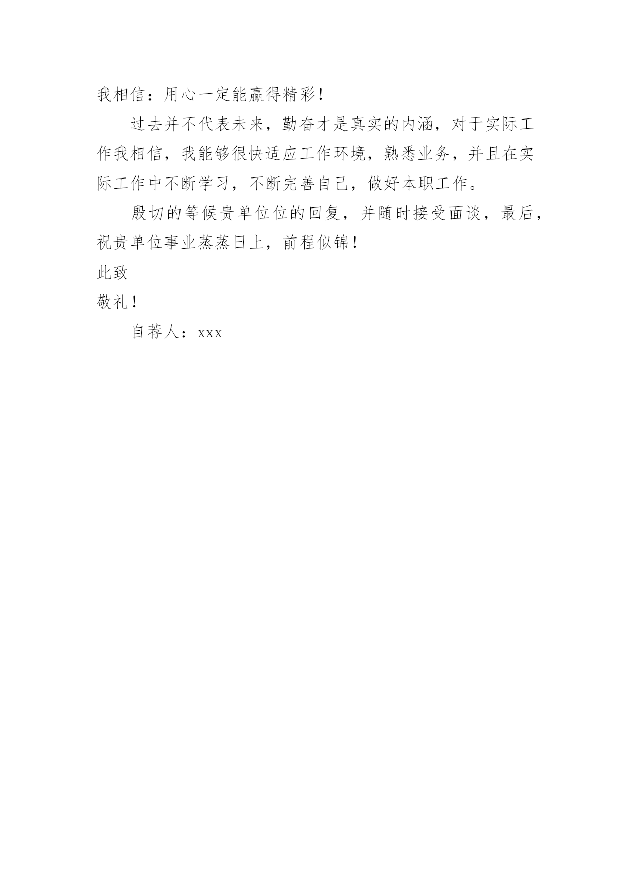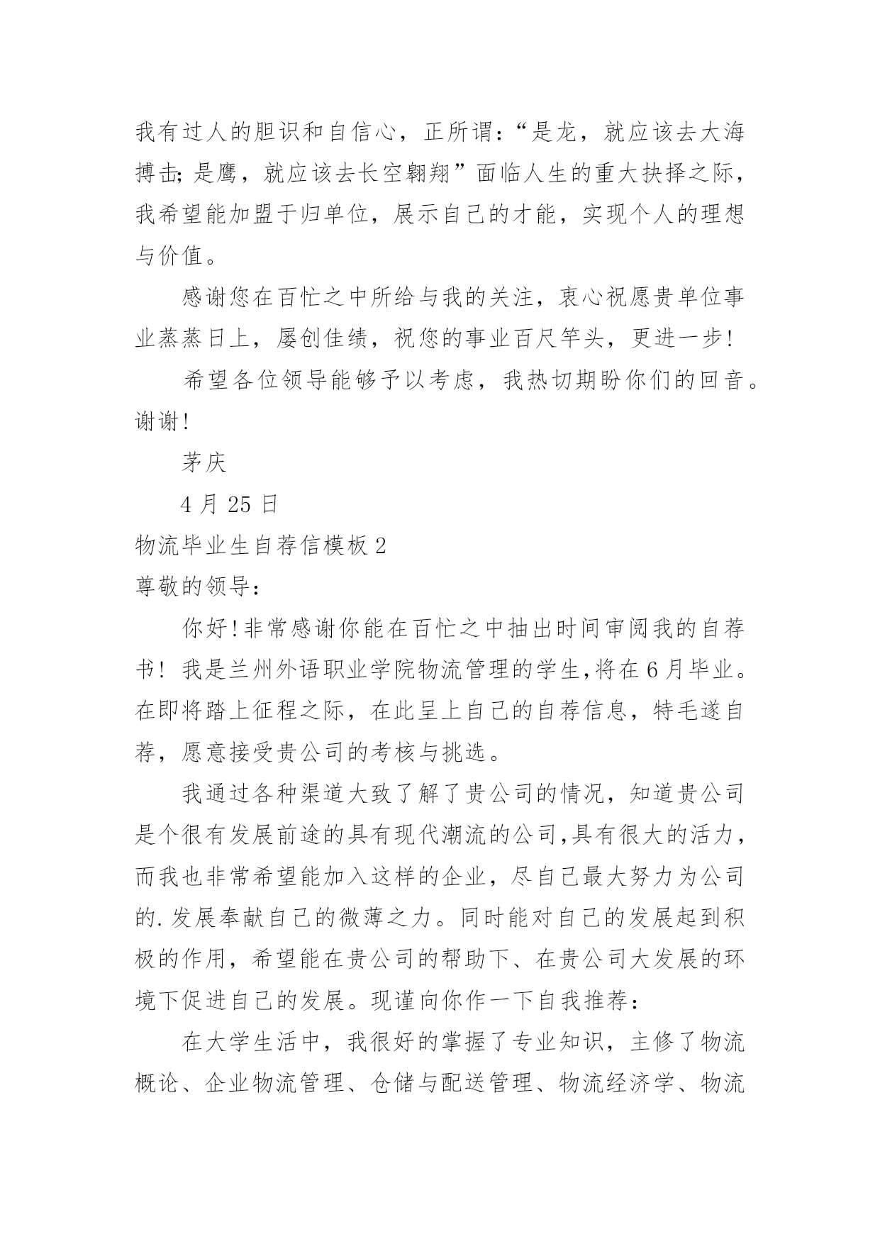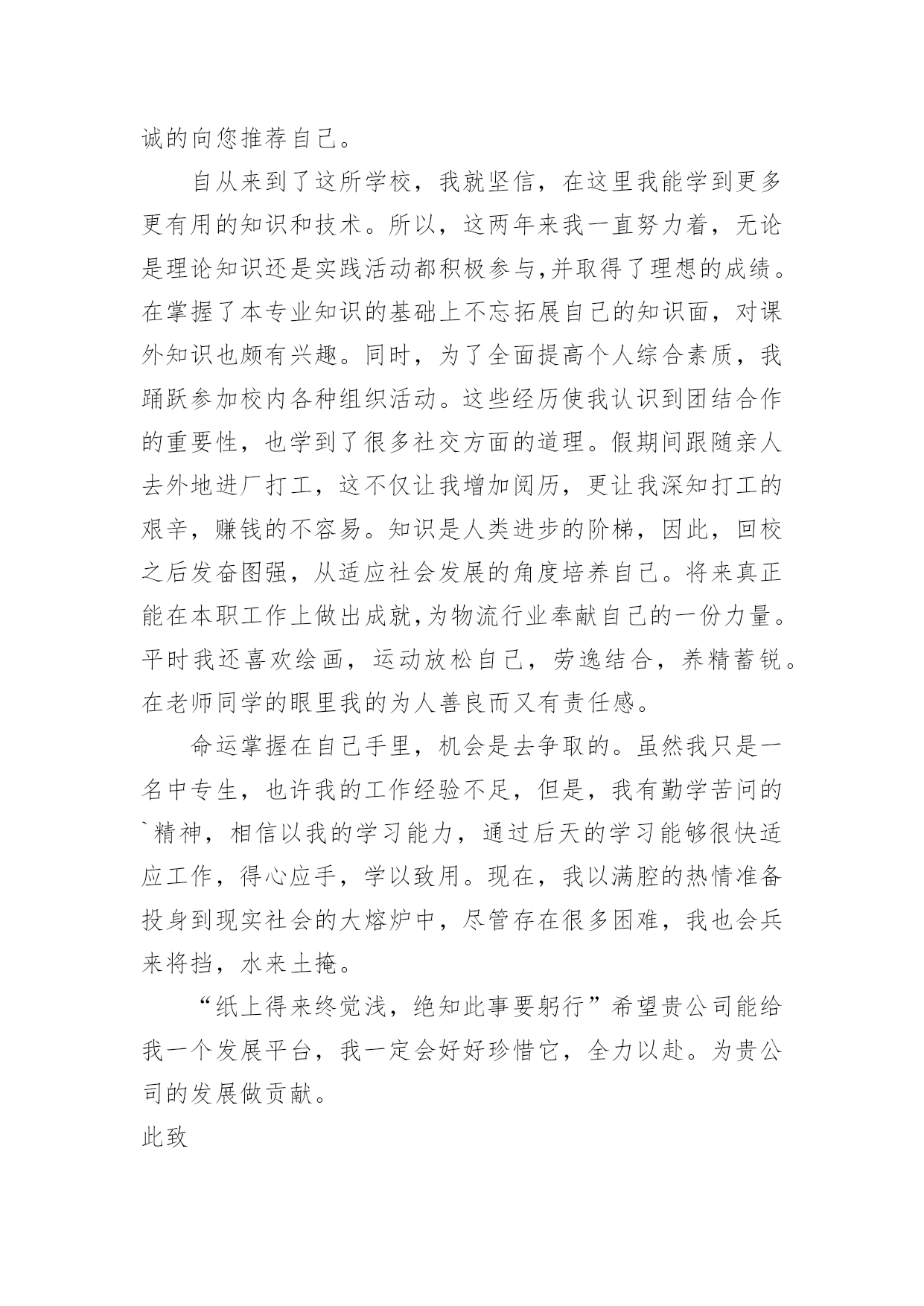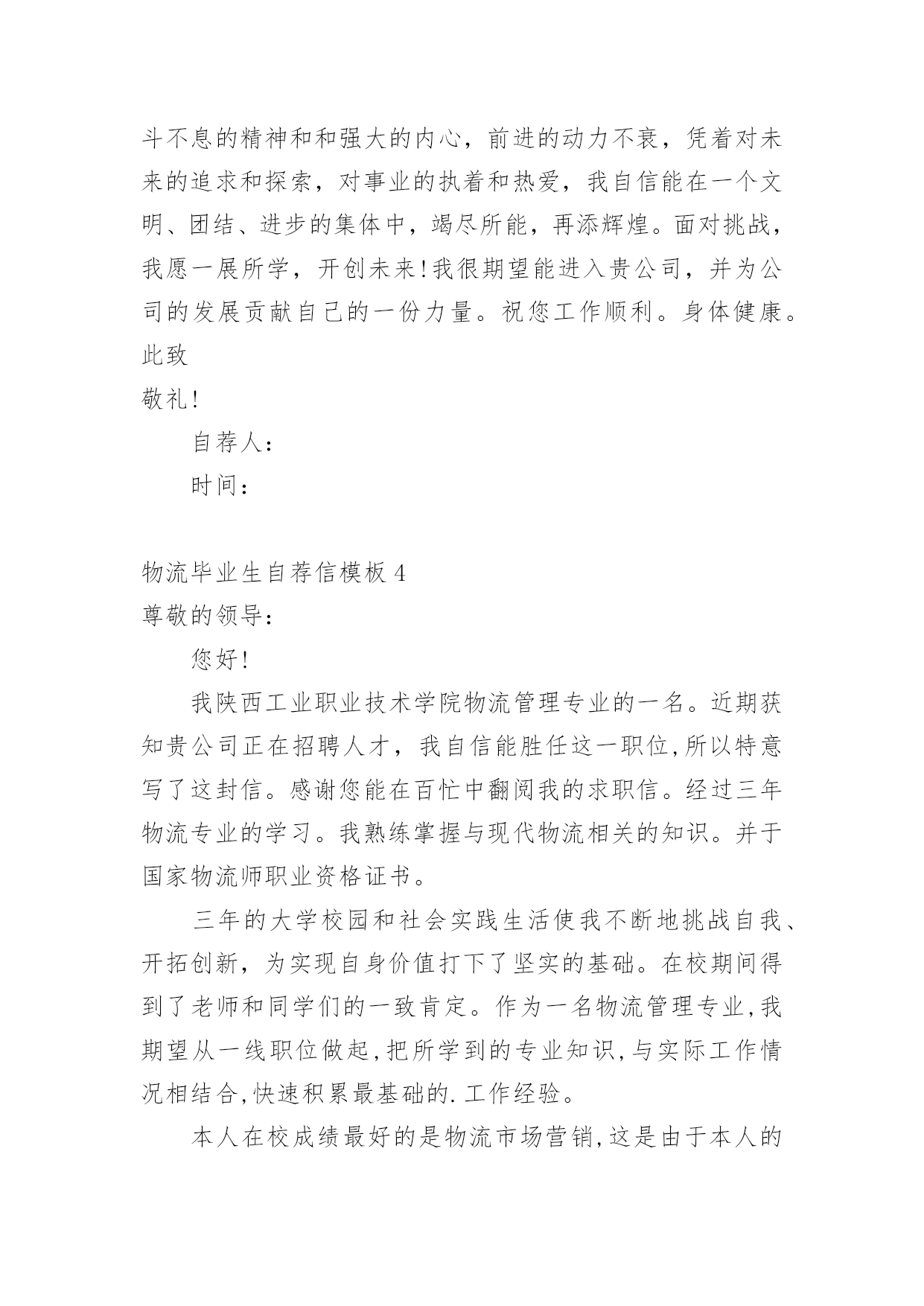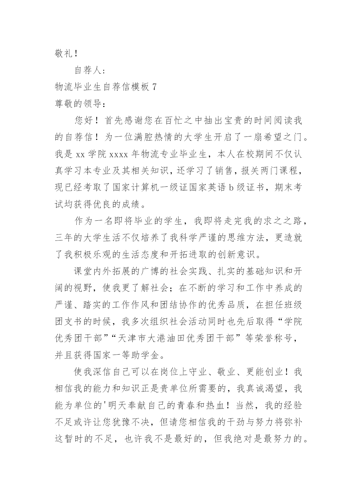 物流毕业生自荐信物流毕业生自荐信模板在如今这个时代,自荐信的使用频率越来越高,我们在写自荐信的时候可以注意一些写作要诀。相信大家又在为写自荐信犯愁了吧!以下是小编精心整理的物流毕业生自荐信模板,供大家参考借鉴,希望可以帮助到有需要的朋友。物流毕业生自荐信模板1尊敬的领导:您好!请恕打扰!我是一名即将从江苏建筑职业技术学院物流管理专业毕业的大学生。我很荣幸有机会向您呈上我的个人资料。在投身社会之际,为了找到符合自己专业和兴趣的工作,更好地发挥自己的才能,实现自己的人生价值,谨向各位领导做一自我推荐。在三年的学习生活中,在学校期间,我不断积极进取,立足基础扎实,努力学习专业知识,成绩优异,积极参与学校组织的各种活动,同时也得到老师和同学们的认可,作为的毕业生,在这样一个竞争激烈的社会里,不仅要掌握好专业知识,更加做到与社会与时代接轨。因此,学习之余,我注重知识与能力的平衡发展。在学校工作中,加强锻炼处世能力,学习管理知识,吸收管理经验。未踏出校门的我谈不上十分的成熟和足够的.经验,但我有过人的胆识和自信心,正所谓:“是龙,就应该去大海搏击;是鹰,就应该去长空翱翔”面临人生的重大抉择之际,我希望能加盟于归单位,展示自己的才能,实现个人的理想与价值。感谢您在百忙之中所给与我的关注,衷心祝愿贵单位事业蒸蒸日上,屡创佳绩,祝您的事业百尺竿头,更进一步!希望各位领导能够予以考虑,我热切期盼你们的回音。谢谢!茅庆4月25日物流毕业生自荐信模板2尊敬的领导:你好!非常感谢你能在百忙之中抽出时间审阅我的自荐书!我是兰州外语职业学院物流管理的学生,将在6月毕业。在即将踏上征程之际,在此呈上自己的自荐信息,特毛遂自荐,愿意接受贵公司的考核与挑选。我通过各种渠道大致了解了贵公司的情况,知道贵公司是个很有发展前途的具有现代潮流的公司,具有很大的活力,而我也非常希望能加入这样的企业,尽自己最大努力为公司的.发展奉献自己的微薄之力。同时能对自己的发展起到积极的作用,希望能在贵公司的帮助下、在贵公司大发展的环境下促进自己的发展。现谨向你作一下自我推荐:在大学生活中,我很好的掌握了专业知识,主修了物流概论、企业物流管理、仓储与配送管理、物流经济学、物流信息管理、供应链管理、运输实务管理、电子商务、财务会计、数据库、市场营销等课程,并都取得了较为优秀的成绩。21世纪呼唤综合性人才我知道光是有好的理论知识是不够的。所以在学有余力的情况下我一直积极参与社会实践活动积极配合老师的工作,课余时间,在一惟单位兼职,业绩突出受到领导的高度赞扬。伴着青春的激情和求知的欲望,我即将走完三年的求知之旅,美好的大学生活,培养了我科学严谨的思维方法,更造就了我积极乐观的生活态度和开拓进取的创新意识。在不断的学习和工作中我更养成了严谨、踏实的工作作风和团结协作的优秀品质。大学期间,我取得了一定的成绩,然而这已成为过去;面对当今激烈的人才竞争,我很清楚自己知识有限,但我更清楚我有着不甘落后的精神和不断学习、不断提高的愿望。乐于进取、不怕挫折是我的人生信条,给我一次机会,让我去实践、去闯、去干,因为能力要在实践中培养,也终究要在实践中体险辏我深信自己完全可以在岗位上守业、敬业、更能创业!我相信我的能力和知识正是贵单位所需要的,我真诚渴望,我能为单位的明天奉献自己的青春和热血!愿贵单位事业蒸蒸日上,蓬勃发展!静盼你的佳音!此致敬礼!xxX物流毕业生自荐信模板3尊敬的领导:您好!首先感谢您在百忙之中抽出时间来阅读我的自荐材料。新世纪,风云际会,机会与挑战,两相并存。我是一名即将毕业的大二学生,现需要一份工作来完善我的大学生涯。大学两年,在学习上我全身心投入到本专业物流管理的学习中外,还学习了感兴趣的心理知识,课余时间基本都在图书馆阅读喜欢的书籍,从中找寻读书的乐趣。此外,我还积极地参加各种社会活动,加入院学生会学习部、校文学社、校英文广播电台等社团,结交了许多值得相互学习的同学,赢得了人生又一笔宝贵的财富。此外,在服务他人的同时积极培养了自己的社交能力,抓住每一个机会,锻炼自己。大学两年,我深深地感受到,与优秀学生共事,能使我在竞争中获益;向实际困难挑战,让我在挫折中成长。祖辈们教我勤奋、尽责、善良、正直;黄冈职业技术学院培养了我崇德、强能、务实、创新的'的良好信念。我热爱贵公司所从事的事业,殷切地期望能够在您的领导下,为这一光荣的事业添砖加瓦,且能有机会继续从各方面提升自己。我没有过人的优势,只有一颗真诚的心和一副勤劳的身躯,两年中我养成早睡早起的良好作息习惯。在书本与社会实践中制造完善自我的机会。从学校到社会,我知道有一个成长的过程。但这个乘风破浪的时代需要我们勇敢向前,无所畏惧。我相信只要有奋斗不息的精神和和强大的内心,前进的动力不衰,凭着对未来的追求和探索,对事业的执着和热爱,我自信