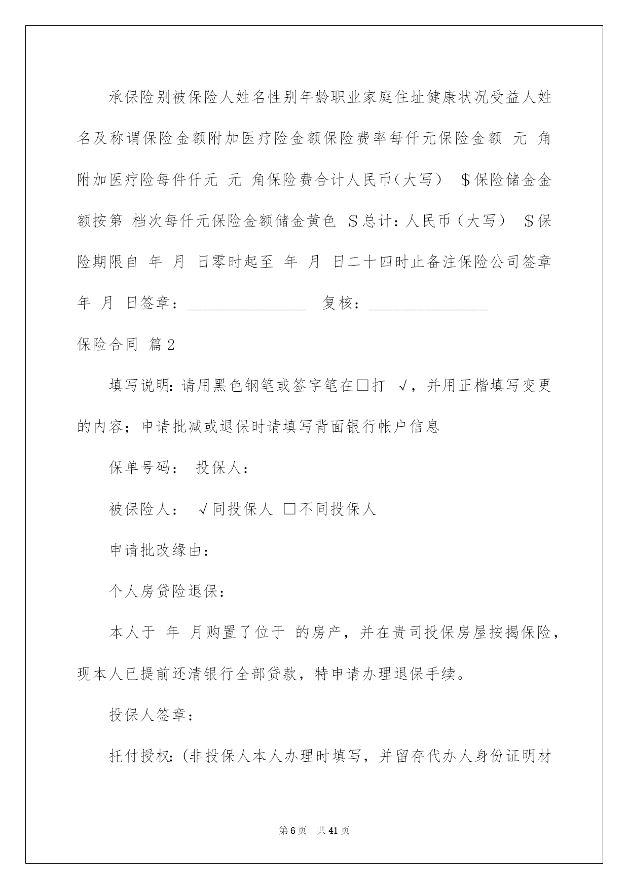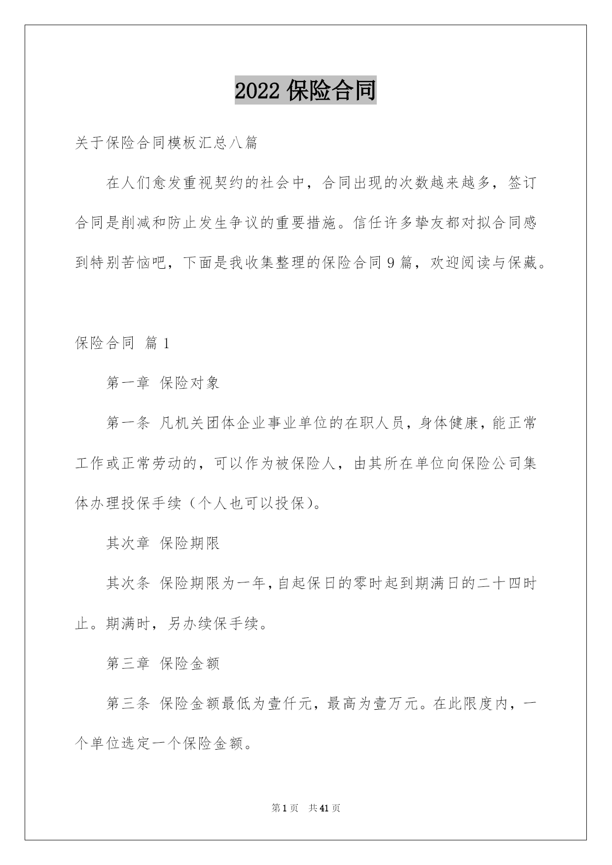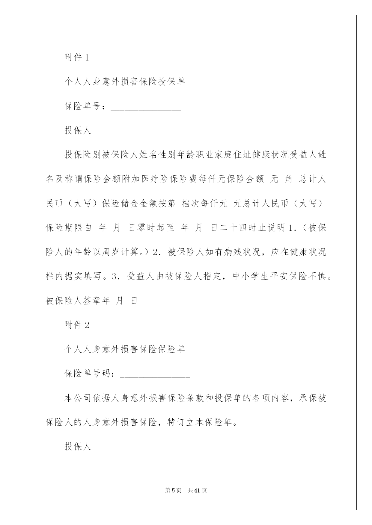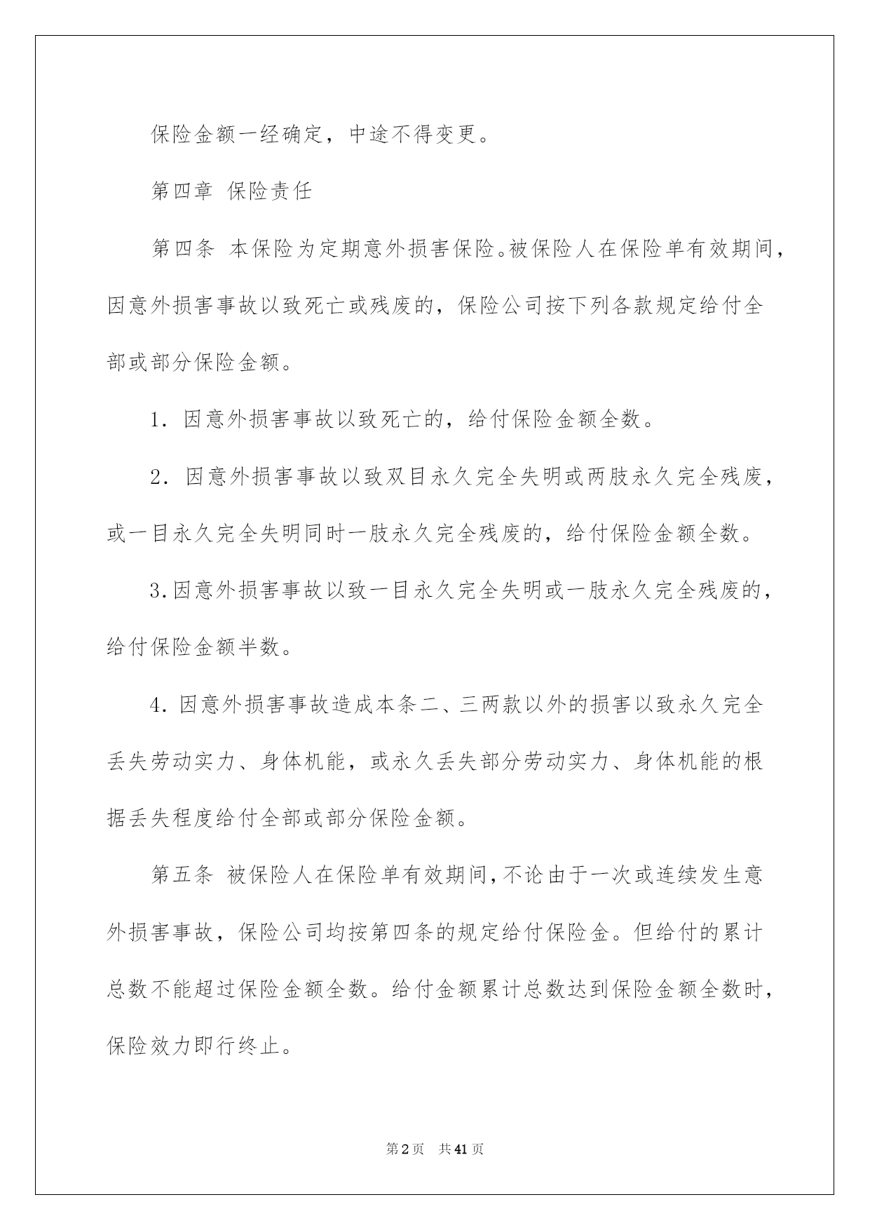 第PAGE\*Arabic\*MERGEFORMAT41页共NUMPAGES\*Arabic\*MERGEFORMAT41页第PAGE\*MERGEFORMAT41页共NUMPAGES\*MERGEFORMAT41页第PAGE\*MERGEFORMAT41页共NUMPAGES\*MERGEFORMAT41页第PAGE\*MERGEFORMAT41页共NUMPAGES\*MERGEFORMAT41页第PAGE\*MERGEFORMAT41页共NUMPAGES\*MERGEFORMAT41页第PAGE\*MERGEFORMAT41页共NUMPAGES\*MERGEFORMAT41页第PAGE\*MERGEFORMAT41页共NUMPAGES\*MERGEFORMAT41页第PAGE\*MERGEFORMAT41页共NUMPAGES\*MERGEFORMAT41页第PAGE\*MERGEFORMAT41页共NUMPAGES\*MERGEFORMAT41页第PAGE\*MERGEFORMAT41页共NUMPAGES\*MERGEFORMAT41页第PAGE\*MERGEFORMAT41页共NUMPAGES\*MERGEFORMAT41页2022保险合同关于保险合同模板汇总八篇在人们愈发重视契约的社会中,合同出现的次数越来越多,签订合同是削减和防止发生争议的重要措施。信任许多挚友都对拟合同感到特别苦恼吧,下面是我收集整理的保险合同9篇,欢迎阅读与保藏。保险合同篇1第一章保险对象第一条凡机关团体企业事业单位的在职人员,身体健康,能正常工作或正常劳动的,可以作为被保险人,由其所在单位向保险公司集体办理投保手续(个人也可以投保)。其次章保险期限其次条保险期限为一年,自起保日的零时起到期满日的二十四时止。期满时,另办续保手续。第三章保险金额第三条保险金额最低为壹仟元,最高为壹万元。在此限度内,一个单位选定一个保险金额。保险金额一经确定,中途不得变更。第四章保险责任第四条本保险为定期意外损害保险。被保险人在保险单有效期间,因意外损害事故以致死亡或残废的,保险公司按下列各款规定给付全部或部分保险金额。1.因意外损害事故以致死亡的,给付保险金额全数。2.因意外损害事故以致双目永久完全失明或两肢永久完全残废,或一目永久完全失明同时一肢永久完全残废的,给付保险金额全数。3.因意外损害事故以致一目永久完全失明或一肢永久完全残废的,给付保险金额半数。4.因意外损害事故造成本条二、三两款以外的损害以致永久完全丢失劳动实力、身体机能,或永久丢失部分劳动实力、身体机能的根据丢失程度给付全部或部分保险金额。第五条被保险人在保险单有效期间,不论由于一次或连续发生意外损害事故,保险公司均按第四条的规定给付保险金。但给付的累计总数不能超过保险金额全数。给付金额累计总数达到保险金额全数时,保险效力即行终止。第五章除外责任第六条由于下列缘由所致被保险人的死亡或残废,保险公司不负给付保险金的责任;1.被保险人的自杀或犯罪行为;2.被保险人或其受益人的有意或诈骗行为;3.斗争或军事行动;4.被保险人因疾病死亡或残废。第七条被保险人因意外伤残所支出的医疗和医药等项费用,保险公司不负给付责任。第六章保险费率第八条保险费率依据行业(工种)或工作性质分别订定。第七章保险手续和保险费的缴付第九条投保时,投保单位应填写投保单一份和全体被保险人名单一式三份,经保险公司核定承保后签发保险单。第十条被保险人在投保时,可以指定受益人,假如没有指定受益人,以法定继承人为受益人。第十一条在保险单有效期间,投保单位如因人员变动,须要加保或退保,或因被保险人要求变更受益人,应填写变动通知单一式三份,送交保险公司据以签发批单,作为保险单的附件。被保险人中途离职,不论已否办理批改手续,均自离职之日起丢失保险效力,保险公司应退还已缴的未到期保险费。第十二条投保单位应在保险起保日一次缴清保险费,有特殊约定的可分期缴费。保险公司于收到保险费后,保险单起先生效。分期缴费的,如在约定期限内不能交付时,保险单即行失效。第八章保险金的申请和给付第十三条被保险人在保险单有效期间,发生保险责任范围内的死亡或残废时,被保险人或其受益人应通过投保单位向保险公司申请给付保险金,并供应下列单证:1.保险单证及投保单位的证明;2.被保险人死亡时,应供应死亡证明书;3.被保险人因意外损害事故造成残废时,应供应治疗医院出具的残废程度证明。保险公司接到申请后,经过调查核实,按规定给付保险金。假如从伤亡事故发生日起经过足二年不提出申请,即作为自动放弃权益。附件1个人人身意外损害保险投保单保险