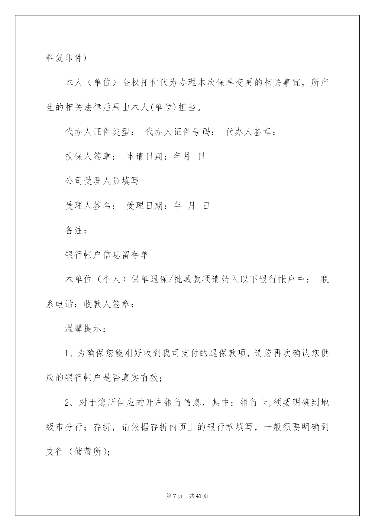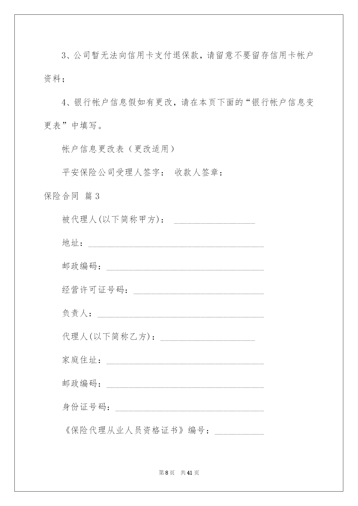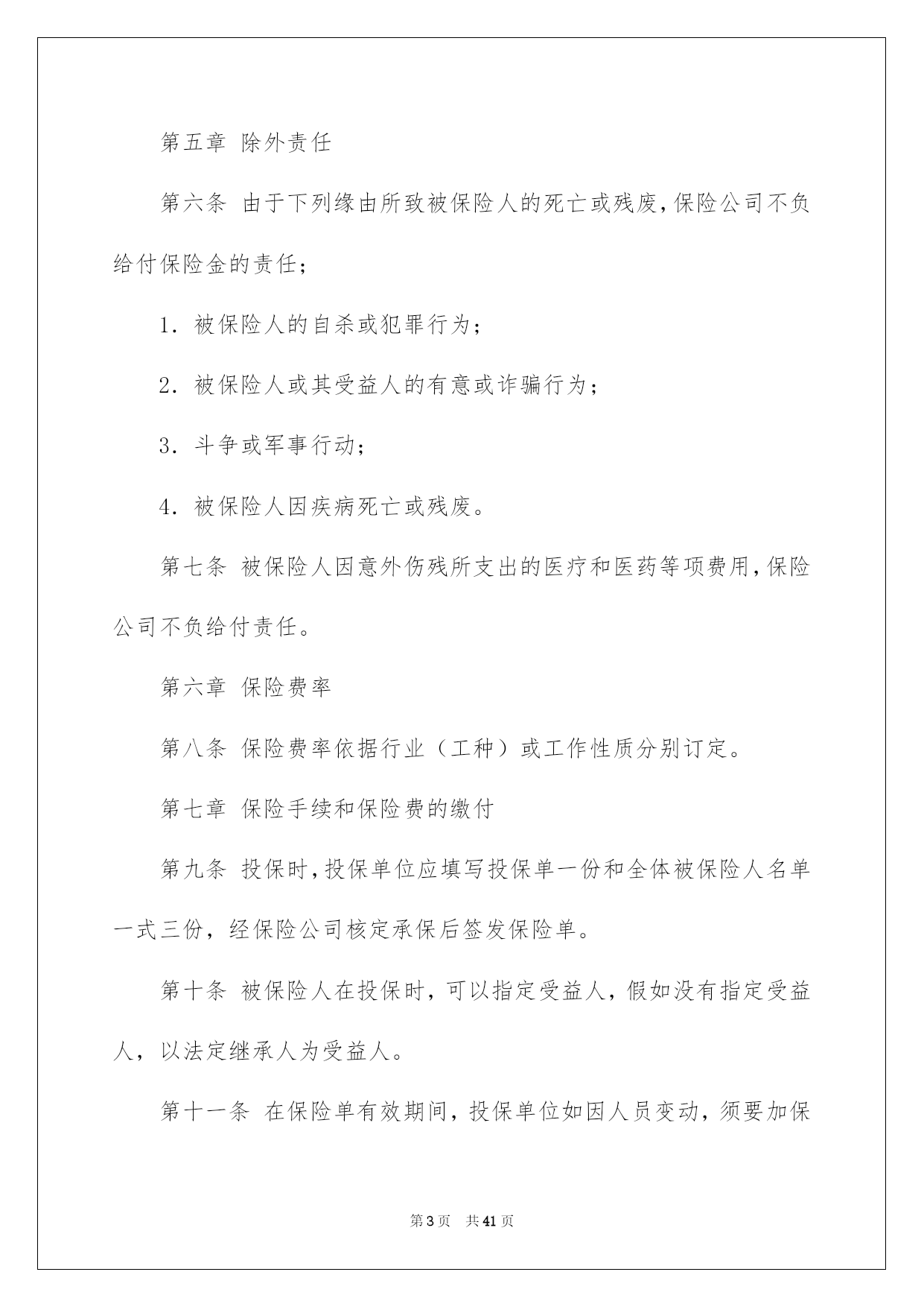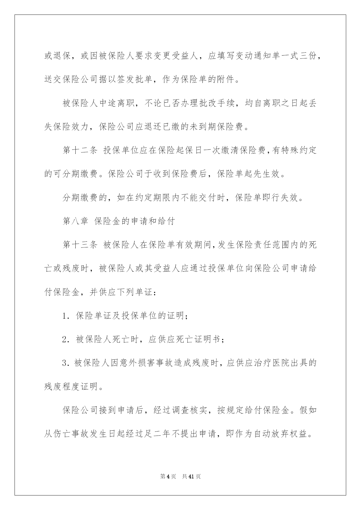 第PAGE\*Arabic\*MERGEFORMAT41页共NUMPAGES\*Arabic\*MERGEFORMAT41页第PAGE\*MERGEFORMAT41页共NUMPAGES\*MERGEFORMAT41页第PAGE\*MERGEFORMAT41页共NUMPAGES\*MERGEFORMAT41页第PAGE\*MERGEFORMAT41页共NUMPAGES\*MERGEFORMAT41页第PAGE\*MERGEFORMAT41页共NUMPAGES\*MERGEFORMAT41页第PAGE\*MERGEFORMAT41页共NUMPAGES\*MERGEFORMAT41页第PAGE\*MERGEFORMAT41页共NUMPAGES\*MERGEFORMAT41页第PAGE\*MERGEFORMAT41页共NUMPAGES\*MERGEFORMAT41页第PAGE\*MERGEFORMAT41页共NUMPAGES\*MERGEFORMAT41页第PAGE\*MERGEFORMAT41页共NUMPAGES\*MERGEFORMAT41页第PAGE\*MERGEFORMAT41页共NUMPAGES\*MERGEFORMAT41页2022保险合同关于保险合同模板汇总八篇在人们愈发重视契约的社会中,合同出现的次数越来越多,签订合同是削减和防止发生争议的重要措施。信任许多挚友都对拟合同感到特别苦恼吧,下面是我收集整理的保险合同9篇,欢迎阅读与保藏。保险合同篇1第一章保险对象第一条凡机关团体企业事业单位的在职人员,身体健康,能正常工作或正常劳动的,可以作为被保险人,由其所在单位向保险公司集体办理投保手续(个人也可以投保)。其次章保险期限其次条保险期限为一年,自起保日的零时起到期满日的二十四时止。期满时,另办续保手续。第三章保险金额第三条保险金额最低为壹仟元,最高为壹万元。在此限度内,一个单位选定一个保险金额。保险金额一经确定,中途不得变更。第四章保险责任第四条本保险为定期意外损害保险。被保险人在保险单有效期间,因意外损害事故以致死亡或残废的,保险公司按下列各款规定给付全部或部分保险金额。1.因意外损害事故以致死亡的,给付保险金额全数。2.因意外损害事故以致双目永久完全失明或两肢永久完全残废,或一目永久完全失明同时一肢永久完全残废的,给付保险金额全数。3.因意外损害事故以致一目永久完全失明或一肢永久完全残废的,给付保险金额半数。4.因意外损害事故造成本条二、三两款以外的损害以致永久完全丢失劳动实力、身体机能,或永久丢失部分劳动实力、身体机能的根据丢失程度给付全部或部分保险金额。第五条被保险人在保险单有效期间,不论由于一次或连续发生意外损害事故,保险公司均按第四条的规定给付保险金。但给付的累计总数不能超过保险金额全数。给付金额累计总数达到保险金额全数时,保险效力即行终止。第五章除外责任第六条由于下列缘由所致被保险人的死亡或残废,保险公司不负给付保险金的责任;1.被保险人的自杀或犯罪行为;2.被保险人或其受益人的有意或诈骗行为;3.斗争或军事行动;4.被保险人因疾病死亡或残废。第七条被保险人因意外伤残所支出的医疗和医药等项费用,保险公司不负给付责任。第六章保险费率第八条保险费率依据行业(工种)或工作性质分别订定。第七章保险手续和保险费的缴付第九条投保时,投保单位应填写投保单一份和全体被保险人名单一式三份,经保险公司核定承保后签发保险单。第十条被保险人在投保时,可以指定受益人,假如没有指定受益人,以法定继承人为受益人。第十一条在保险单有效期间,投保单位如因人员变动,须要加保或退保,或因被保险人要求变更受益人,应填写变动通知单一式三份,送交保险公司据以签发批单,作为保险单的附件。被保险人中途离职,不论已否办理批改手续,均自离职之日起丢失保险效力,保险公司应退还已缴的未到期保险费。第十二条投保单位应在保险起保日一次缴清保险费,有特殊约定的可分期缴费。保险公司于收到保险费后,保险单起先生效。分期缴费的,如在约定期限内不能交付时,保险单即行失效。第八章保险金的申请和给付第十三条被保险人在保险单有效期间,发生保险责任范围内的死亡或残废时,被保险人或其受益人应通过投保单位向保险公司申请给付保险金,并供应下列单证:1.保险单证及投保单位的证明;2.被保险人死亡时,应供应死亡证明书;3.被保险人因意外损害事故造成残废时,应供应治疗医院出具的残废程度证明。保险公司接到申请后,经过调查核实,按规定给付保险金。假如从伤亡事故发生日起经过足二年不提出申请,即作为自动放弃权益。附件1个人人身意外损害保险投保单保险