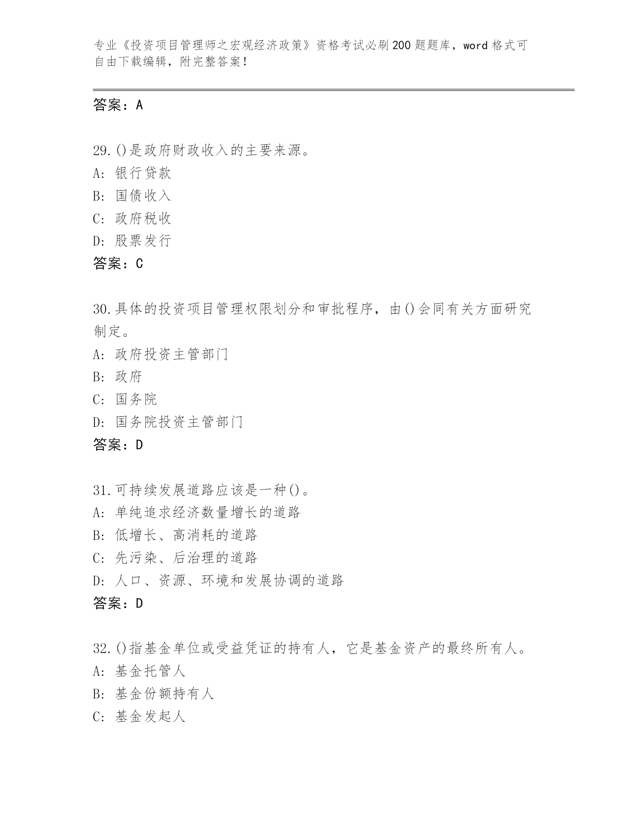 内部使用四川省郫县《投资项目管理师之宏观经济政策》资格考试必刷200题大全(有一套)