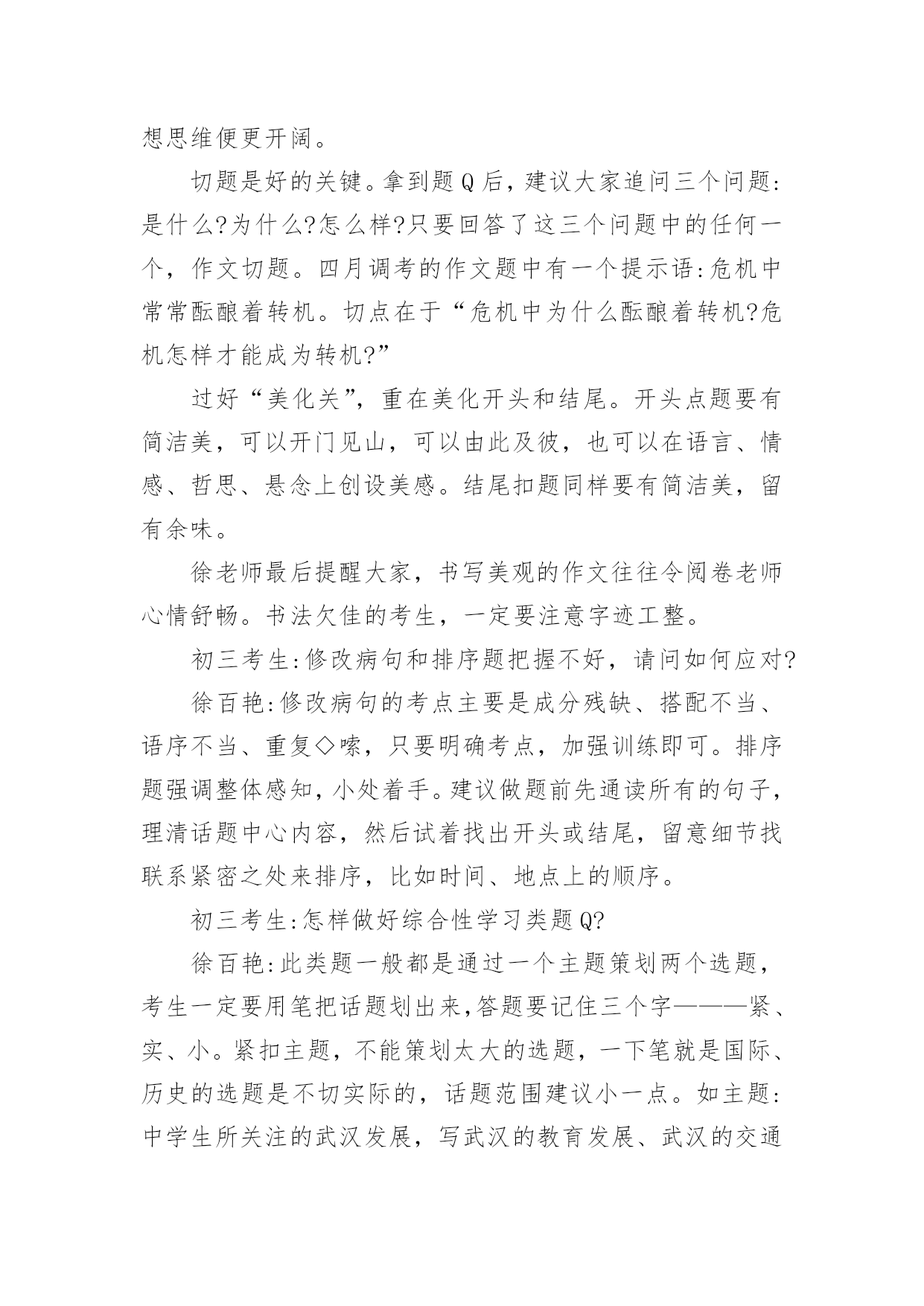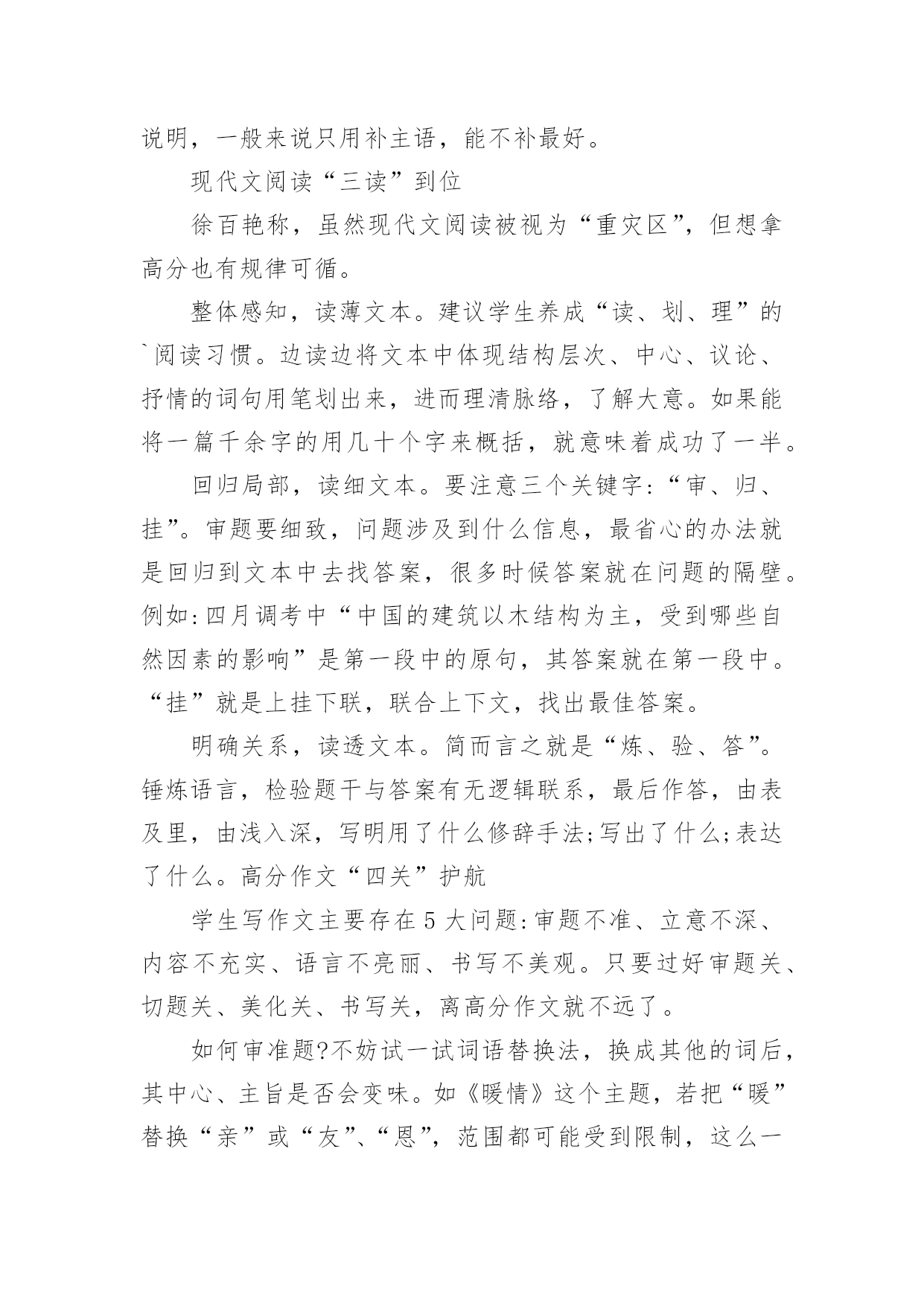 语文中考答题技巧揭示语文中考答题技巧揭示文言文扫除三大“拦路虎”文言文失分有三大“拦路虎”:一是画蛇添足,题Q只要求解释加点的字,有的学生拿不准,写了一层意思又补充写另一层意思,多写反而造成失分。二是虚以委蛇,遇到不会的字词来虚的,跳过不译,为了让句意通顺,自己换个说法。事实上,考生跳过的那个字可能恰恰就是得分点。三是主次不分,文言文一般短小精悍,可能涉及多个人和事,有的学生不加分析,仅凭主观判断,结果抓次漏主。徐老师建议:首先,文言文复习一要回归文本,重点是九年级语文(上、下)两册教材中的篇Q。中考虽然考的是课外材料,但考的所有字词均来自课内。对课本上有注解的字词一定要逐个“过关”。其次,集合两册教材中的通假字,加强了解、记忆。还要注意归纳古今异义的字词,在考试中如发现有与现代词语相同的词语如“妻子”、“交通”等,马上应该有所判断———其意义肯定不同于现代的解释。另外,一些特殊的句式要知道,较常见的有宾语前置,如“何罪之有”倒装过来就是“有何罪”。补语前置,如“躬耕于南阳”。徐老师说,很多学生最怕文言文翻译,其实翻译句子就是三个字:“变,调,补”。以单变双地把每个字都译出来,进行适当的语序调整,再串联起来,如果说不通就加点补充说明,一般来说只用补主语,能不补最好。现代文阅读“三读”到位徐百艳称,虽然现代文阅读被视为“重灾区”,但想拿高分也有规律可循。整体感知,读薄文本。建议学生养成“读、划、理”的`阅读习惯。边读边将文本中体现结构层次、中心、议论、抒情的词句用笔划出来,进而理清脉络,了解大意。如果能将一篇千余字的用几十个字来概括,就意味着成功了一半。回归局部,读细文本。要注意三个关键字:“审、归、挂”。审题要细致,问题涉及到什么信息,最省心的办法就是回归到文本中去找答案,很多时候答案就在问题的隔壁。例如:四月调考中“中国的建筑以木结构为主,受到哪些自然因素的影响”是第一段中的原句,其答案就在第一段中。“挂”就是上挂下联,联合上下文,找出最佳答案。明确关系,读透文本。简而言之就是“炼、验、答”。锤炼语言,检验题干与答案有无逻辑联系,最后作答,由表及里,由浅入深,写明用了什么修辞手法;写出了什么;表达了什么。高分作文“四关”护航学生写作文主要存在5大问题:审题不准、立意不深、内容不充实、语言不亮丽、书写不美观。只要过好审题关、切题关、美化关、书写关,离高分作文就不远了。如何审准题?不妨试一试词语替换法,换成其他的词后,其中心、主旨是否会变味。如《暖情》这个主题,若把“暖”替换“亲”或“友”、“恩”,范围都可能受到限制,这么一想思维便更开阔。切题是好的关键。拿到题Q后,建议大家追问三个问题:是什么?为什么?怎么样?只要回答了这三个问题中的任何一个,作文切题。四月调考的作文题中有一个提示语:危机中常常酝酿着转机。切点在于“危机中为什么酝酿着转机?危机怎样才能成为转机?”过好“美化关”,重在美化开头和结尾。开头点题要有简洁美,可以开门见山,可以由此及彼,也可以在语言、情感、哲思、悬念上创设美感。结尾扣题同样要有简洁美,留有余味。徐老师最后提醒大家,书写美观的作文往往令阅卷老师心情舒畅。书法欠佳的考生,一定要注意字迹工整。初三考生:修改病句和排序题把握不好,请问如何应对?徐百艳:修改病句的考点主要是成分残缺、搭配不当、语序不当、重复◇嗦,只要明确考点,加强训练即可。排序题强调整体感知,小处着手。建议做题前先通读所有的句子,理清话题中心内容,然后试着找出开头或结尾,留意细节找联系紧密之处来排序,比如时间、地点上的顺序。初三考生:怎样做好综合性学习类题Q?徐百艳:此类题一般都是通过一个主题策划两个选题,考生一定要用笔把话题划出来,答题要记住三个字———紧、实、小。紧扣主题,不能策划太大的选题,一下笔就是国际、历史的选题是不切实际的,话题范围建议小一点。如主题:中学生所关注的武汉发展,写武汉的教育发展、武汉的交通发展要比武汉的国际发展要好得多。