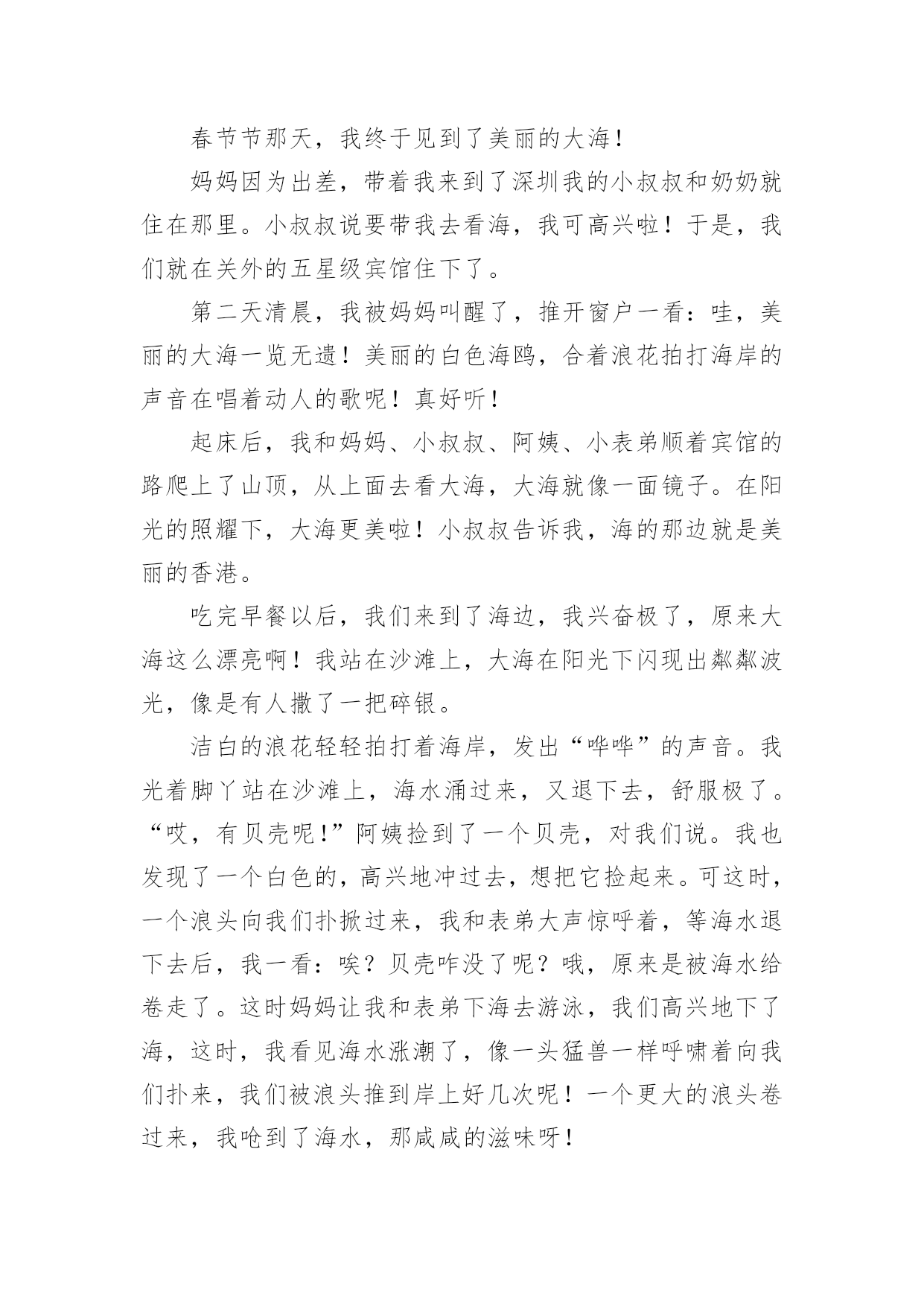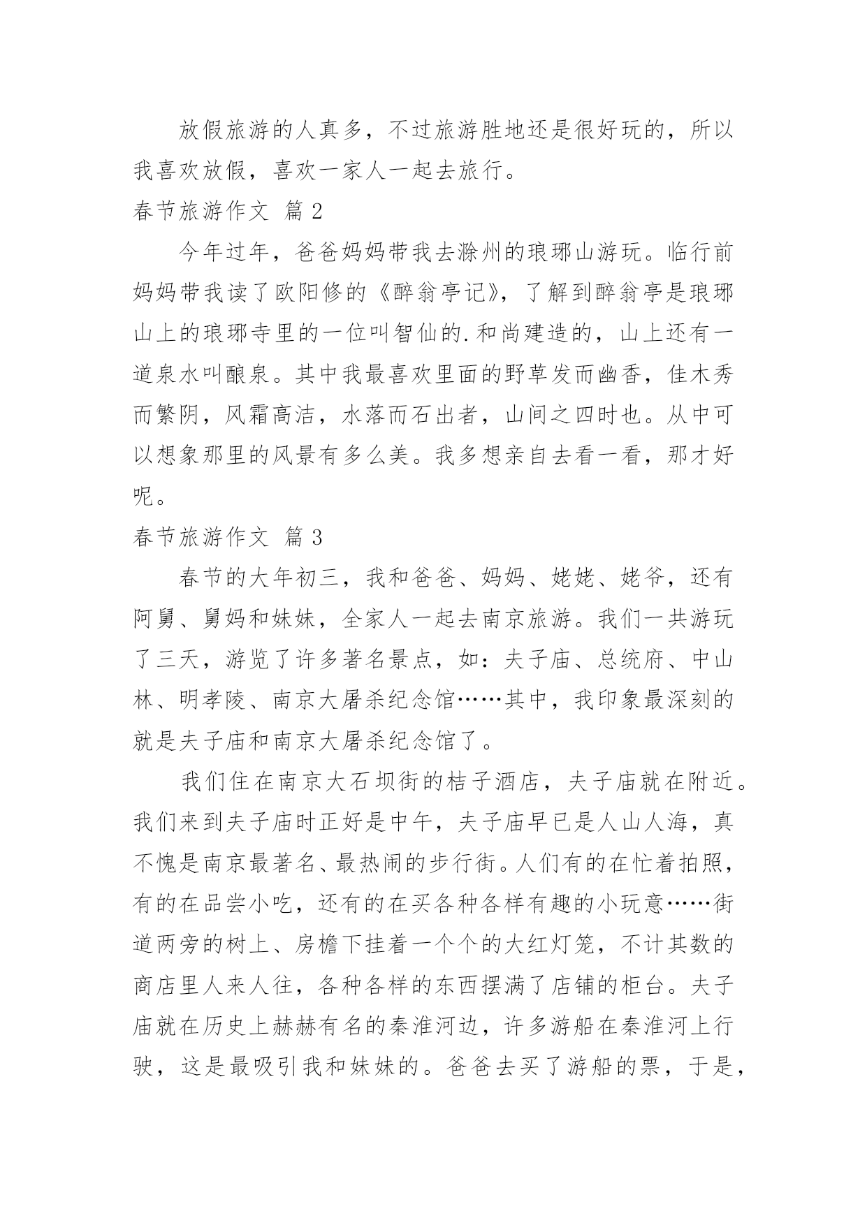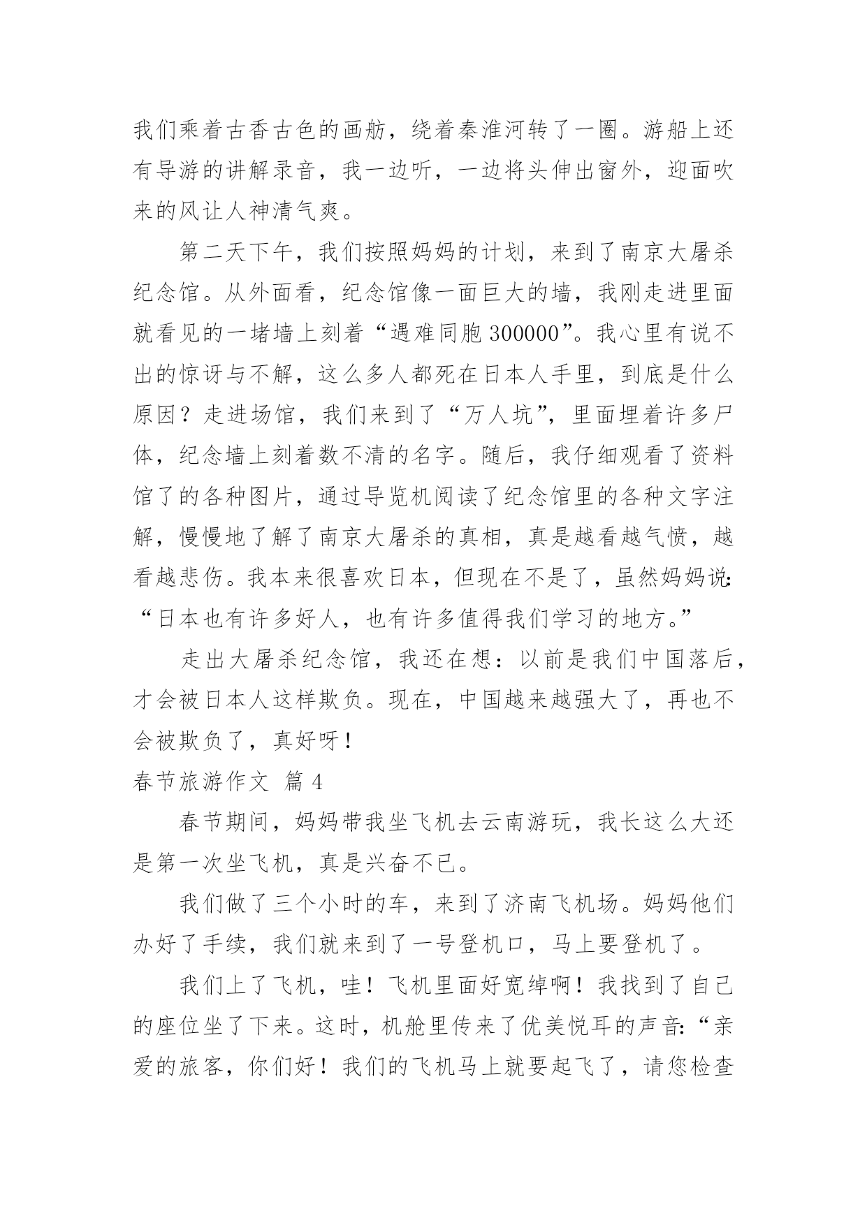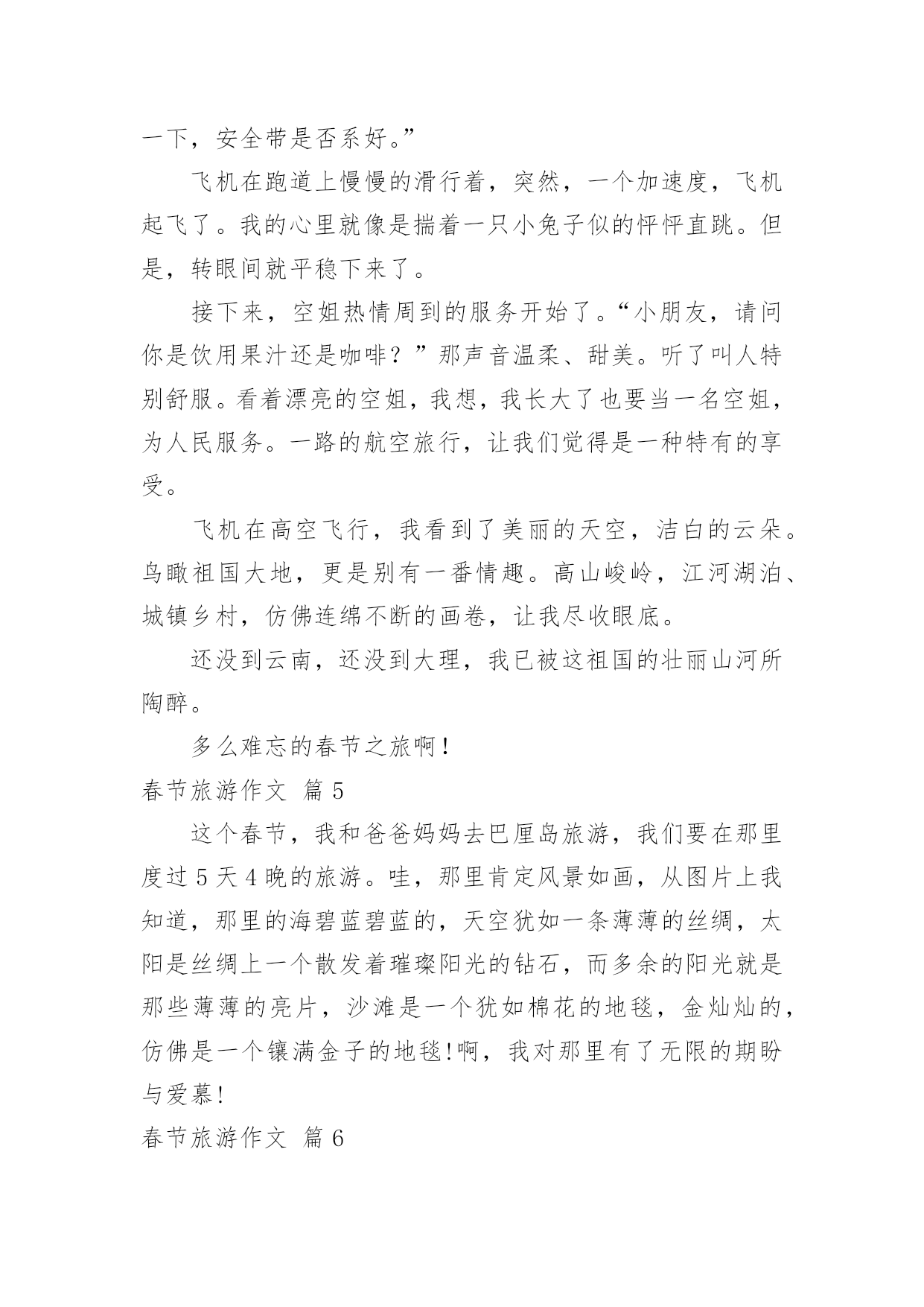 春节旅游作文春节旅游作文合集6篇在日常学习、工作抑或是生活中,大家都不可避免地要接触到作文吧,作文是经过人的思想考虑和语言组织,通过文字来表达一个主题意义的记叙方法。那么你知道一篇好的作文该怎么写吗?下面是小编精心整理的春节旅游作文6篇,仅供参考,欢迎大家阅读。春节旅游作文篇1春节爸爸妈妈也放假了,爸爸妈妈带我出去玩。一起去的有爸爸的朋友,还有我的好朋友薛歆璇跟她的姐姐,有他们陪我玩我很开心。第一天,我们来到了神仙居。爸爸说以前神仙居里面住着神仙,现在我们要进去看看神仙住过的地方是什么样子的。我跟我的朋友手牵着手高高兴兴的进去了。山很高很高,我们走的很快,大人都没我们走的快,后来妈妈走不动了还是我去扶着她一起走的。妈妈告诉我我们爬这座山用了三个多小时的时间。第二天,我们在横店。早上起来肚子痛,走也走不动,是爸爸背着我走的,后来阿丁叔叔给我吃了一颗药,这颗药真神奇,吃了以后我的肚子居然不痛了。我跟我的朋友玩的很开心,我们一起骑马,跟我妈妈一起拍照,晚上还看了火山爆发和暴雨山洪。放假旅游的人真多,不过旅游胜地还是很好玩的,所以我喜欢放假,喜欢一家人一起去旅行。春节旅游作文篇2今年过年,爸爸妈妈带我去滁州的琅琊山游玩。临行前妈妈带我读了欧阳修的《醉翁亭记》,了解到醉翁亭是琅琊山上的琅琊寺里的一位叫智仙的.和尚建造的,山上还有一道泉水叫酿泉。其中我最喜欢里面的野草发而幽香,佳木秀而繁阴,风霜高洁,水落而石出者,山间之四时也。从中可以想象那里的风景有多么美。我多想亲自去看一看,那才好呢。春节旅游作文篇3春节的大年初三,我和爸爸、妈妈、姥姥、姥爷,还有阿舅、舅妈和妹妹,全家人一起去南京旅游。我们一共游玩了三天,游览了许多著名景点,如:夫子庙、总统府、中山林、明孝陵、南京大屠杀纪念馆……其中,我印象最深刻的就是夫子庙和南京大屠杀纪念馆了。我们住在南京大石坝街的桔子酒店,夫子庙就在附近。我们来到夫子庙时正好是中午,夫子庙早已是人山人海,真不愧是南京最著名、最热闹的步行街。人们有的在忙着拍照,有的在品尝小吃,还有的在买各种各样有趣的小玩意……街道两旁的树上、房檐下挂着一个个的大红灯笼,不计其数的商店里人来人往,各种各样的东西摆满了店铺的柜台。夫子庙就在历史上赫赫有名的秦淮河边,许多游船在秦淮河上行驶,这是最吸引我和妹妹的。爸爸去买了游船的票,于是,我们乘着古香古色的画舫,绕着秦淮河转了一圈。游船上还有导游的讲解录音,我一边听,一边将头伸出窗外,迎面吹来的风让人神清气爽。第二天下午,我们按照妈妈的计划,来到了南京大屠杀纪念馆。从外面看,纪念馆像一面巨大的墙,我刚走进里面就看见的一堵墙上刻着“遇难同胞300000”。我心里有说不出的惊讶与不解,这么多人都死在日本人手里,到底是什么原因?走进场馆,我们来到了“万人坑”,里面埋着许多尸体,纪念墙上刻着数不清的名字。随后,我仔细观看了资料馆了的各种图片,通过导览机阅读了纪念馆里的各种文字注解,慢慢地了解了南京大屠杀的真相,真是越看越气愤,越看越悲伤。我本来很喜欢日本,但现在不是了,虽然妈妈说:“日本也有许多好人,也有许多值得我们学习的地方。”走出大屠杀纪念馆,我还在想:以前是我们中国落后,才会被日本人这样欺负。现在,中国越来越强大了,再也不会被欺负了,真好呀!春节旅游作文篇4春节期间,妈妈带我坐飞机去云南游玩,我长这么大还是第一次坐飞机,真是兴奋不已。我们做了三个小时的车,来到了济南飞机场。妈妈他们办好了手续,我们就来到了一号登机口,马上要登机了。我们上了飞机,哇!飞机里面好宽绰啊!我找到了自己的座位坐了下来。这时,机舱里传来了优美悦耳的声音:“亲爱的旅客,你们好!我们的飞机马上就要起飞了,请您检查一下,安全带是否系好。”飞机在跑道上慢慢的滑行着,突然,一个加速度,飞机起飞了。我的心里就像是揣着一只小兔子似的怦怦直跳。但是,转眼间就平稳下来了。接下来,空姐热情周到的服务开始了。“小朋友,请问你是饮用果汁还是咖啡?”那声音温柔、甜美。听了叫人特别舒服。看着漂亮的空姐,我想,我长大了也要当一名空姐,为人民服务。一路的航空旅行,让我们觉得是一种特有的享受。飞机在高空飞行,我看到了美丽的天空,洁白的云朵。鸟瞰祖国大地,更是别有一番情趣。高山峻岭,江河湖泊、城镇乡村,仿佛连绵不断的画卷,让我尽收眼底。还没到云南,还没到大理,我已被这祖国的壮丽山河所陶醉。多么难忘的春节之旅啊!春节旅游作文篇5这个春节,我和爸爸妈妈去巴厘岛旅游,我们要在那里度过5天4晚的旅游。哇,那里肯定风景如画,从图片上我知道,那里的海碧蓝碧蓝的,天空犹如一条薄薄的丝绸,太阳是丝绸上一个散发着璀璨阳光的钻石,而多余的阳光就是那些薄薄的亮片,沙滩是一个犹如棉花的地毯,金灿灿的,仿佛是一个镶满金子的地毯!啊,我对那里有了无限的期盼与爱慕!春节旅游作