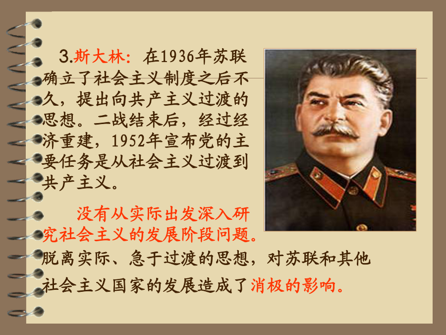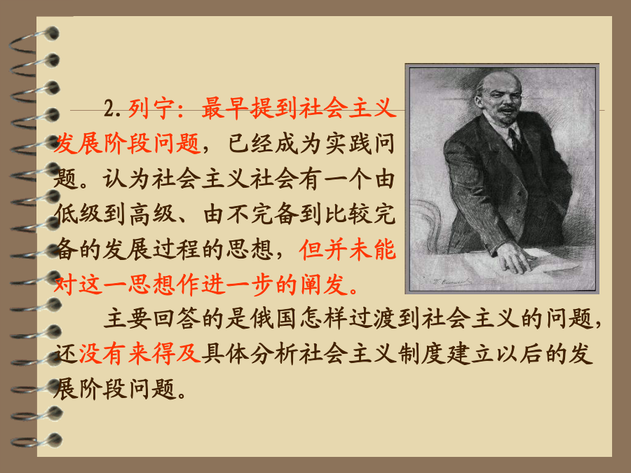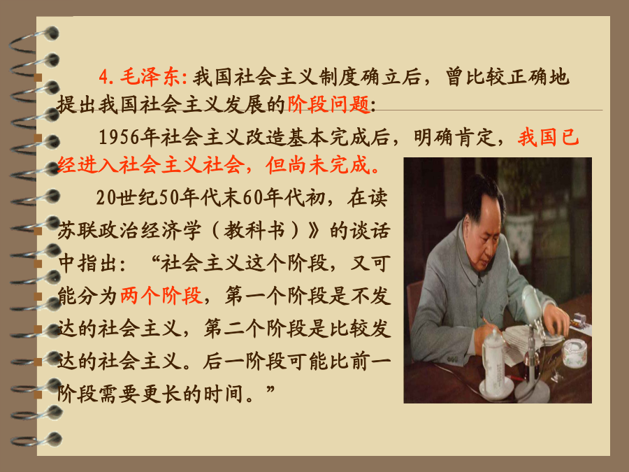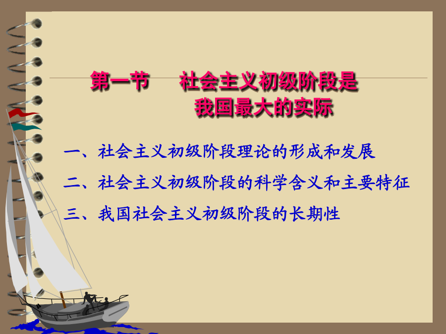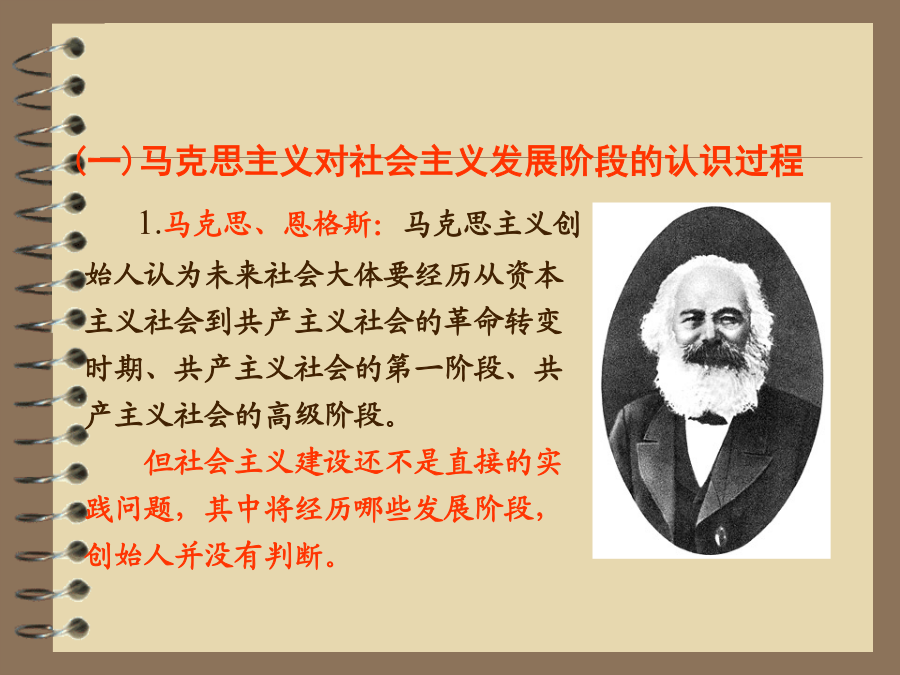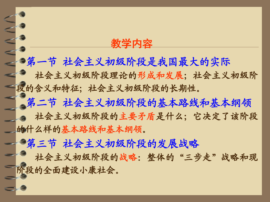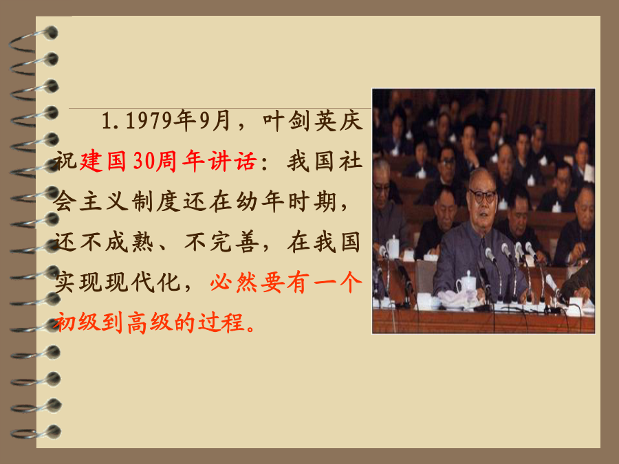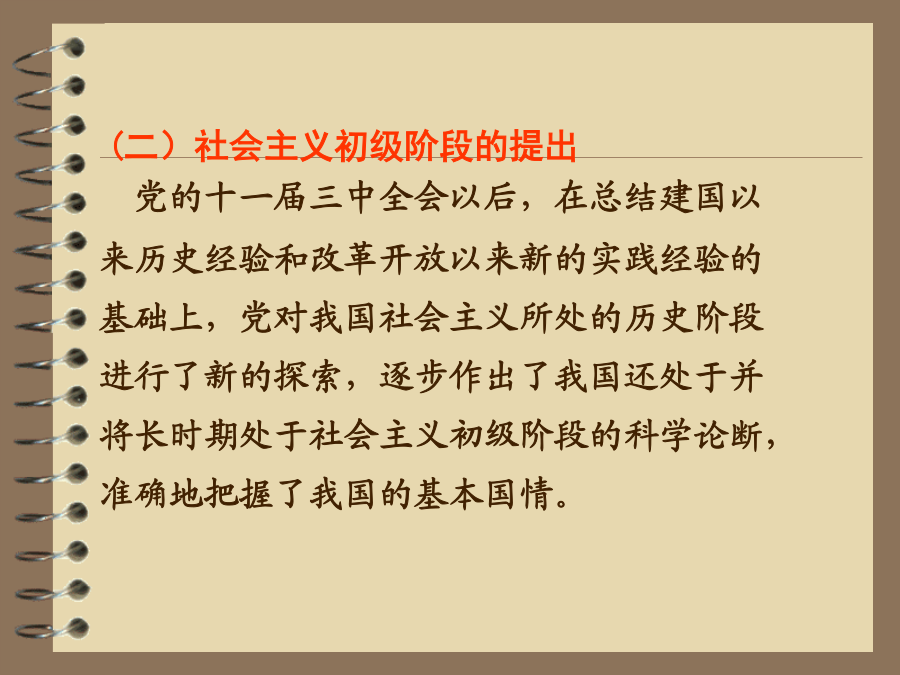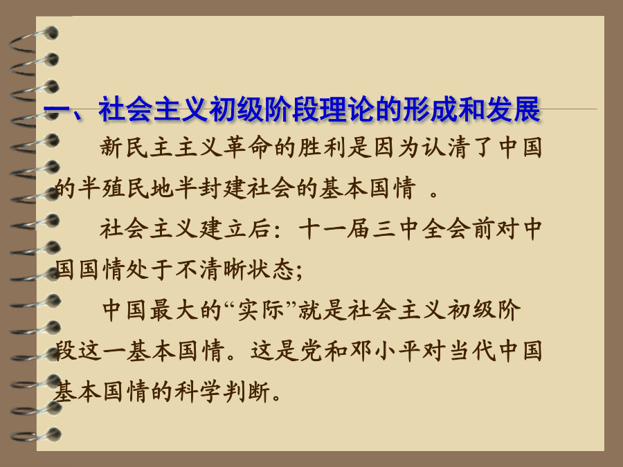 第一节社会主义初级阶段是我国最大的实际社会主义初级阶段理论的形成和发展;社会主义初级阶段的含义和特征;社会主义初级阶段的长期性。第二节社会主义初级阶段的基本路线和基本纲领社会主义初级阶段的主要矛盾是什么;它决定了该阶段的什么样的基本路线和基本纲领。第三节社会主义初级阶段的发展战略社会主义初级阶段的战略:整体的“三步走”战略和现阶段的全面建设小康社会。第一节社会主义初级阶段是我国最大的实际一、社会主义初级阶段理论的形成和发展1.马克思、恩格斯:马克思主义创始人认为未来社会大体要经历从资本主义社会到共产主义社会的革命转变时期、共产主义社会的第一阶段、共产主义社会的高级阶段。但社会主义建设还不是直接的实践问题,其中将经历哪些发展阶段,创始人并没有判断。2.列宁:最早提到社会主义发展阶段问题,已经成为实践问题。认为社会主义社会有一个由低级到高级、由不完备到比较完备的发展过程的思想,但并未能对这一思想作进一步的阐发。3.斯大林:在1936年苏联确立了社会主义制度之后不久,提出向共产主义过渡的思想。二战结束后,经过经济重建,1952年宣布党的主要任务是从社会主义过渡到共产主义。没有从实际出发深入研究社会主义的发展阶段问题。4.毛泽东:我国社会主义制度确立后,曾比较正确地提出我国社会主义发展的阶段问题:1956年社会主义改造基本完成后,明确肯定,我国已经进入社会主义社会,但尚未完成。20世纪50年代末60年代初,在读苏联政治经济学(教科书)》的谈话中指出:“社会主义这个阶段,又可能分为两个阶段,第一个阶段是不发达的社会主义,第二个阶段是比较发达的社会主义。后一阶段可能比前一阶段需要更长的时间。”党的十一届三中全会以后,在总结建国以来历史经验和改革开放以来新的实践经验的基础上,党对我国社会主义所处的历史阶段进行了新的探索,逐步作出了我国还处于并将长时期处于社会主义初级阶段的科学论断,准确地把握了我国的基本国情。1.1979年9月,叶剑英庆祝建国30周年讲话:我国社会主义制度还在幼年时期,还不成熟、不完善,在我国实现现代化,必然要有一个初级到高级的过程。2.1981年6月,党的十一届六中全会,《关于建国以来党的若干历史问题的决议》,第一次提出我国社会主义制度还处于初级的阶段.3.1982年党的十二大报告对这一阶段的内容作了一定的分析。4.1986年9月,党的十二届六中全会《关于社会主义精神文明建设指导方针的决议》提出了初级阶段的某些主要经济特征。以上提出阶段性概念的局限性:总的来说,庆祝建国30周年讲话、党的十一届六中全会、党的十二大报告以及十二届六中全会,所提出社会主义的阶段性问题,都还没有把它作为建设中国特色社会主义的全局性问题加以把握,因而也还没有从理论上作为制定党的路线和政策的根本依据加以展开和发挥。5.1987年10月党的十三大对社会主义初级阶段的系统阐述,表明了党对社会主义和中国国情认识上的一次飞跃。邓小平会见意大利共产党领导人时谈初级阶段6.1992年10月,党的十四大,将初级阶段理论作为建设有中国特色社会主义理论的重要组成部分。7.1997年9月,党的十五大,提出了社会主义初级阶段的基本纲领,精辟地回答了什么是社会主义初级阶段中国特色社会主义的经济、政治和文化,以及怎样建设这样的经济、政治和文化,进一步统一了全党全国人民的思想。8.党的十六大再次强调,我国正处于并将长期处于社会主义初级阶段。现在达到的小康还是低水平的、不全面的、发展很不平衡的小康,巩固和提高目前达到的小康水平,还需要进行长时期的艰苦奋斗。9.党的十七大进一步指出,中国仍处于并将长期处于社会主义初级阶段的基本国情没有变,人民日益增长的物质文化需要同落后的社会生产之间的这一社会主要矛盾没有变。二、社会主义初级阶段的科学含义和主要特征两层含义的关系:社会主义初级阶段的两层基本含义既相对区别、又紧密联系,构成了一个具有特定内涵的新概念。这里所说的初级阶段,不是泛指任何国家进入社会主义都会经历的起始阶段,而是特指我国生产力发展水平不高、商品经济不发达条件下建设社会主义必然要经历的特定历史阶段。社会主义初级阶段同新民主主义社会的区别(二)社会主义初级阶段的基本特征三是由自然经济半自然经济占很大比重,变为商品经济高度发达的阶段;四是通过改革和探索,建立和发展充满活力的社会主义经济、政治、文化体制的阶段;五是全民奋起,艰苦创业,实现中华民族伟大复兴的阶段。三是由自然经济半自然经济占很大比重,逐步转变为经济市场化程度较高的历史阶段;四是由文盲半文盲人口占很大比重、科技教育文化落后,逐步转变为科技教育文化比较发达的历史阶段;五是由贫困人口占很大比重、人民生活水平比较低,逐步转变为全体人民比较富裕的历史阶段;六是由地区经济文化很不平衡,