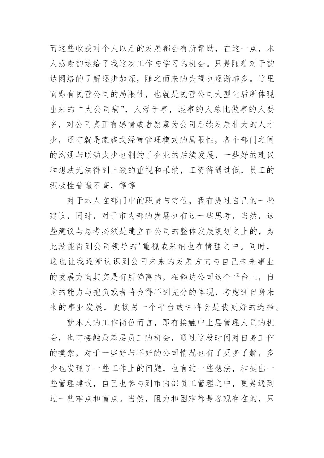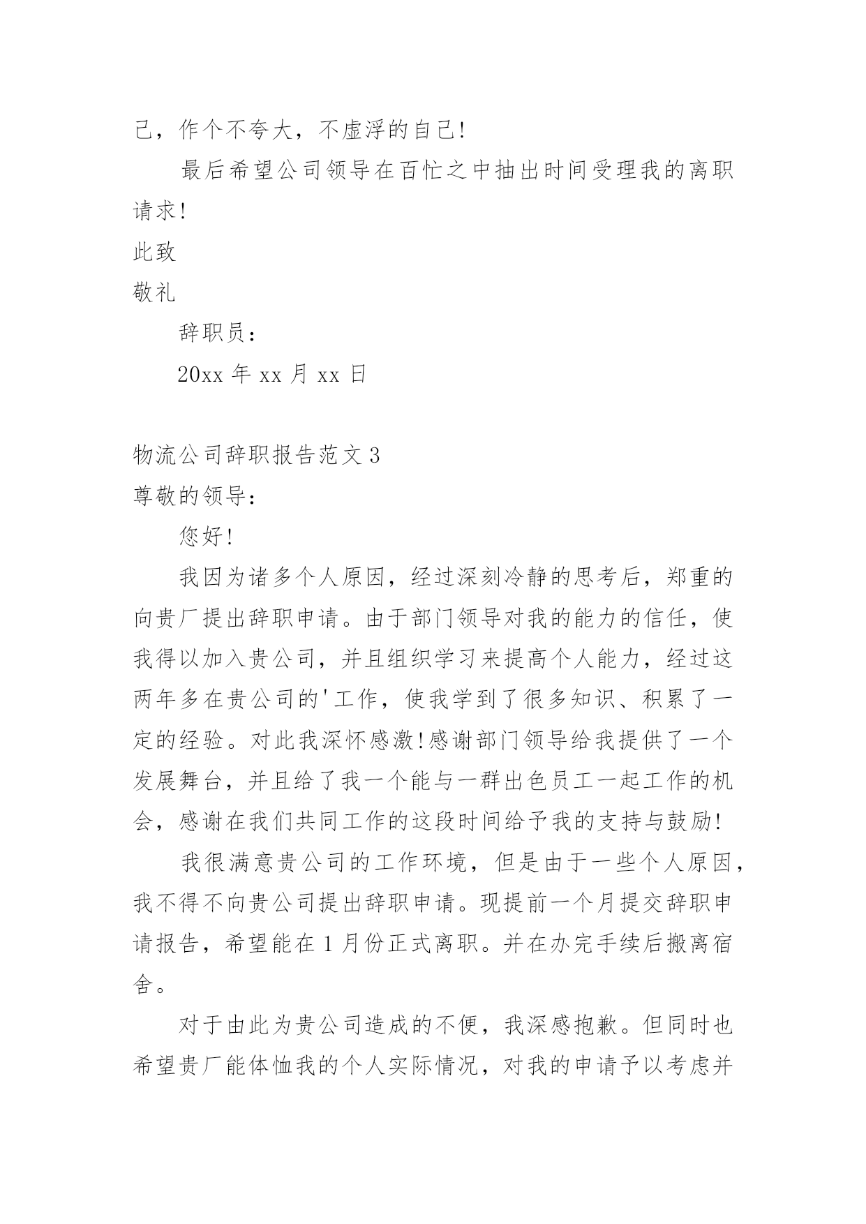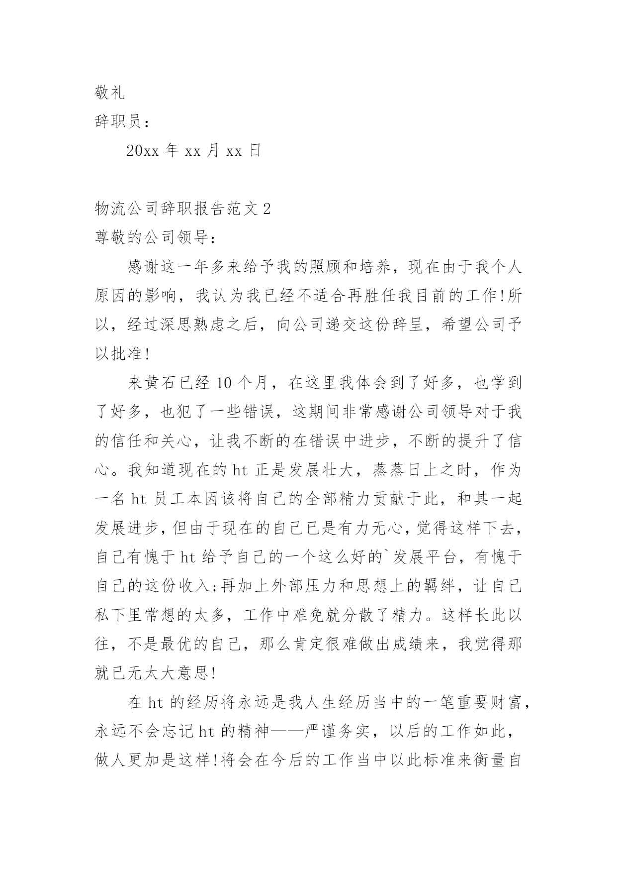 物流公司辞职报告物流公司辞职报告范文随着个人素质的提升,报告有着举足轻重的地位,报告具有语言陈述性的特点。一起来参考报告是怎么写的吧,下面是小编为大家收集的物流公司辞职报告范文,欢迎大家借鉴与参考,希望对大家有所帮助。物流公司辞职报告范文1尊敬的领导:本人自XX年7月15日进入韵达公司工作,工作岗位:市内部经理助理;自我评价:对岗位工作我有尽职尽责,对部门规划我有献计献策,对韵达公司我也有新的认识。本人在做出辞职决定的同时,对进入韵达公司工作以来的情况做下自我总结:在没有进入韵达公司工作前,本人对韵达公司的情况已有所初步了解。虽然民营快递的总体发展趋势并不令人乐观,但本人对快递行业的整体形势还是满怀信心的,对能够进入像韵达这样一家全国十强民营快递之一的大型快递公司工作还是充满希望的,在进入公司之前,对于公司的发展愿景和自己的工作抱负也都有一定的追求。工作半年下来,收获很多,失望却也不少。在任何一个环境下工作,只要你能放平心态,每个人都可以得到收获,而这些收获对个人以后的发展都会有所帮助,在这一点,本人感谢韵达给了我这次工作与学习的机会。只是随着对于韵达网络的了解逐步加深,随之而来的失望也逐渐增多。这里面即有民营公司的局限性,也就是民营公司大型化后所体现出来的“大公司病”,人浮于事,混事的人总比做事的人要多,对公司真正有感情或者愿意为公司后续发展壮大的人才少,还有就是家族式经营管理模式的局限性,各个部门之间的沟通与联动太少也制约了企业的后续发展,一些好的建议和想法无法得到上级的重视和采纳,工资待遇过低,员工的积极性普遍不高,等等对于本人在部门中的职责与定位,我有提过自己的一些建议,同时,对于市内部的发展也有过一些思考,当然,这些建议与思考必须是建立在公司的整体发展规划之上的,为此没能得到公司领导的'重视或采纳也在情理之中。同时,这也让我逐渐认识到公司未来的发展方向与自己未来事业的发展方向其实是有所偏离的,在韵达公司这个平台上,自身的能力与抱负或者将会得不到充分的体现,考虑到自身未来的事业发展,更换另一个平台或许将会是我更好的选择。就本人的工作岗位而言,即有接触中上层管理人员的机会,也有接触最基层员工的机会,通过这段时间对自身工作的摸索,对于一些好与不好的公司情况也有了更多了解,多少也发现了一些工作上的问题,也有过一些想法,和提出一些管理建议,自己也参与到市内部员工管理之中,更是遇到过一些难点和盲点。当然,阻力和困难都是客观存在的,只是要克服这些问题,需要由上而下的一种经营理念的更新,还有就是管理手段上的制度化与人性化,而不是“人情化”或者“裙带化”,问题的根本解决要求公司的管理需要更上一个台阶,对于员工(尤其是一线部门的基层员工)要给予充分信任并调动其积极性,不管是新老员工,要让其时时能够感受到自己的前途和韵达公司是可以一齐并头发展的。本人的自身工作能力不便由自己来下结论,但对于自身存在的问题本人也有清醒的自我认识,“人情化”管理或者“制度化”管理这两种模式本人更倾向于采用“制度化”管理,不管是新老员工,或者是有裙带关系的员工,希望都是一视同仁。在现实环境里,企业的生存靠关系,然而企业的发展却更多的是靠管理,一个企业能不能成为行业中的佼佼者,关系只是一部分,管理始终是根本。在这点上,韵达公司是有所欠缺的,这在本人所在的工作部门也有体现。其次,工资待遇过低,使员工对企业的认同感也相应降低,而对一些自身能力尚可的员工,则是在工作积极性上的一种遏制。工资待遇是最直观的员工价值的体现,比如同工不同酬这种不相等的价值认同将会直观的体现在工作效率上,也间接挫伤了员工的工作积极性。以上是本人在韵达公司工作以来的一些工作体会,出于对韵达公司的尊重与本人的责任意识,在提出辞职的同时附上这份辞职报告,也希望未来韵达公司能够获得更大更好的发展!此致敬礼辞职员:20xx年xx月xx日物流公司辞职报告范文2尊敬的公司领导:感谢这一年多来给予我的照顾和培养,现在由于我个人原因的影响,我认为我已经不适合再胜任我目前的工作!所以,经过深思熟虑之后,向公司递交这份辞呈,希望公司予以批准!来黄石已经10个月,在这里我体会到了好多,也学到了好多,也犯了一些错误,这期间非常感谢公司领导对于我的信任和关心,让我不断的在错误中进步,不断的提升了信心。我知道现在的ht正是发展壮大,蒸蒸日上之时,作为一名ht员工本因该将自己的全部精力贡献于此,和其一起发展进步,但由于现在的自己已是有力无心,觉得这样下去,自己有愧于ht给予自己的一个这么好的`发展平台,有愧于自己的这份收入;再加上外部压力和思想上的羁绊,让自己私下里常想的太多,工作中难免就分散了精力。这样长此以往,不是最优的自己,那么肯定很难做出成绩来,我觉得那就已无太大意思!在ht的经历将永远是我人生经历当中的一笔重要财
